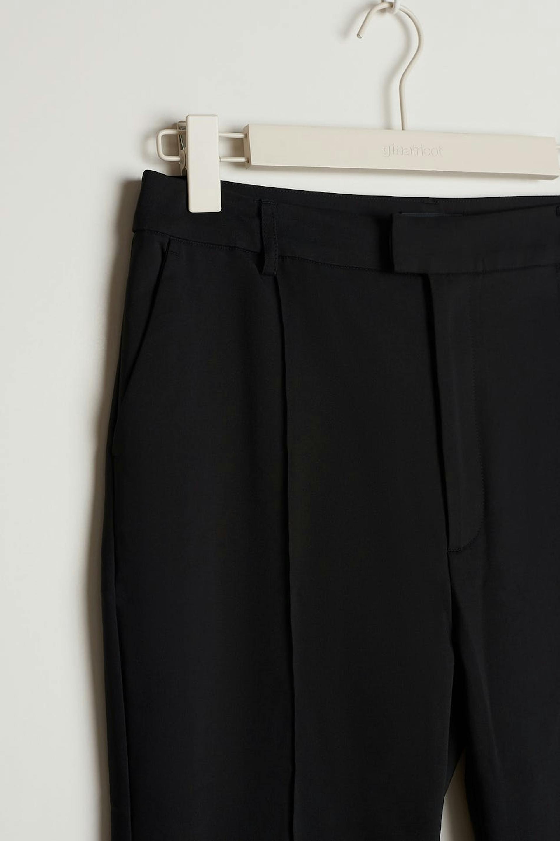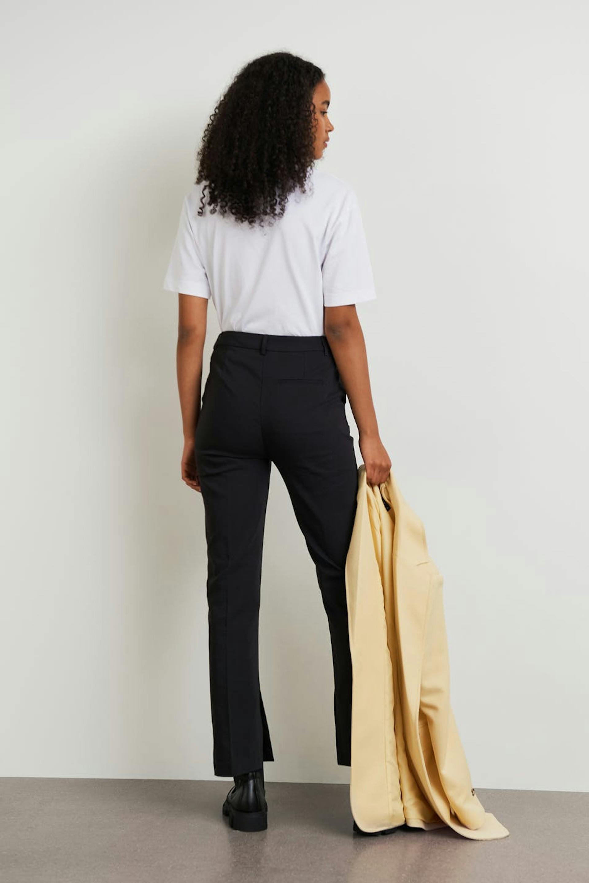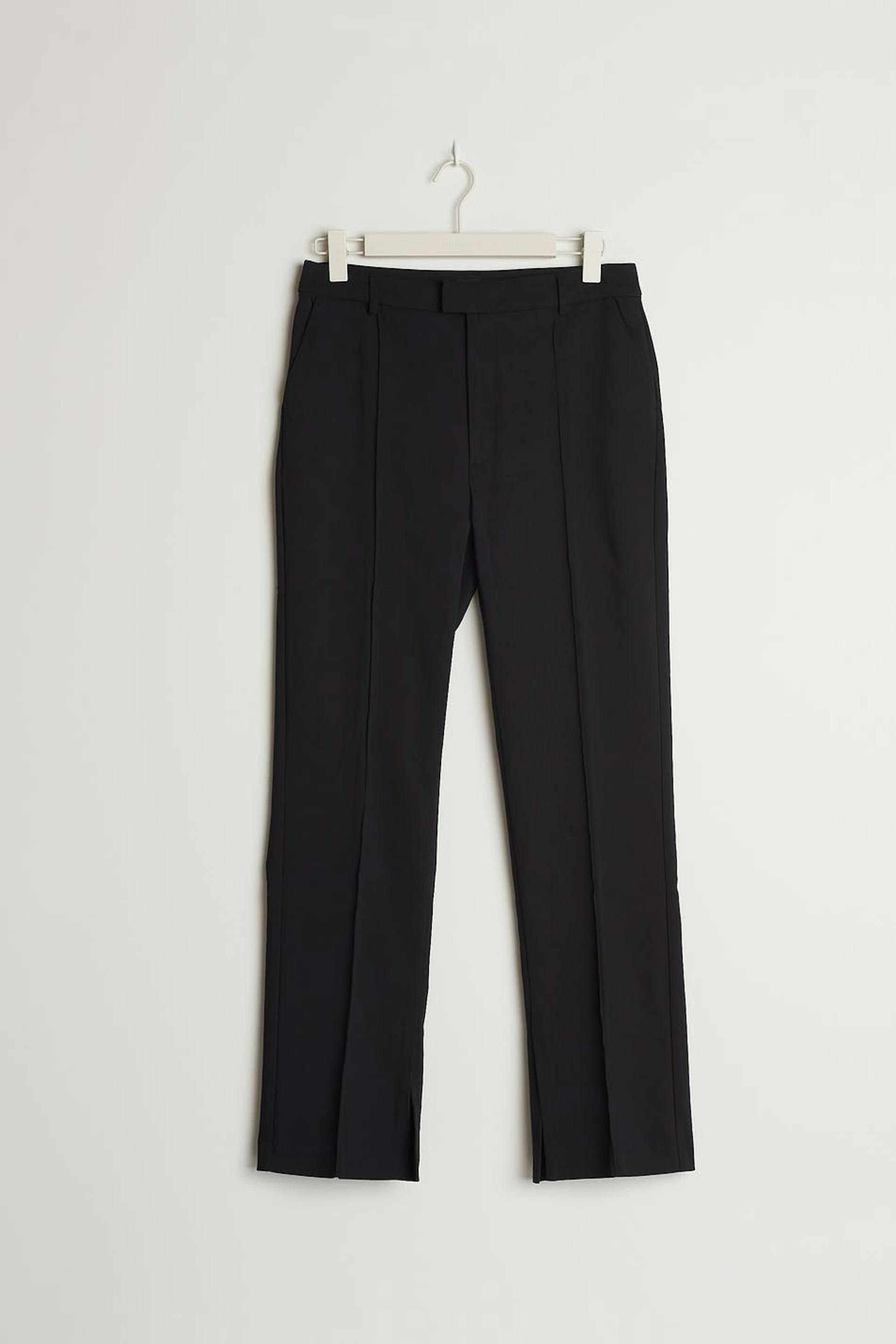 Dressbukser med splitt i enden av benet. Buksene er svarte og har rette buksebein. De har lommer i sidene, sømdetaljer foran og delte lommer bakpå.