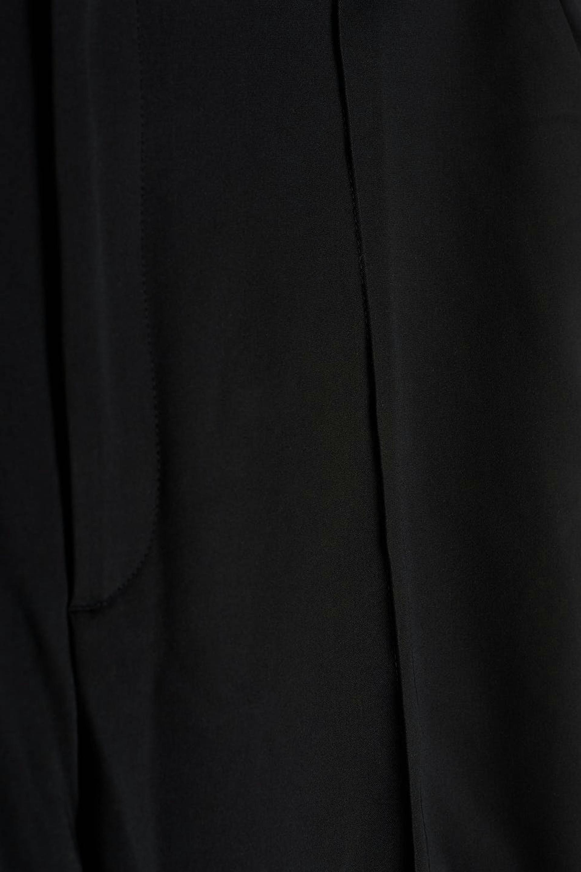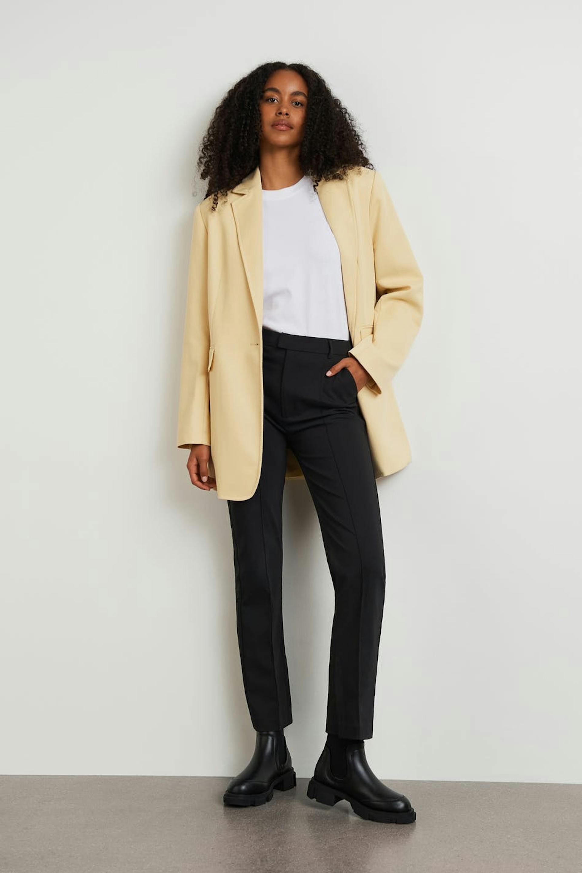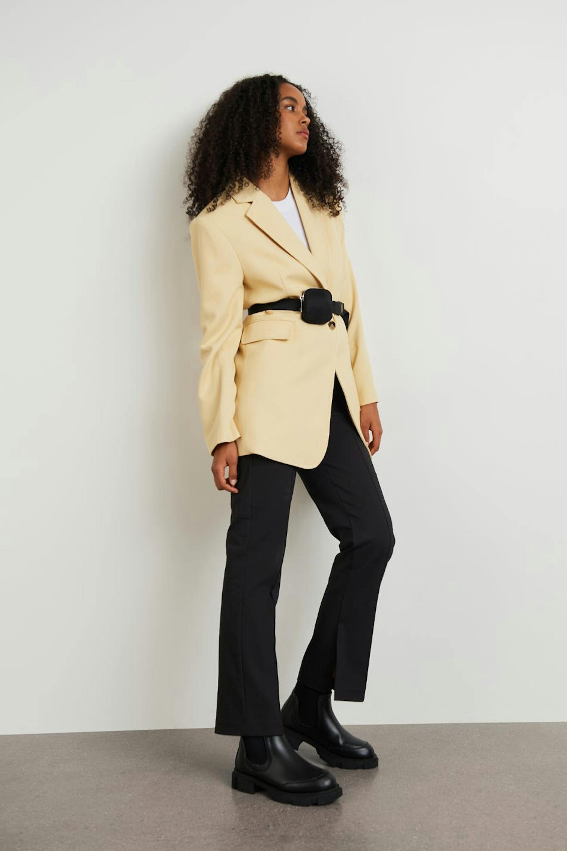Dressbukser med splitt i enden av benet. Buksene er svarte og har rette buksebein. De har lommer i sidene, sømdetaljer foran og delte lommer bakpå.