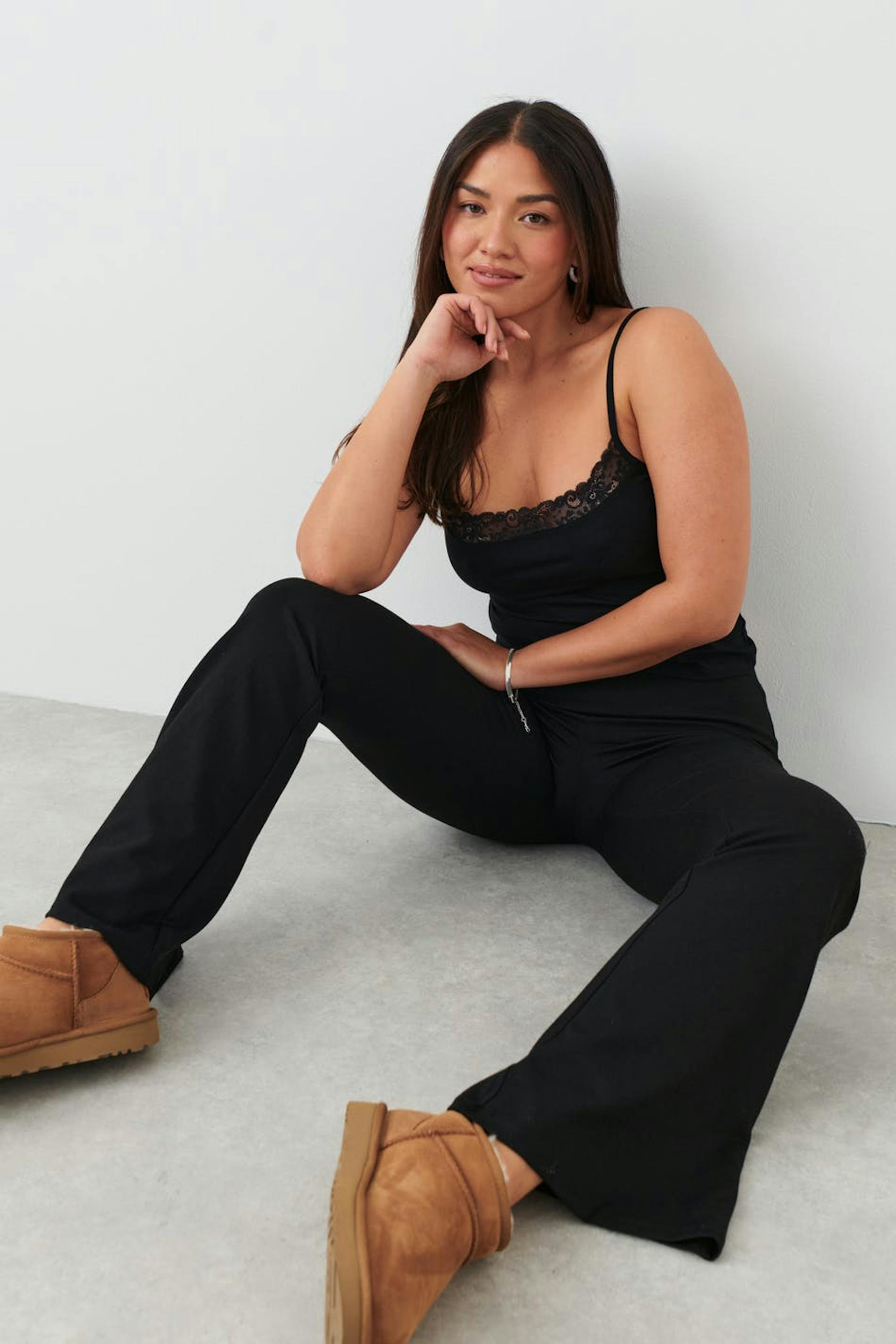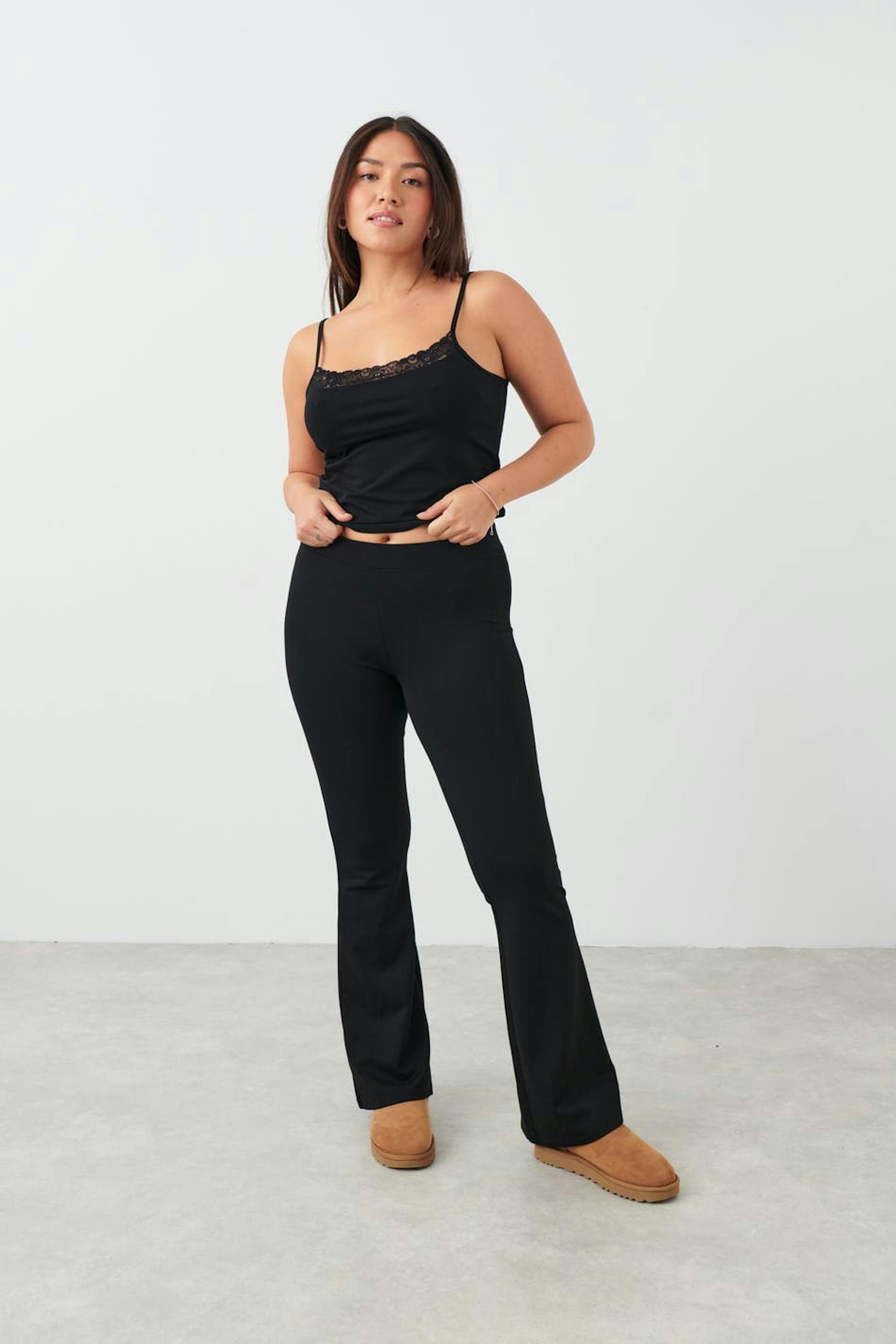 Utsvingt bukse med en vanlig passform. Buksen er svart og myk og har en elastisk strikk ved midjen. Den er laget av tricot.