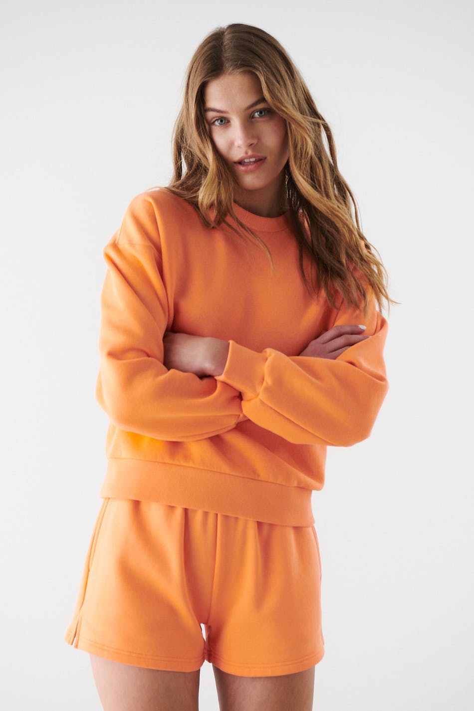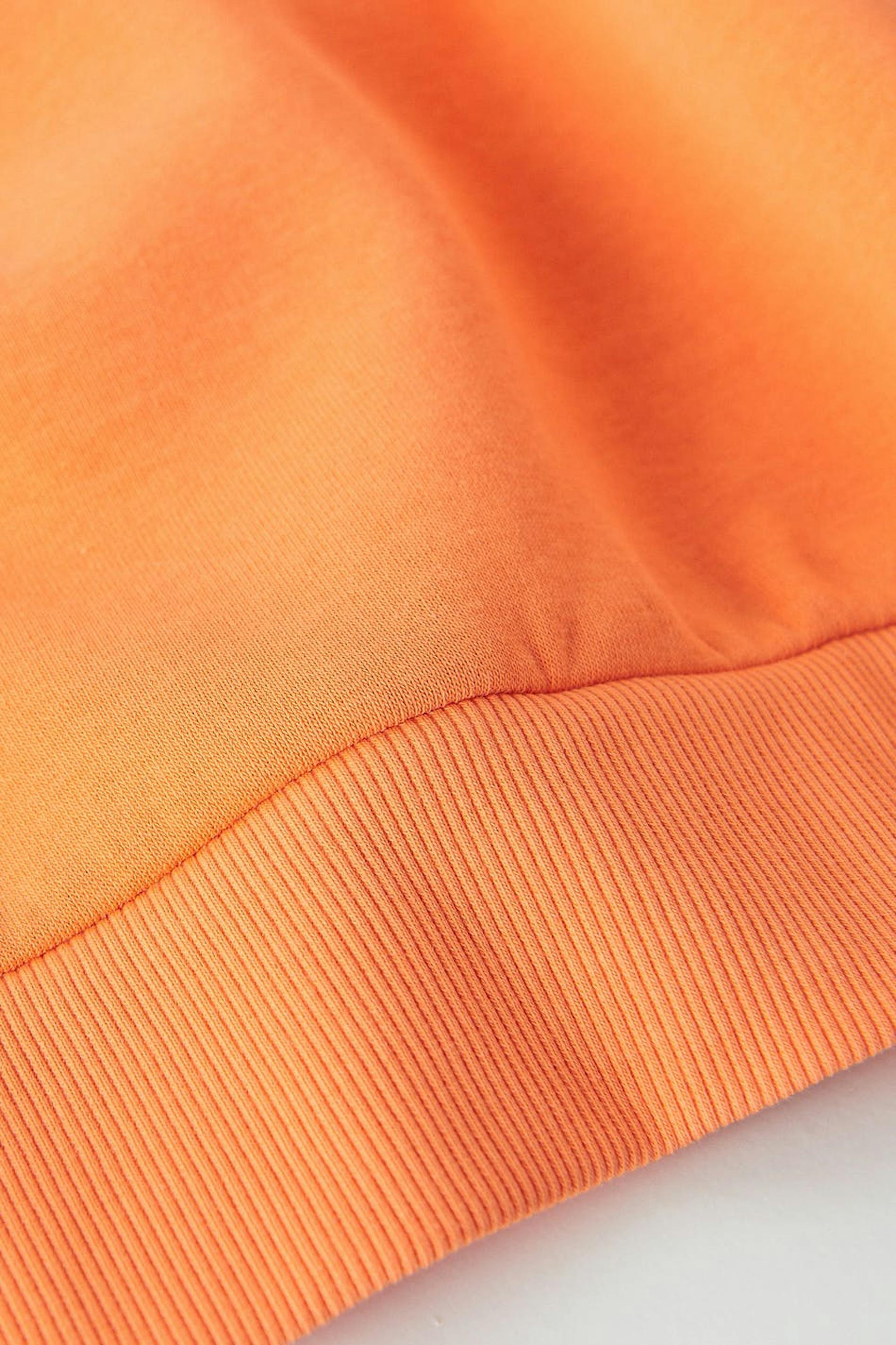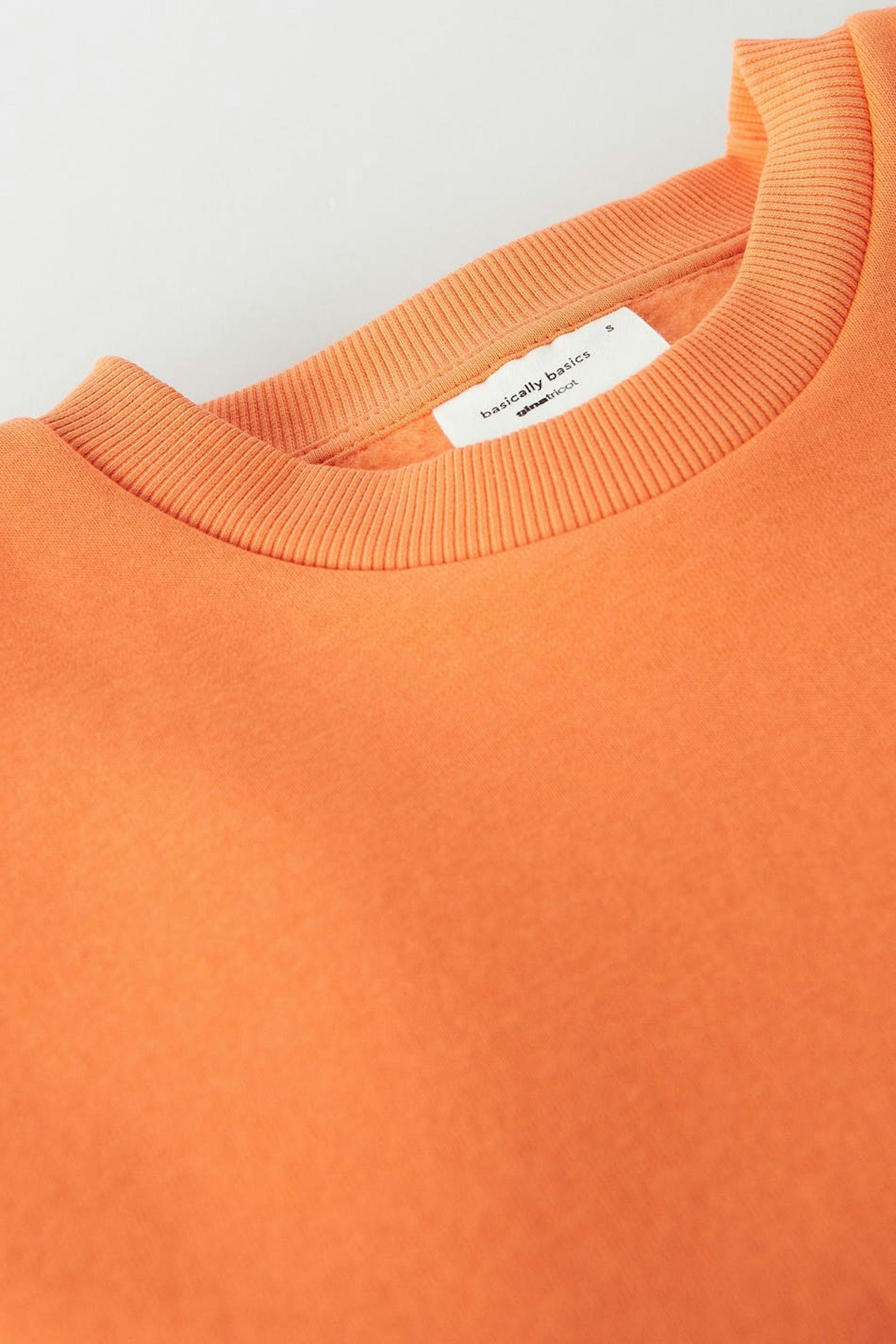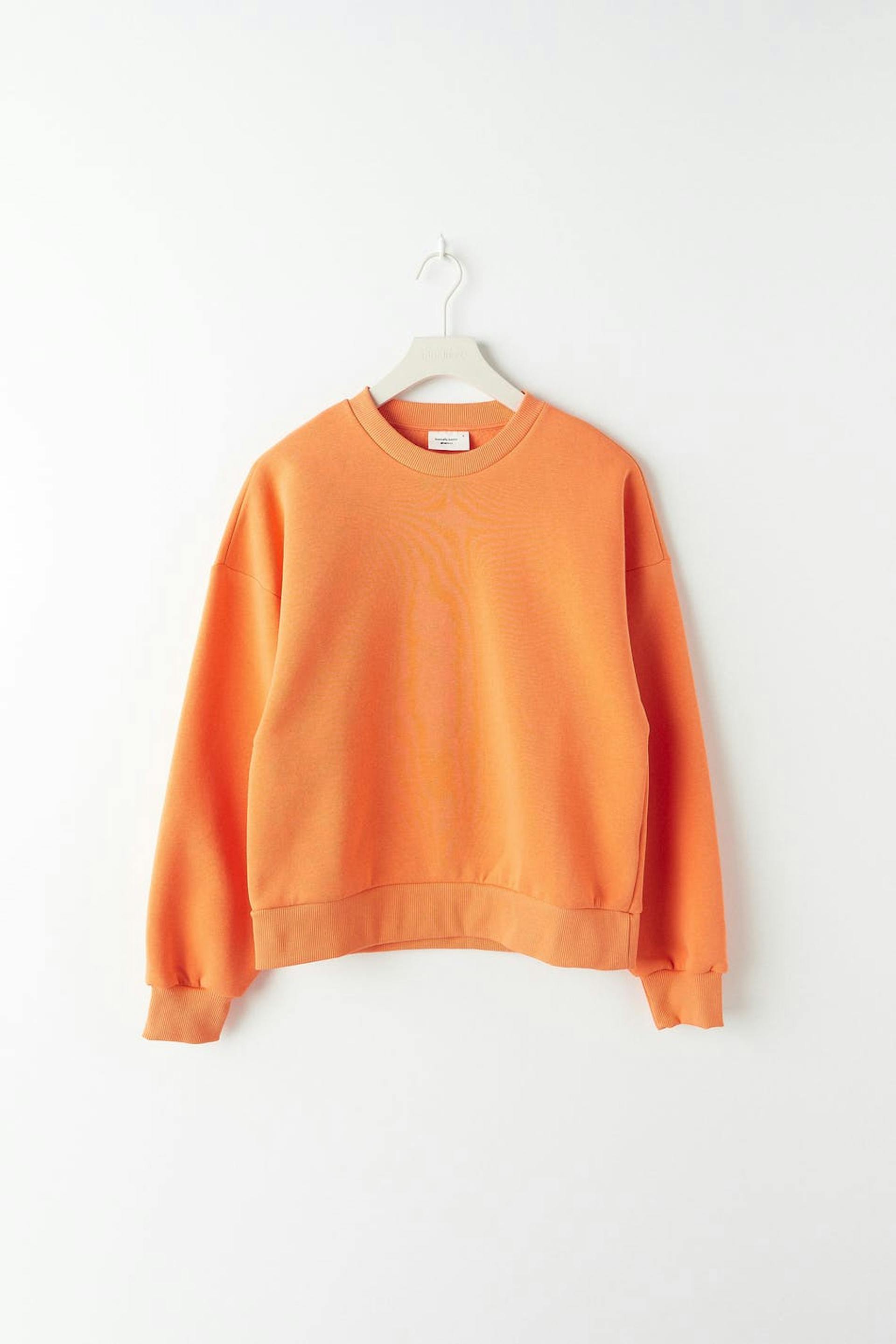 Myk collegegenser med en oversized passform. Collegegenseren er oransje og har utringede skuldre. Den har en rund halsutringning og en ribbet mansjett på enden av ermene og på nedre linning.