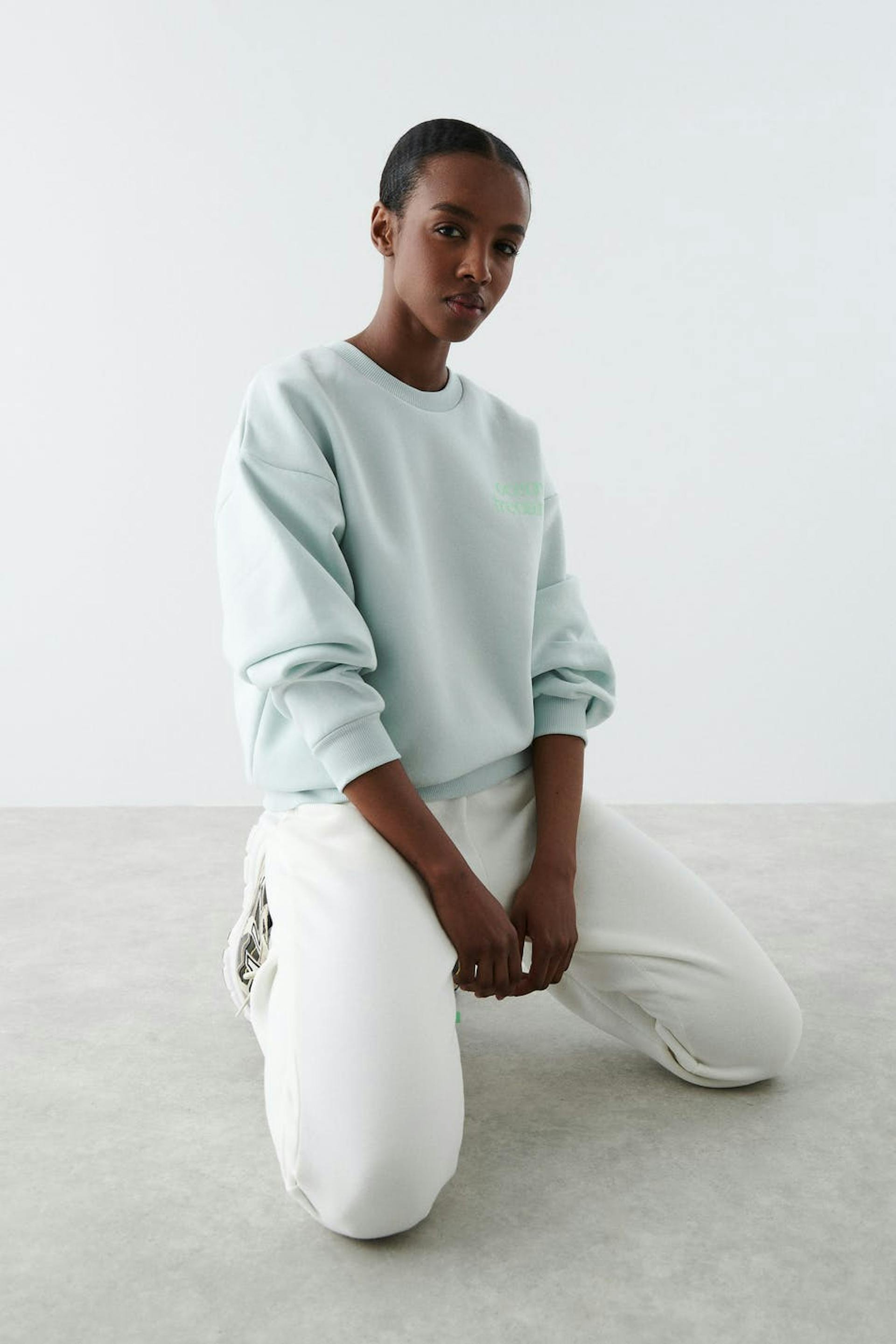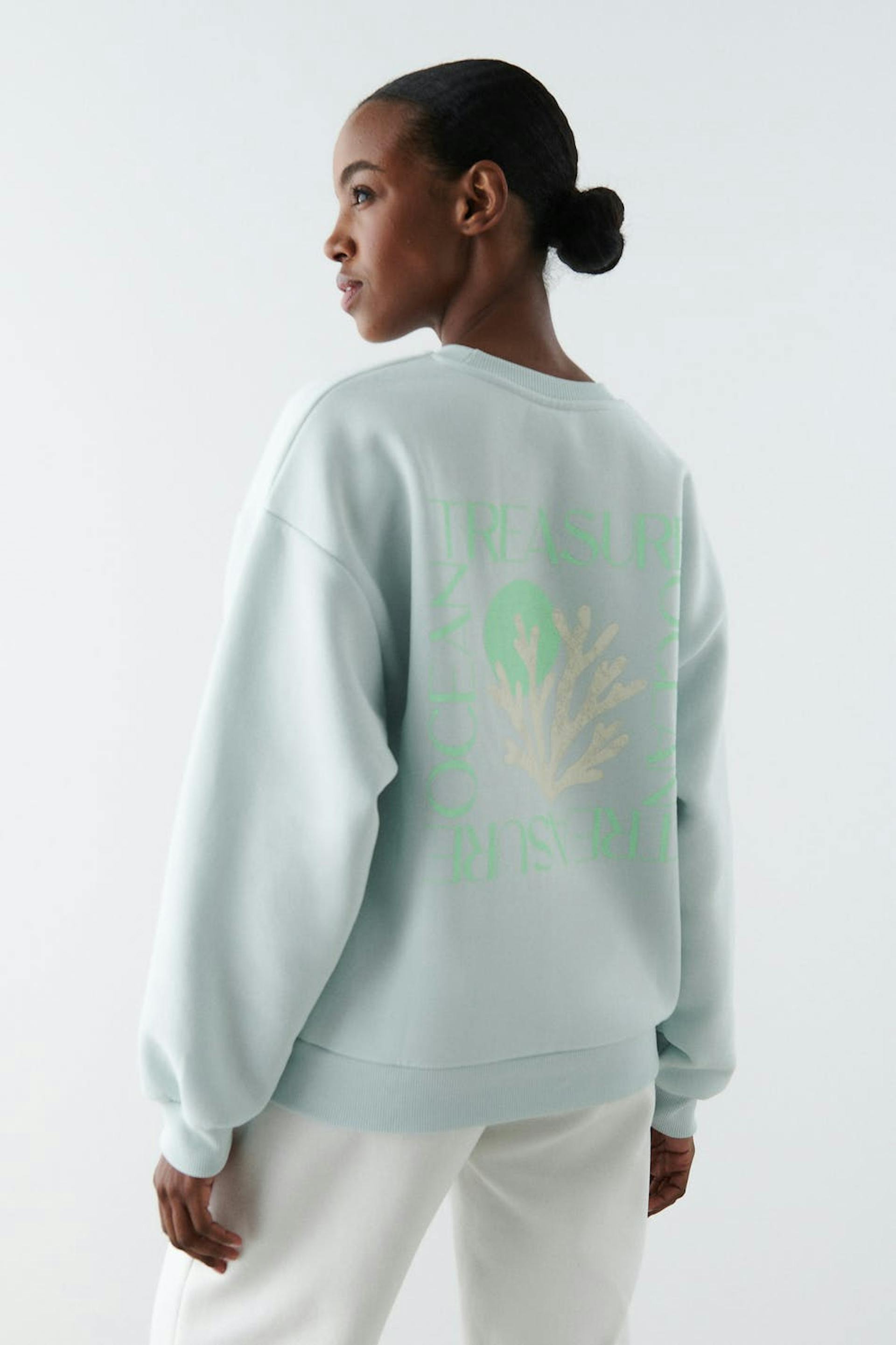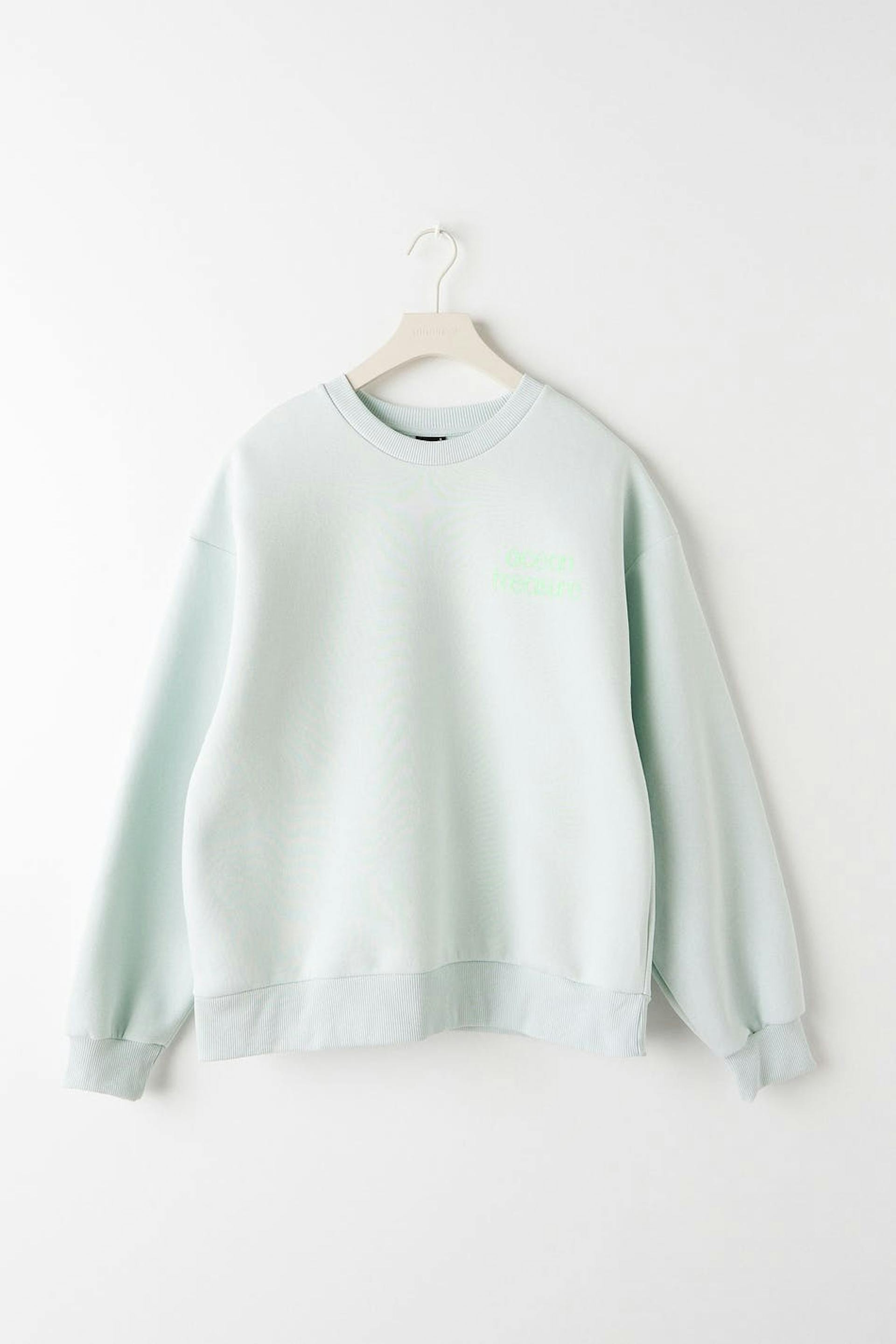 Collegegenser med en oversized passform. Collegegenseren er blå og har en rund halsutringning. Den har en ribbet mansjett på enden av ermene og på nedre linning.