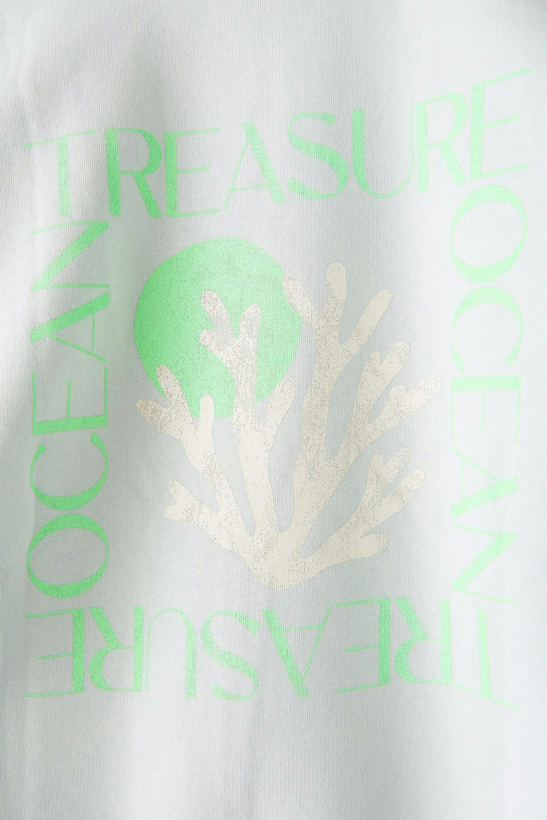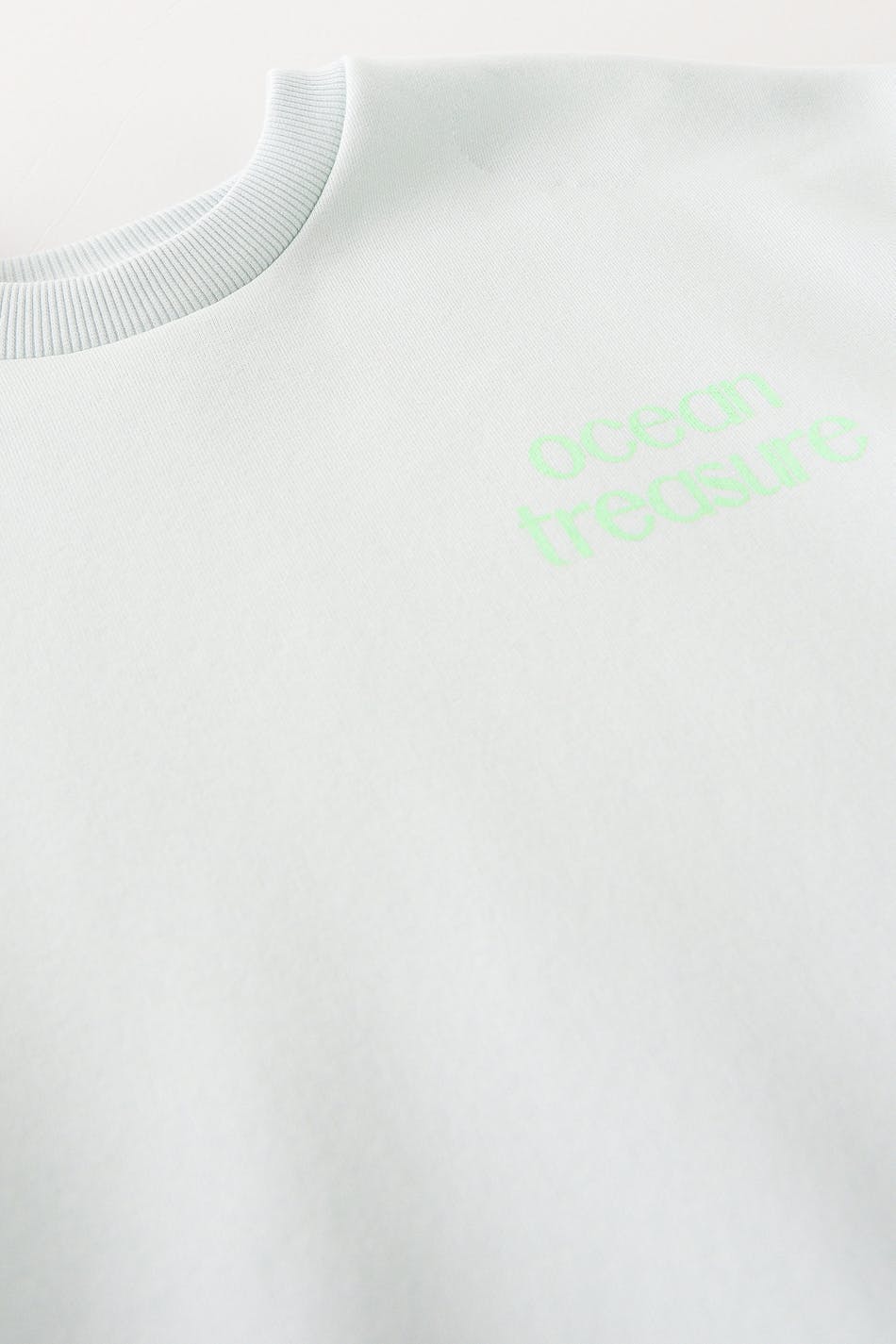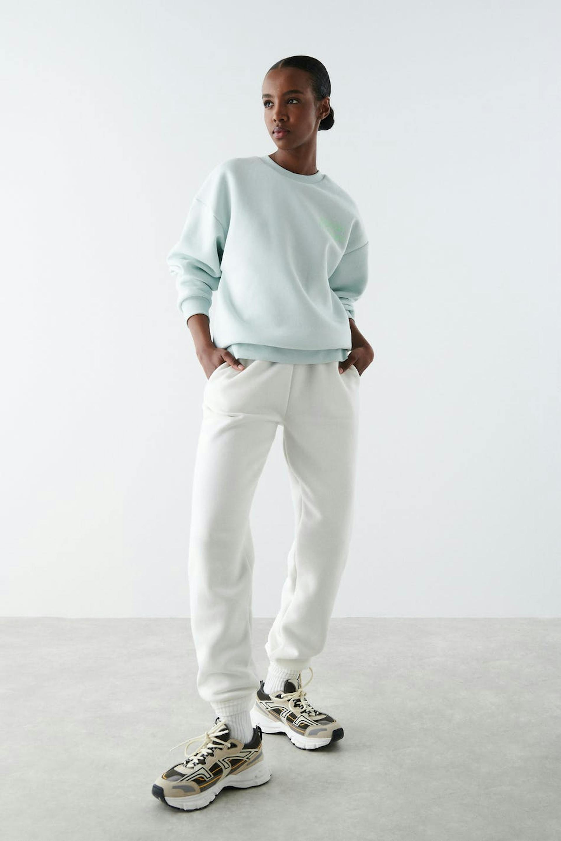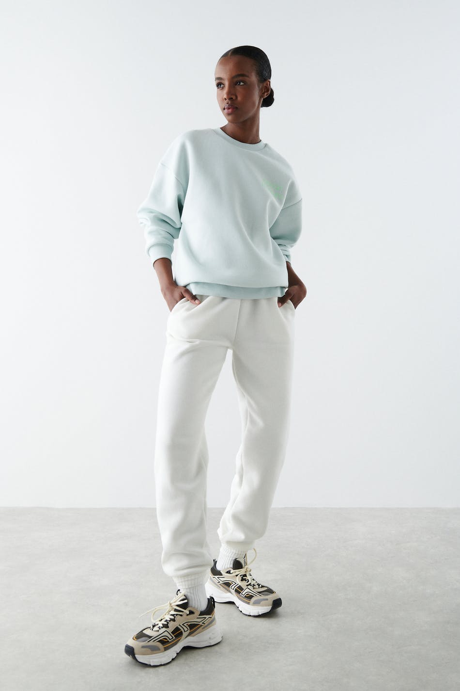 Collegegenser med en oversized passform. Collegegenseren er blå og har en rund halsutringning. Den har en ribbet mansjett på enden av ermene og på nedre linning.