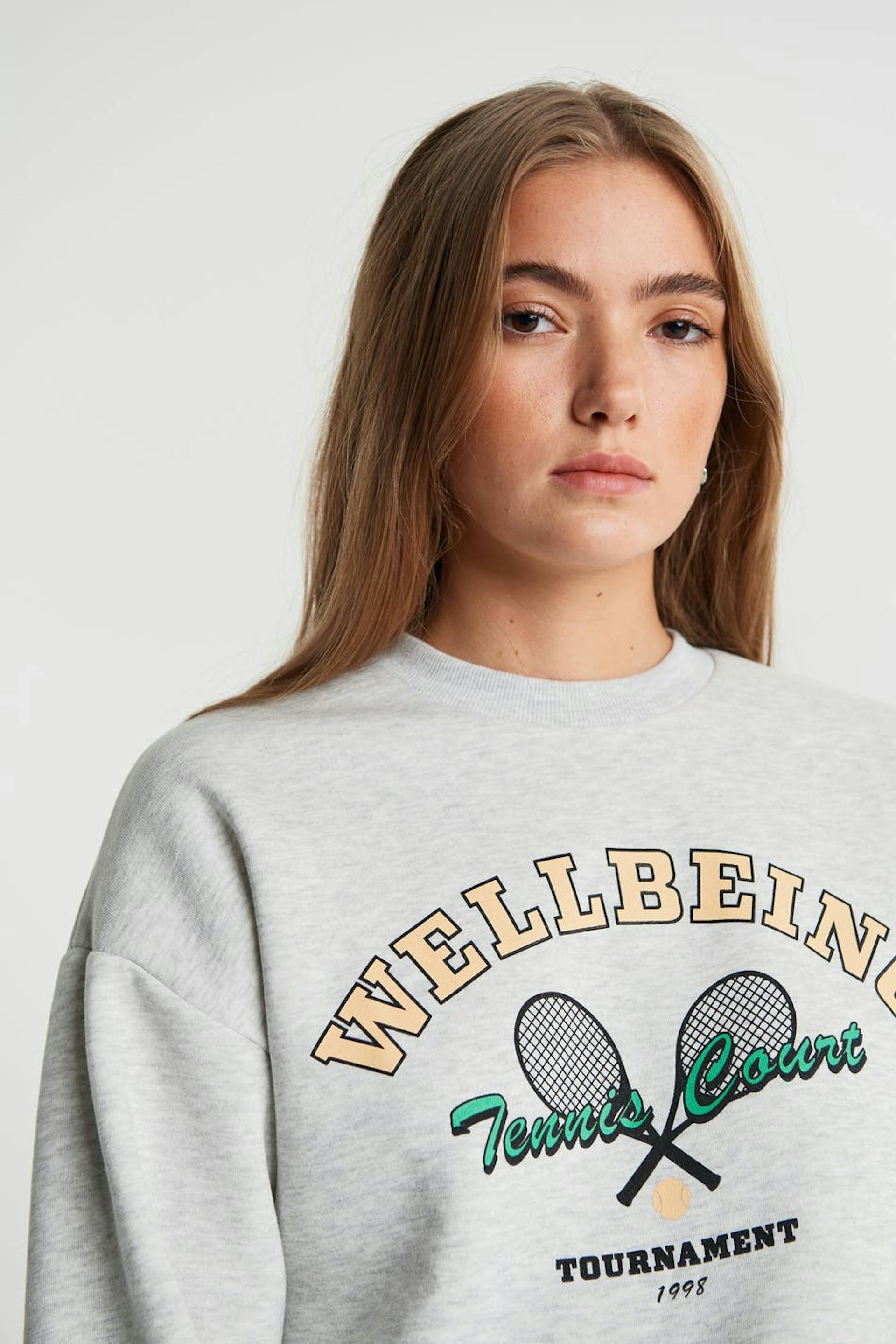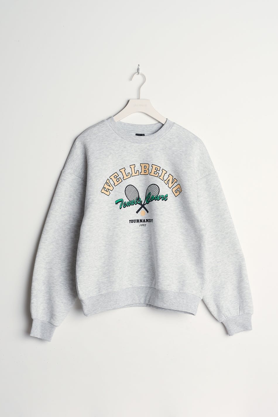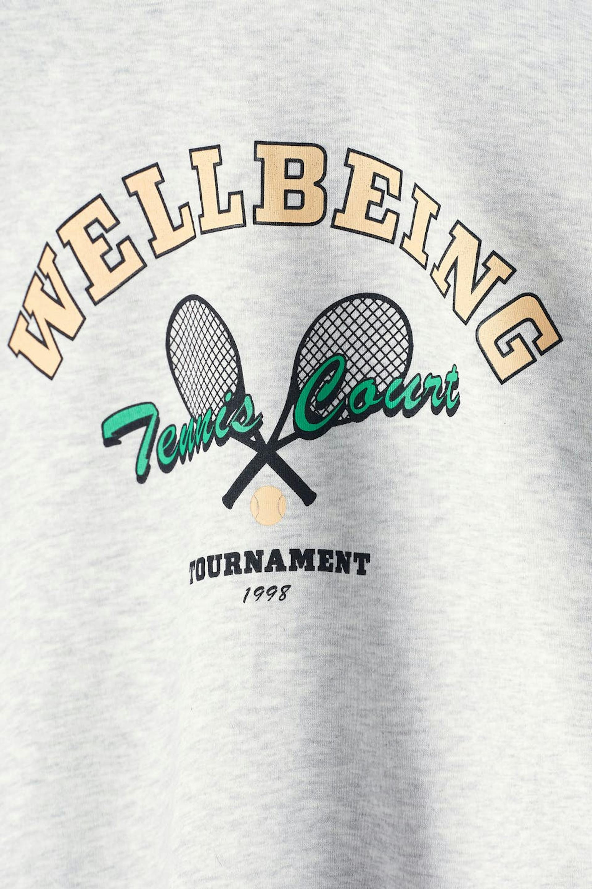 Collegegenser med et trykk med en tennis-stil på framsiden. Collegegenseren er grå og har en oversized-passform.