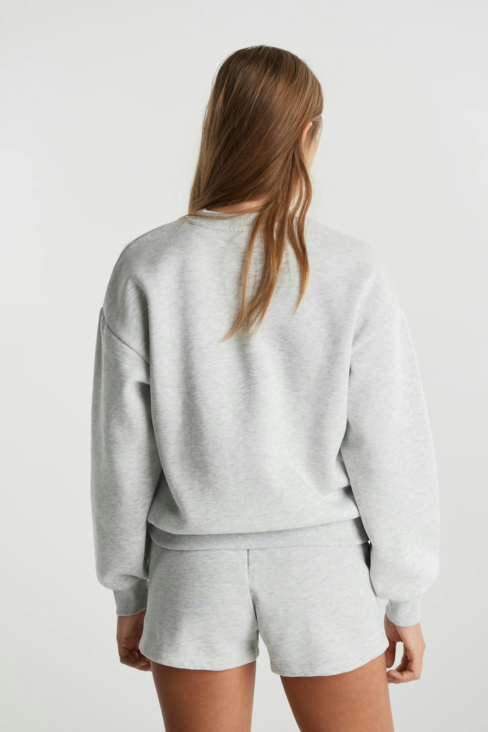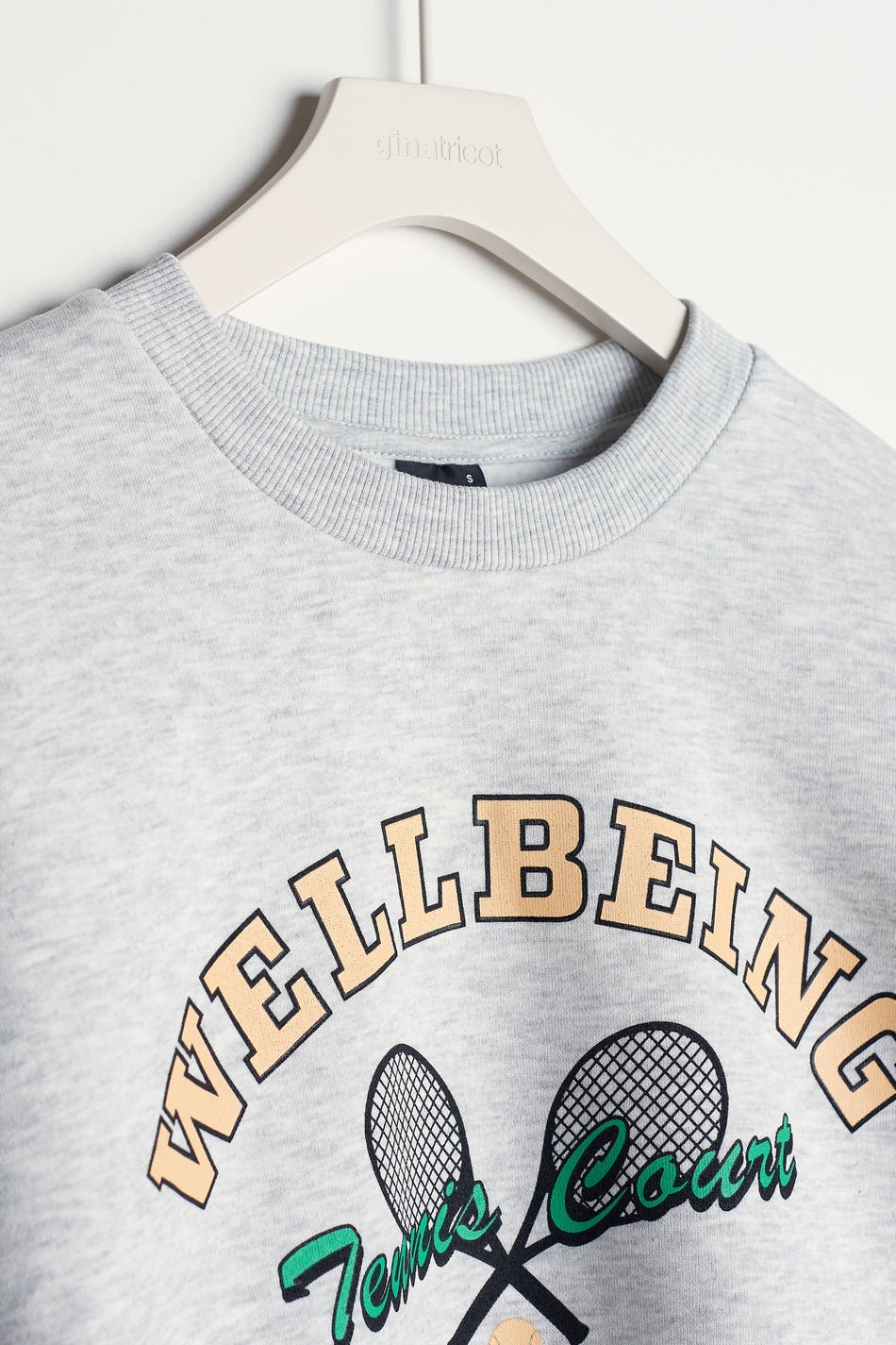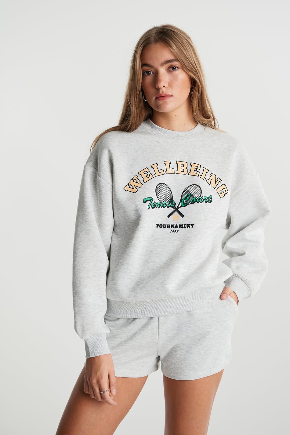 Collegegenser med et trykk med en tennis-stil på framsiden. Collegegenseren er grå og har en oversized-passform.