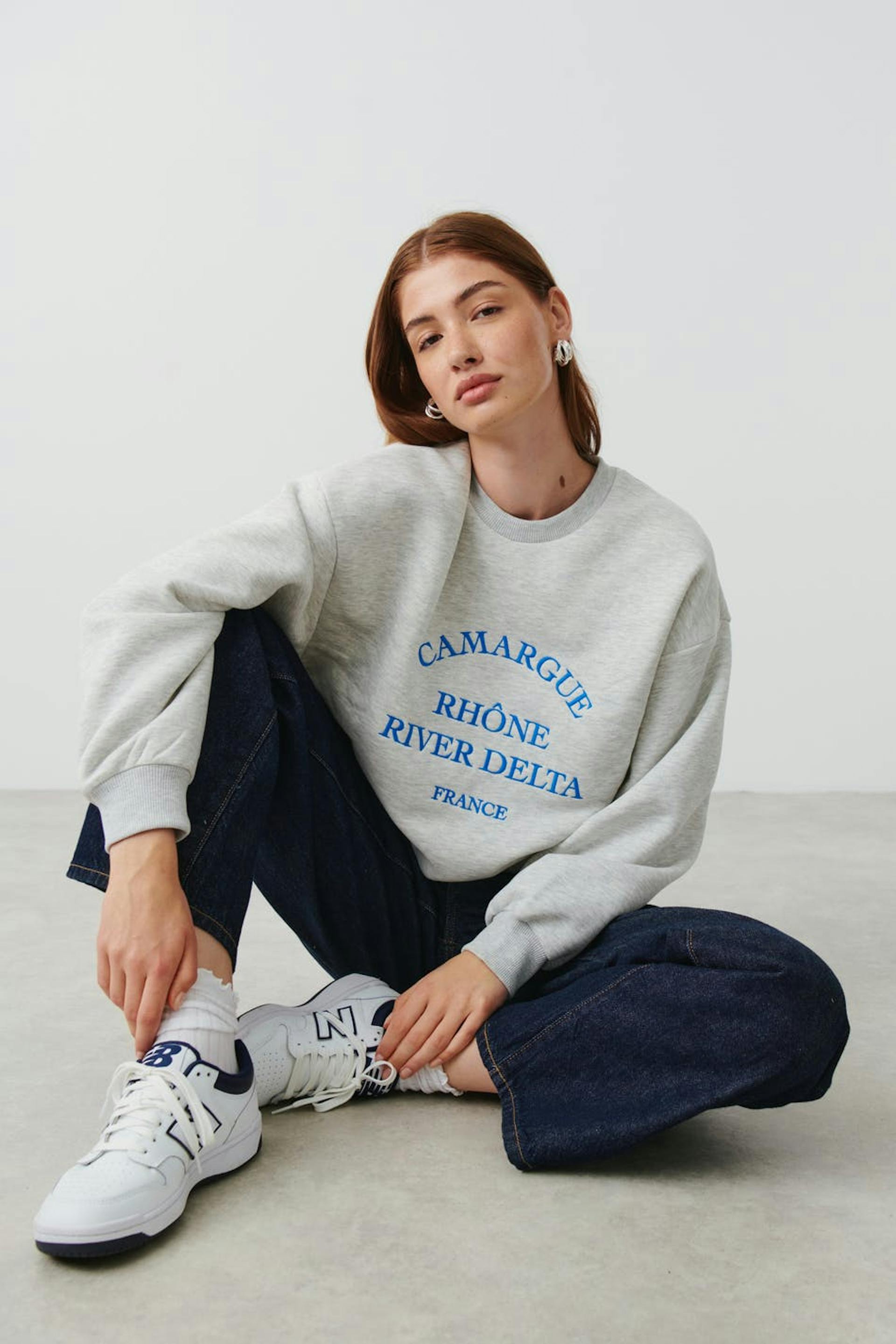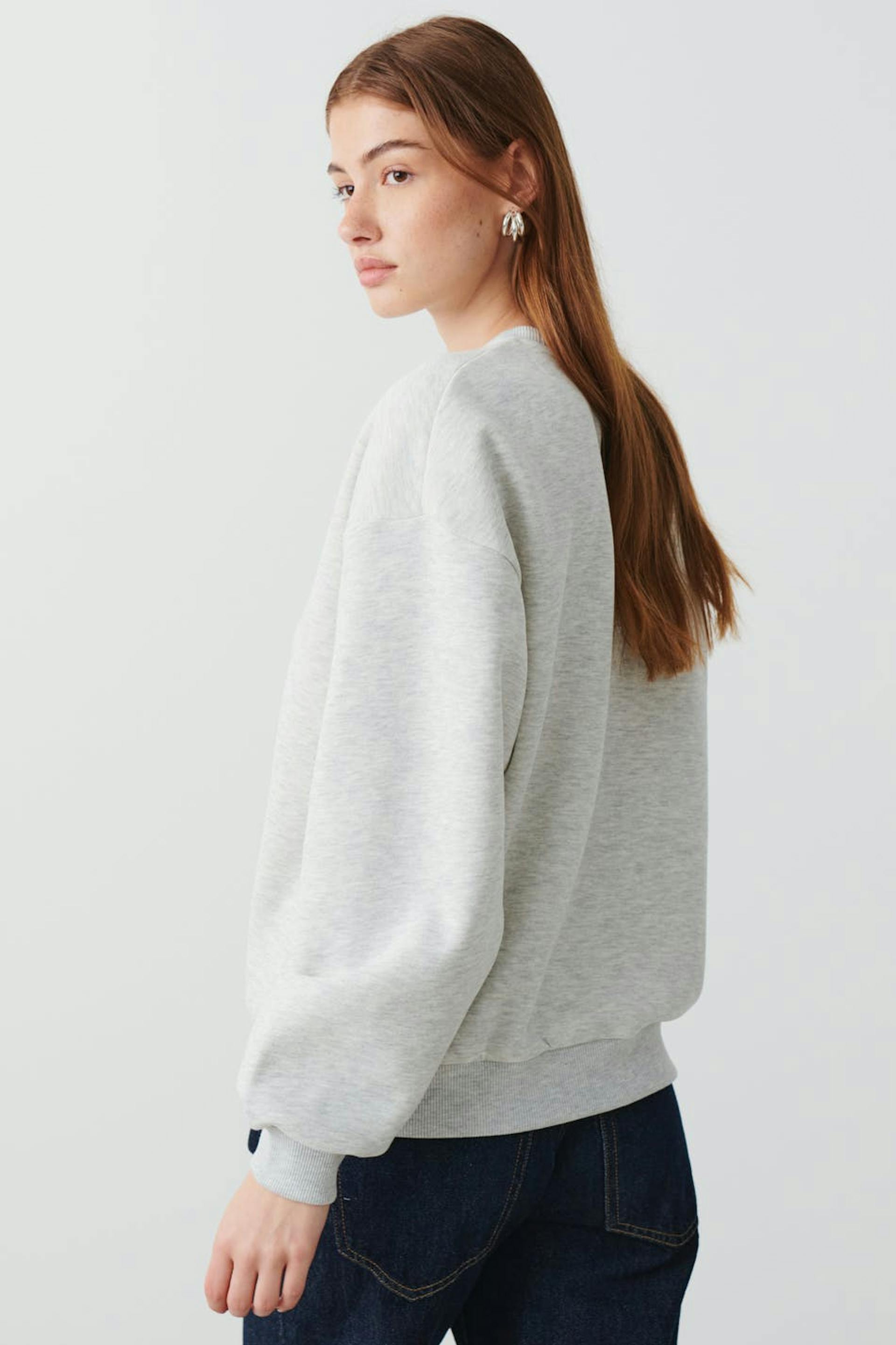 Collegegenser med trykk på forsiden. Collegegenseren er grå og har rund halsutringning. Den har ribbestrikk på enden av ermene og på nedre linning.