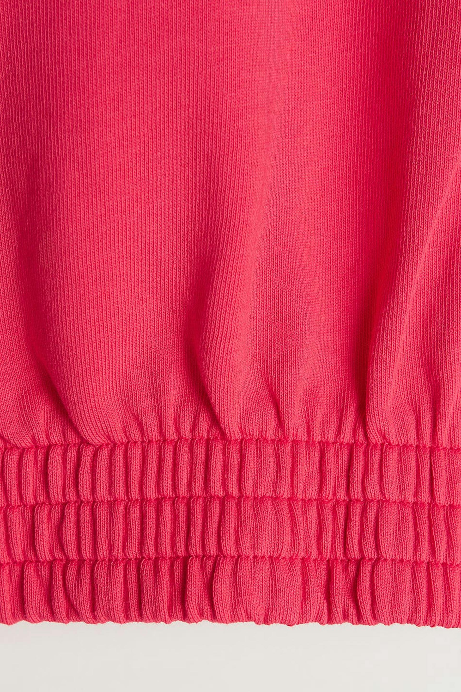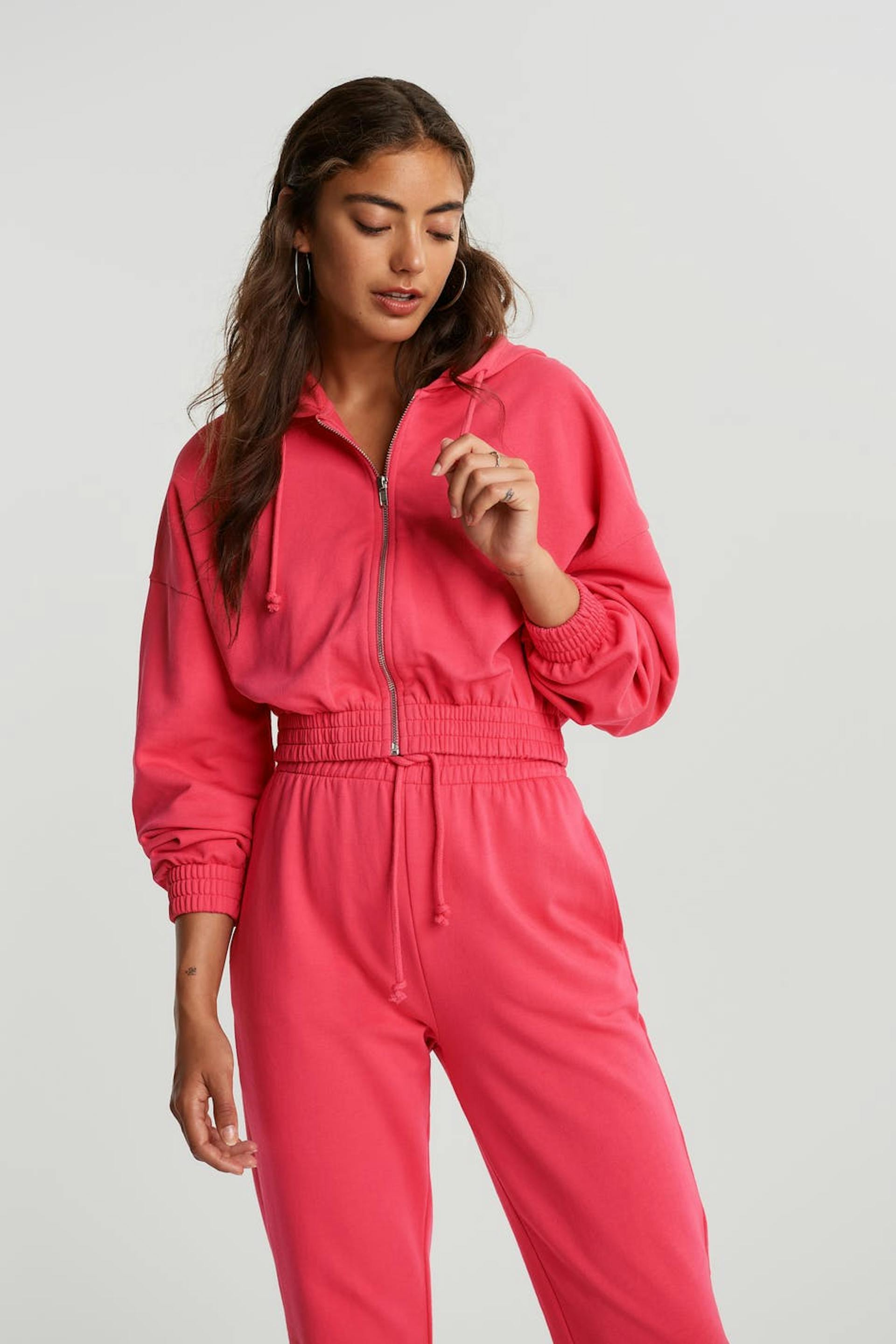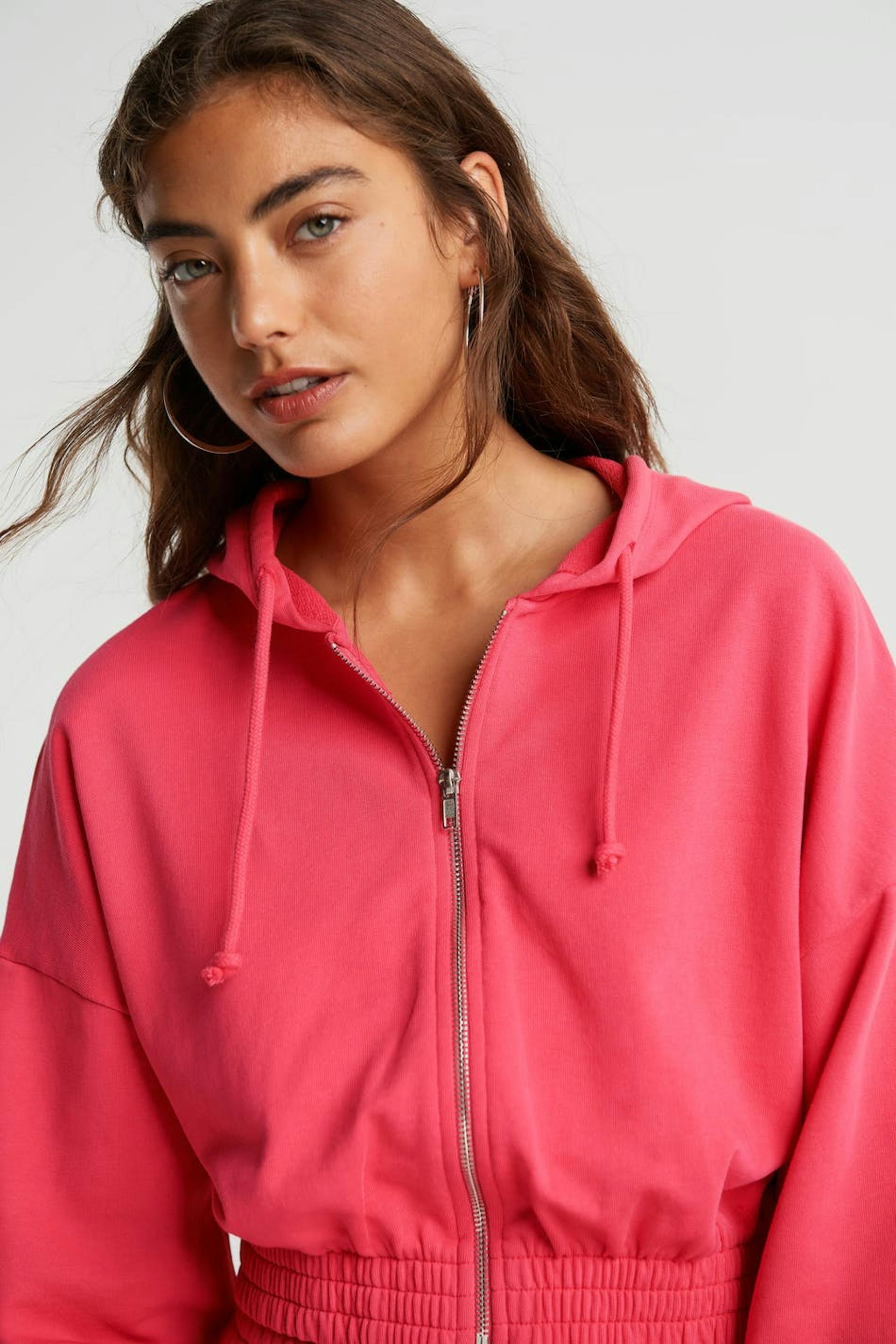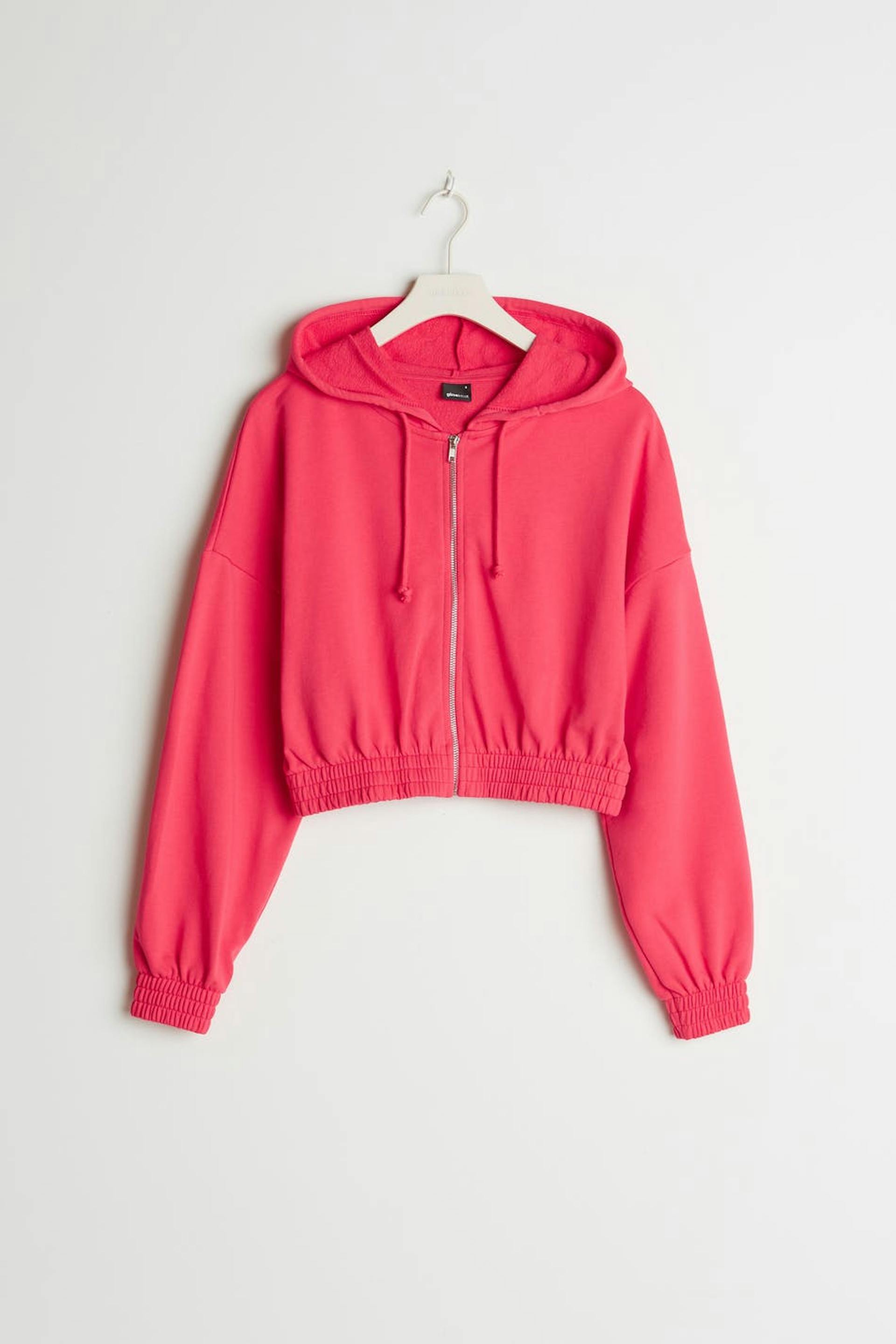 Avkortet collegegenser med en vanlig passform. Collegegenseren er rosa og har en hette med en snøring. Den har en glidelås på framsiden og en mansjett i elastikk på linningen og på enden av ermene.