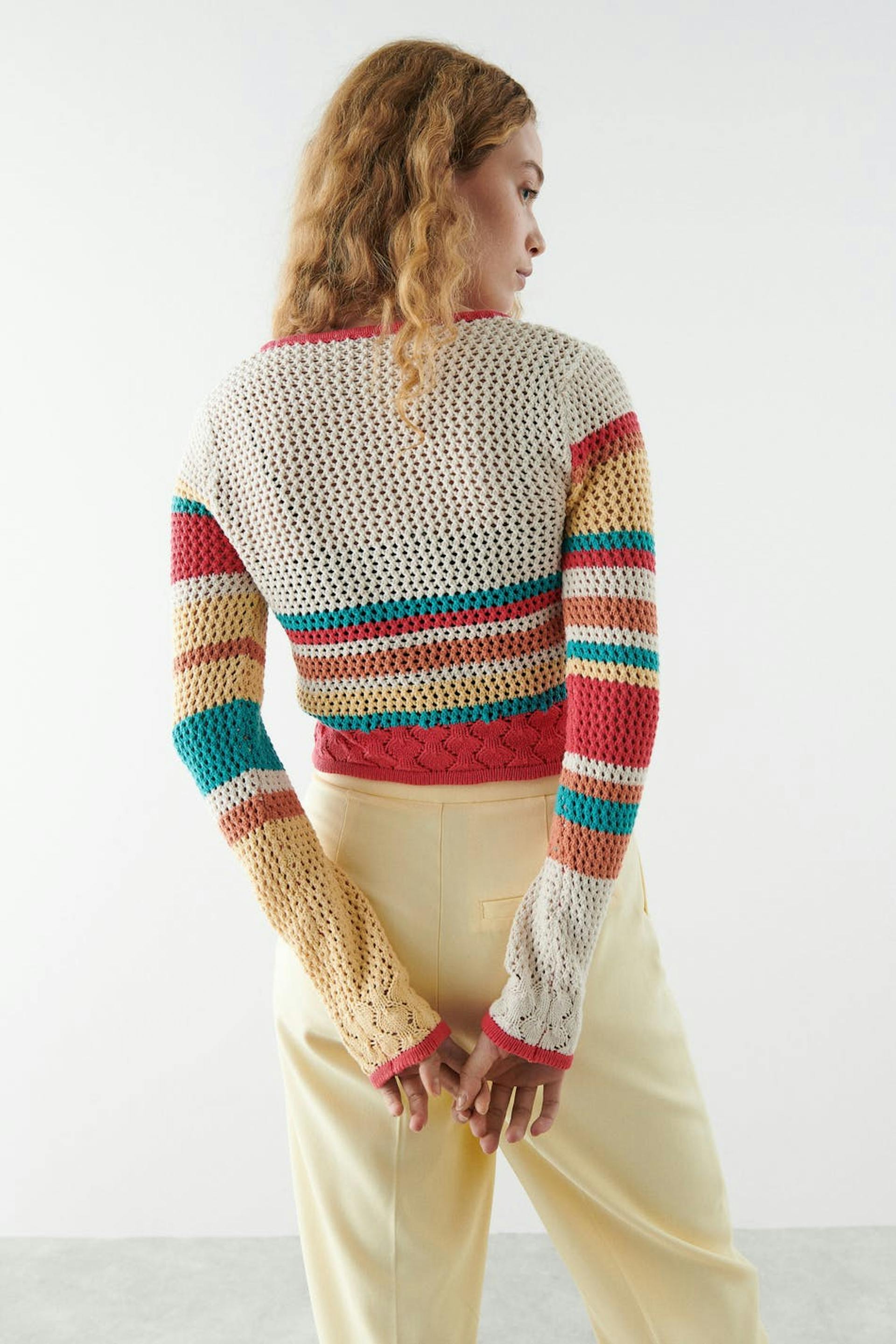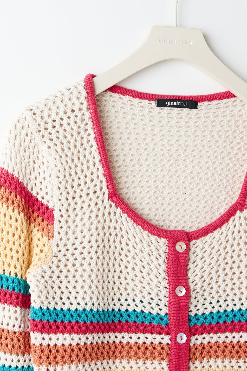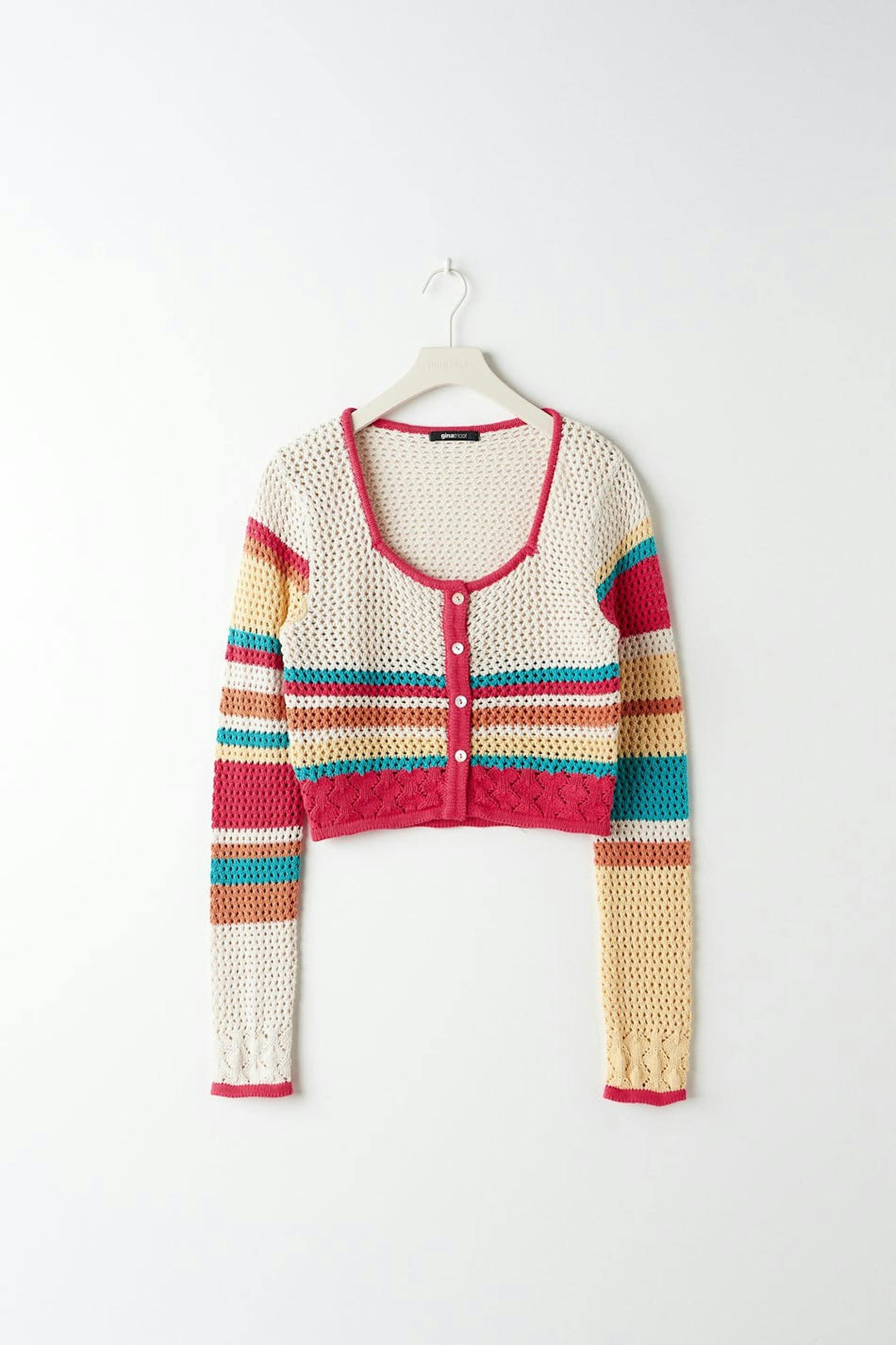 Heklet kardigan med firkantet hals. Kardiganen er rosa, blå og gul. Den har knappstolpe foran og en avkortet lengde.