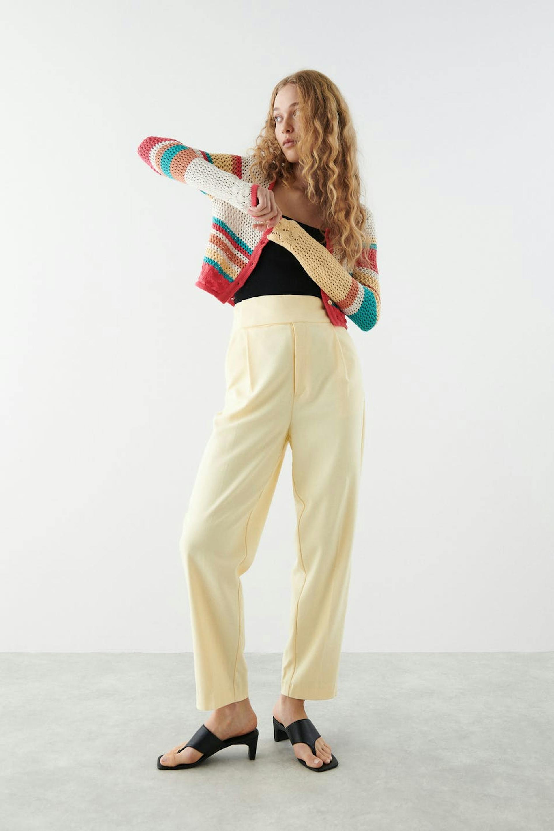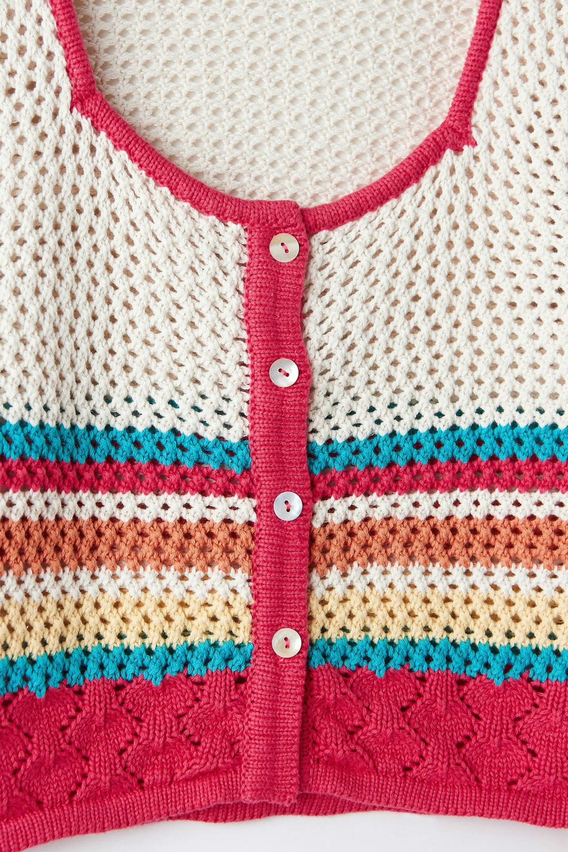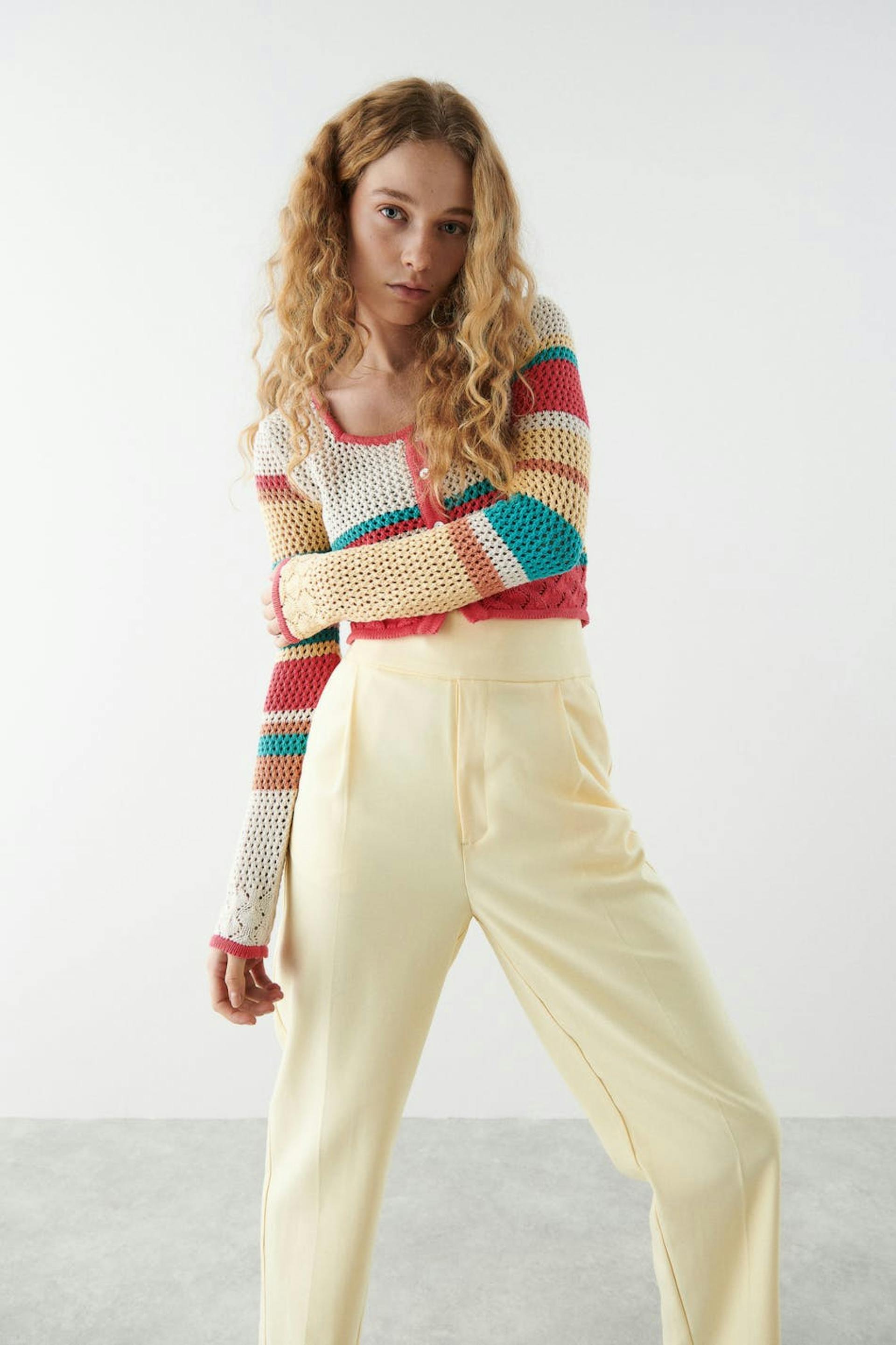 Heklet kardigan med firkantet hals. Kardiganen er rosa, blå og gul. Den har knappstolpe foran og en avkortet lengde.