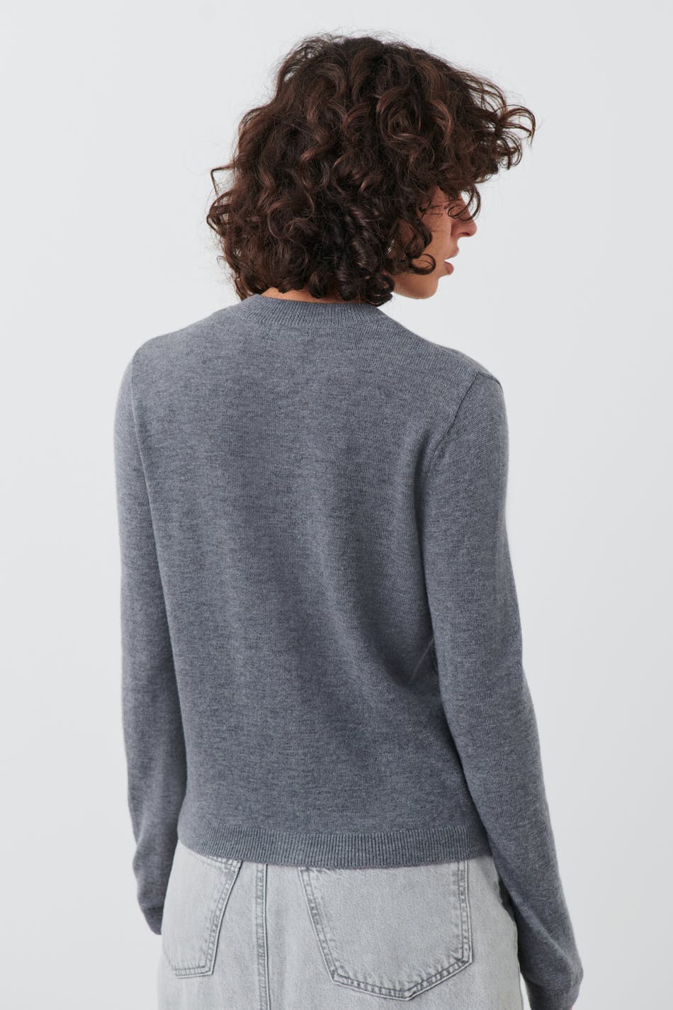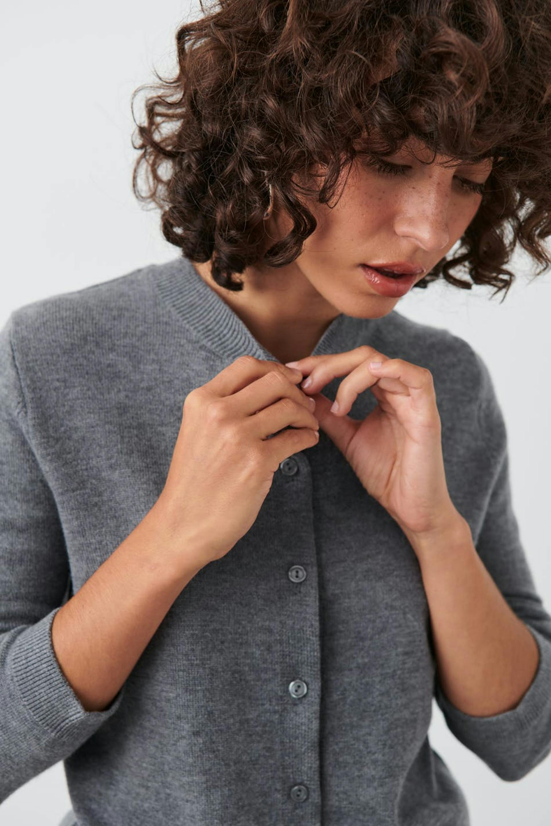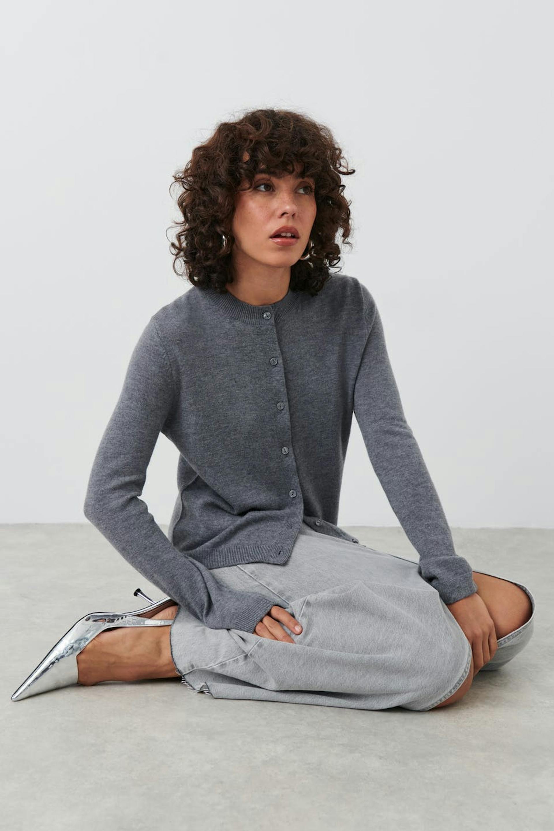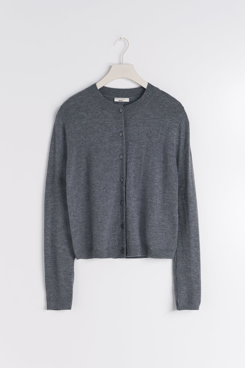 Finstrikket kardigan i ull med figurnær passform. Kardiganen er grå og har knapping på forsiden. Den har rund hals og ribbestrikk ved ermeslutten og i nedre kant.