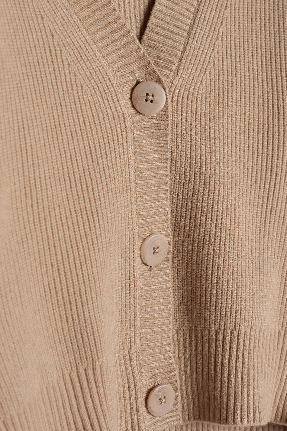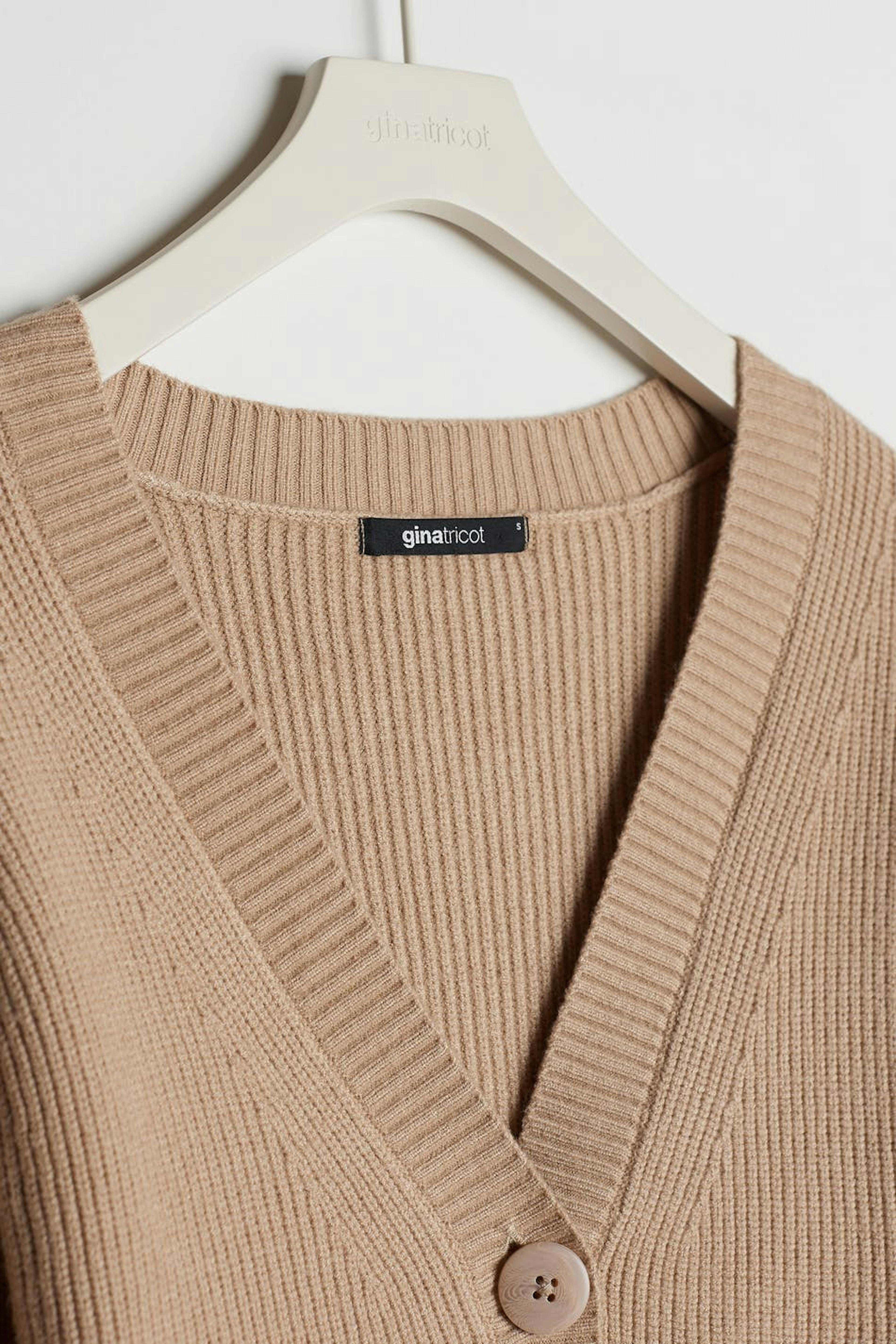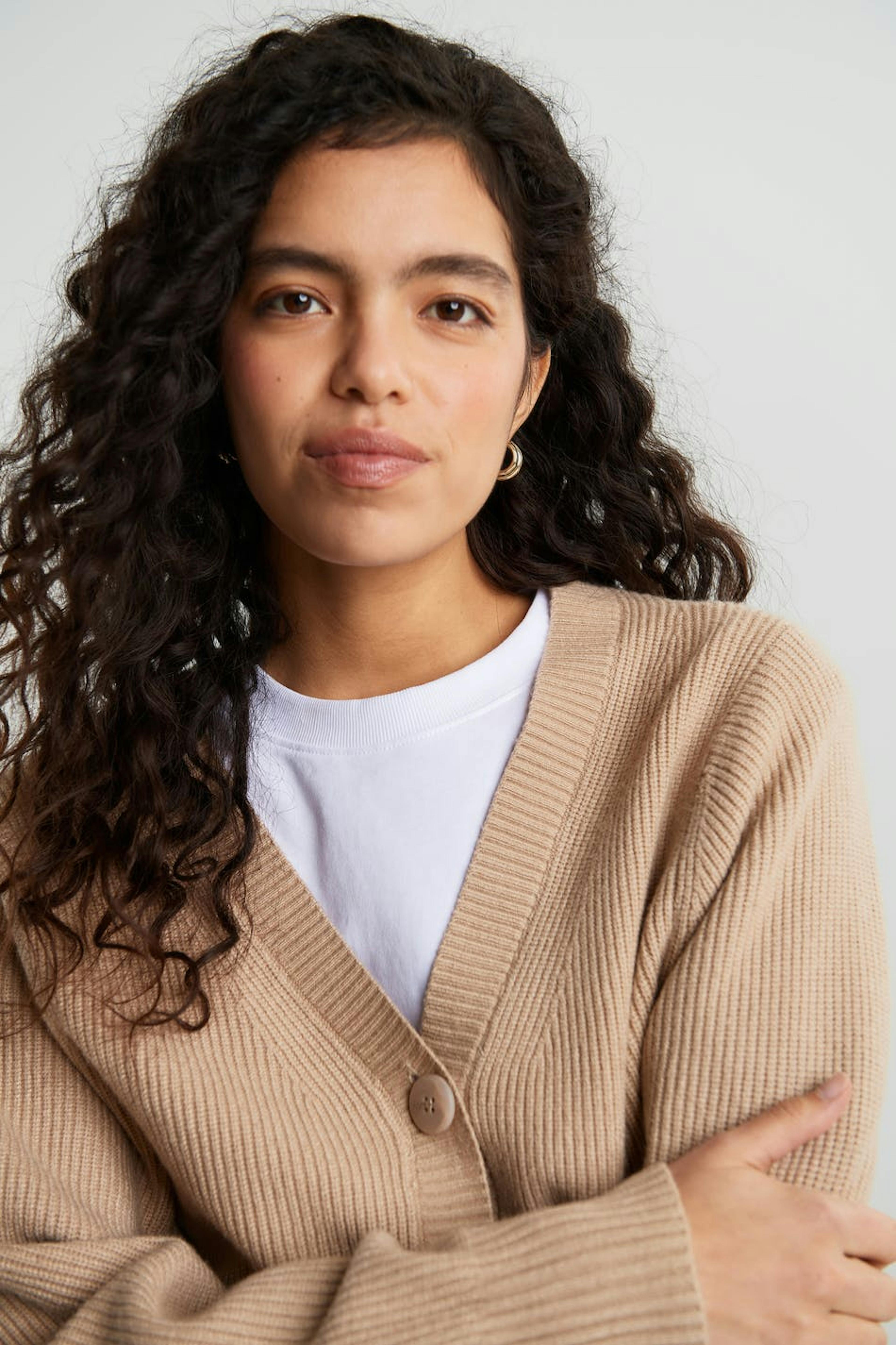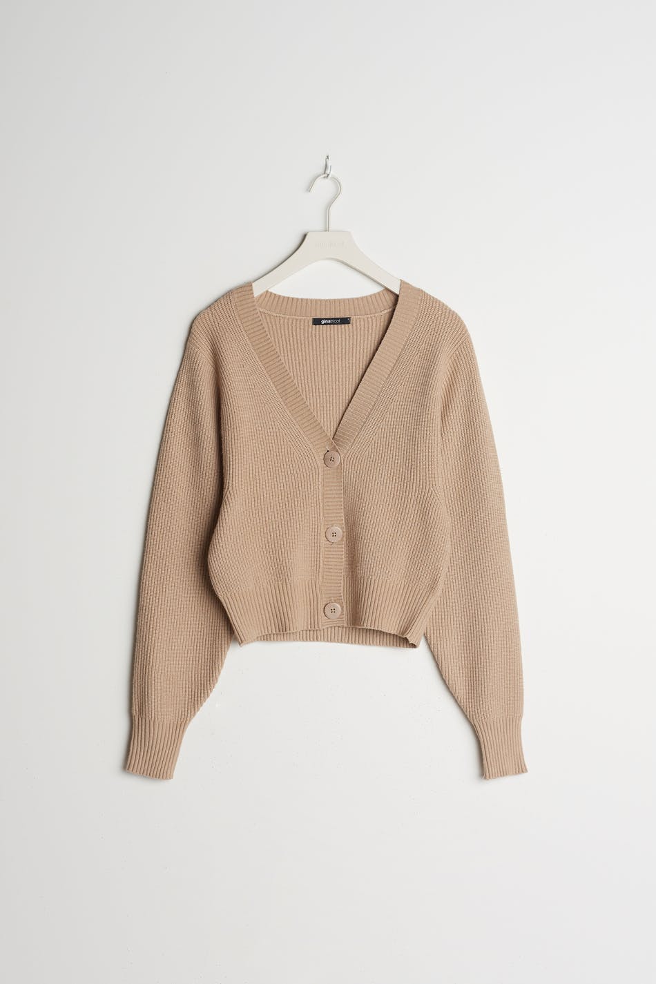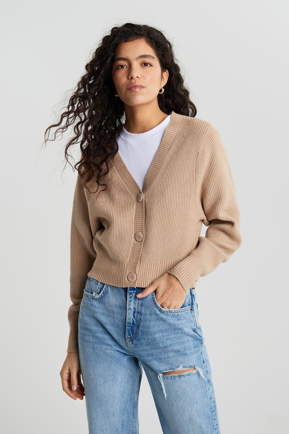 Strikket genser med en kort, posete passform. Genseren er beige og har et v-hals snitt. Den har knapper foran.