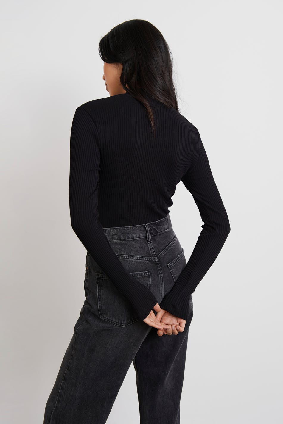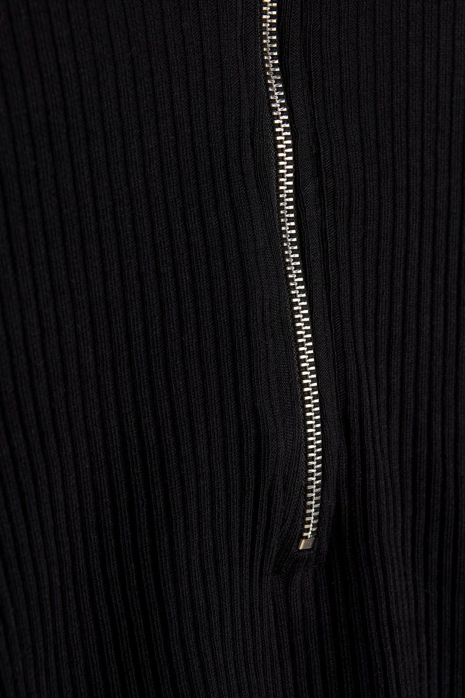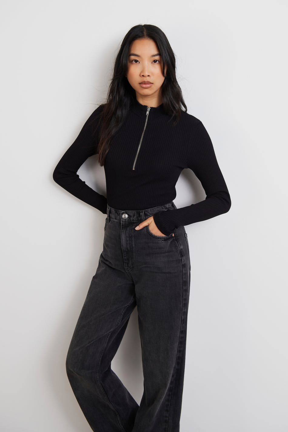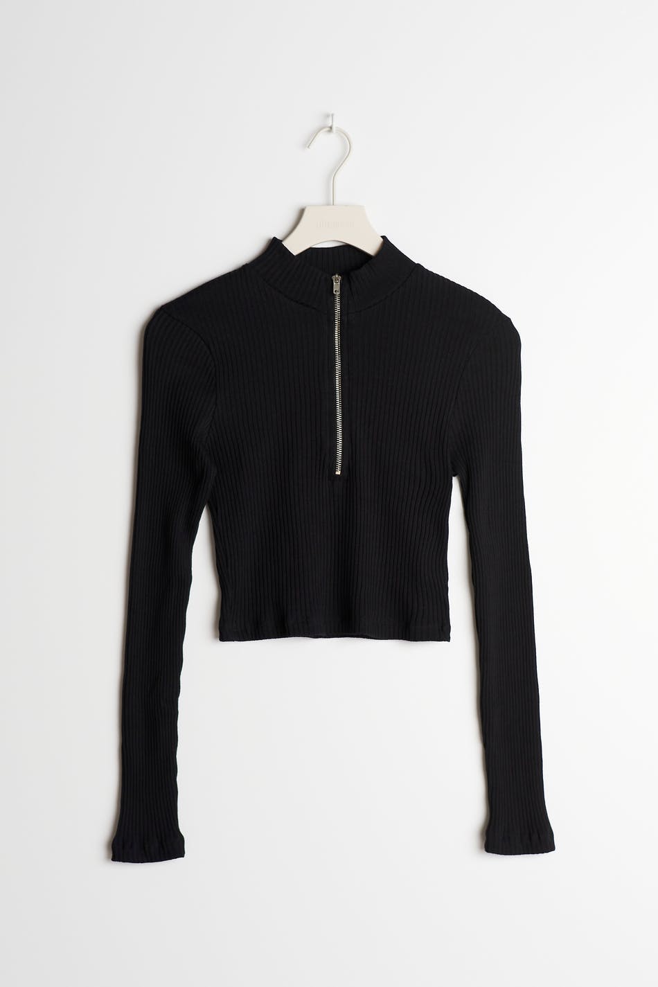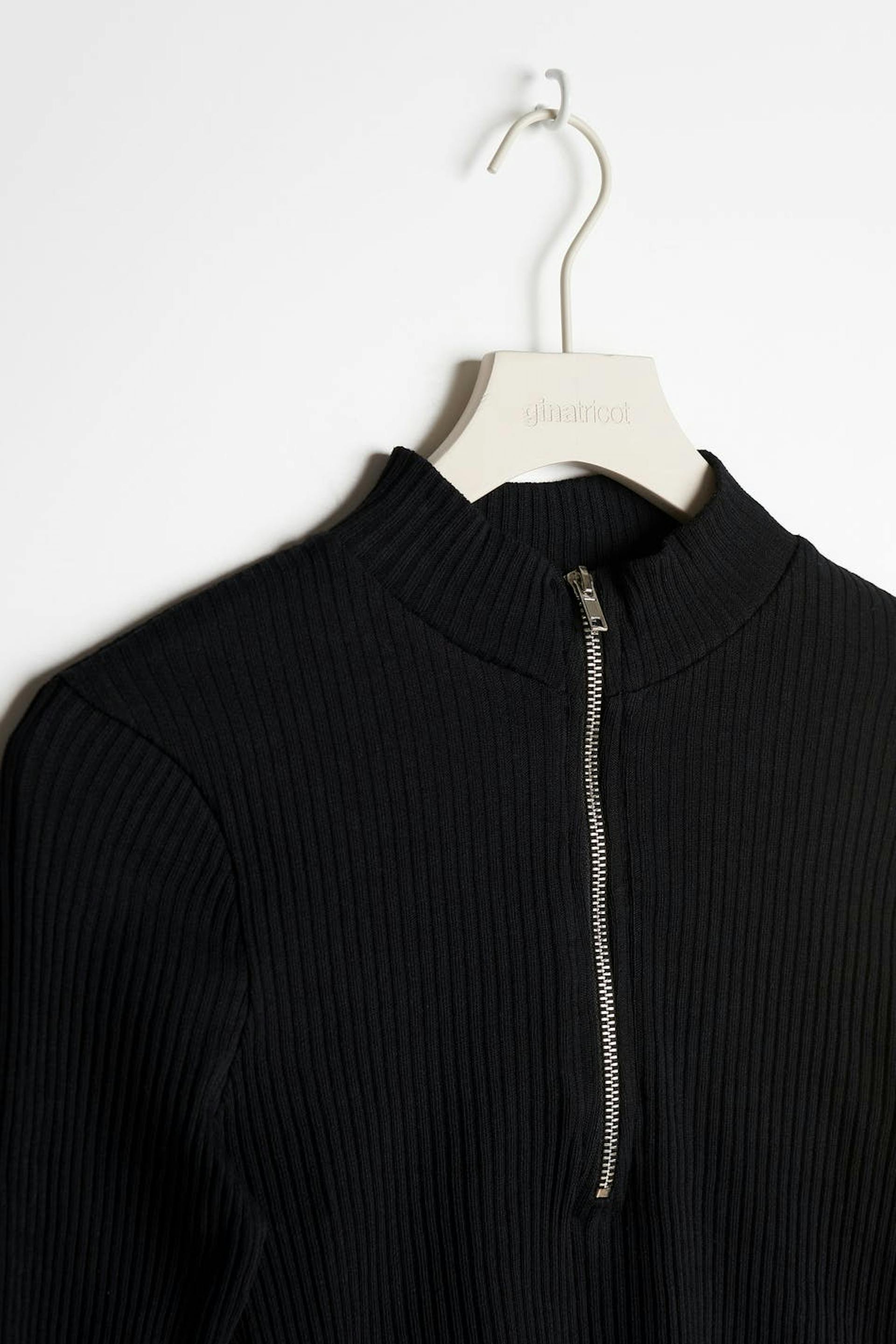 Ribbet polohals med tilpasset passform. Genseren er svart og har en høy krage. Den har lange ermer og en halv glidelås på toppen.