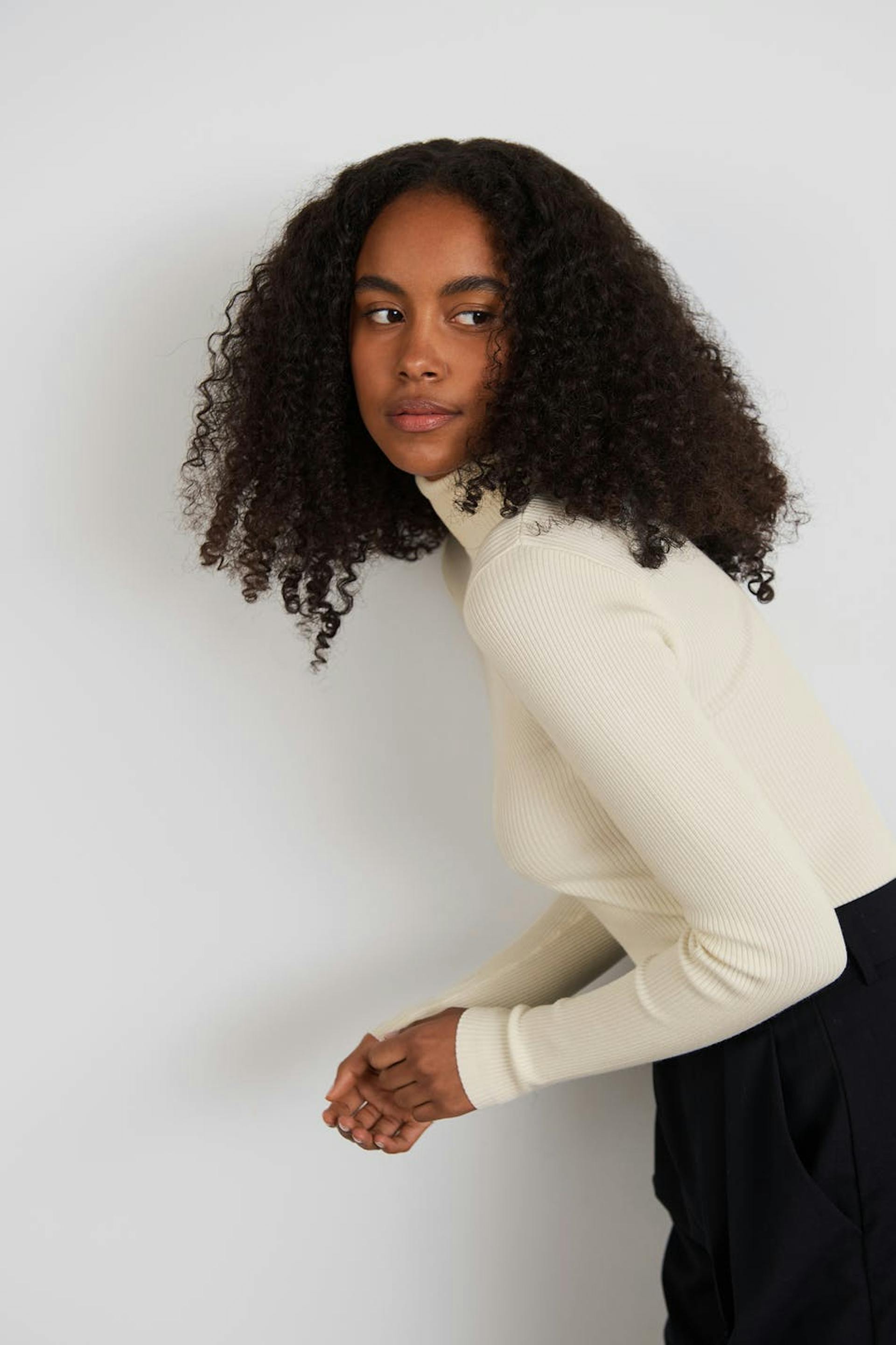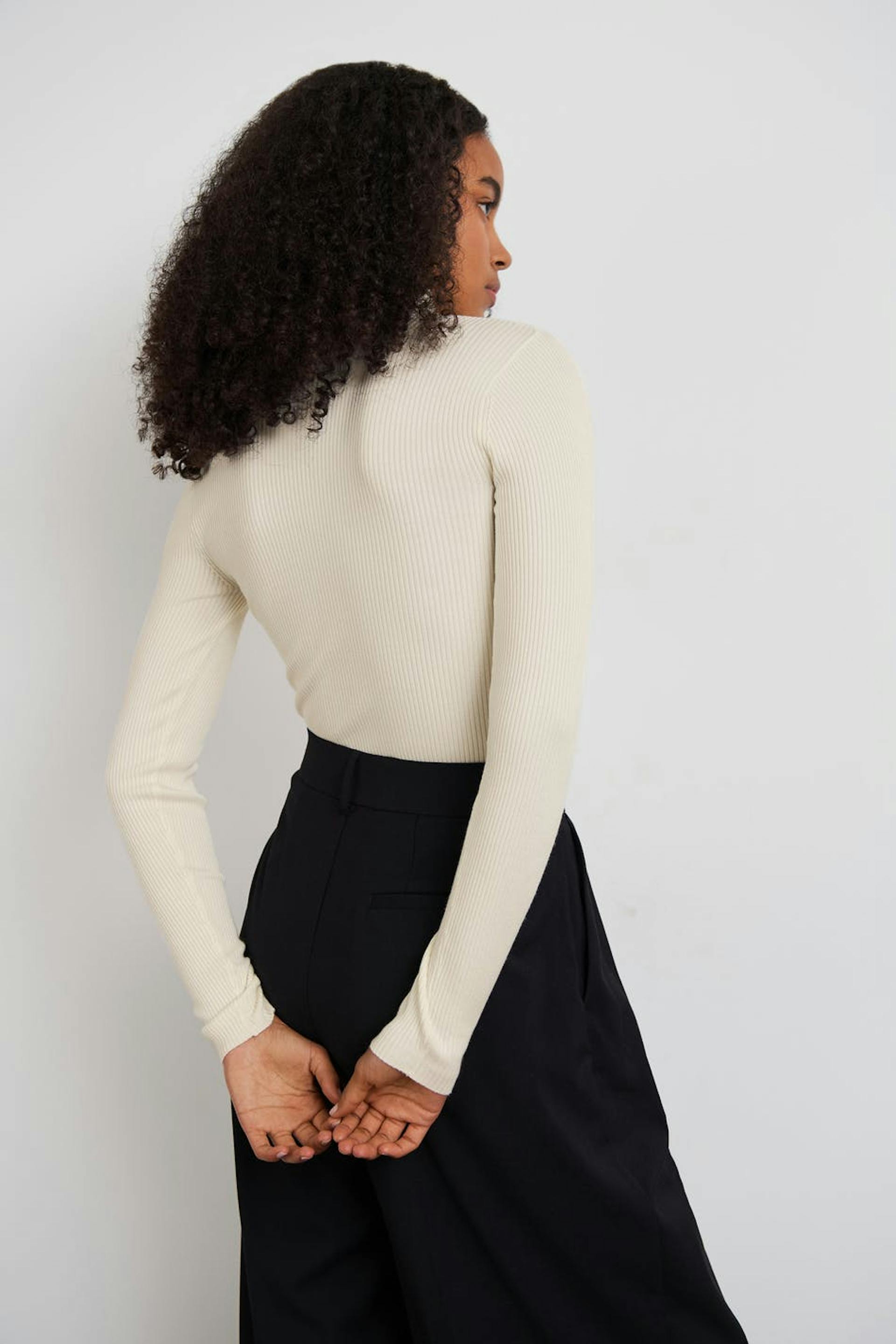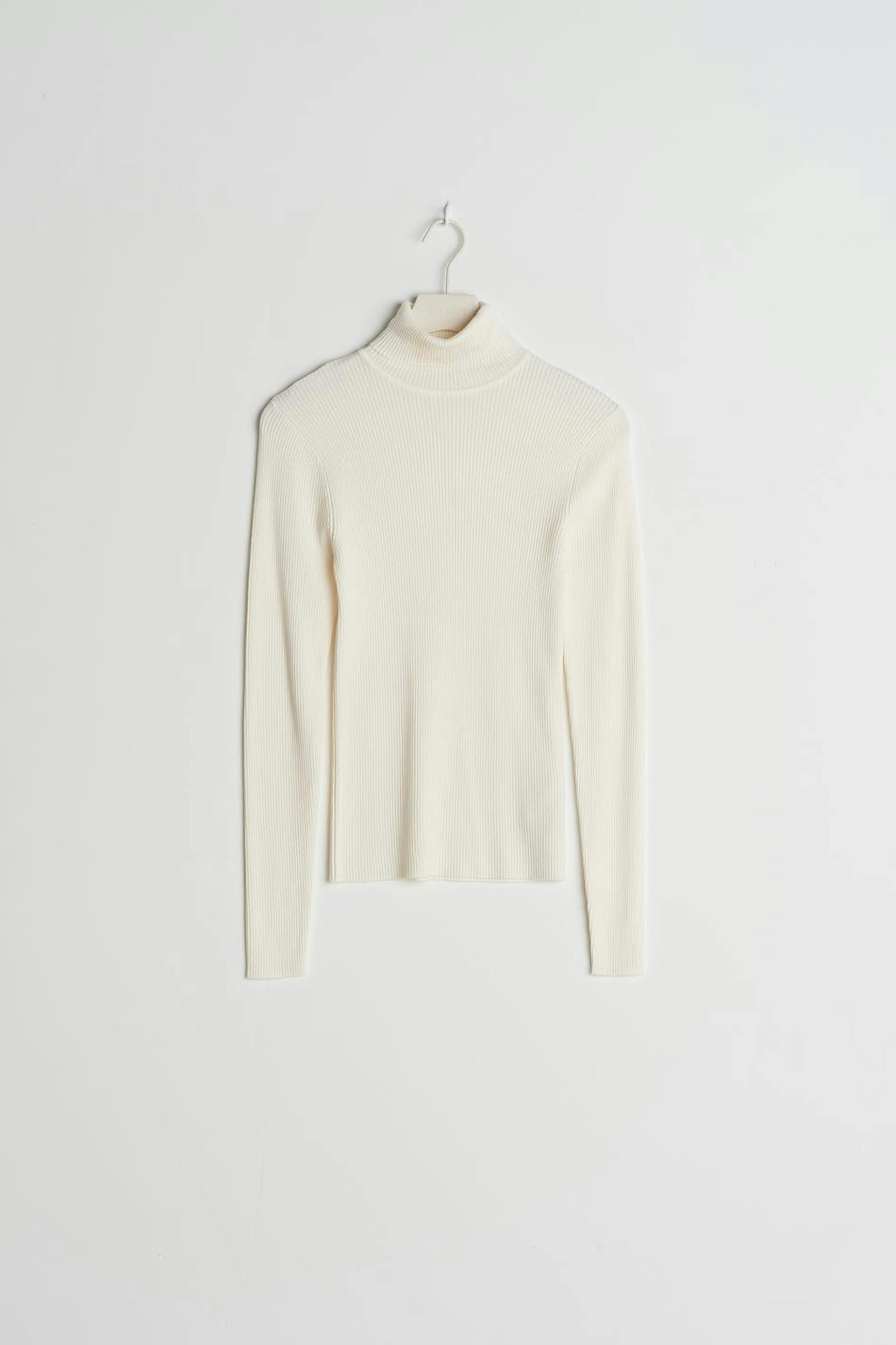 Strikket topp med pologenser. Toppen er hvit, langermet og ribbet.