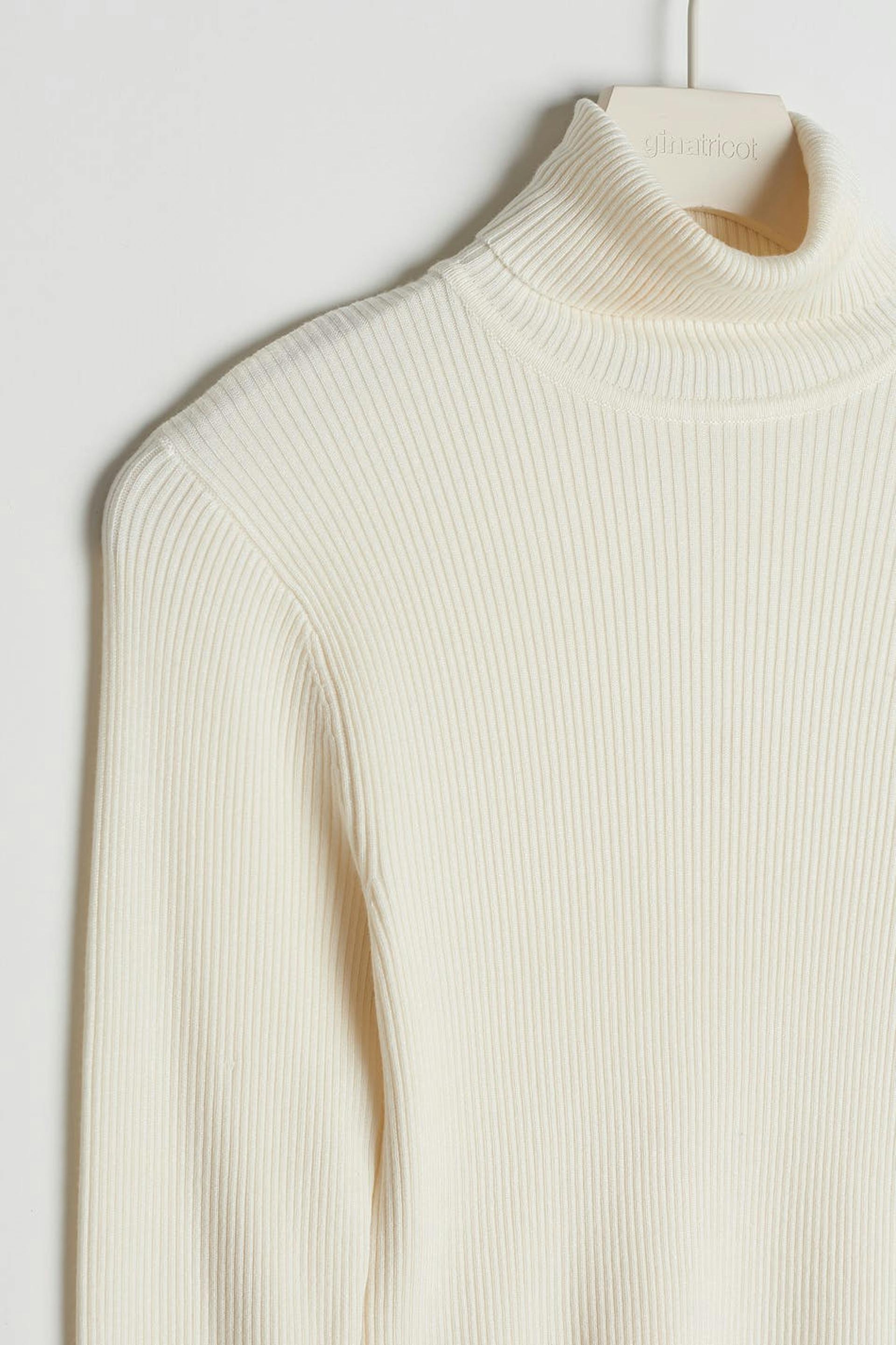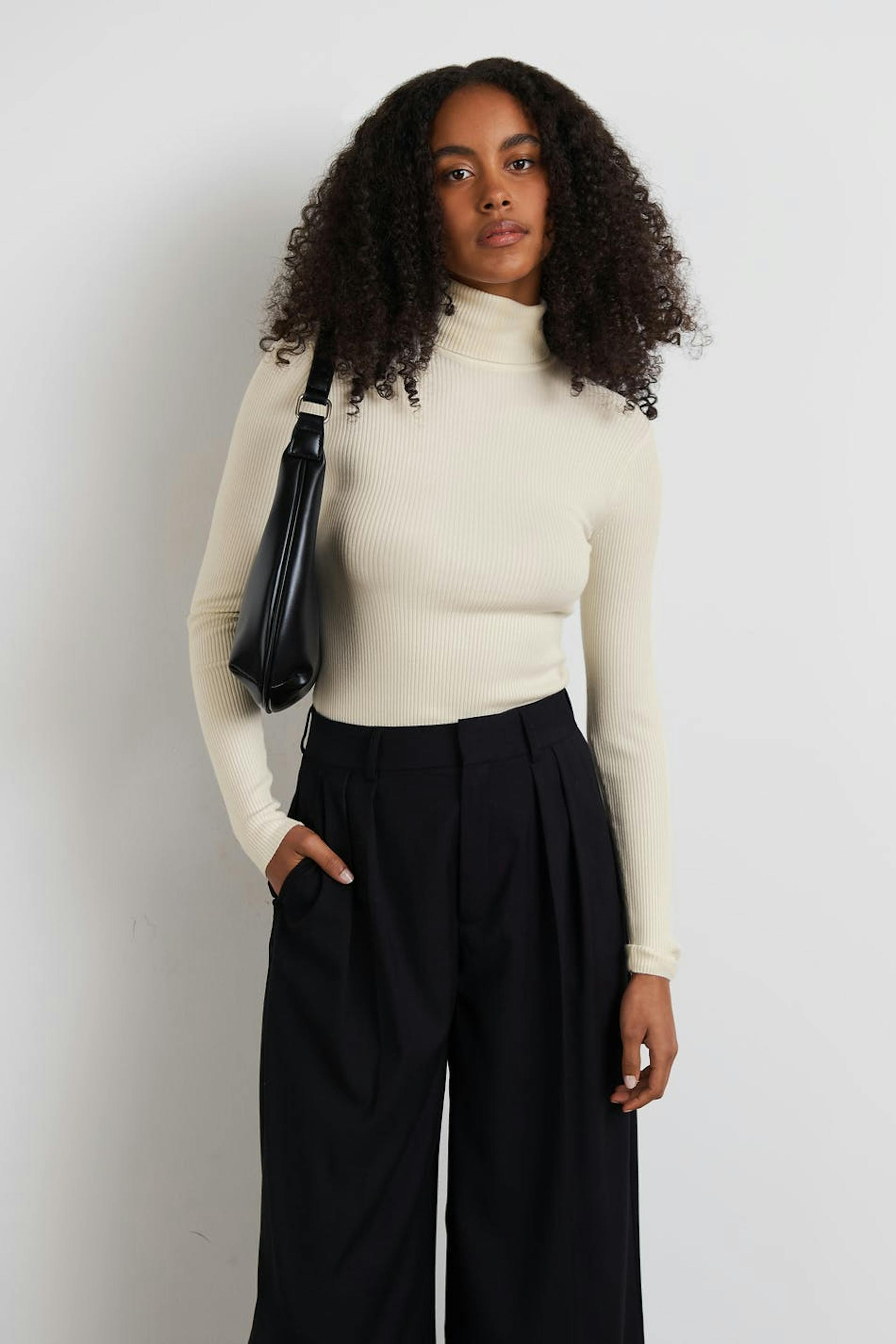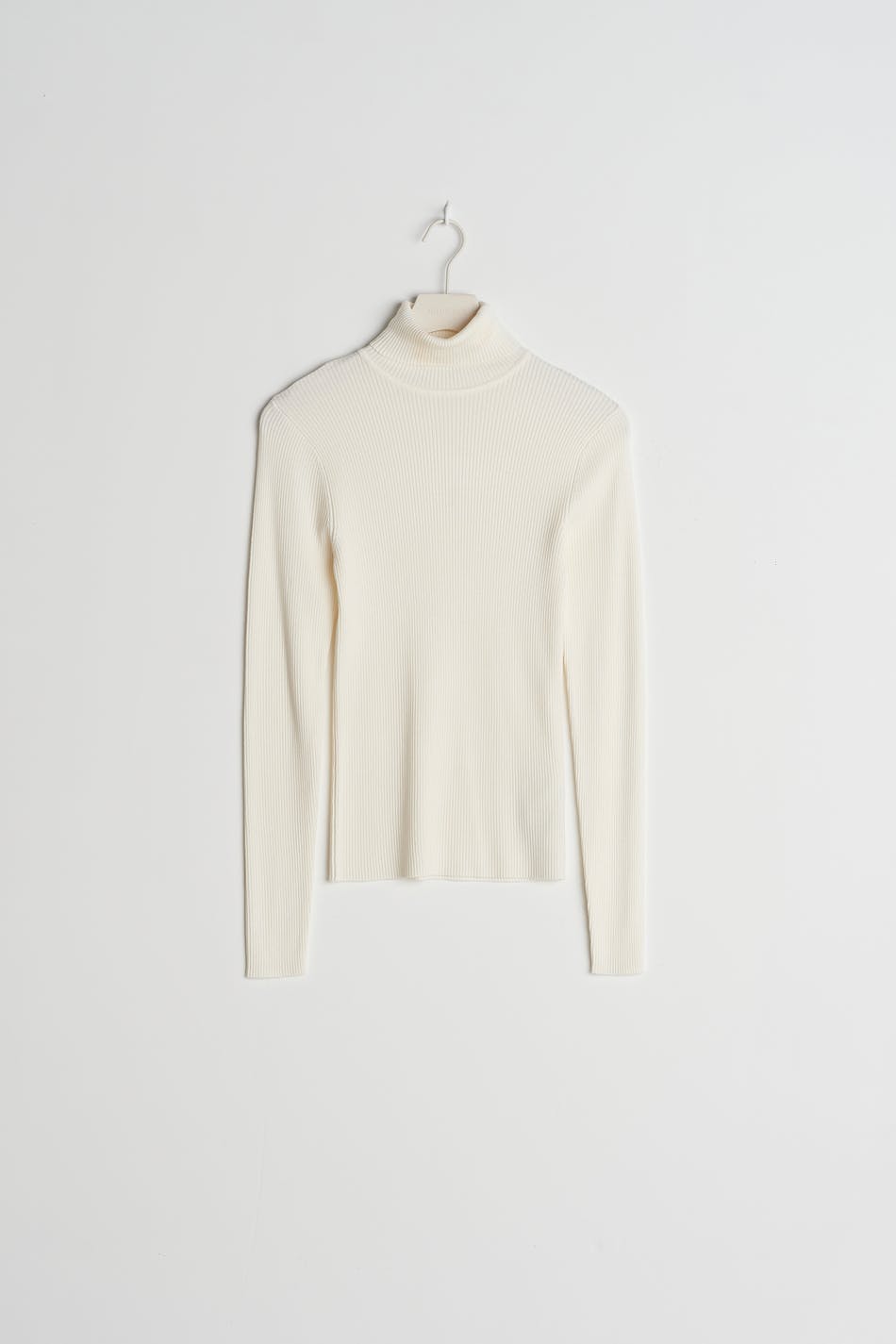 Strikket topp med pologenser. Toppen er hvit, langermet og ribbet.