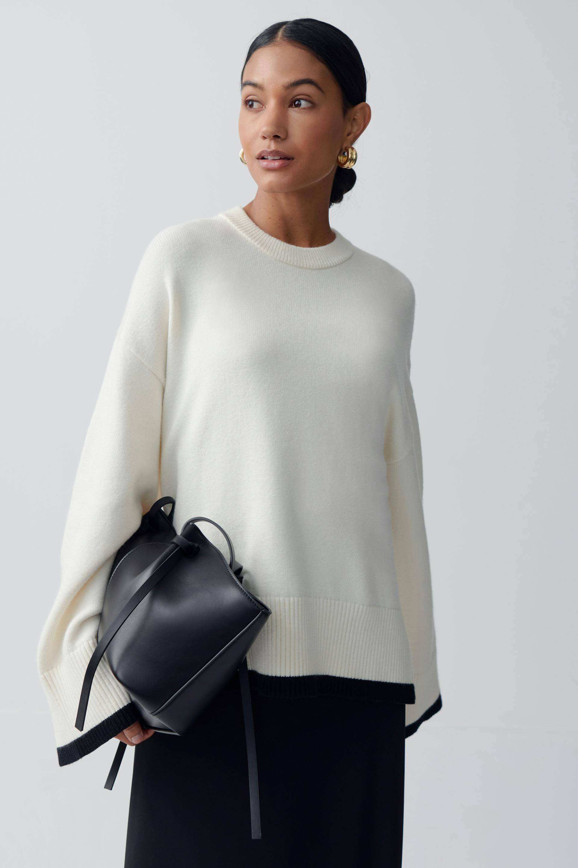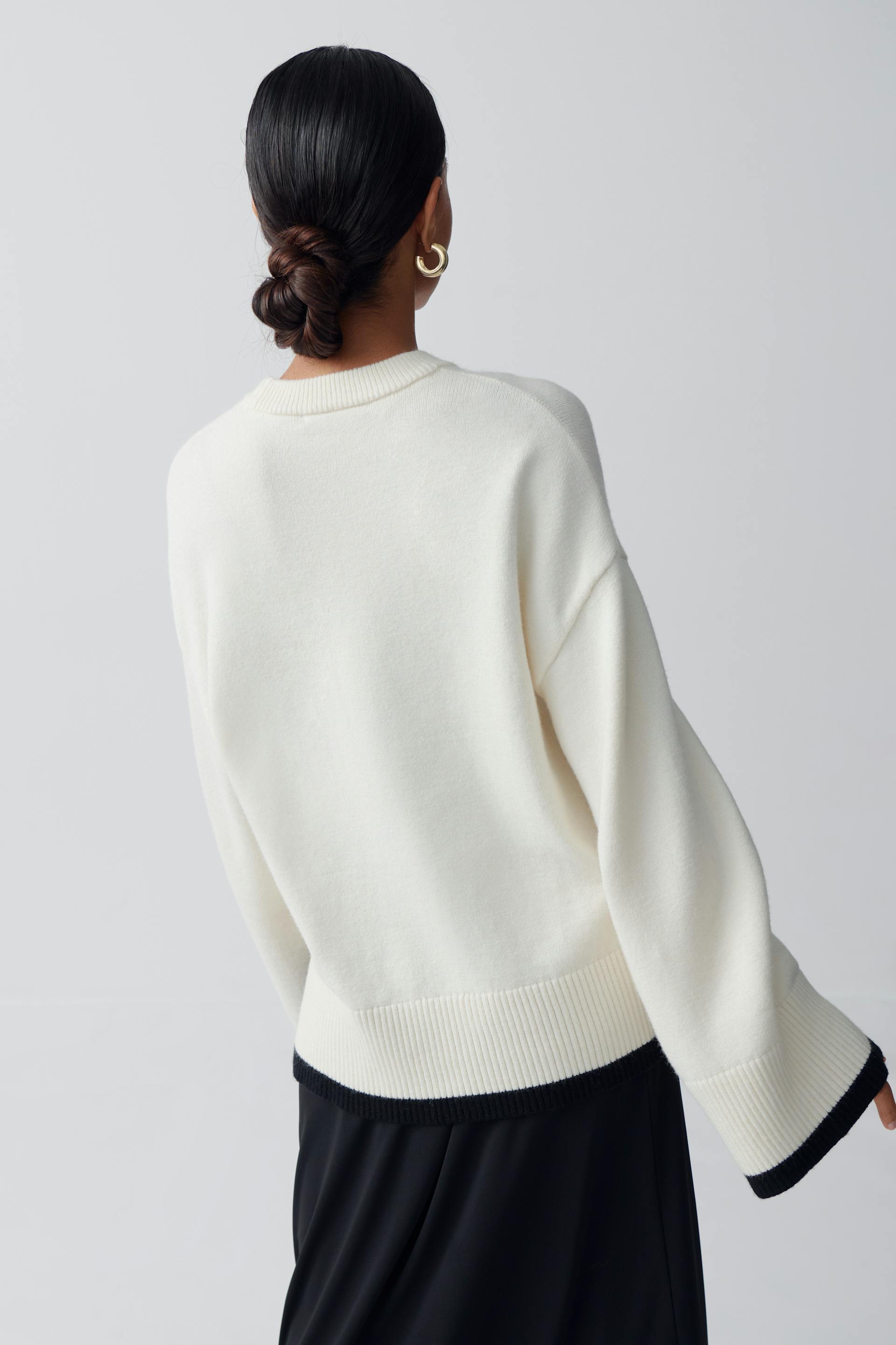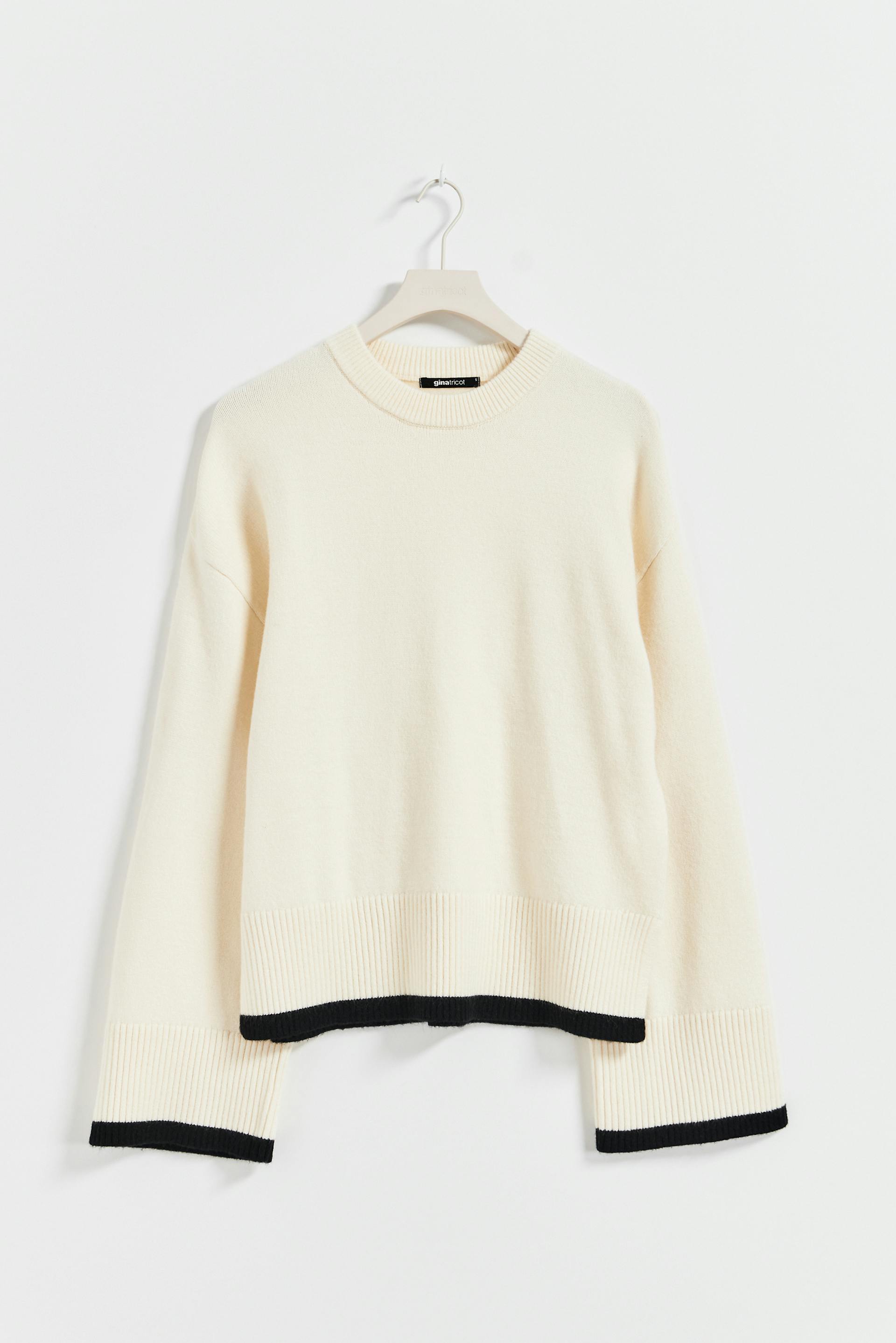 Strikket genser med oversized passform. Genseren er hvit og har kontrastfarget detalj i nedre kant. Den har rund hals, langt erme og utringet skulder.