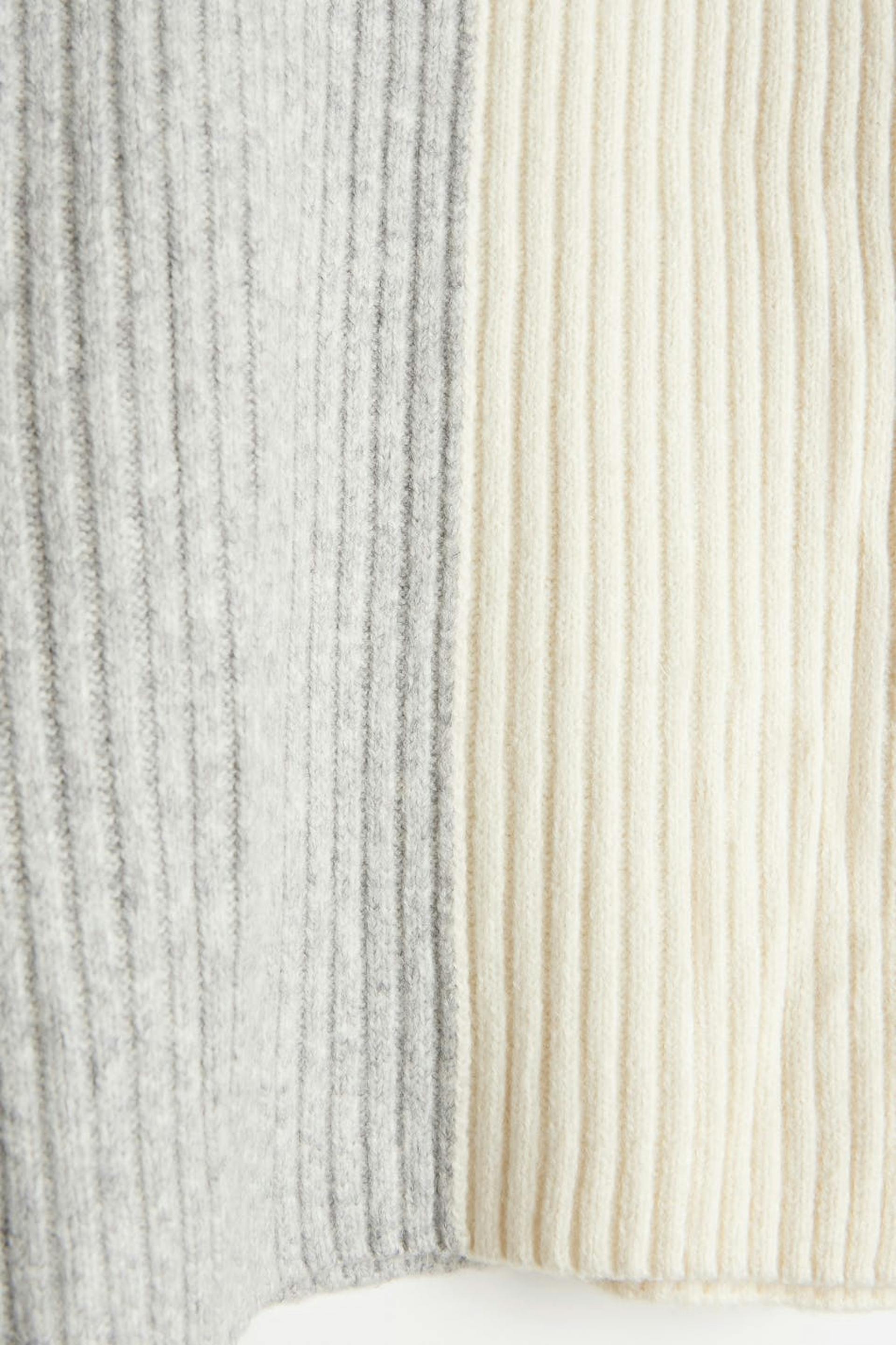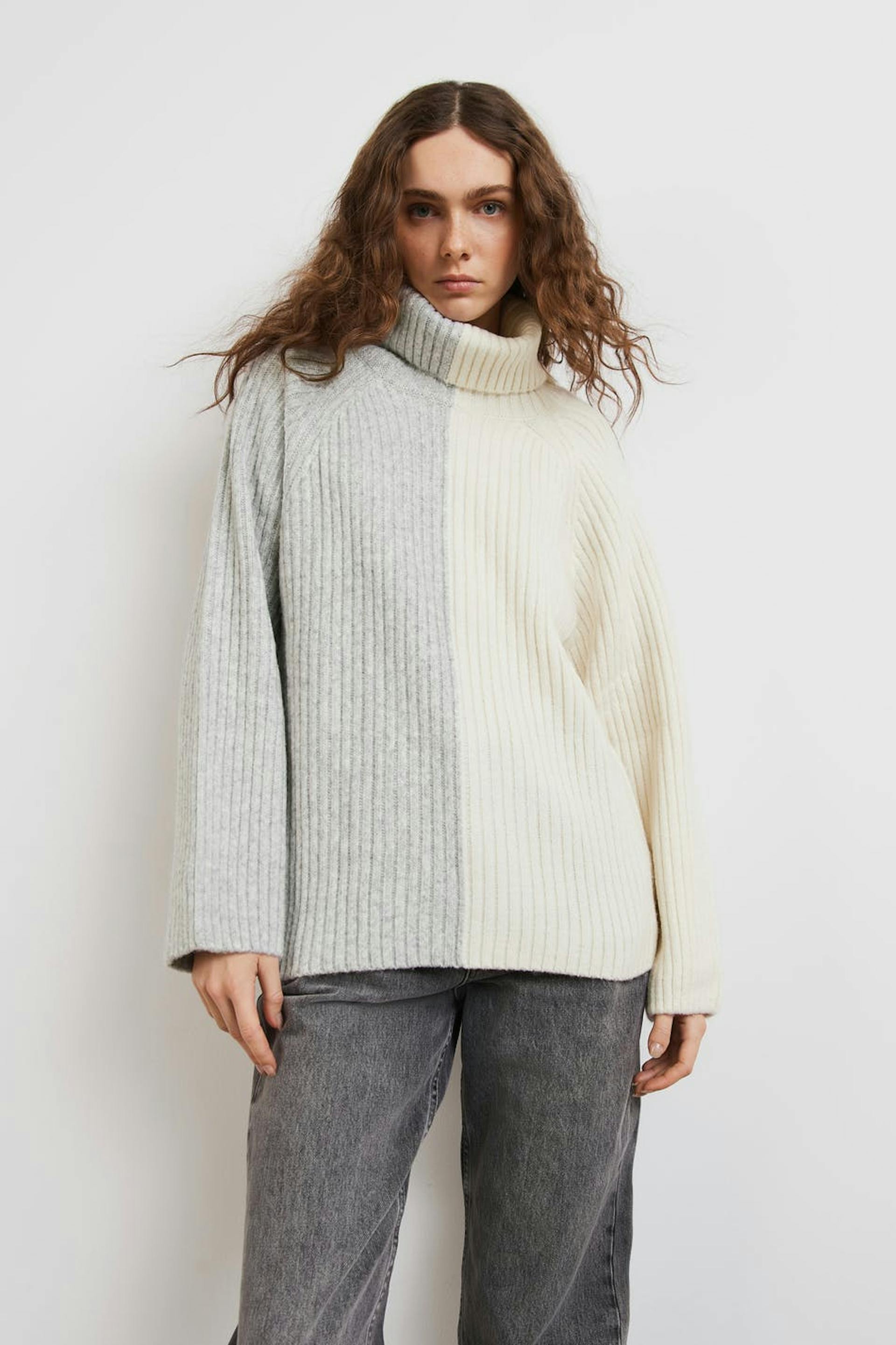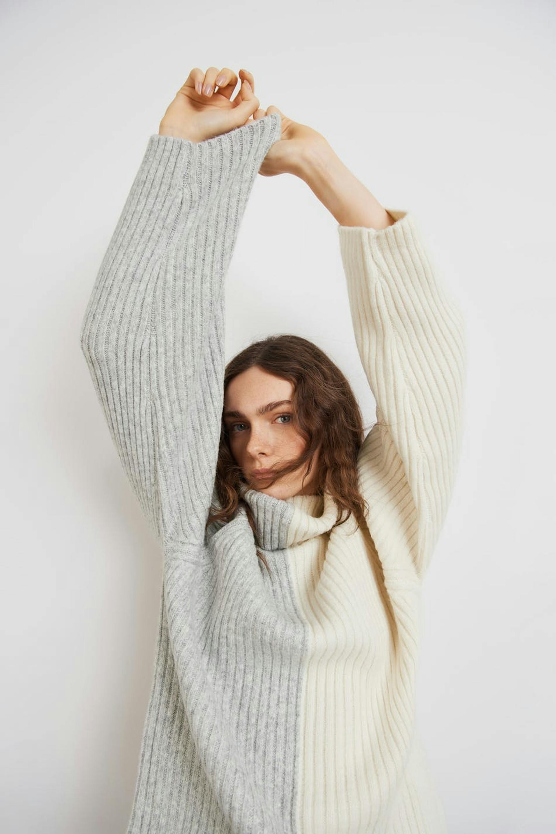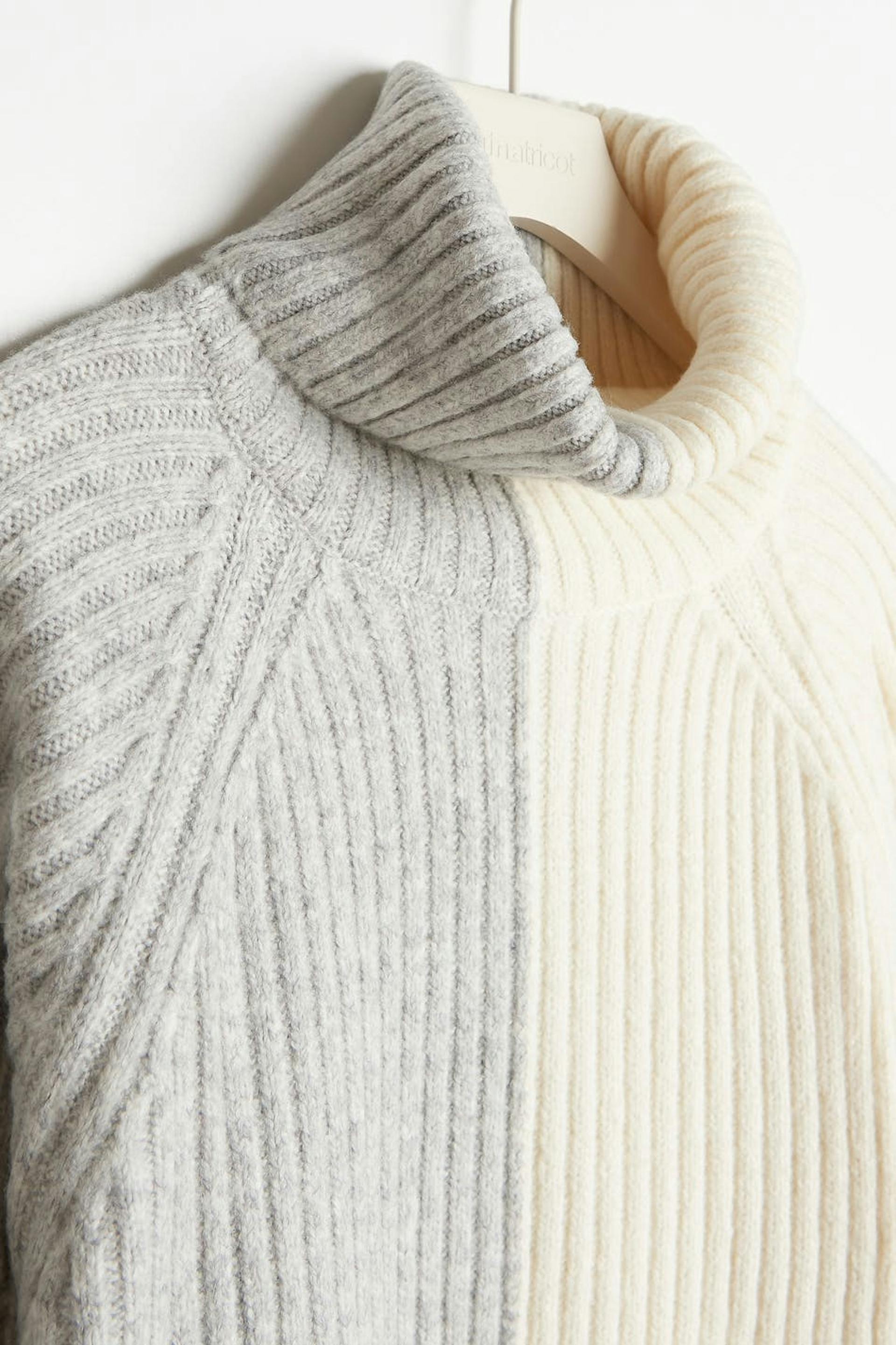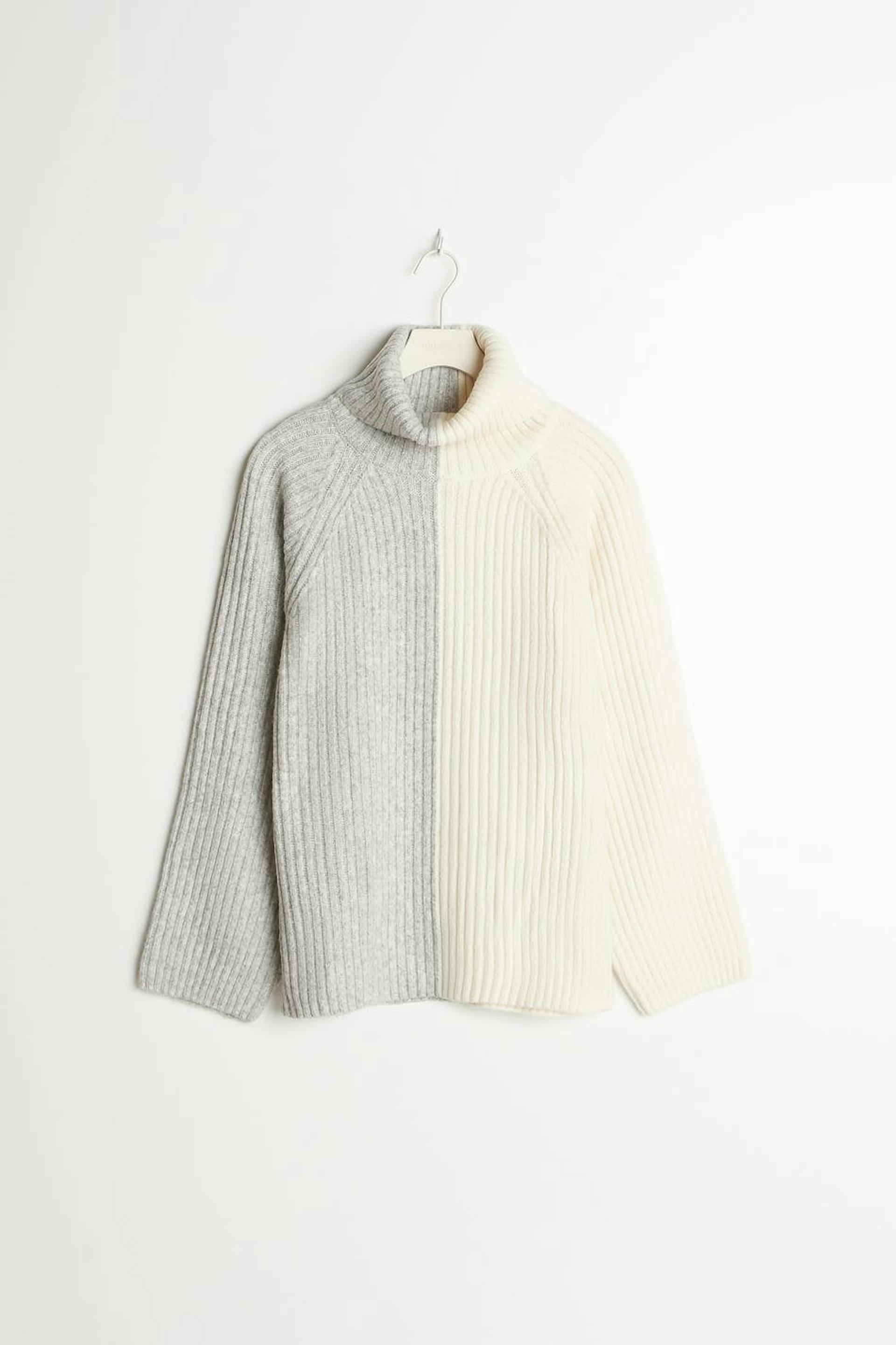 Strikket genser med pologenser. Genseren er grå, hvit og strikket. Den har en løs passform.