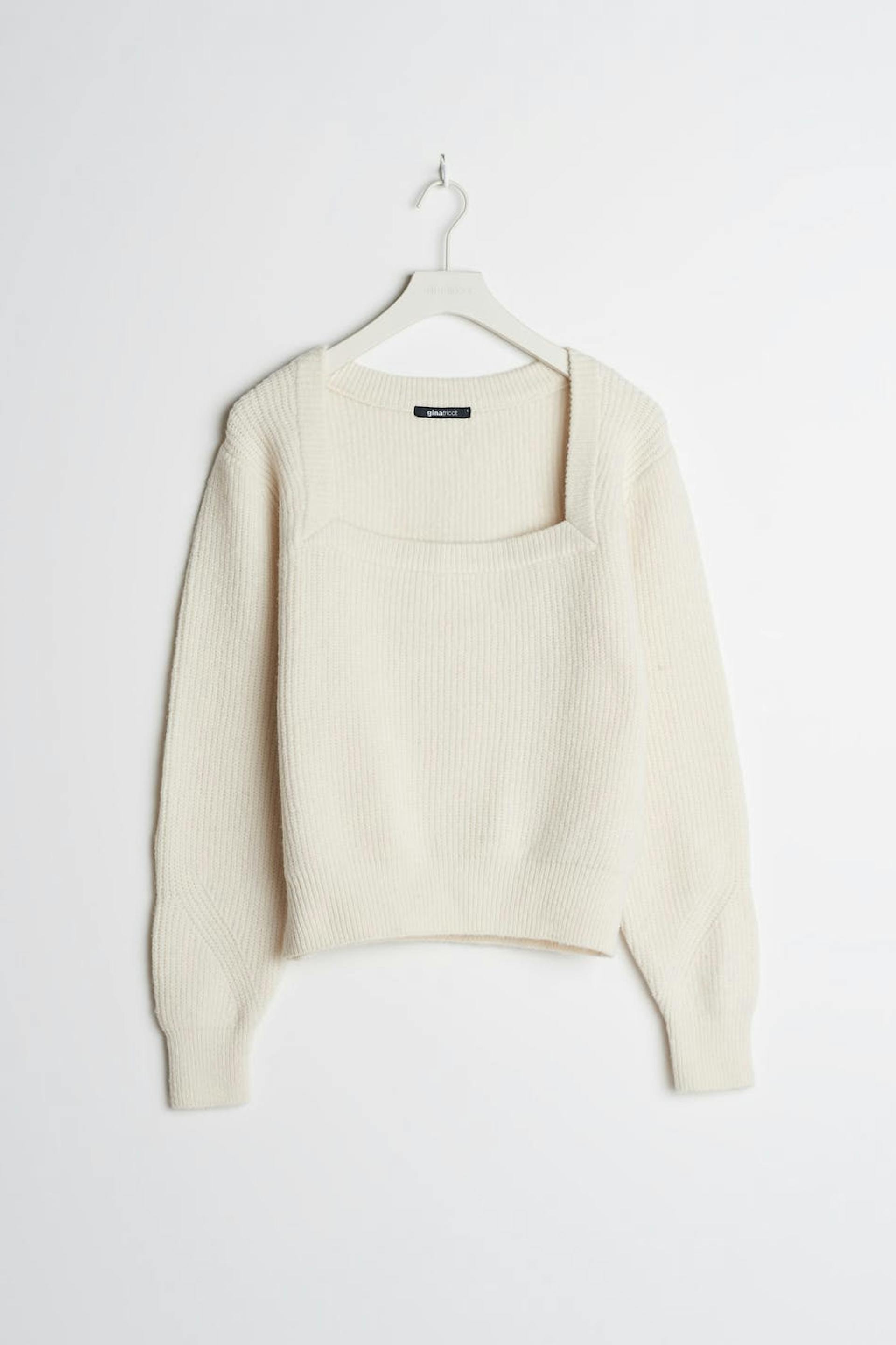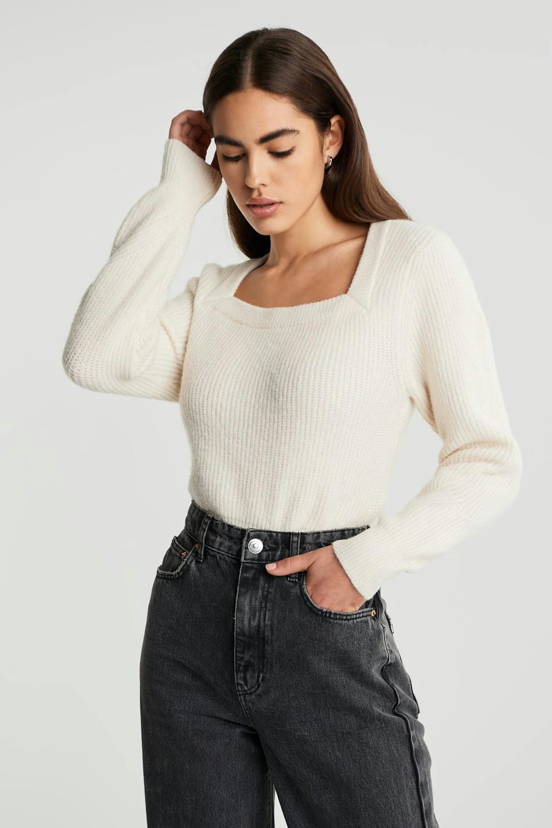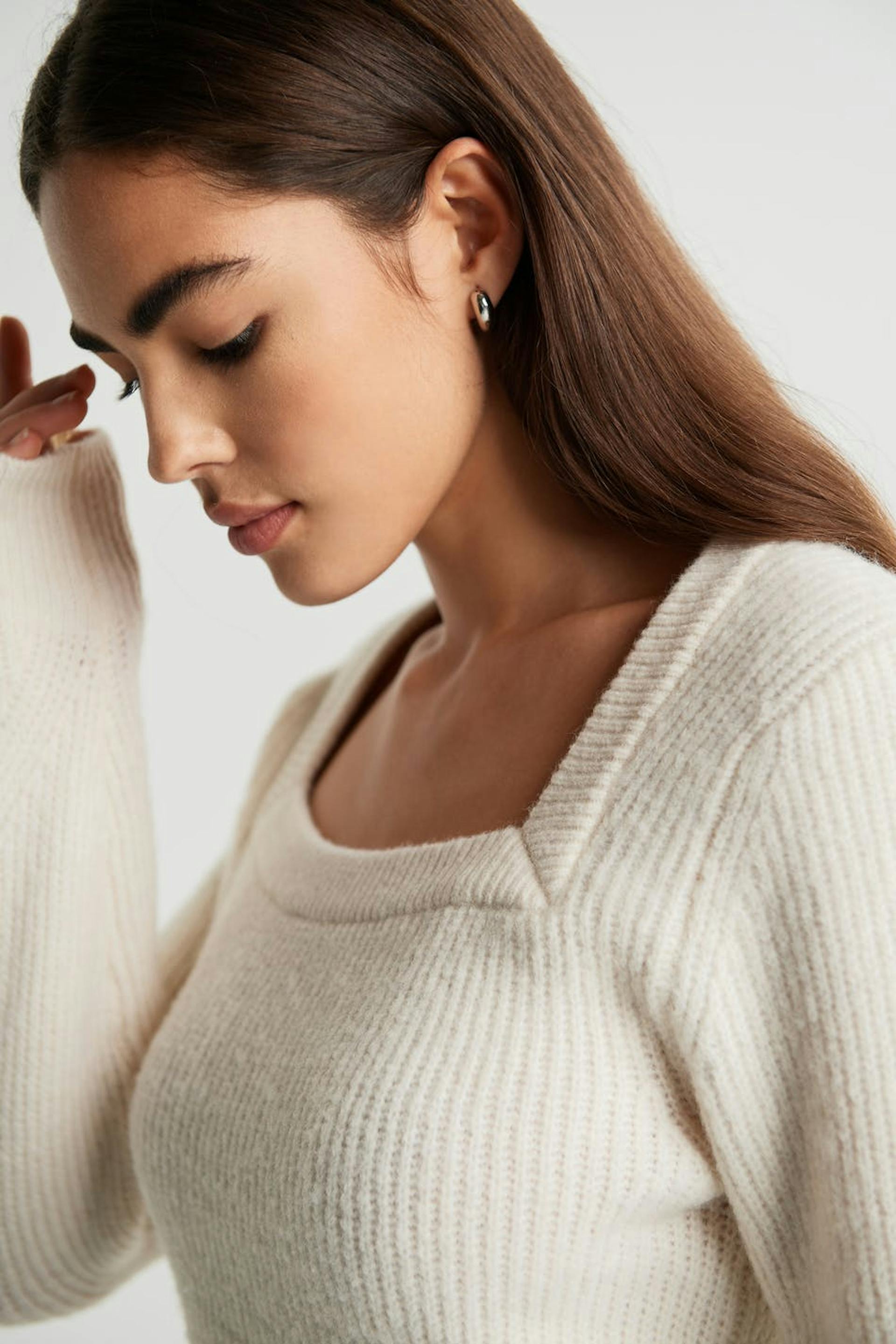 Strikket genser med en firkantet hals. Genseren er beige og har en kort, posete, løs passform.