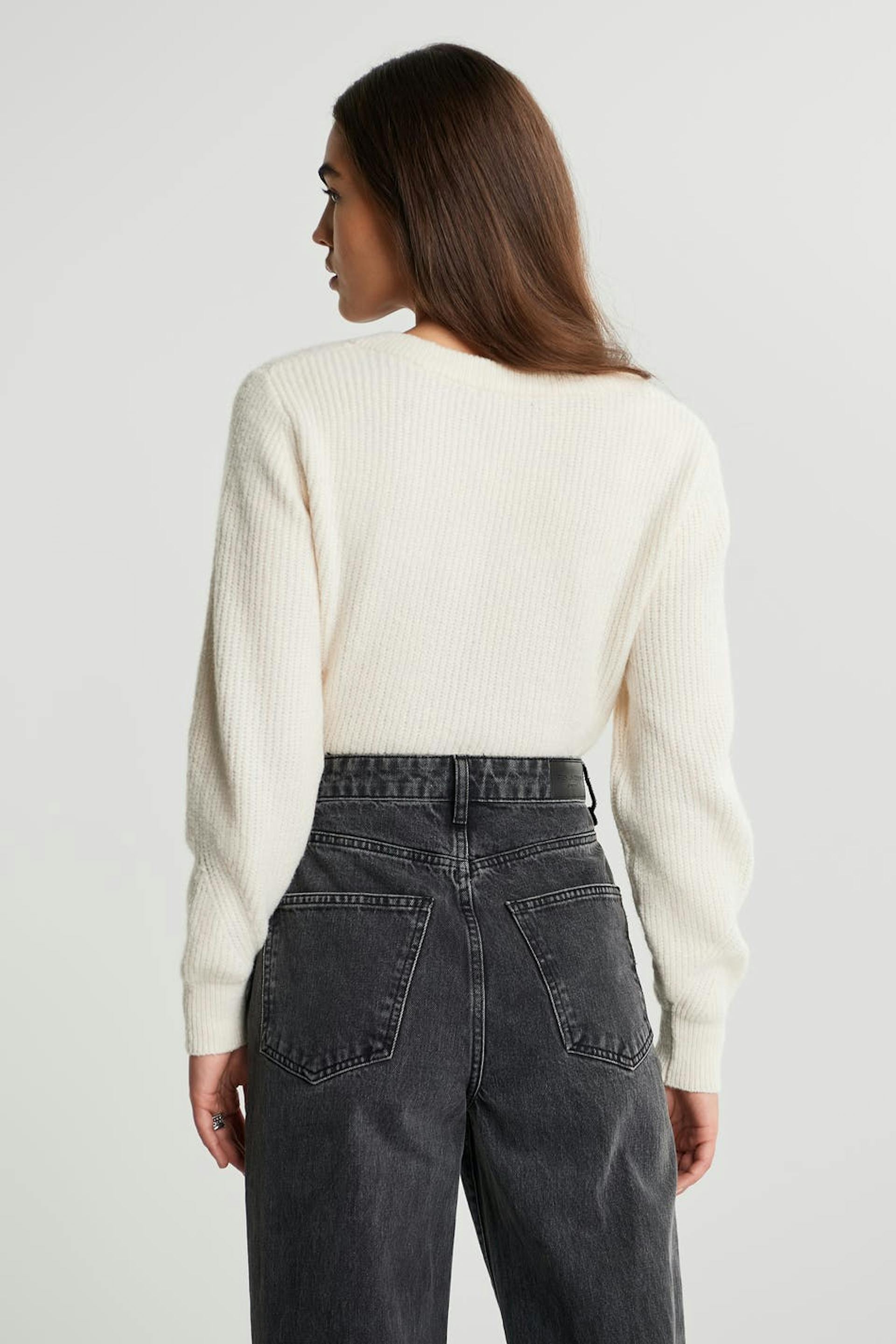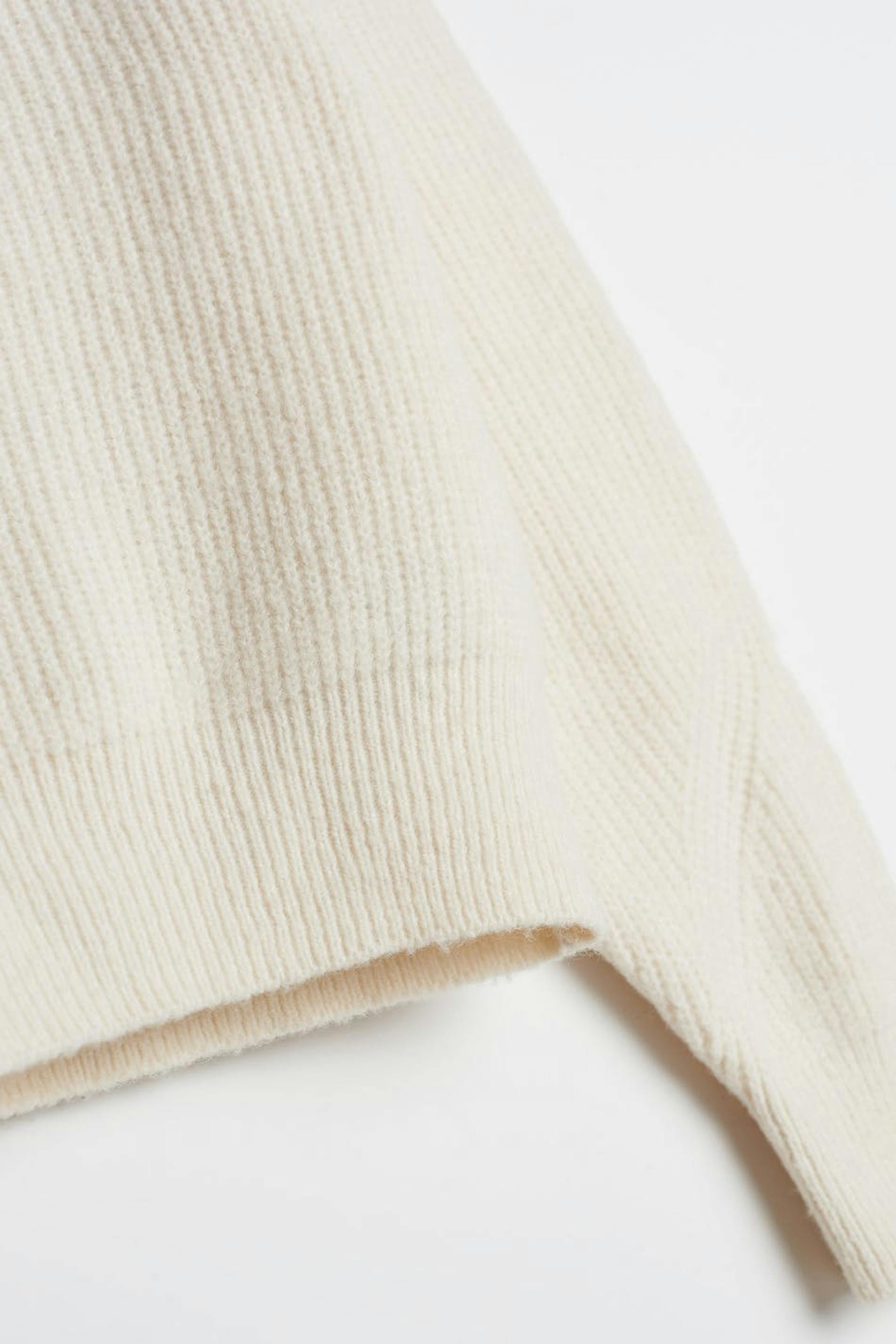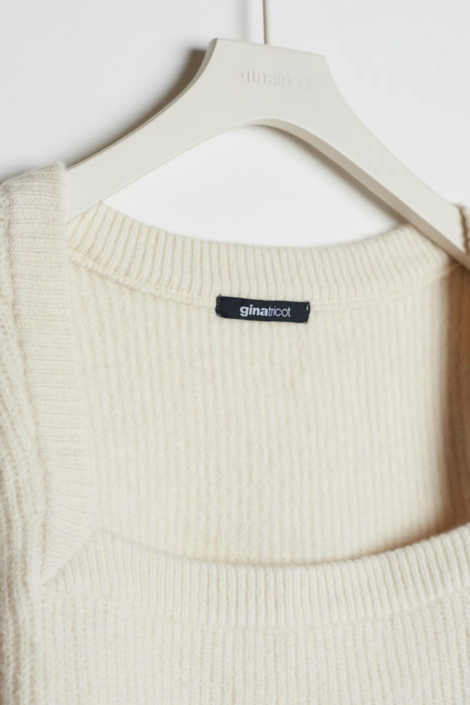 Strikket genser med en firkantet hals. Genseren er beige og har en kort, posete, løs passform.