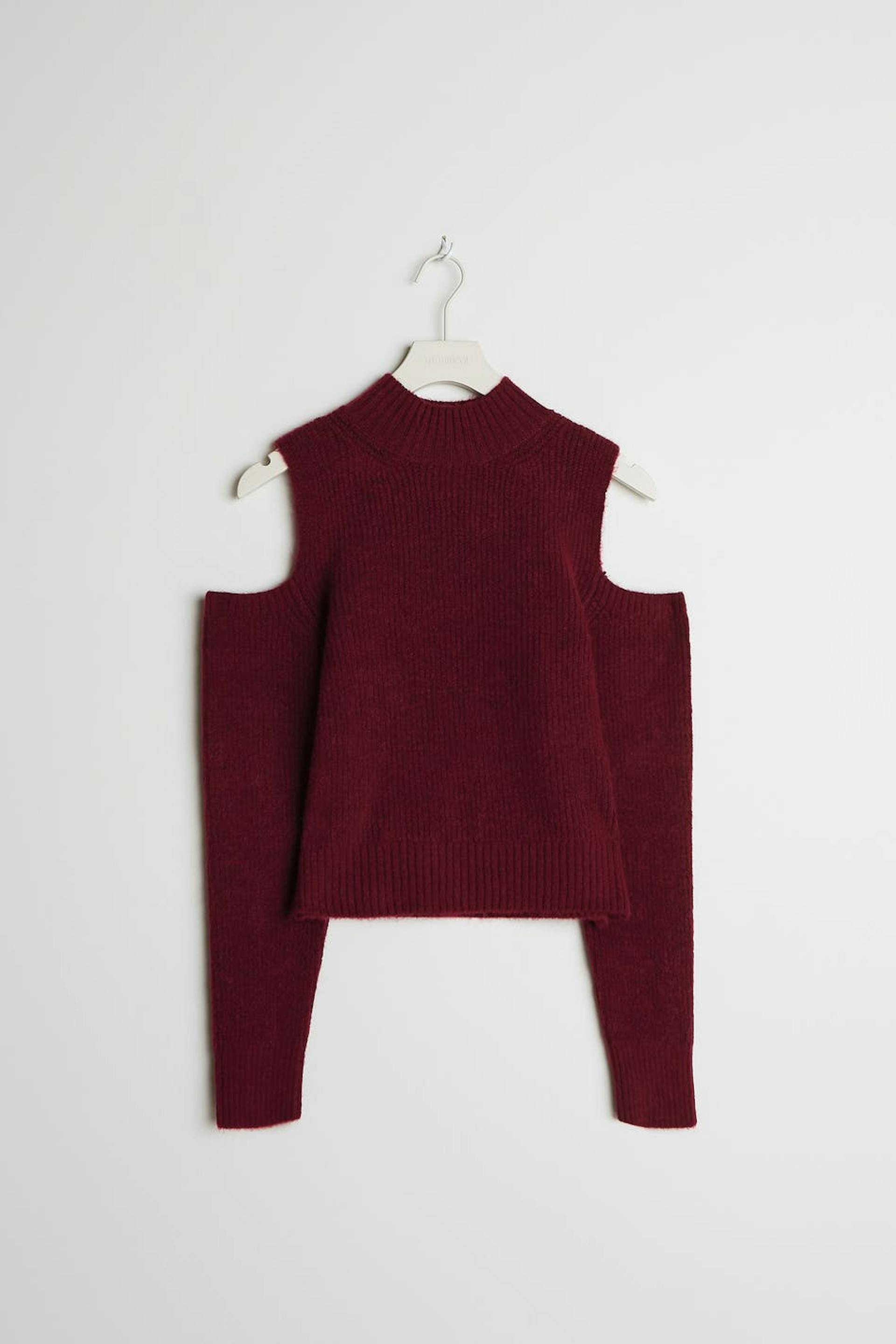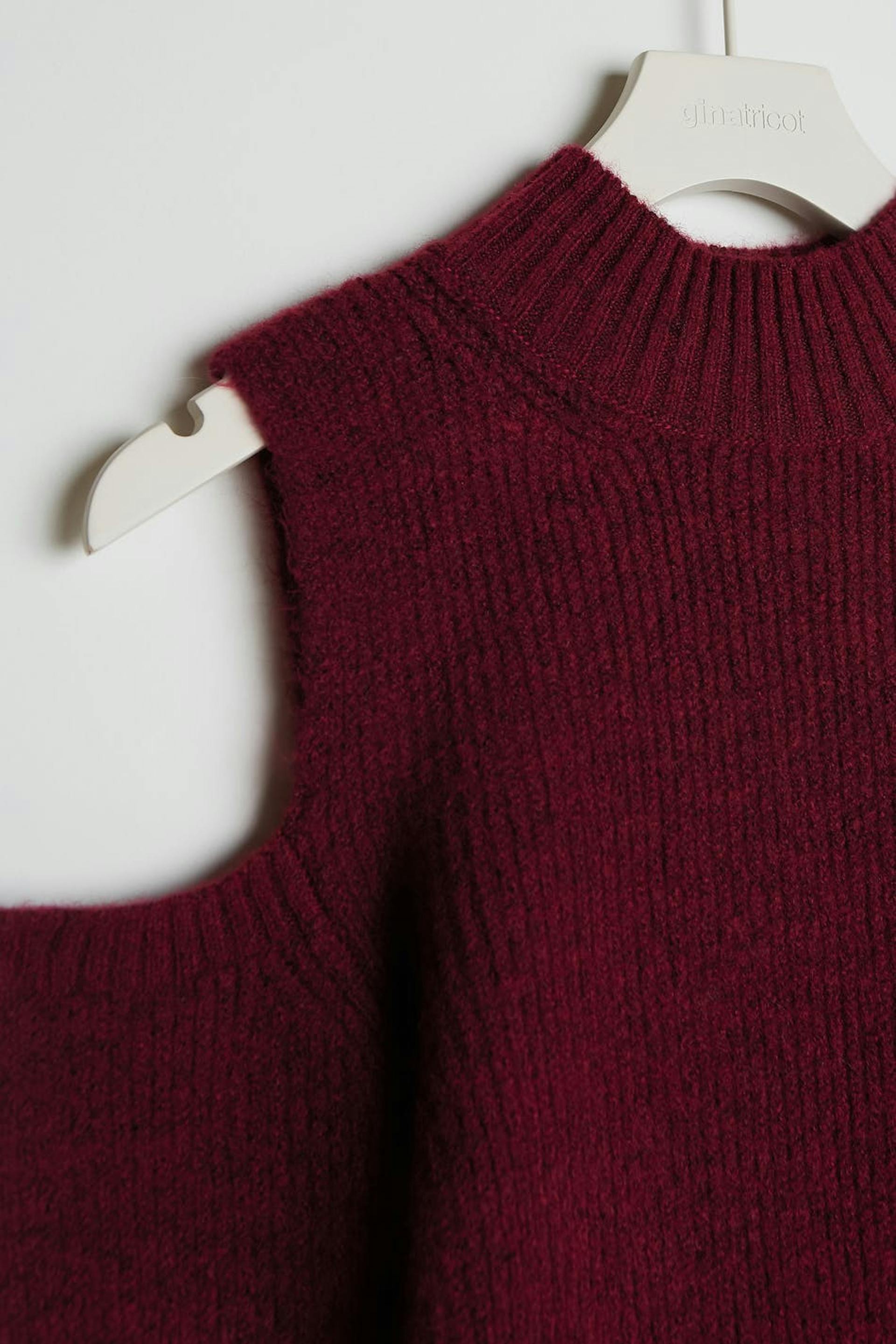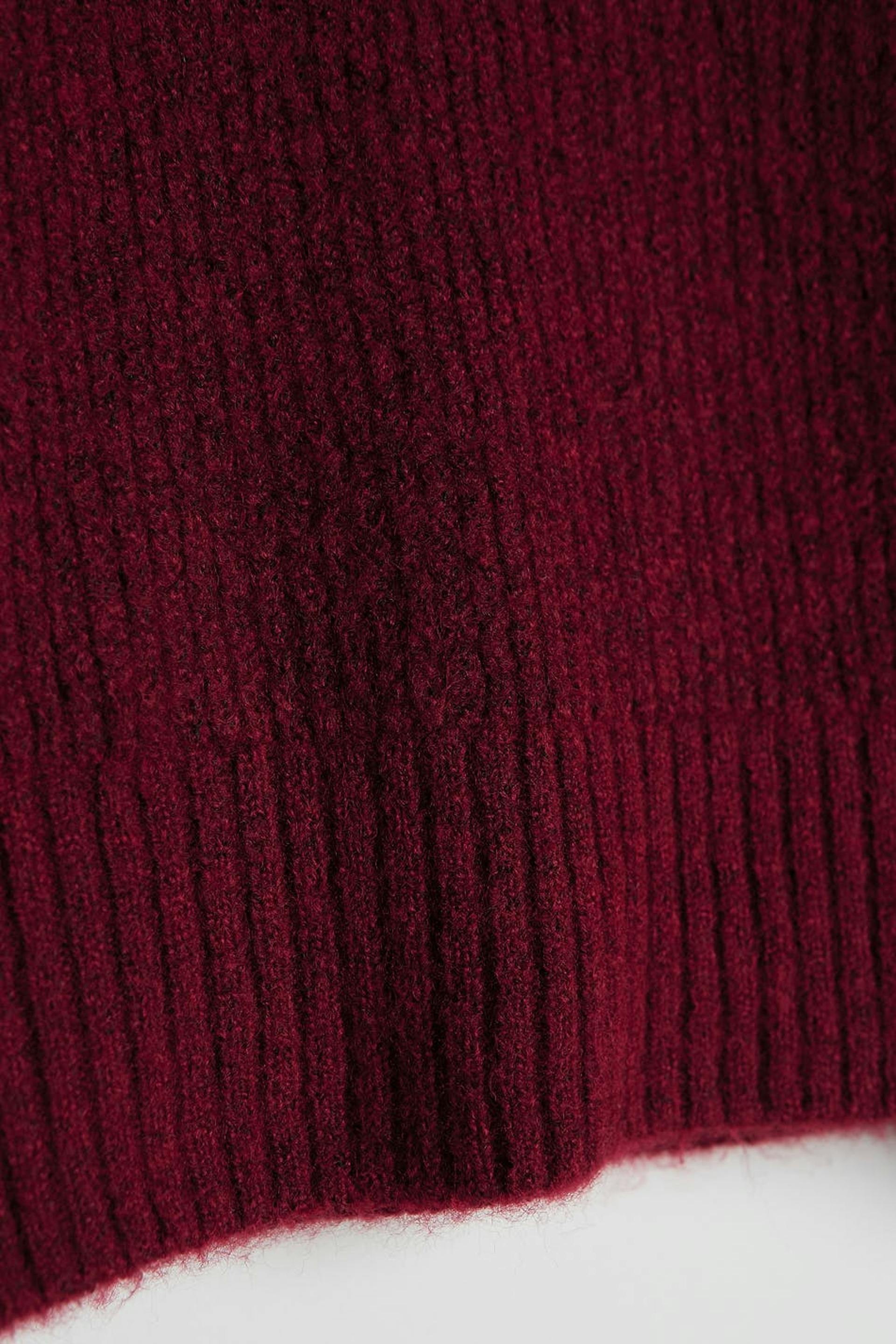 Strikket genser med detaljer på skuldrene med et utsnittet. Genseren er mørkerød og langermet og har en polokrage.