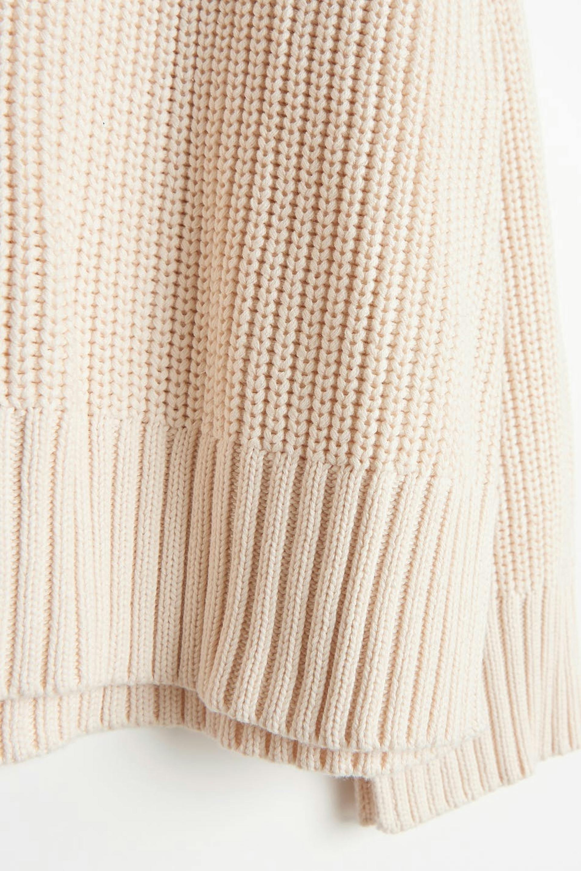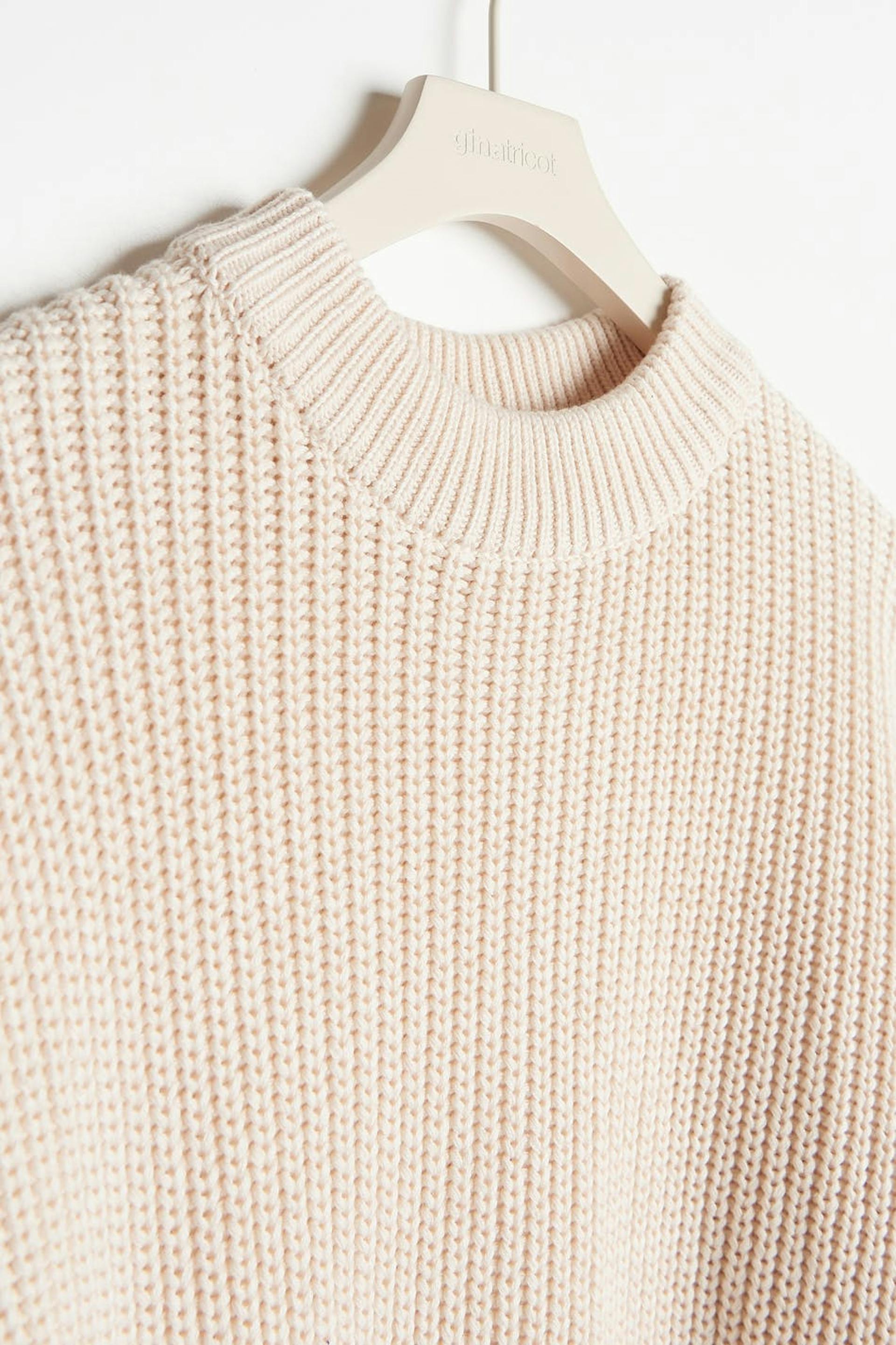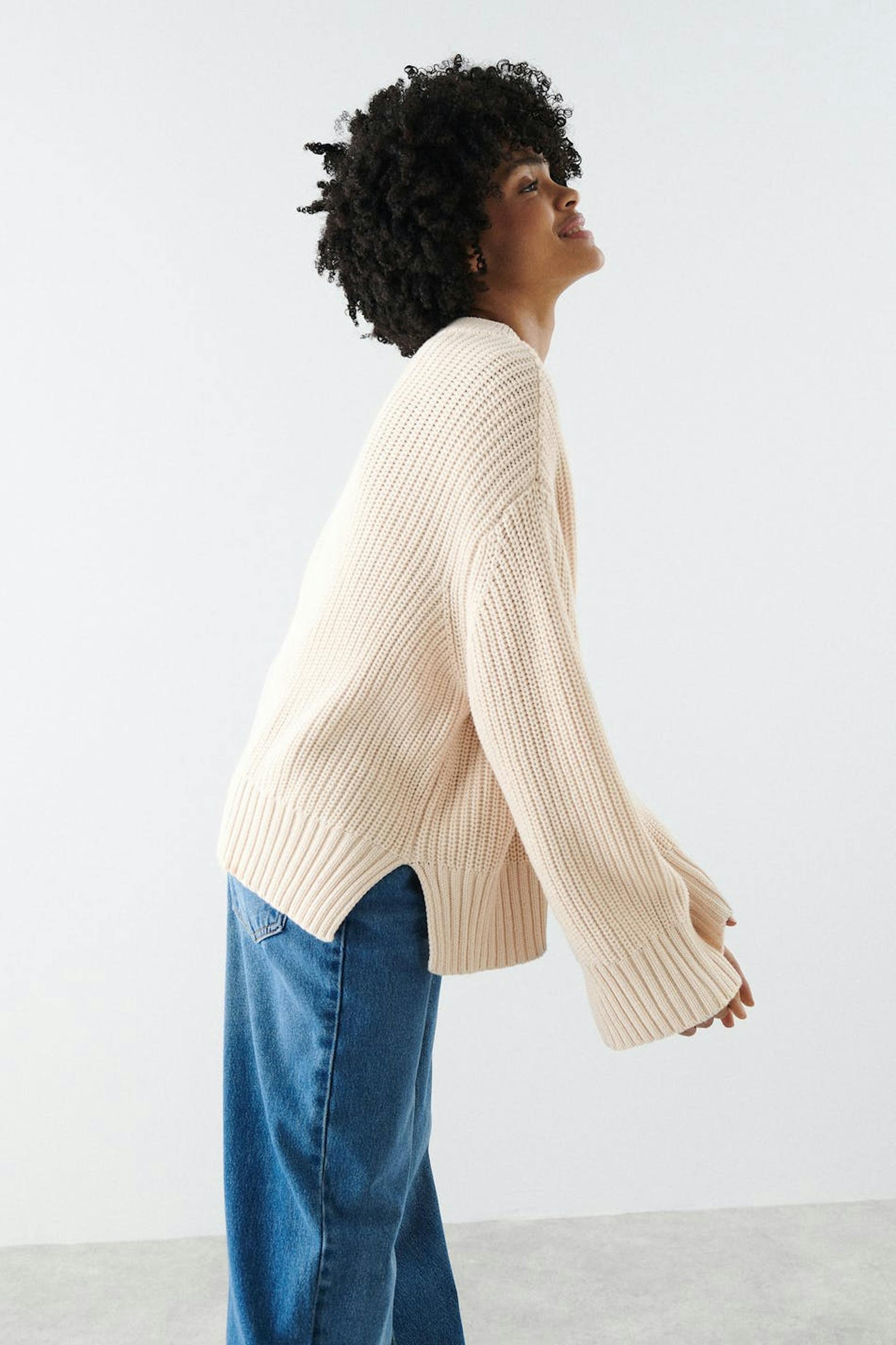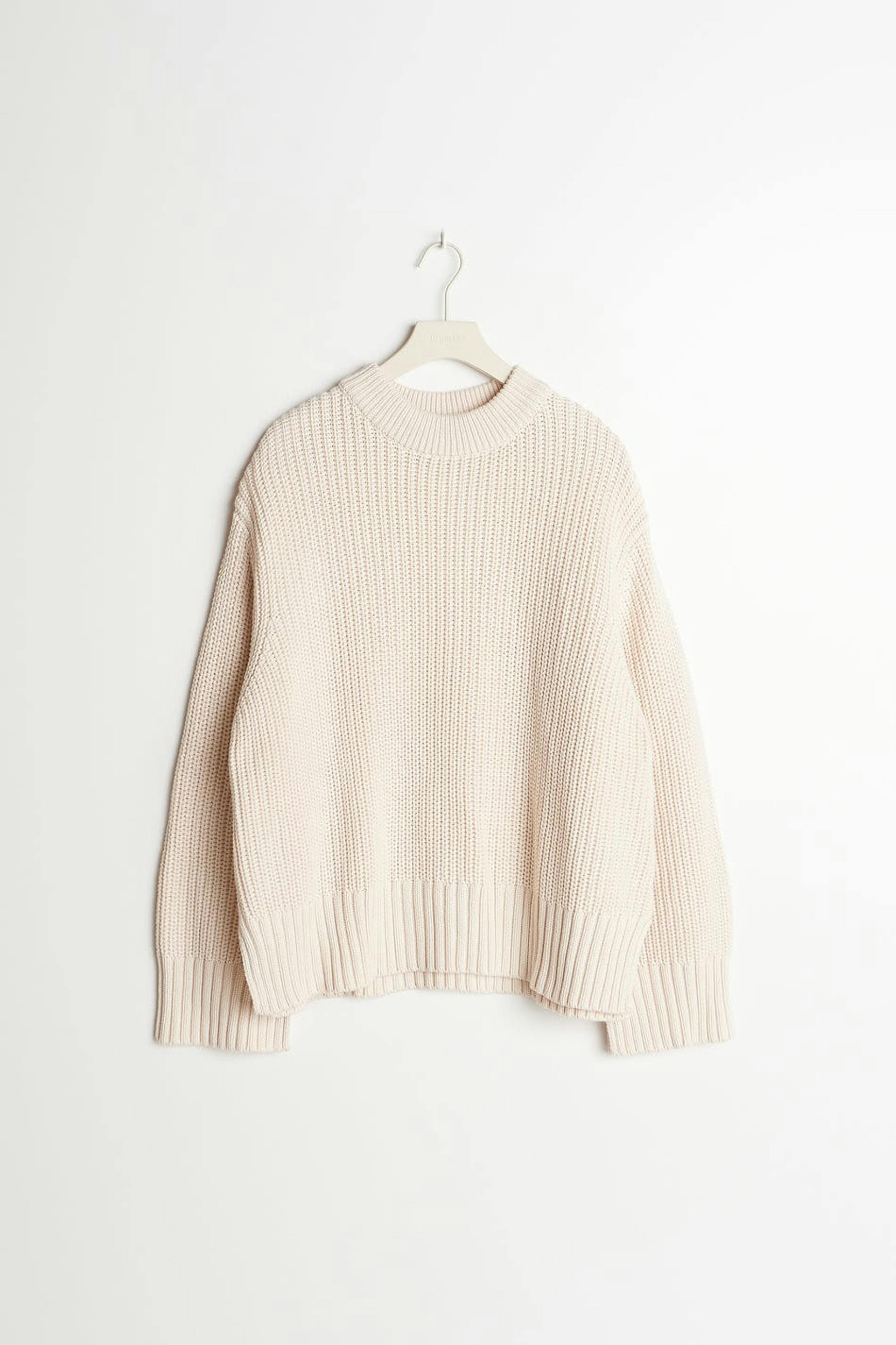 Strikket genser med splitt i sidene. Genseren er hvit og har en høy hals. Den har en ribbestrikket linning og en løs, oversize passform.