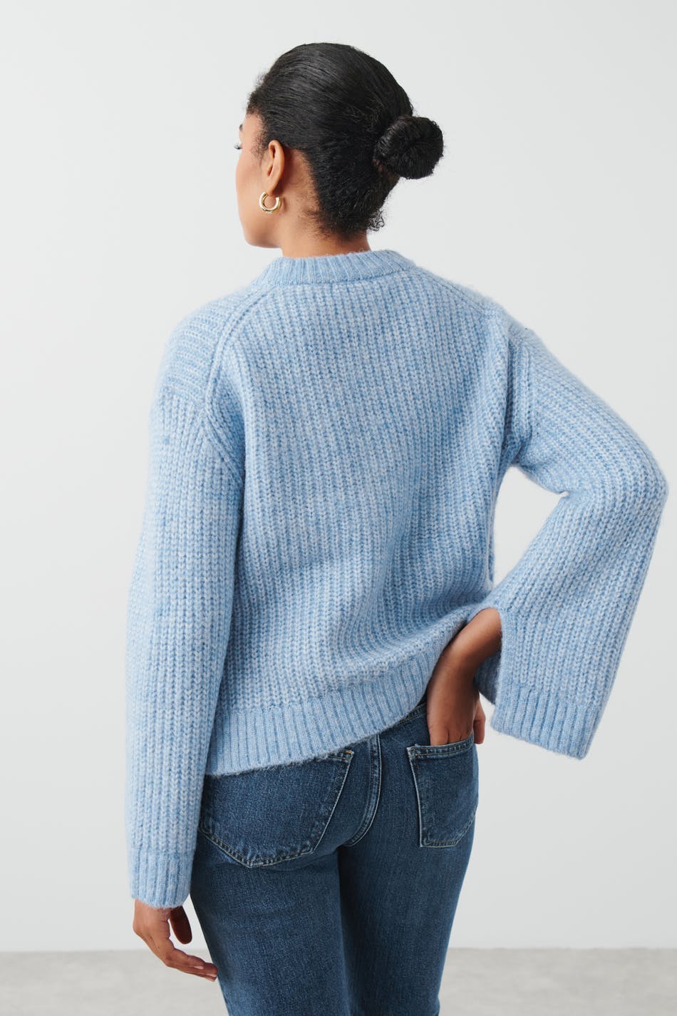 Strikket genser med rund hals. Genseren er blå og har boxy passform. Den har rett arm og ribbestrikk ved ermeslutten og i nedre kant.