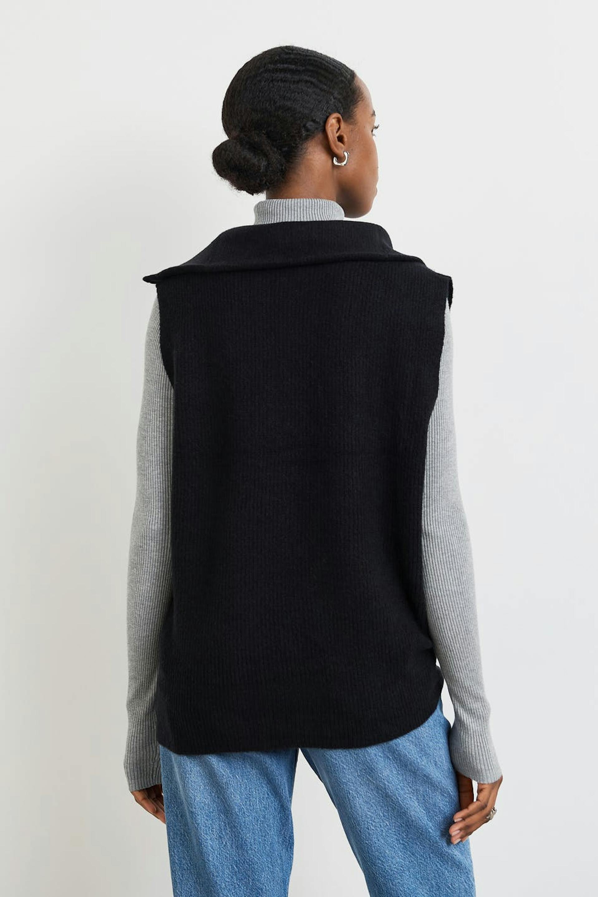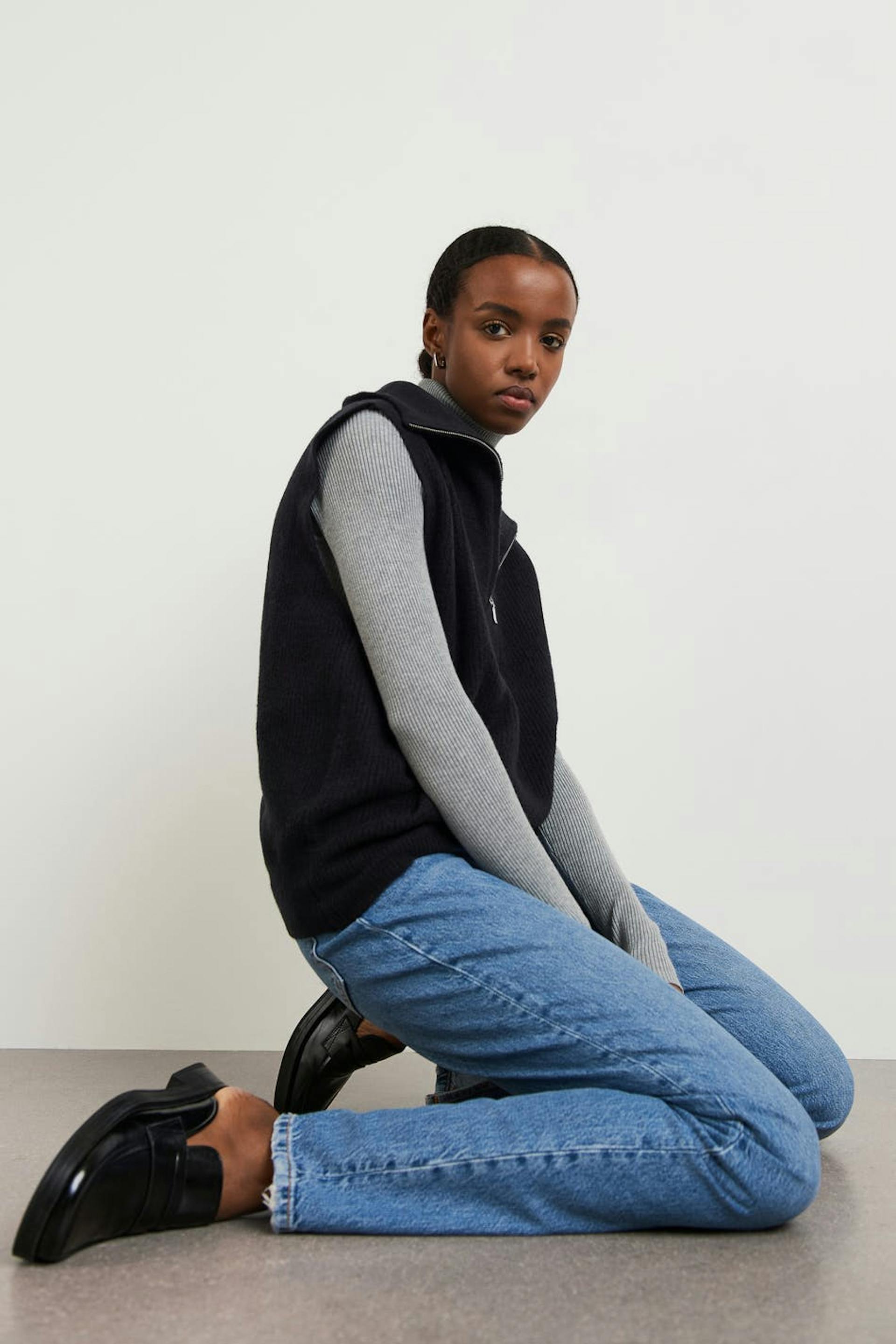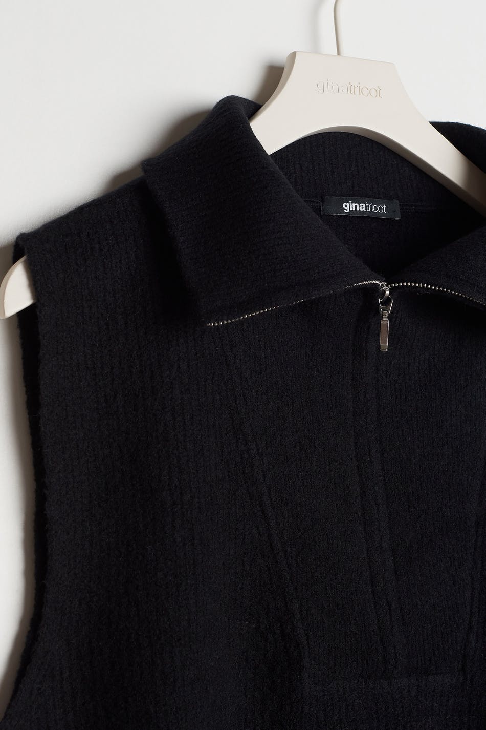 Strikket vest med en normal passform. Vesten er svart og ermløs og har en høy krage. Den har en halv glidelås på toppen.