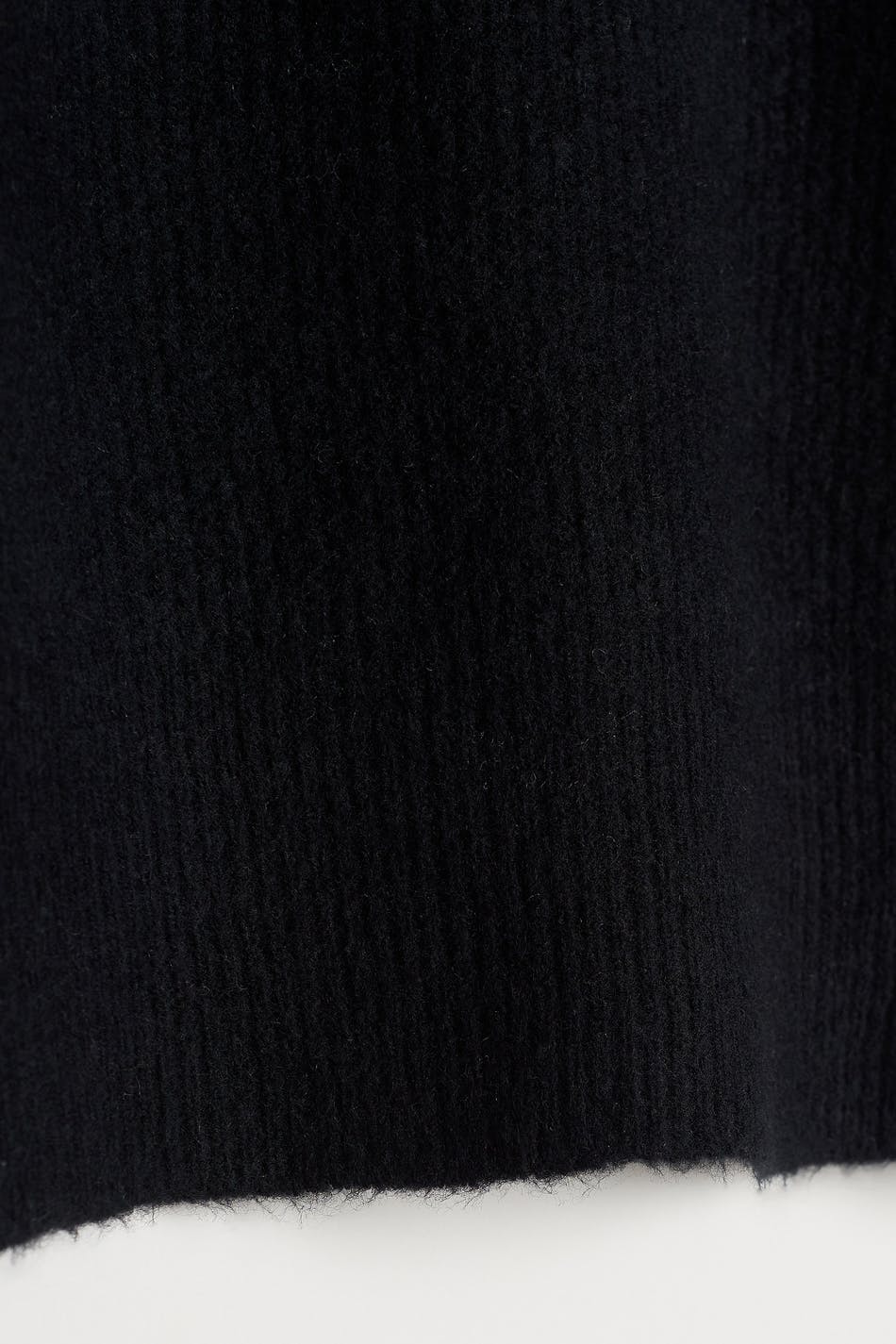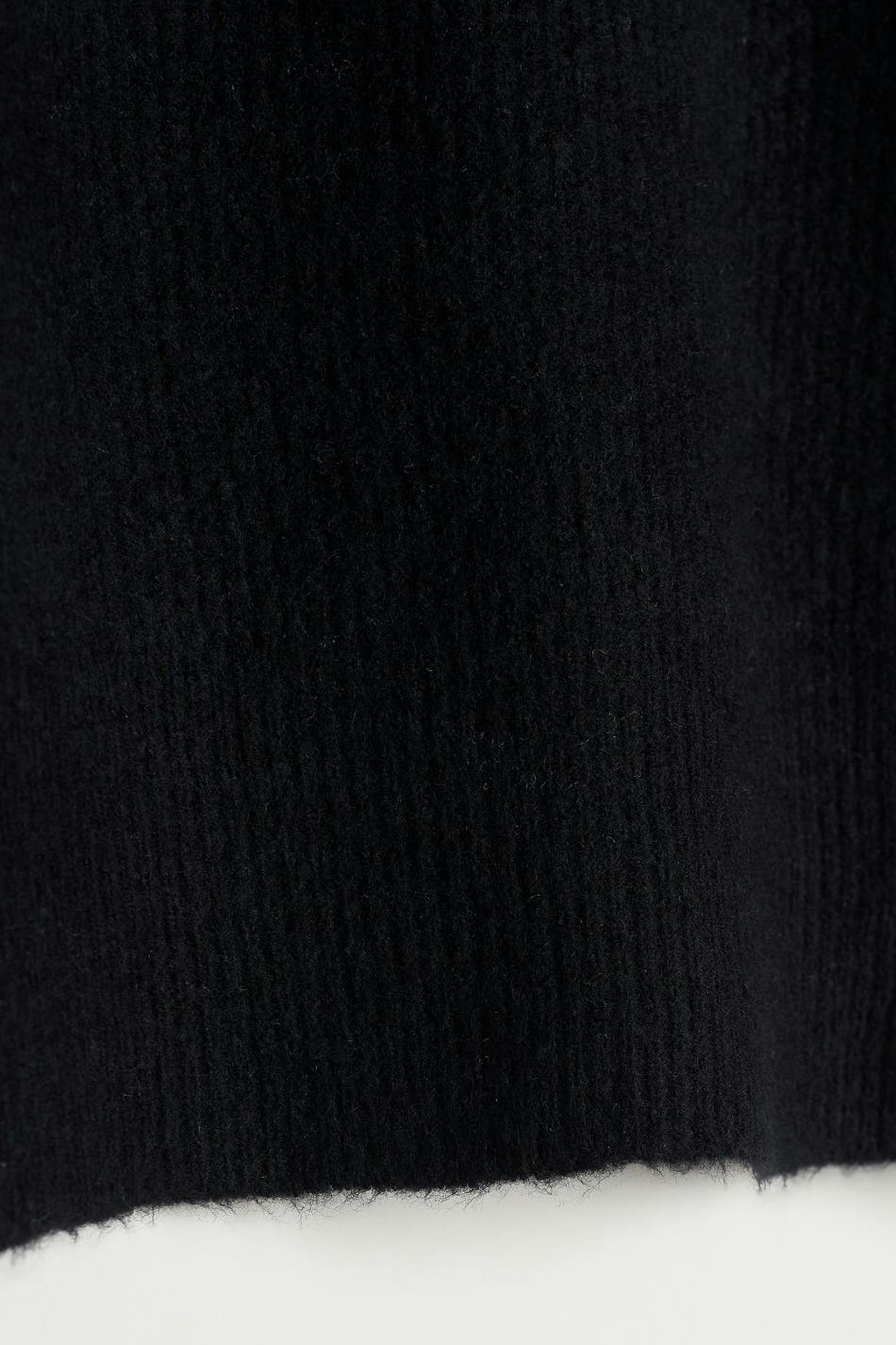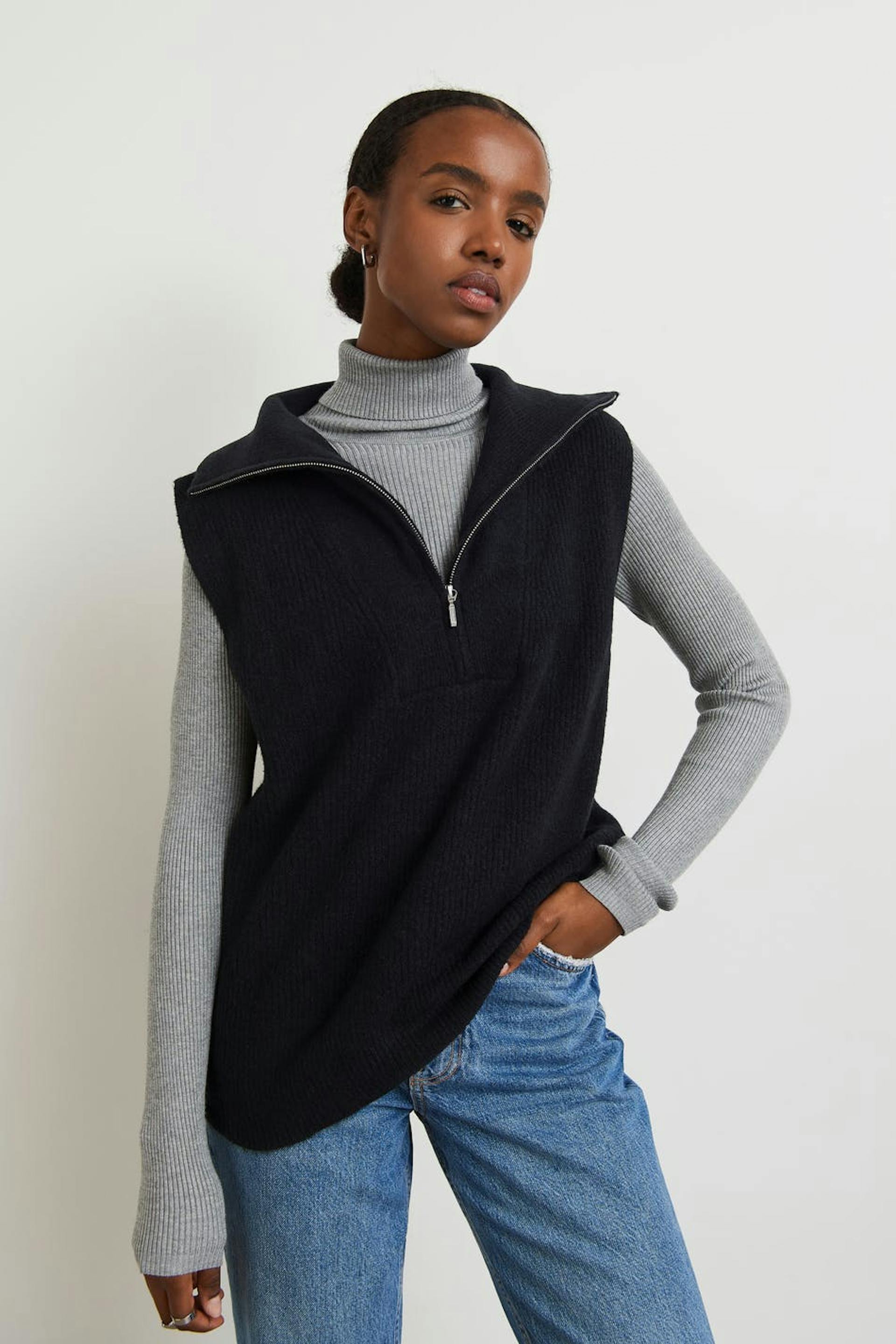 Strikket vest med en normal passform. Vesten er svart og ermløs og har en høy krage. Den har en halv glidelås på toppen.