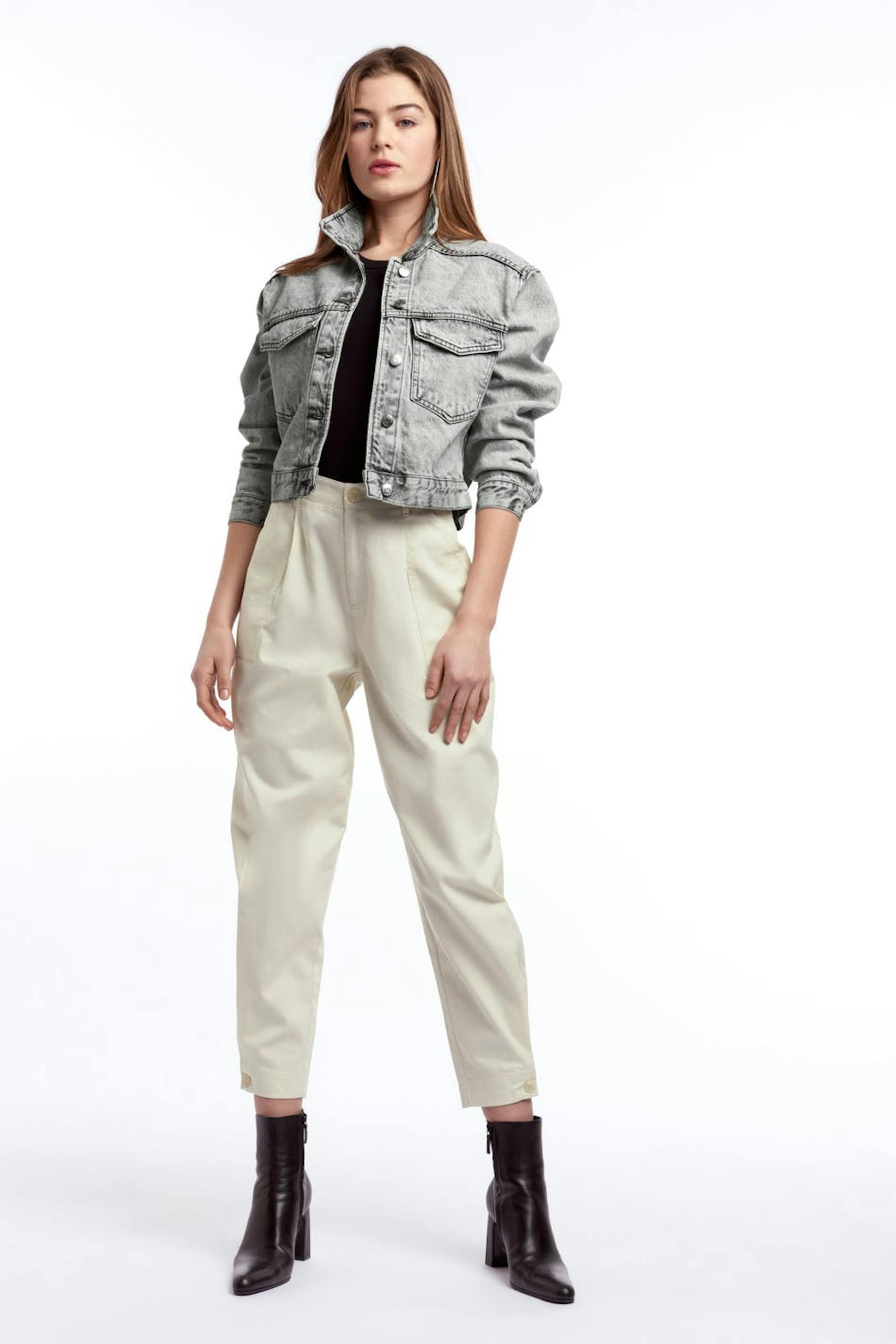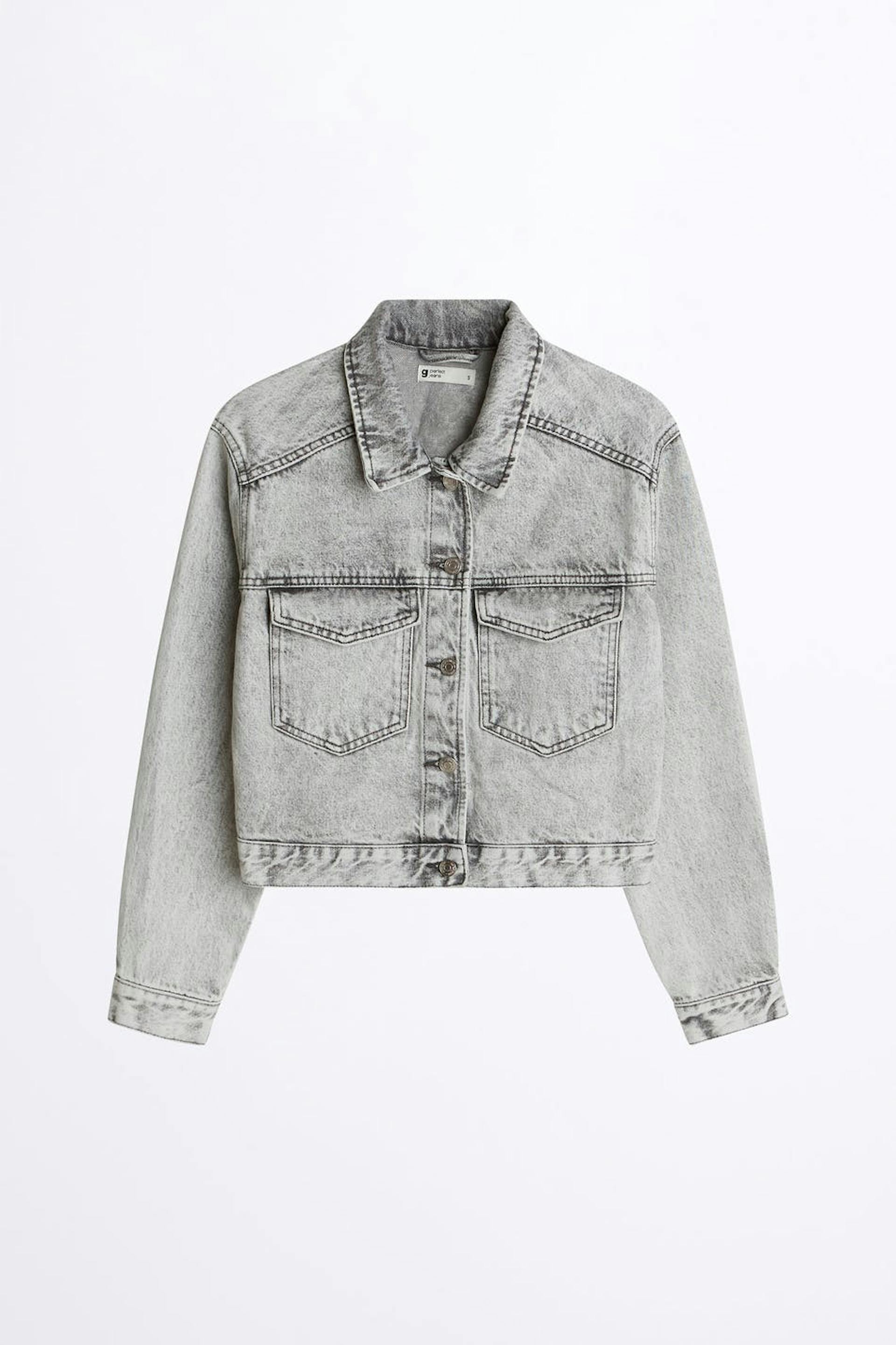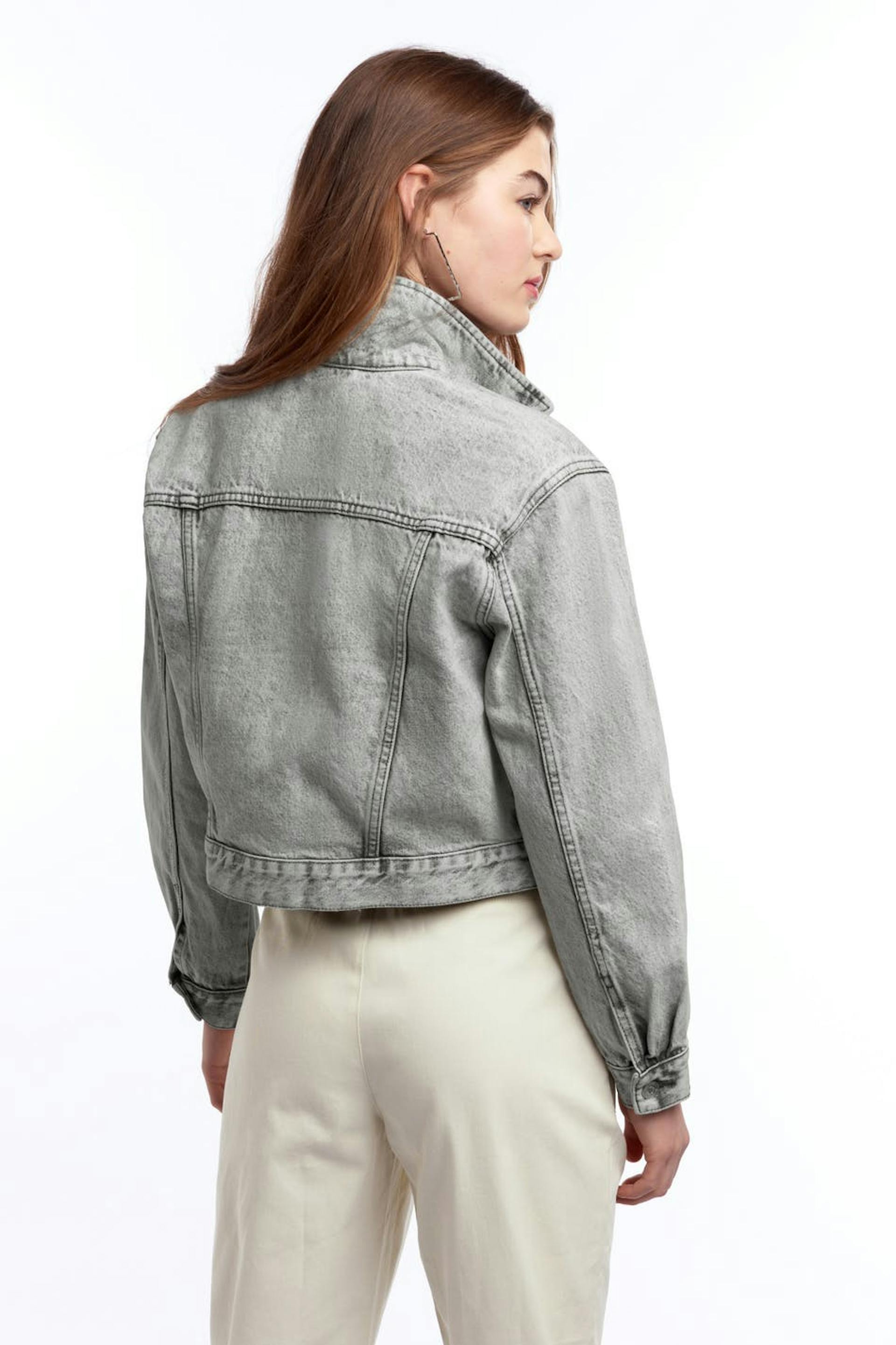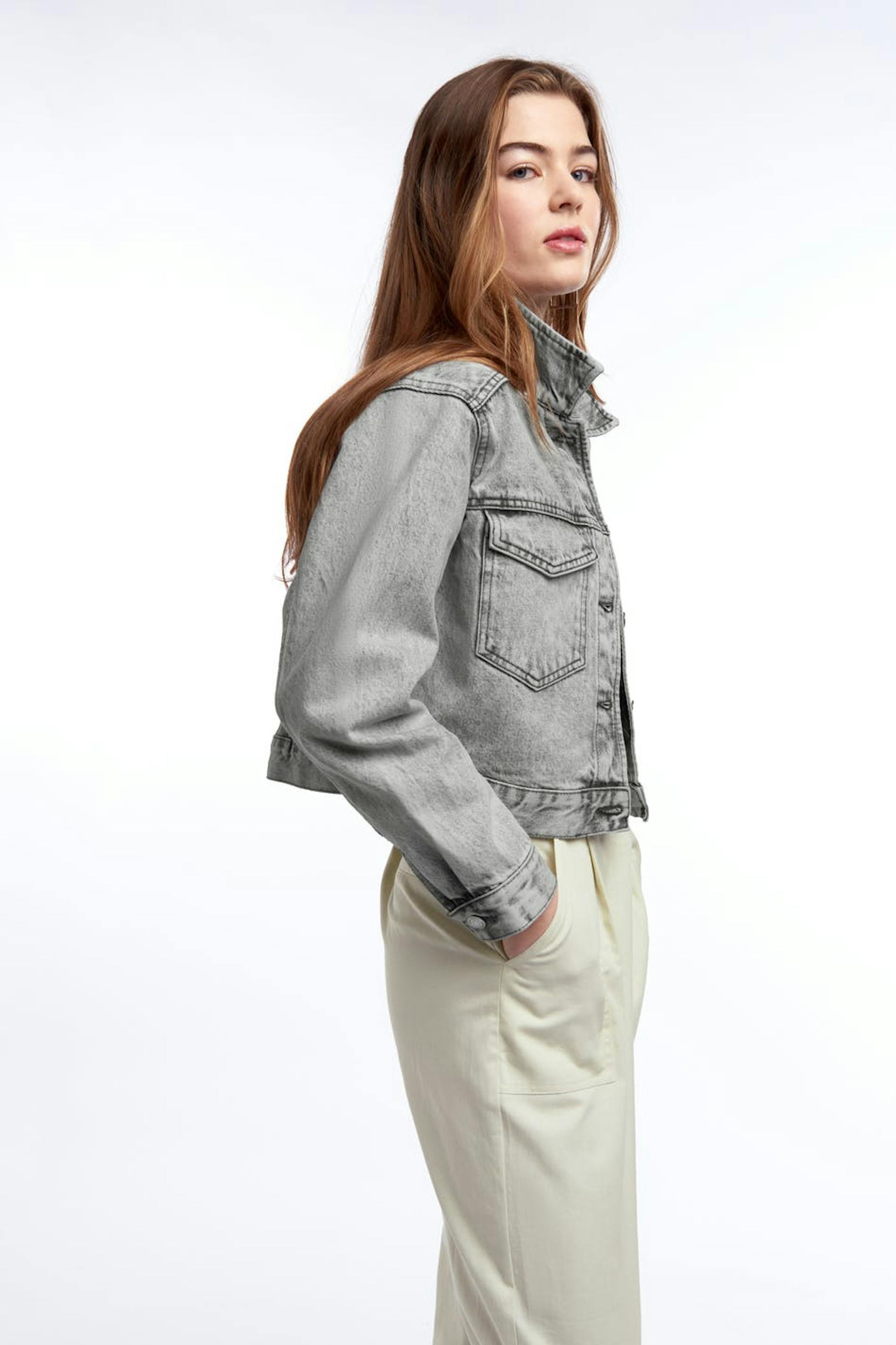 Avkortet denim jakke med en oversized passform. Jakken er grå og har brystlommer. Den er laget av denim og har en krage og en knappstolpe foran.