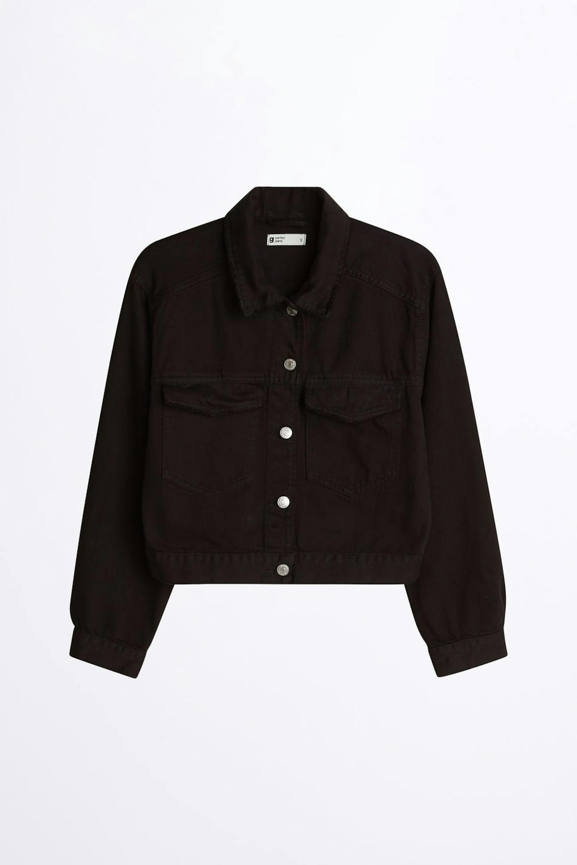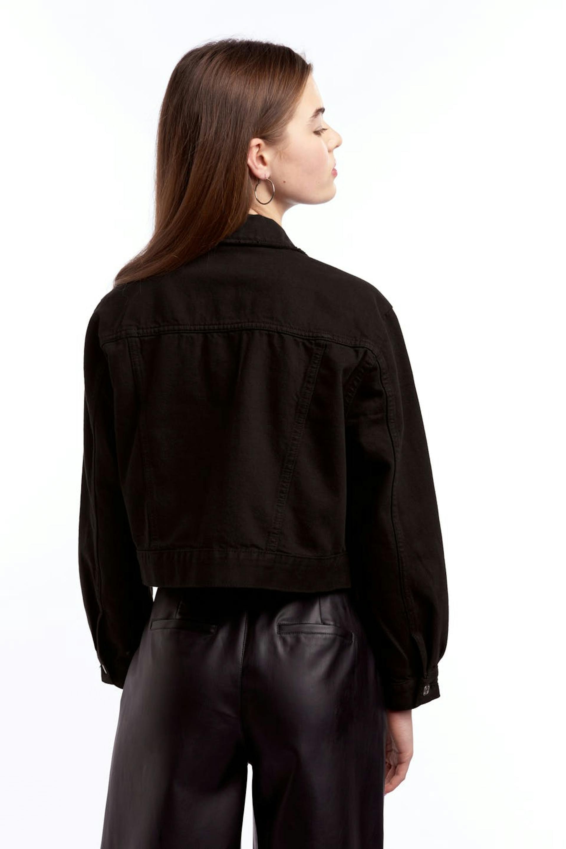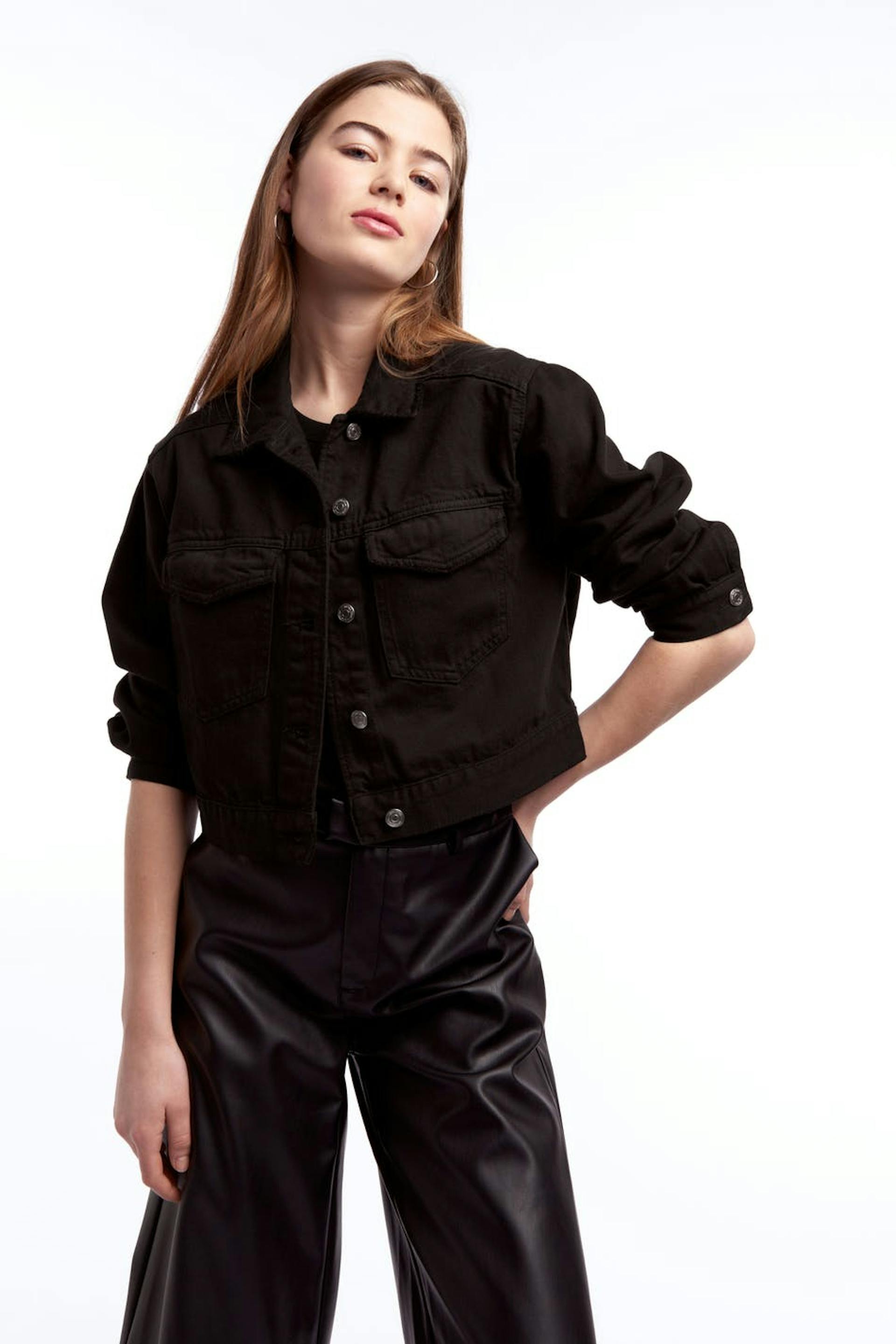 Kort trucker jakken med en oversized-passform. Jakken er svart. Den er laget av denim.