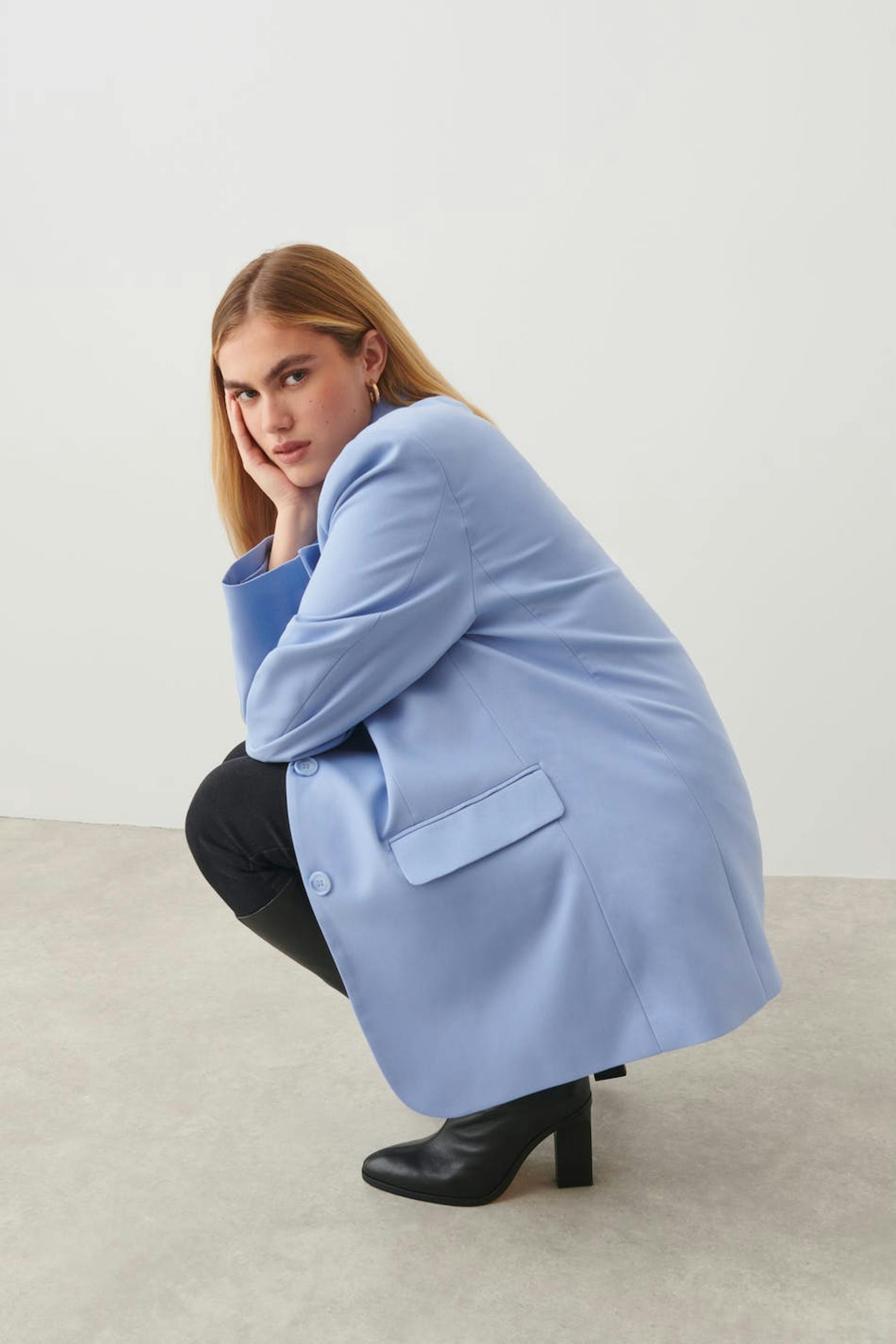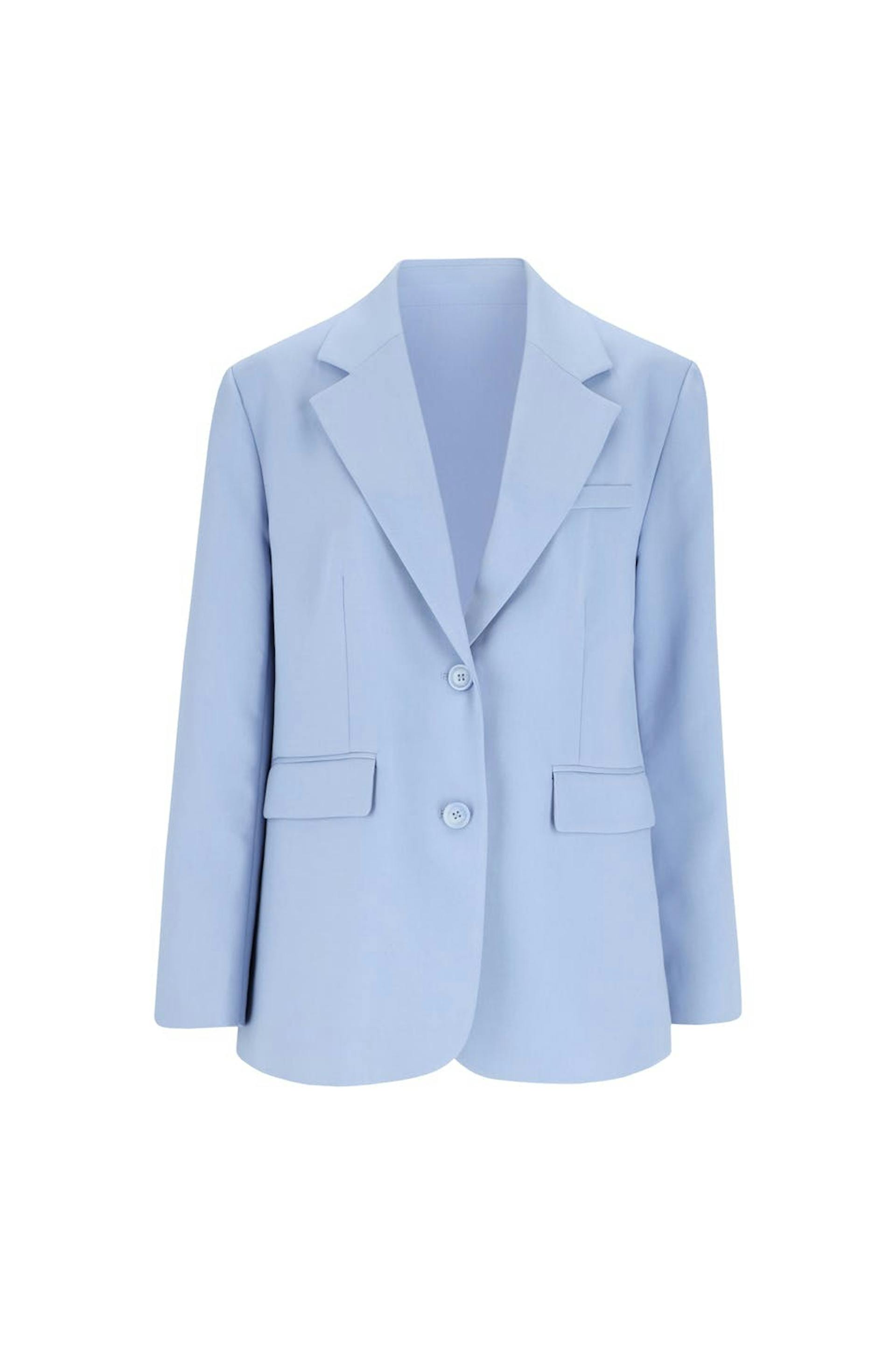 Oversized blazer med knappstolpe foran. Blazeren er blå, vevet og enkelkneppet. Den har krage med jakkeslag med snitt, brystlomme på venstre side og passpolerte lommer med klaffer foran.