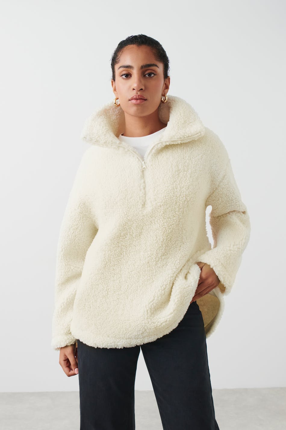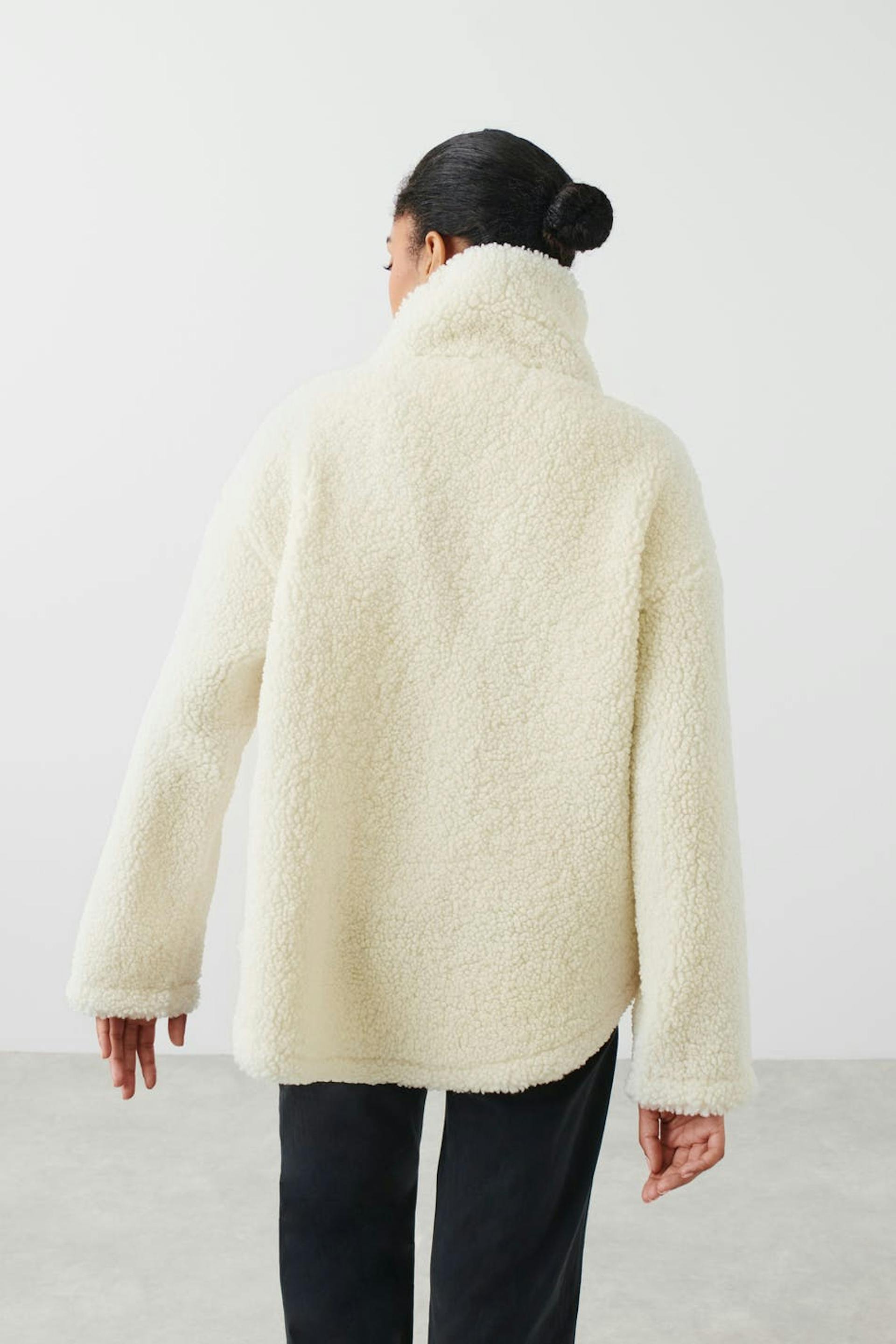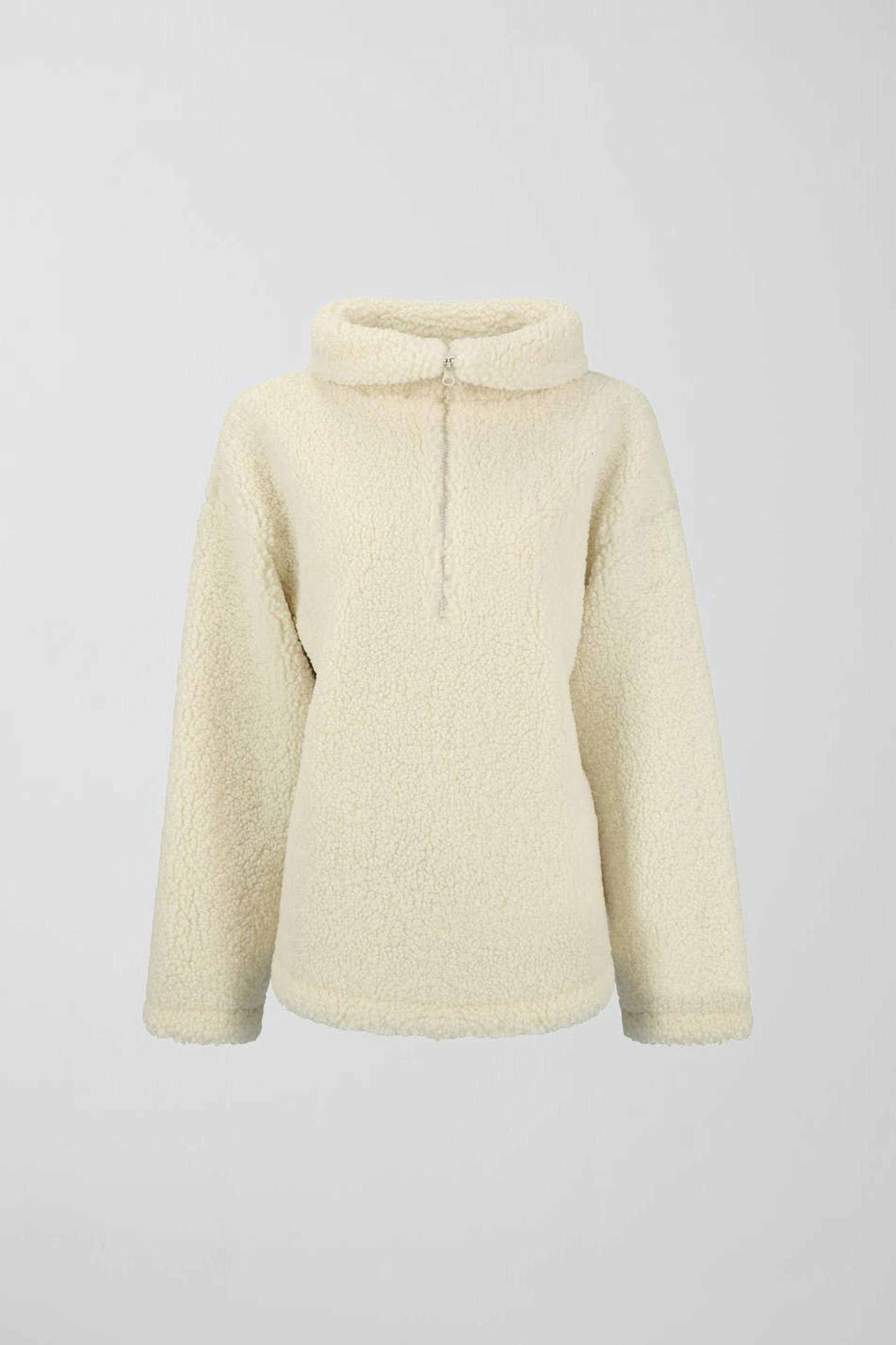 Pilejakke med en oversized passform. Jakken er hvit og har høy krage med glidelås. Den har langt erme og myk kvalitet.