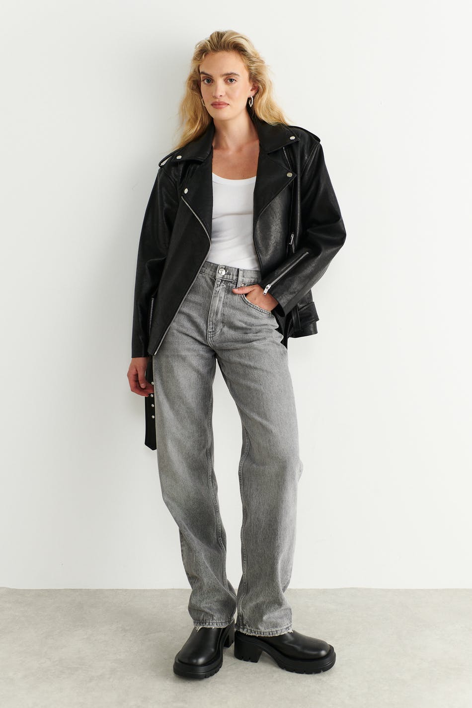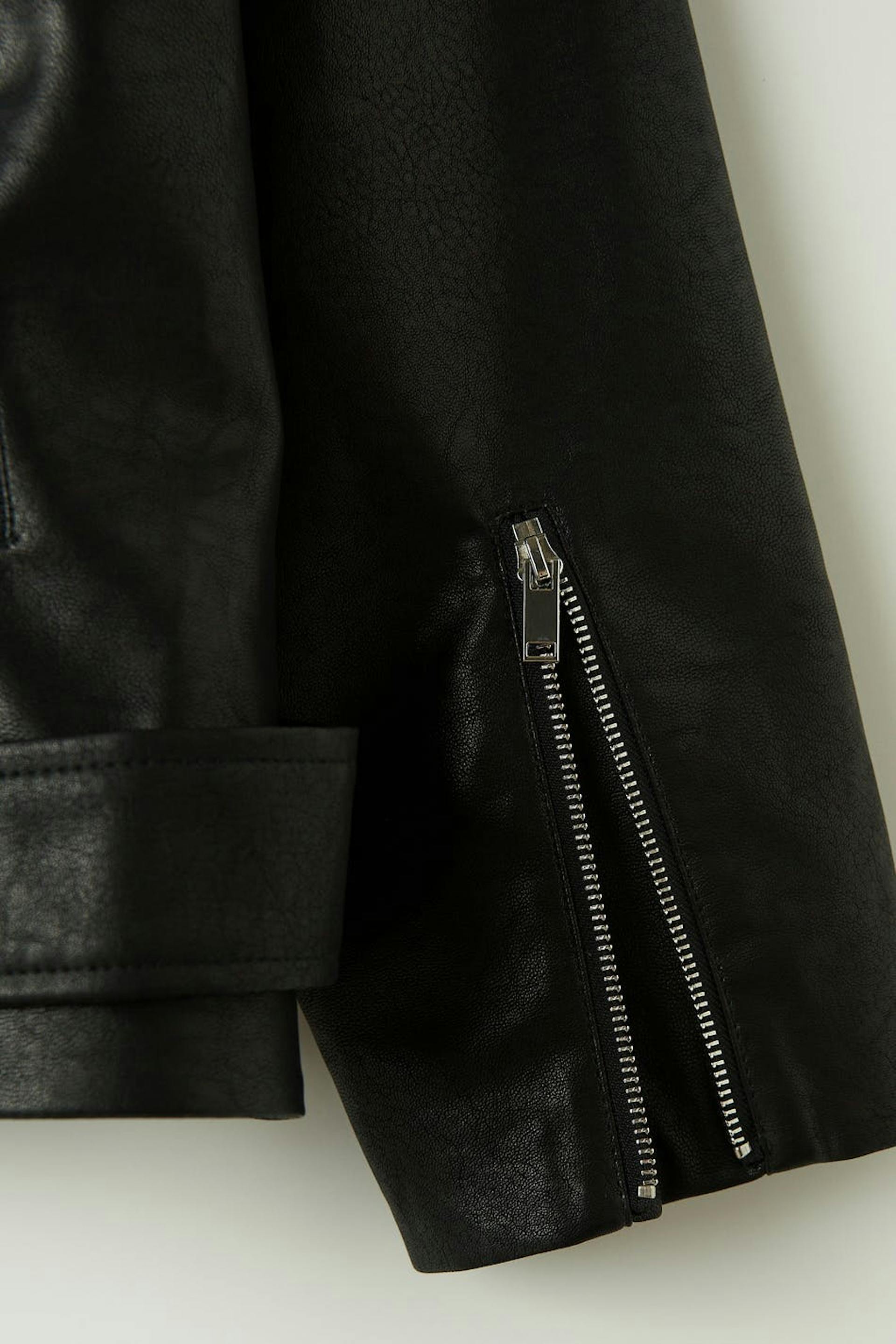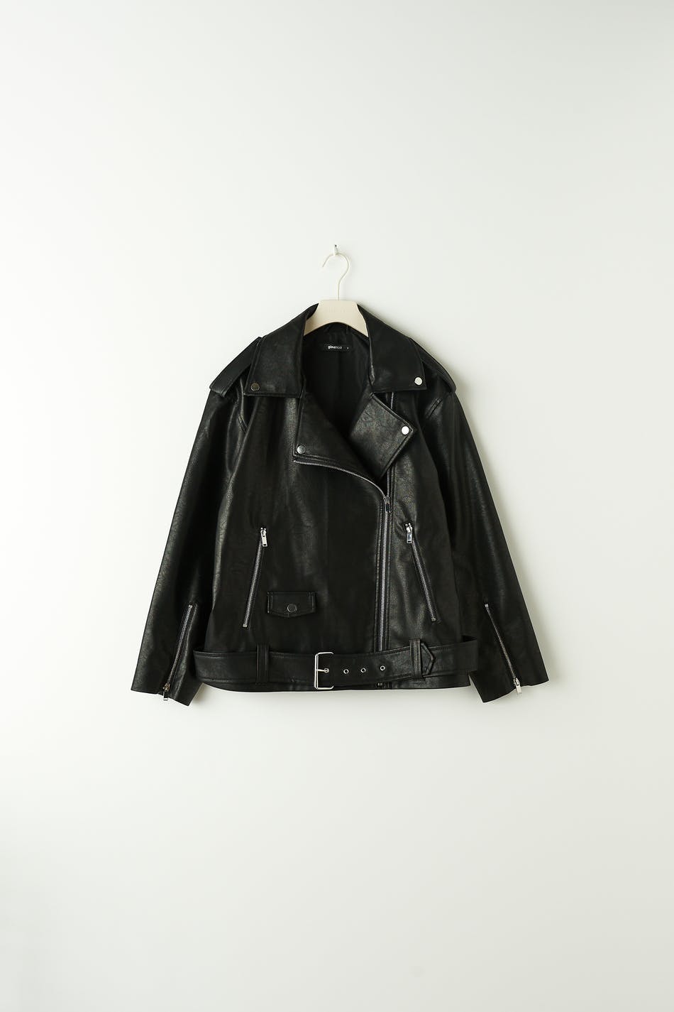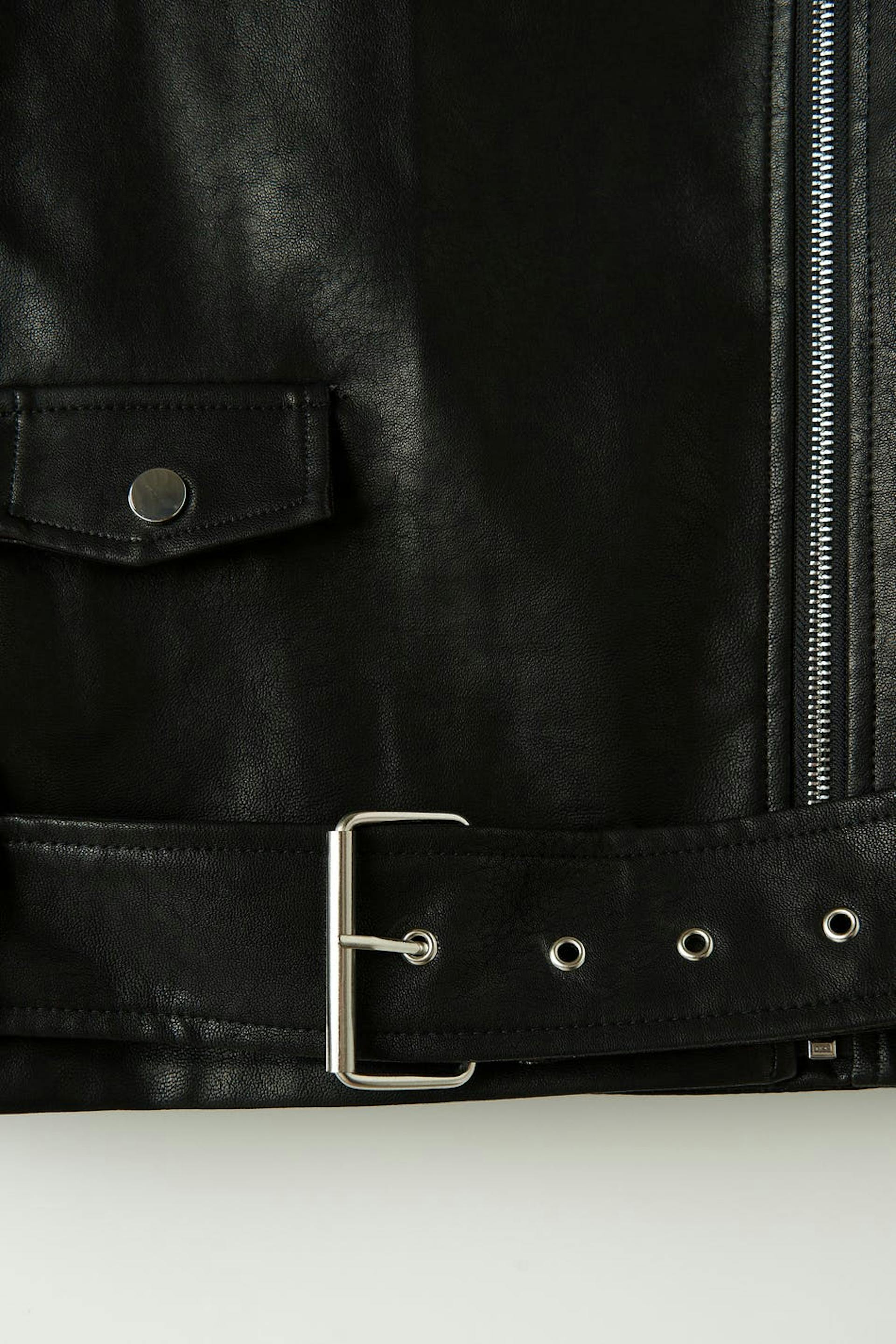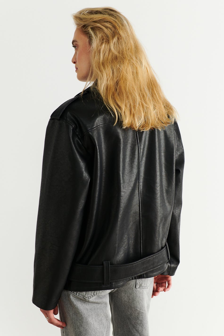 Oversized biker jakke i skinnimitasjon med glidelås foran. Jakken er svart og har sidelommer med glidelås. Den har krage, jakkeslag med dekorative knapper, glidelås på enden av ermene og belte med metallspenne på bunnen.