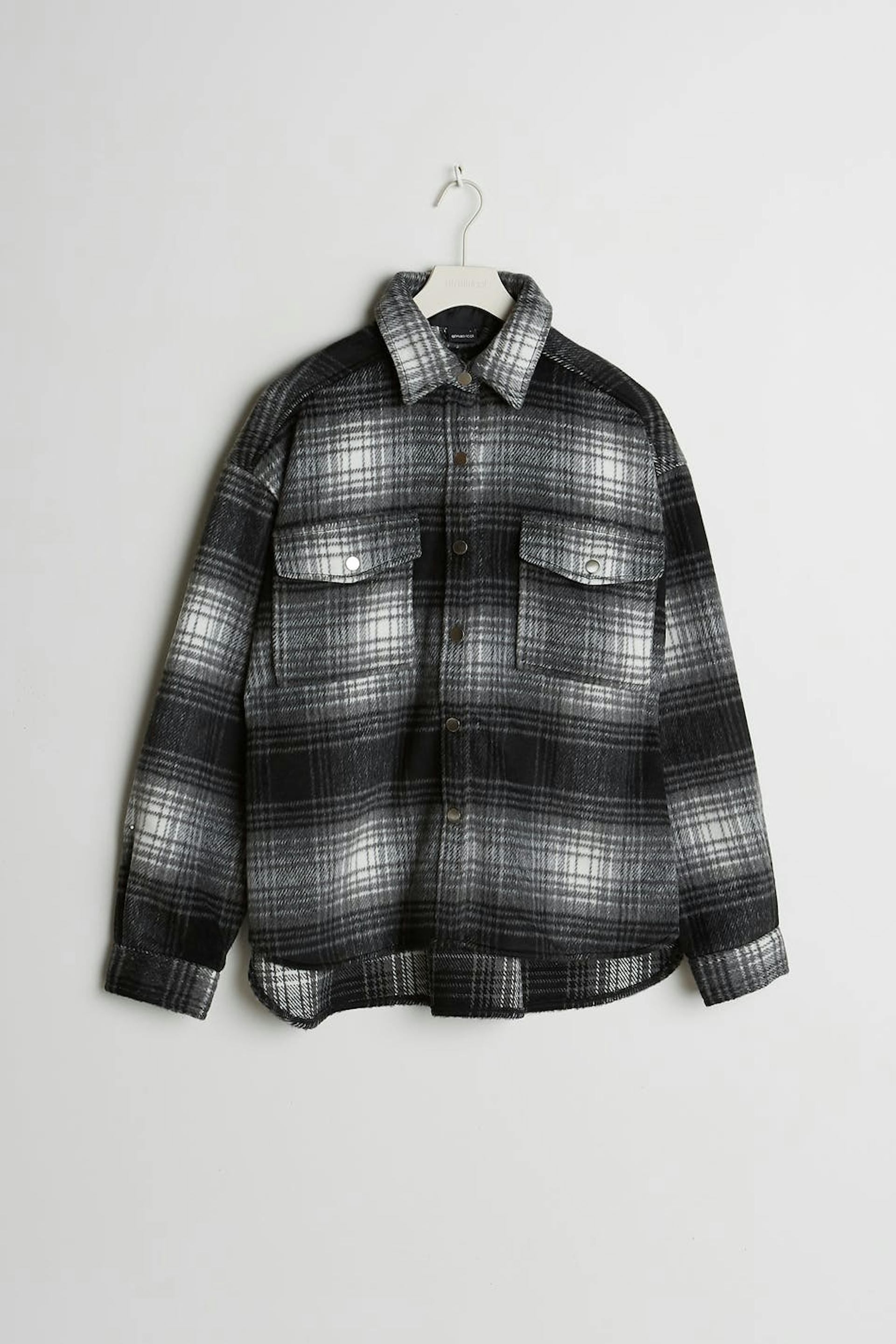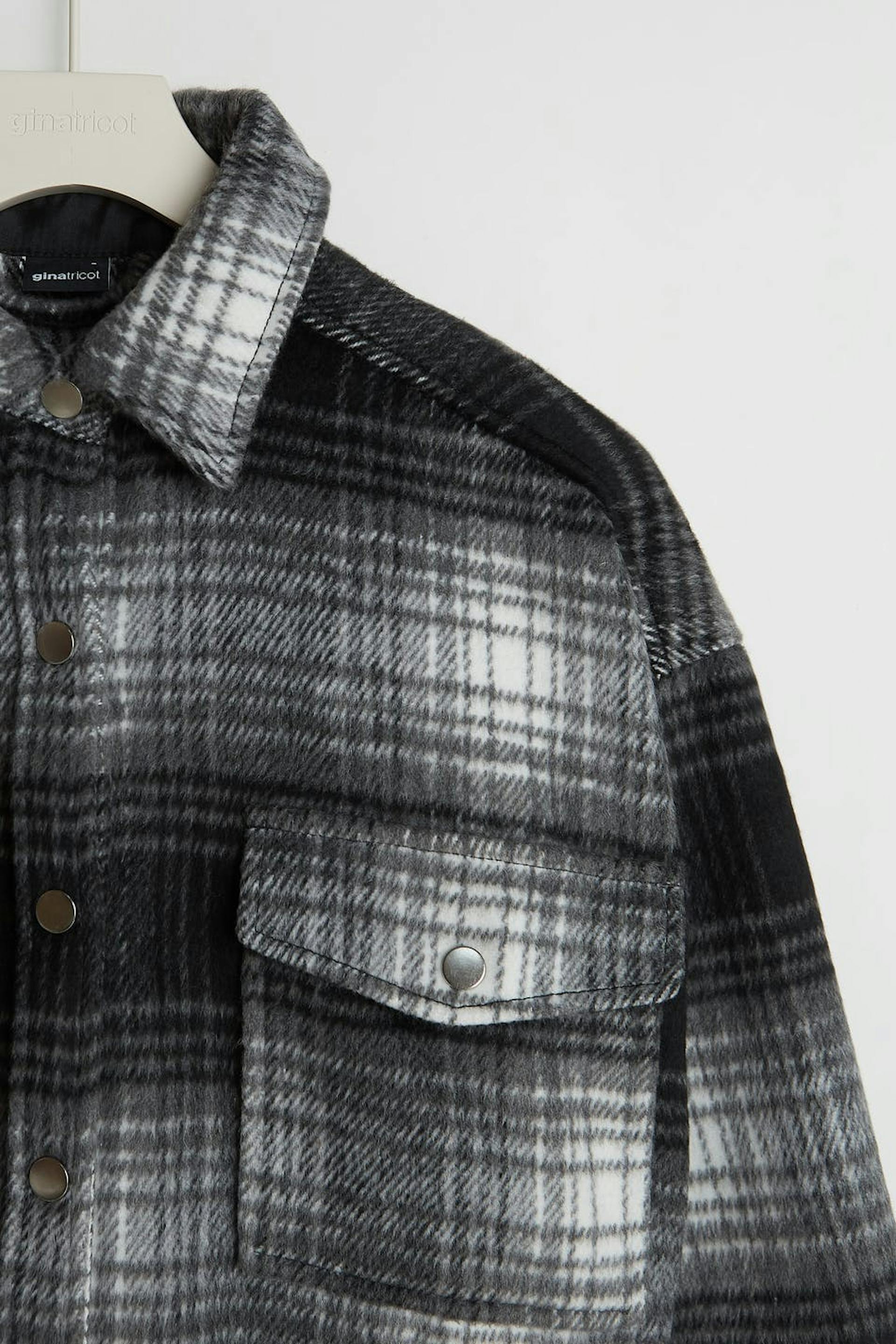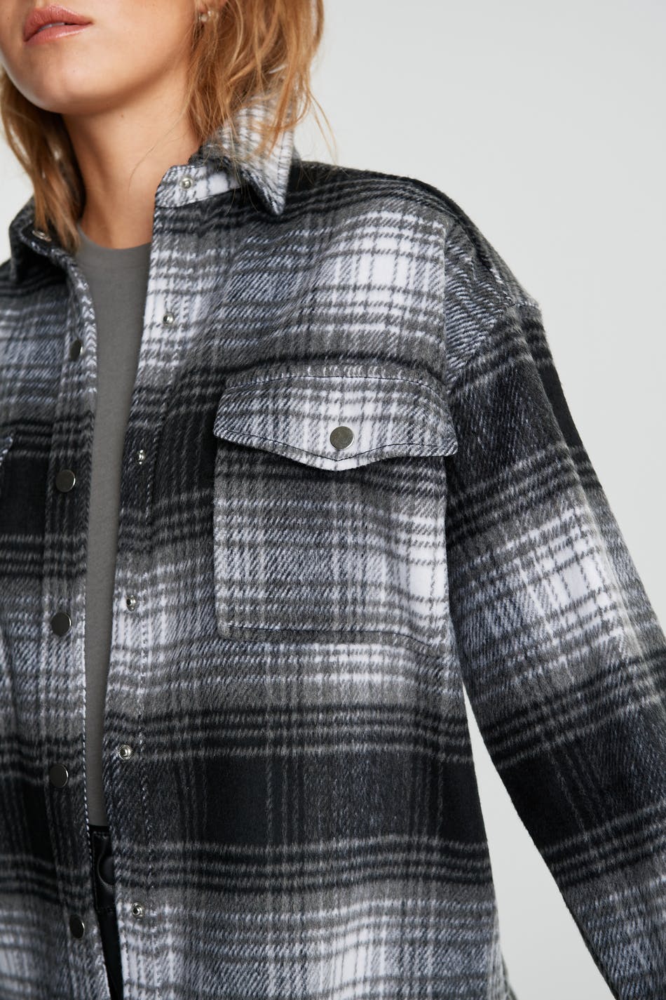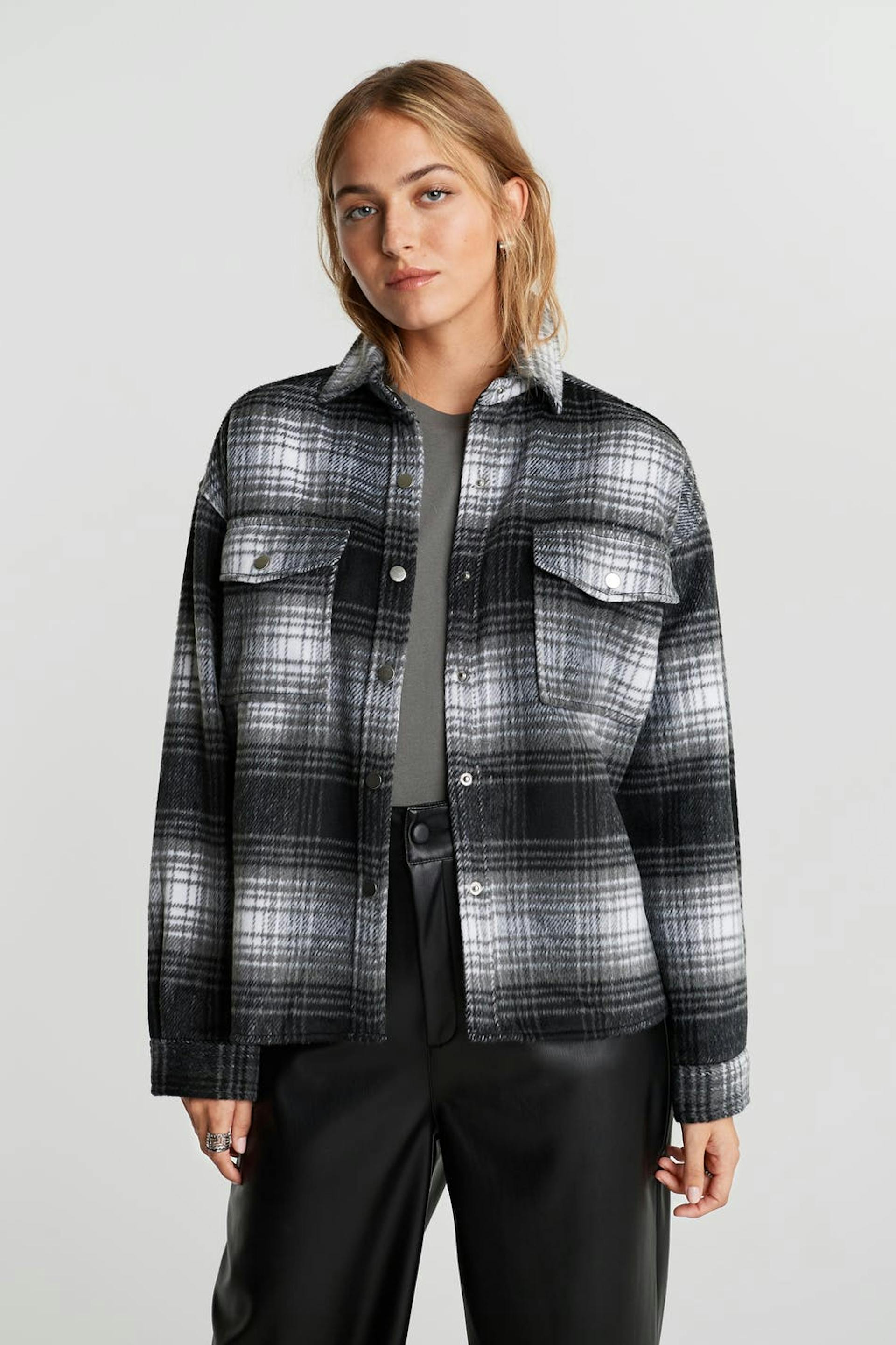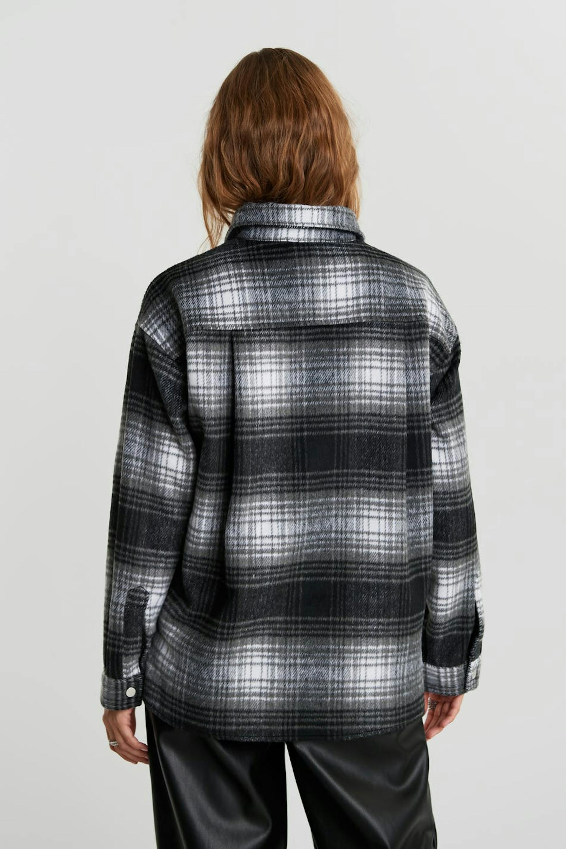 Rutete skjortejakke med en oversized-passform. Shacketen er svart og hvit og har brystlommer. Den har knapper foran, en krage og et børstet materiale.