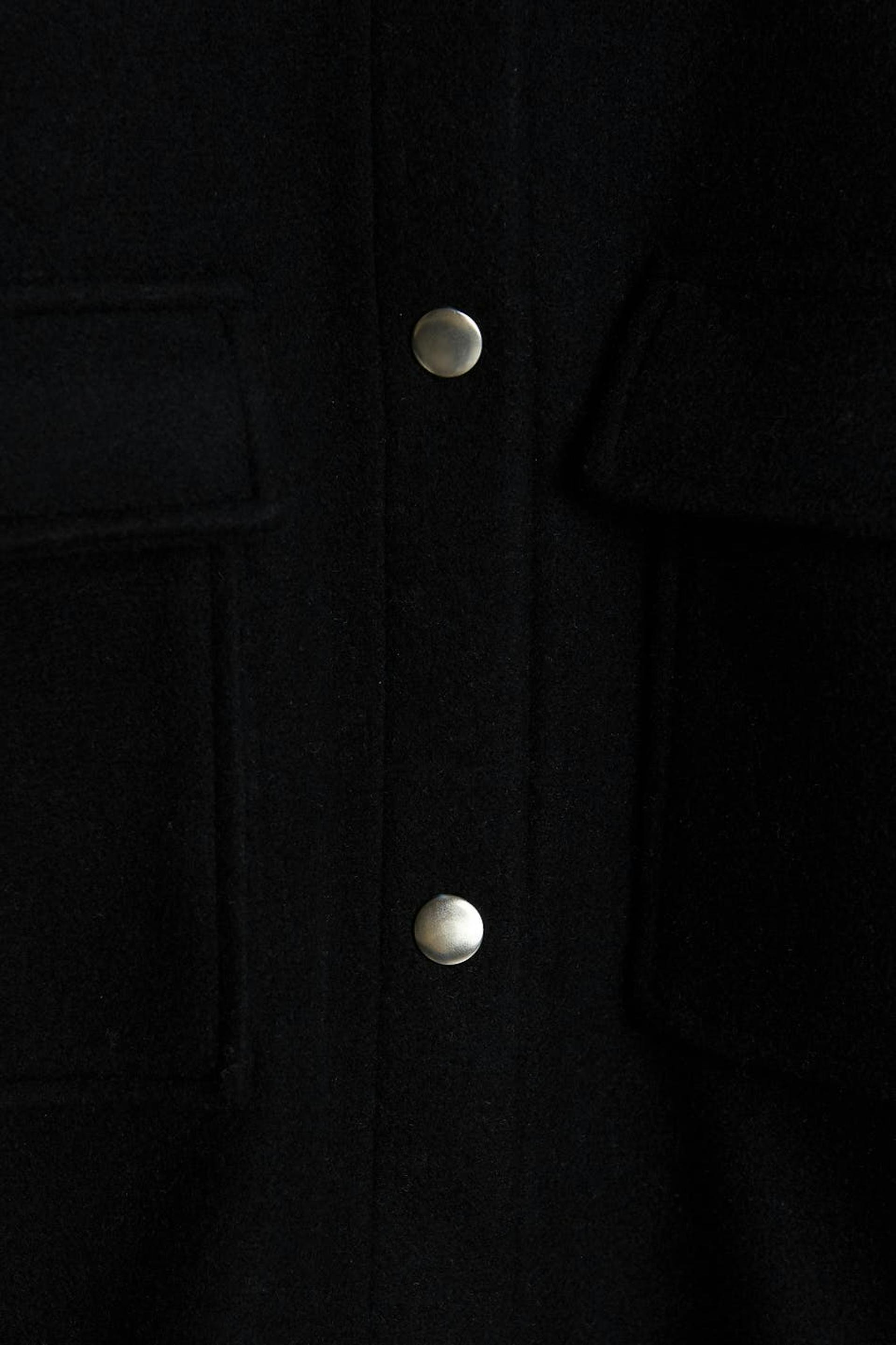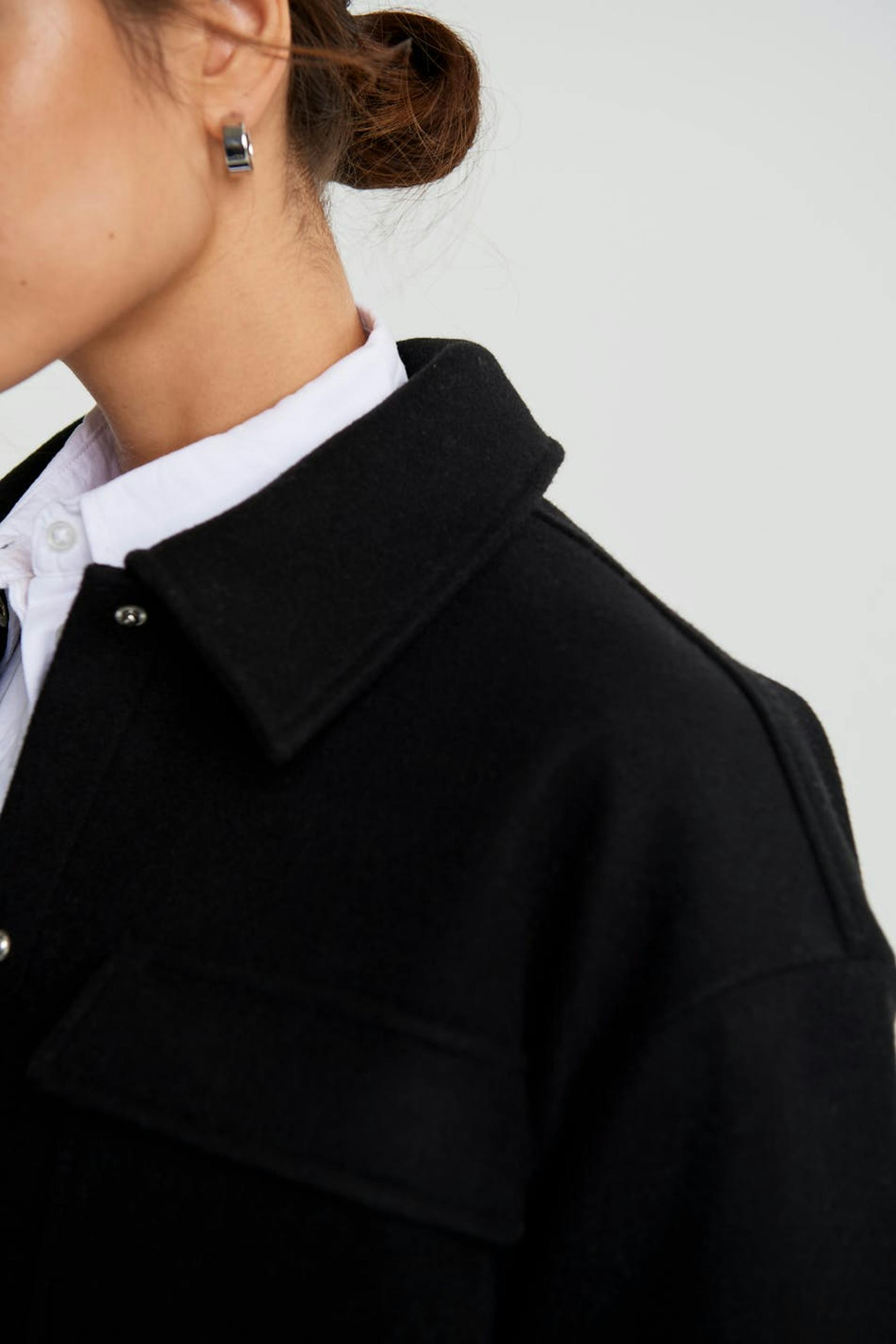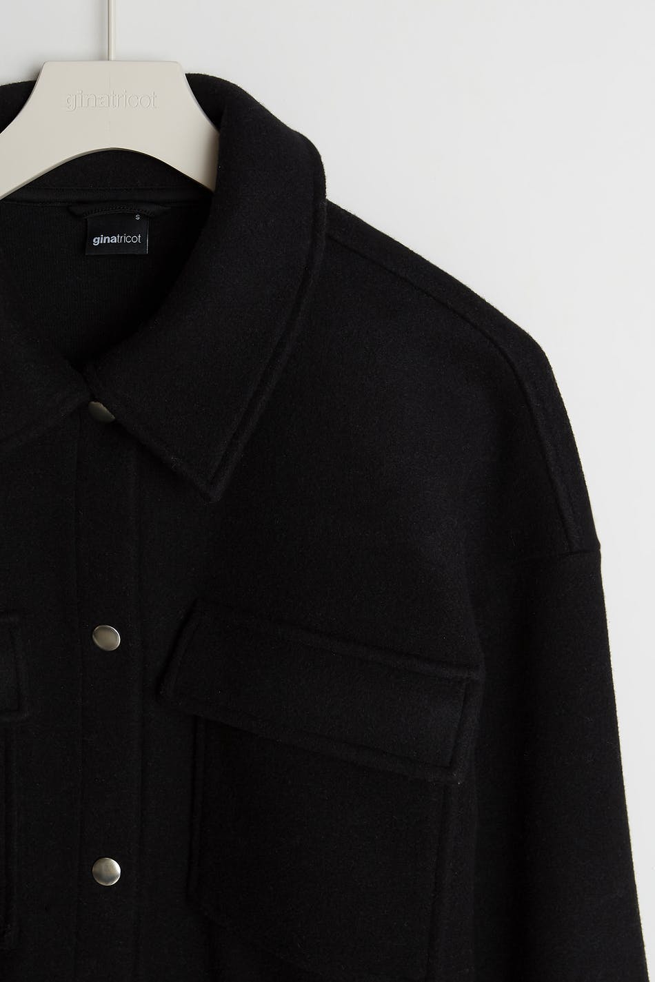 Jakke med trykknapper foran. Jakken er svart og har brystlommer. Den er laget av filt.