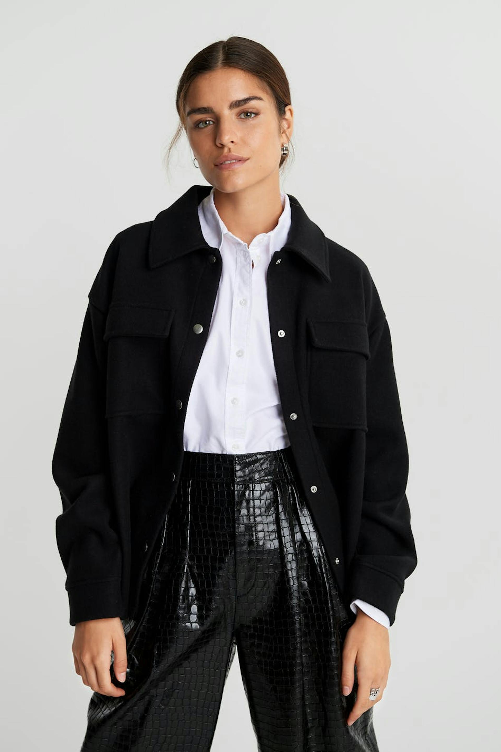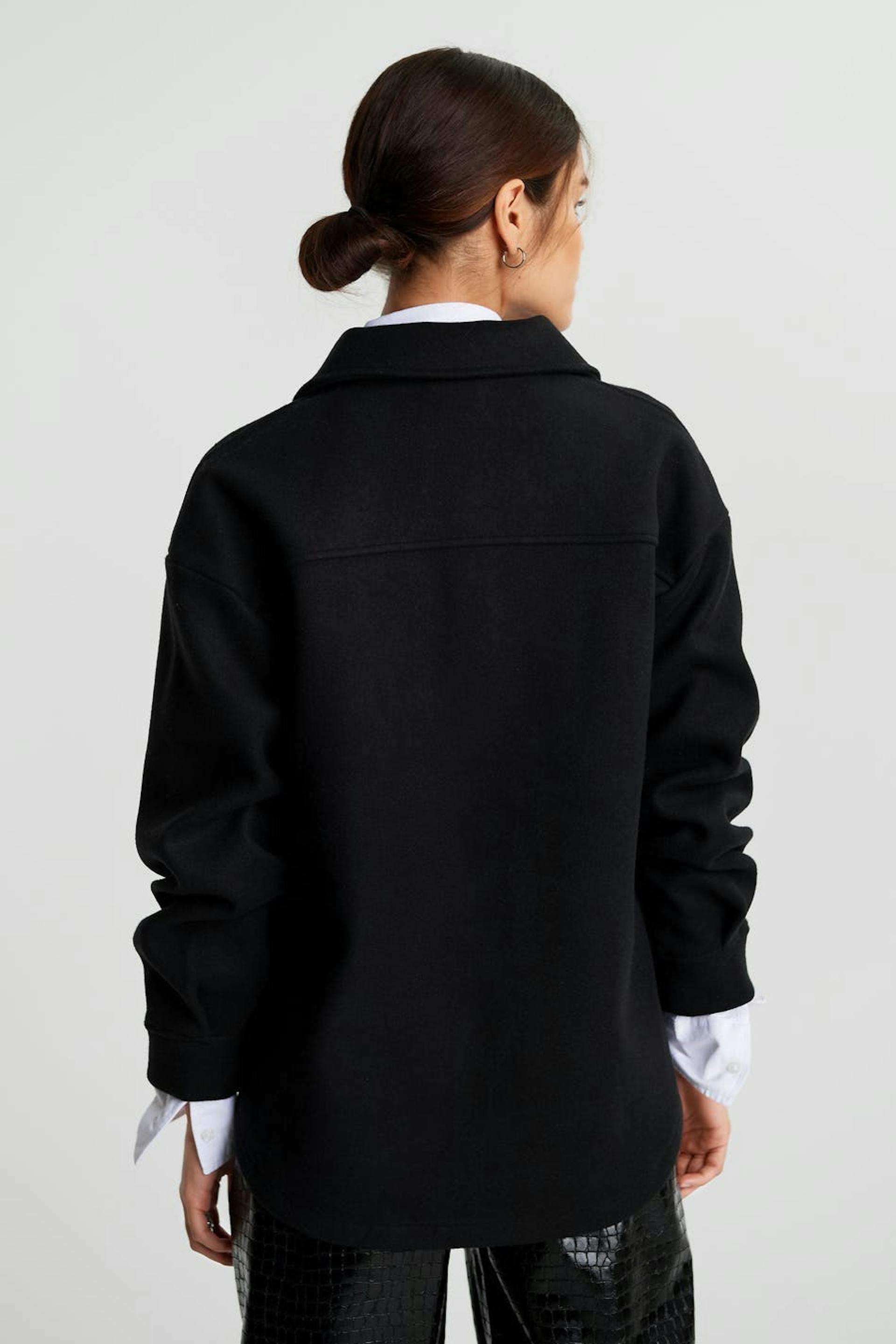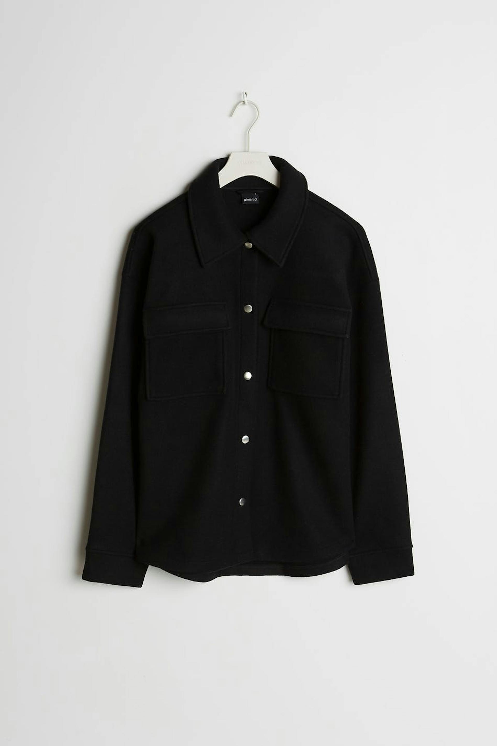 Jakke med trykknapper foran. Jakken er svart og har brystlommer. Den er laget av filt.