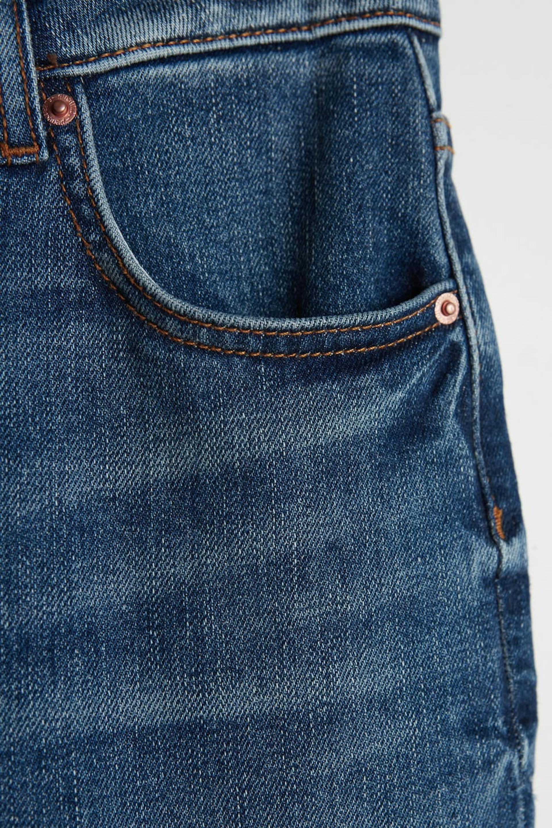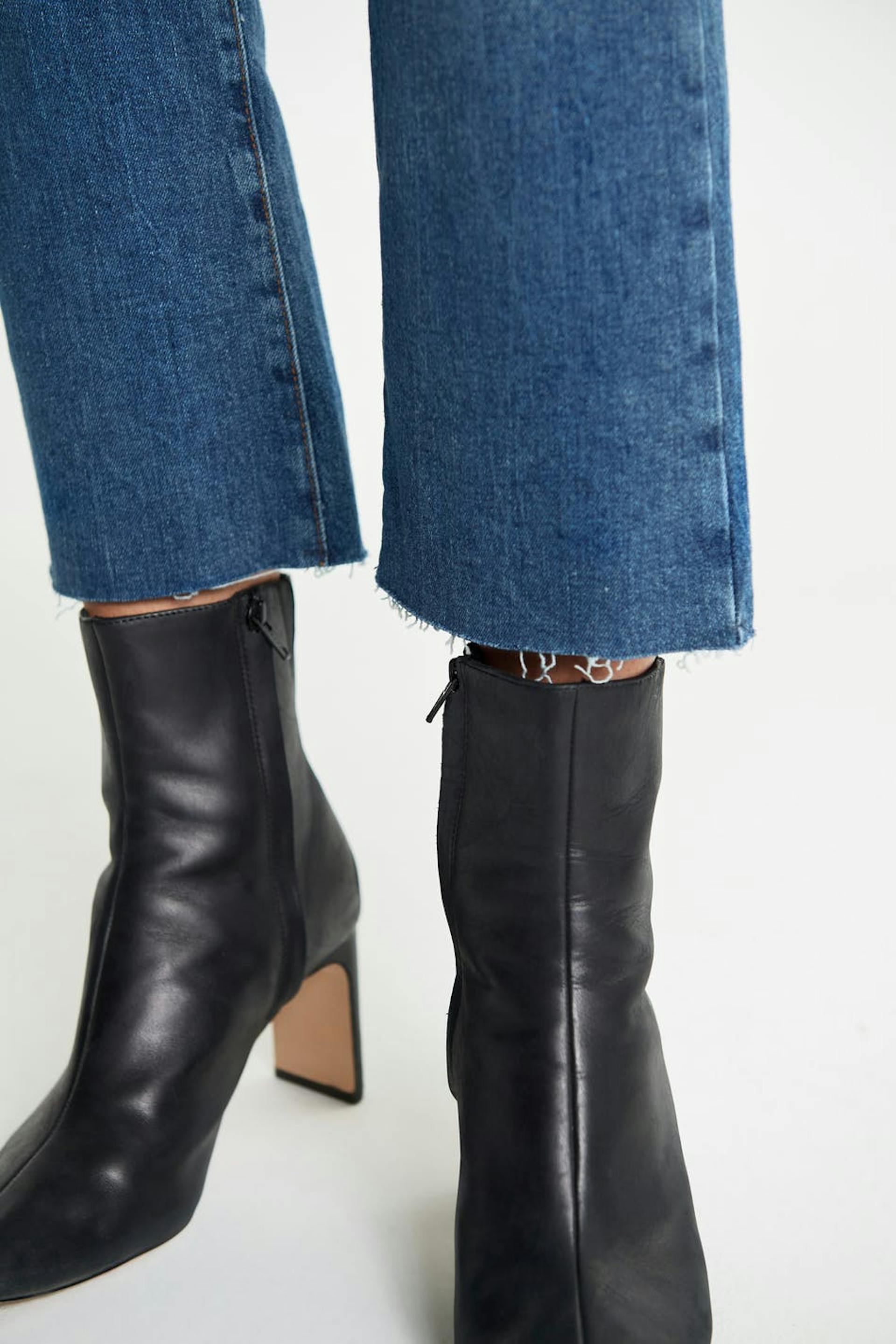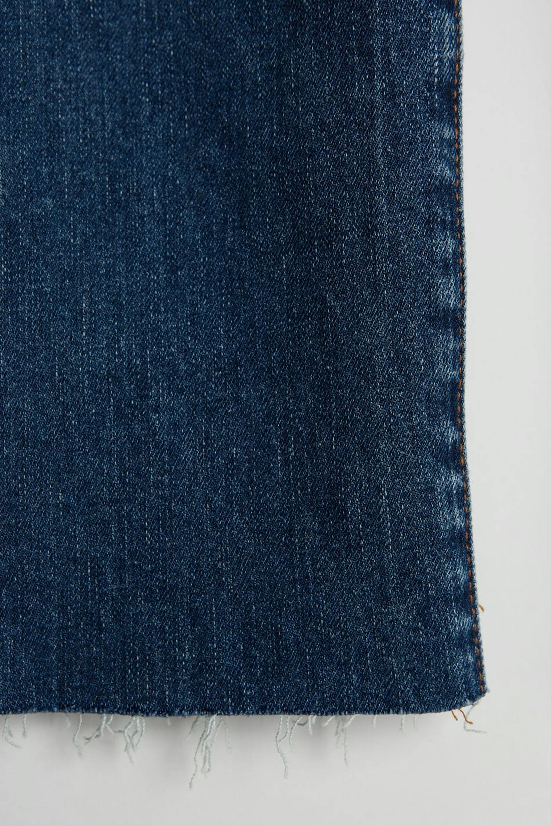 Flare-jeans med en tilpasset passform. Jeansene er blå og har avkortede, lett utsvingede bein. De er laget av denim og har et lavt stretch, en gylf med en glidelås og en rå skjørtelengde i enden av benet.