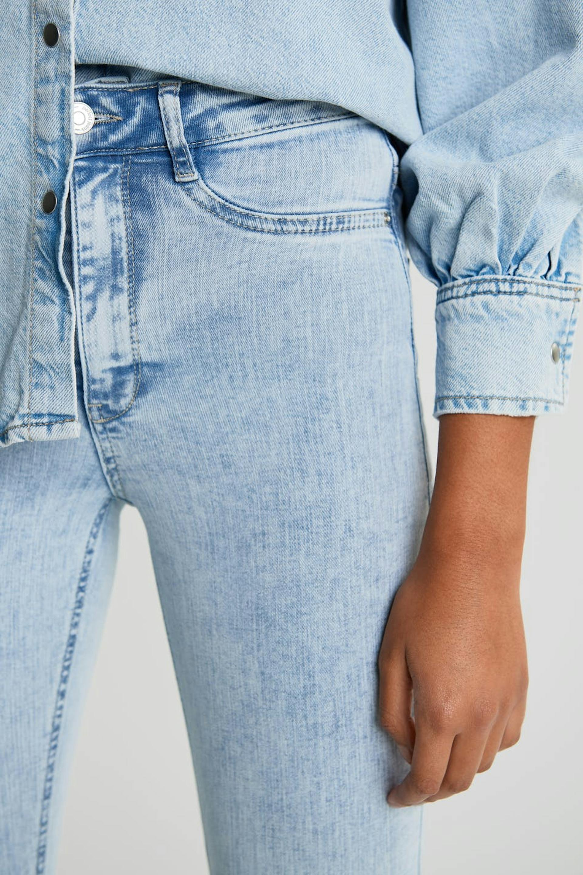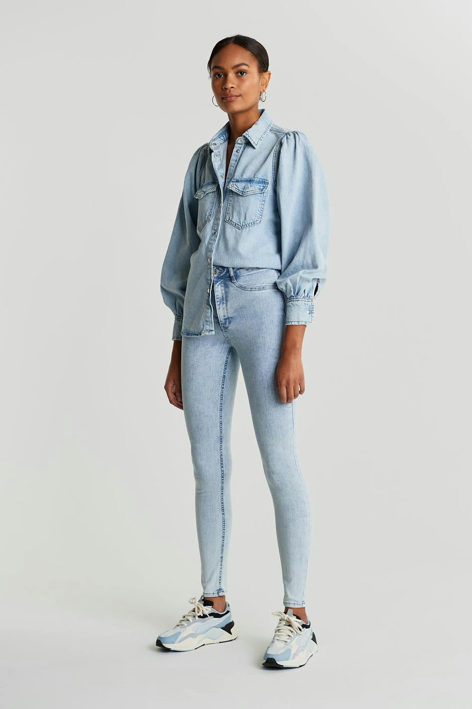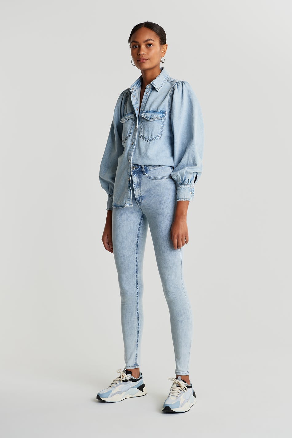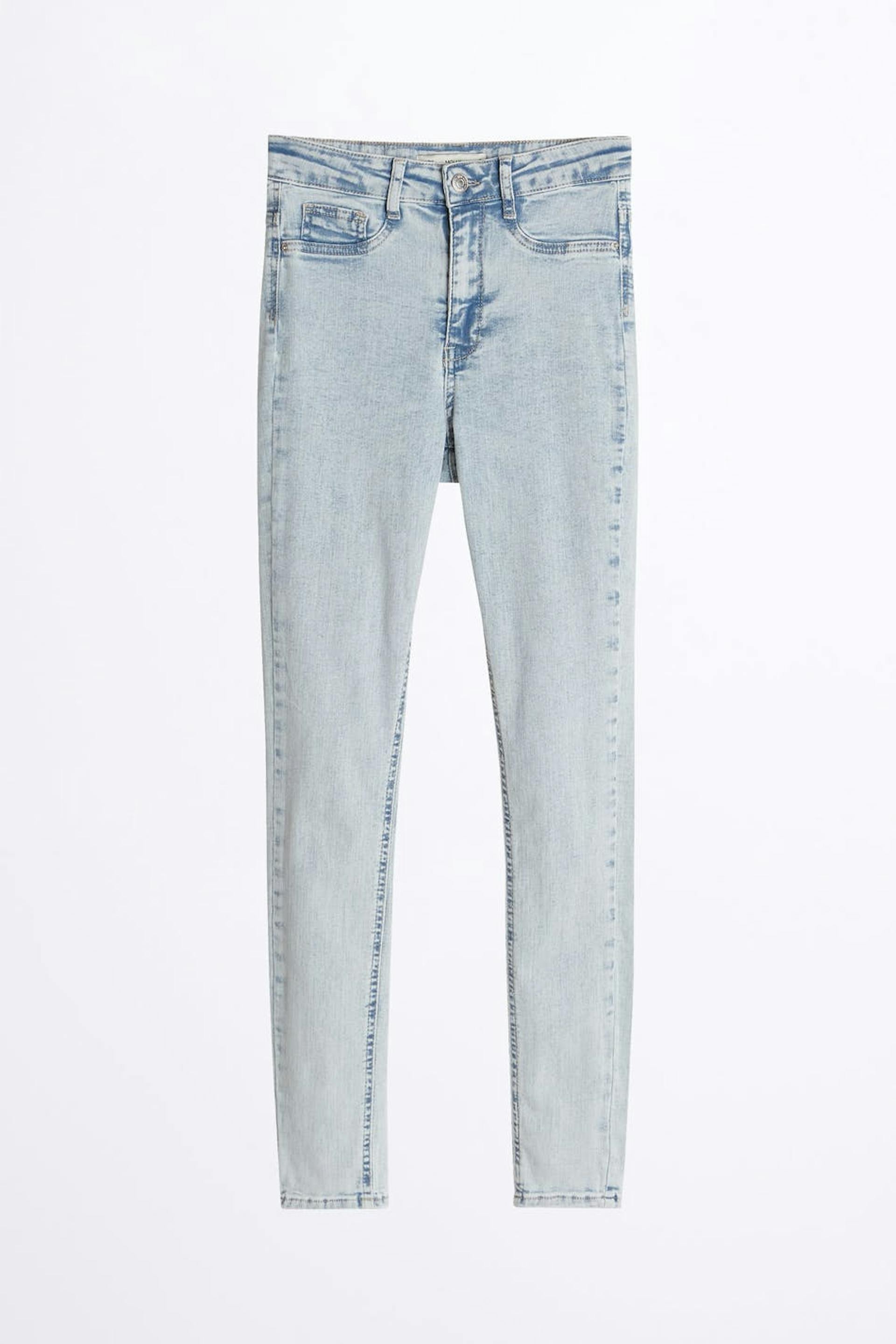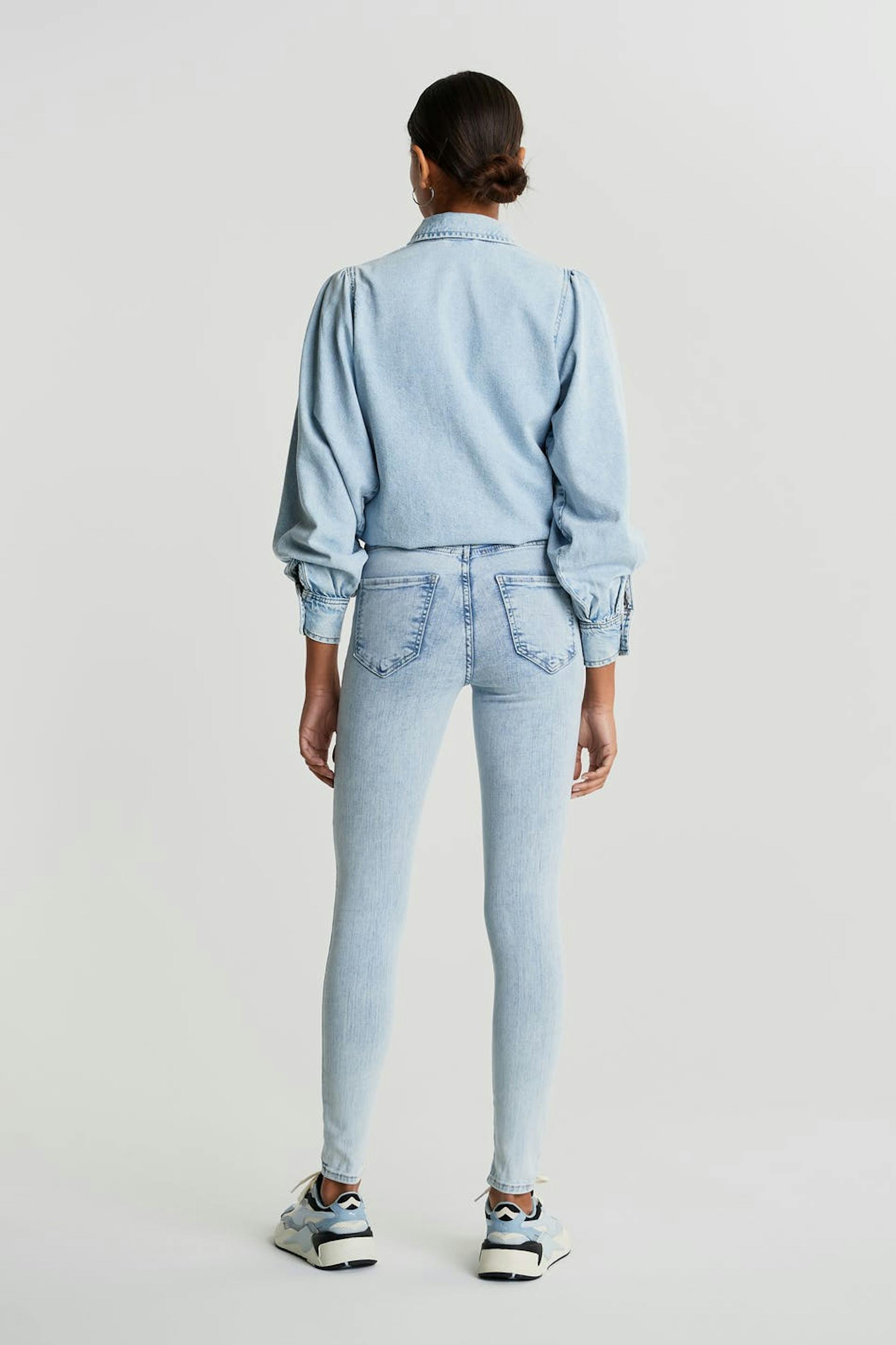 Superstretch jeans med en tilpasset passform. Jeansene er blå, myke og komfortable. De har skinny fit, en høy midje, jukselommer foran og vanlige baklommer.
