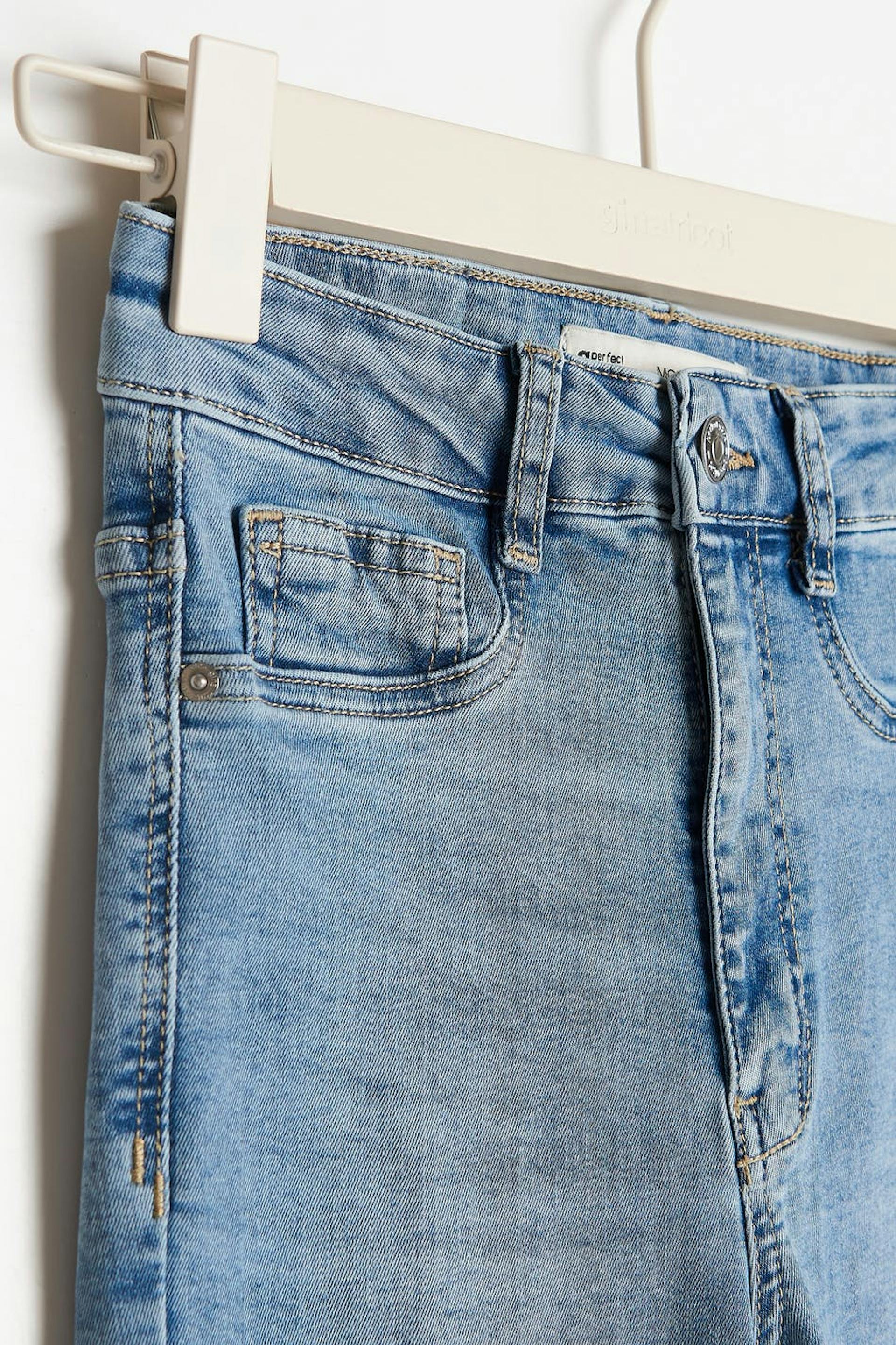 Superstretch jeans med høy midje. Jeansene er blå og myke og har en tilpasset, komfortabel passform med smale buksebein. De har gylf med glidelås, jukselommer foran og ekte baklommer. Passer til deg som er 175 cm eller høyere.