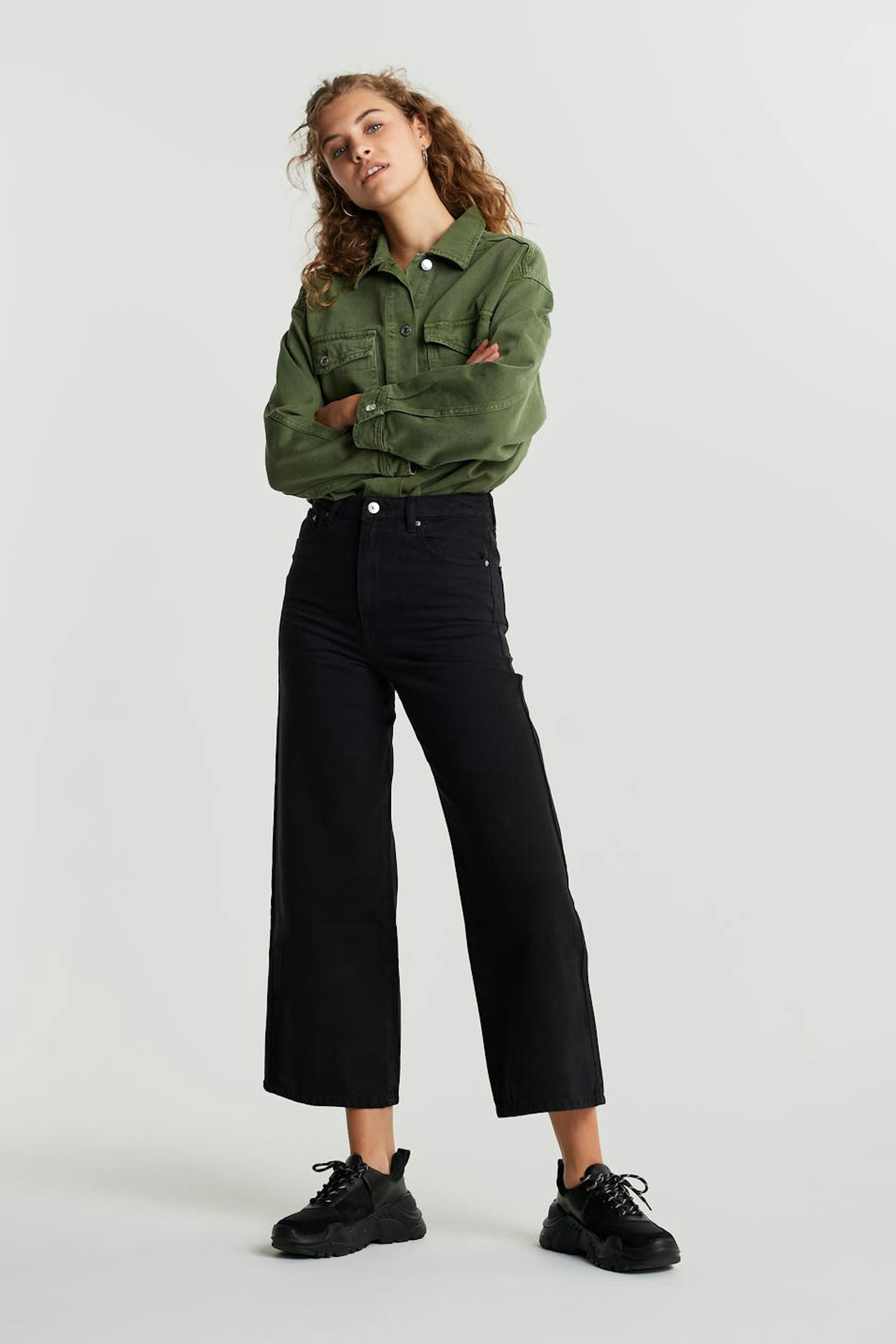 Brede highwaist-jeans med en vanlig passform. Jeansene er svarte og har en høy midje. De har avkortede bein.