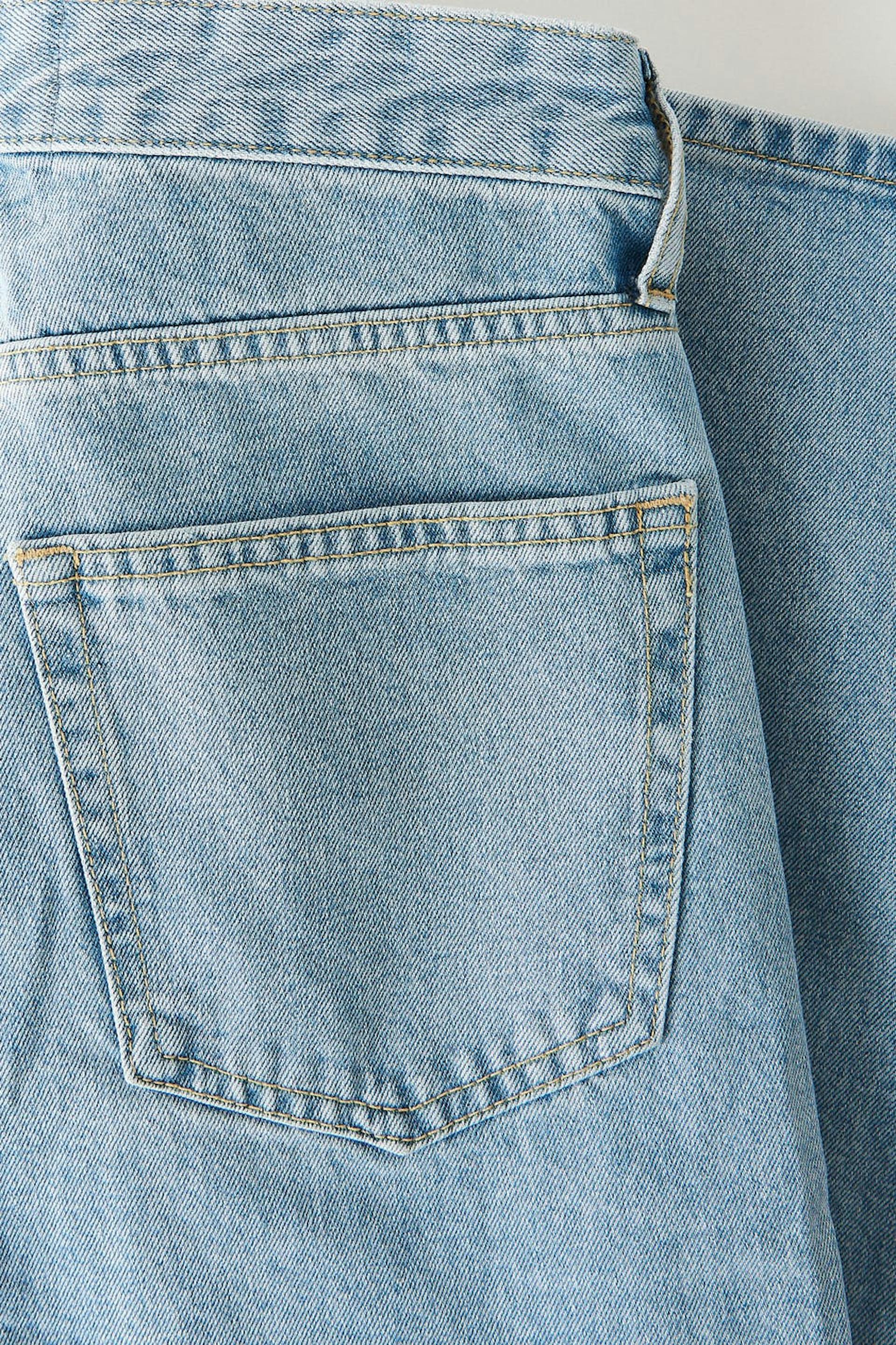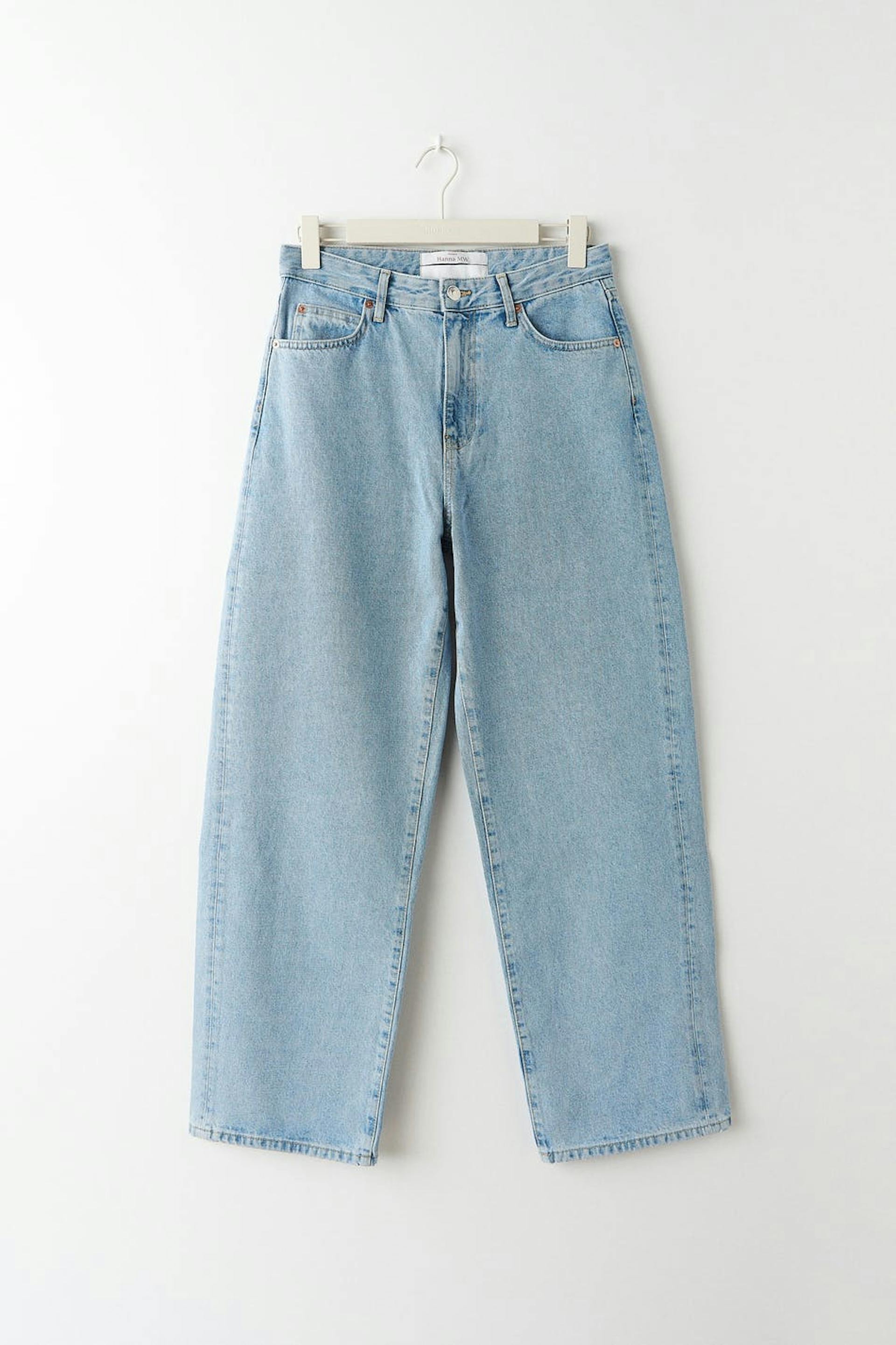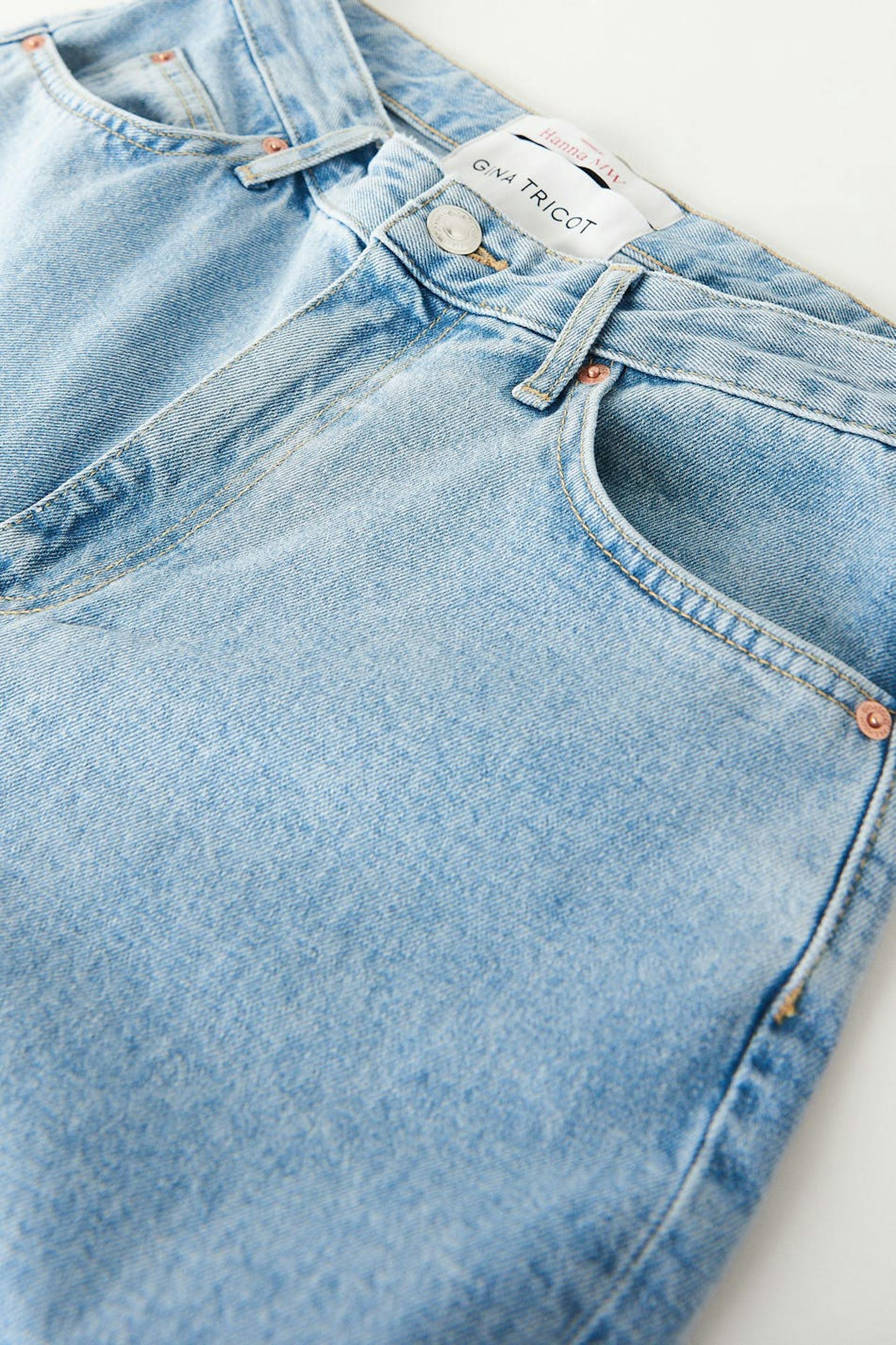 Hanna MW X Gina Tricot. Loose jeans med en oversized passform i non-stretch denim. Jeansene er blå og har en medium høy midje. De har en knapplukking og rette bein med kortere benlengde. Jeansen er produsert av tøyrester og omsydde jeans.