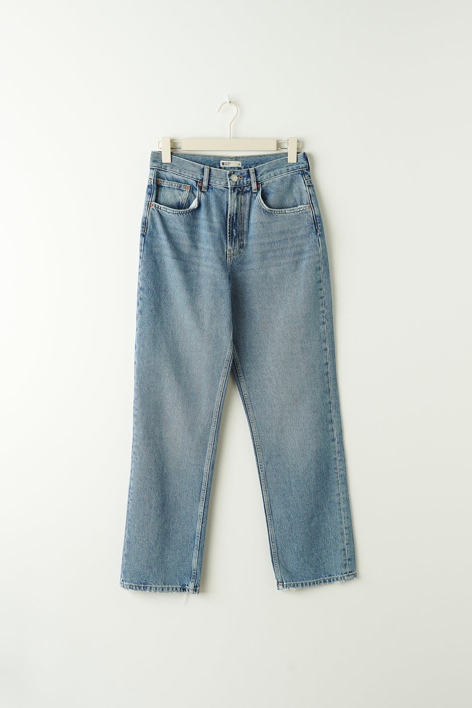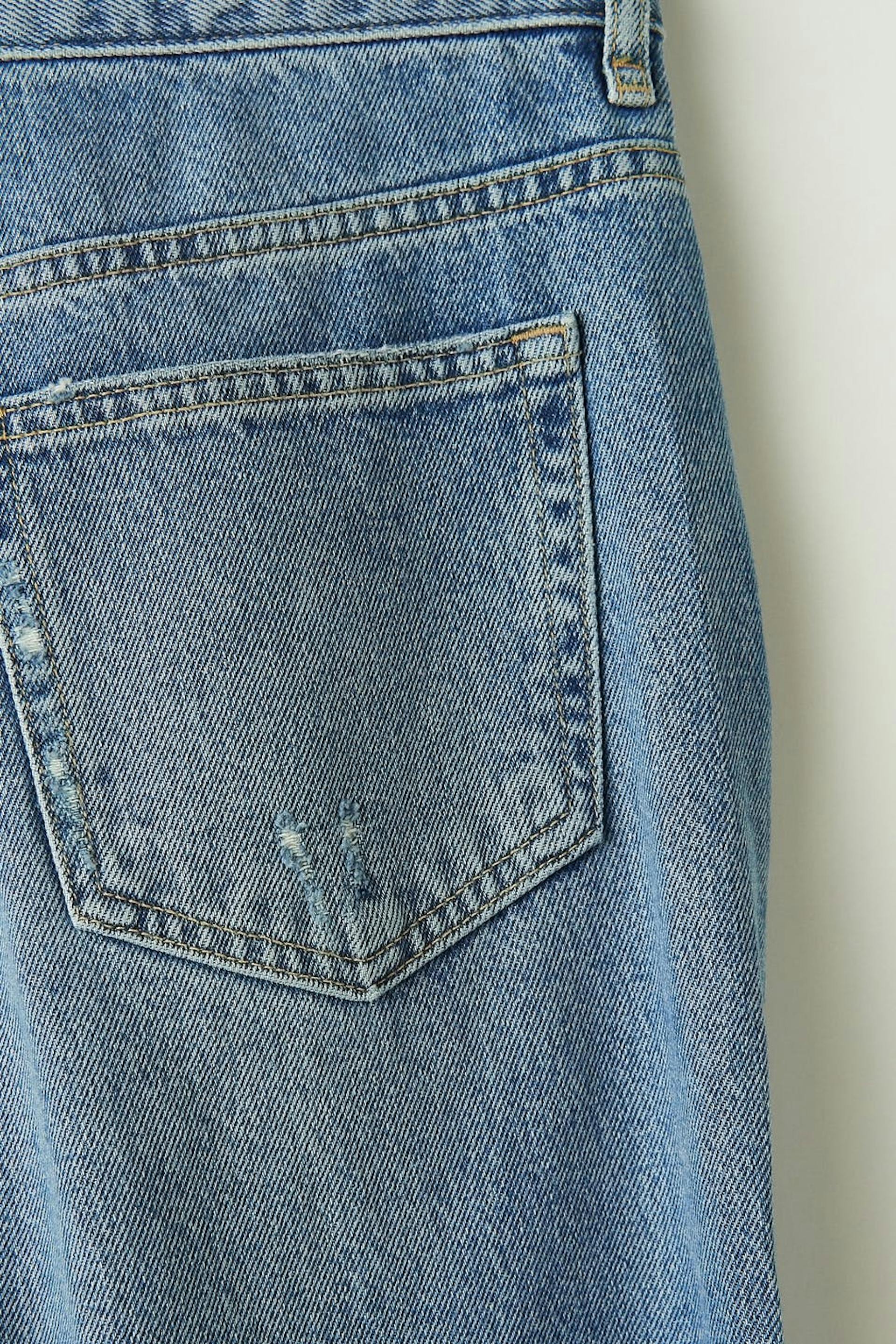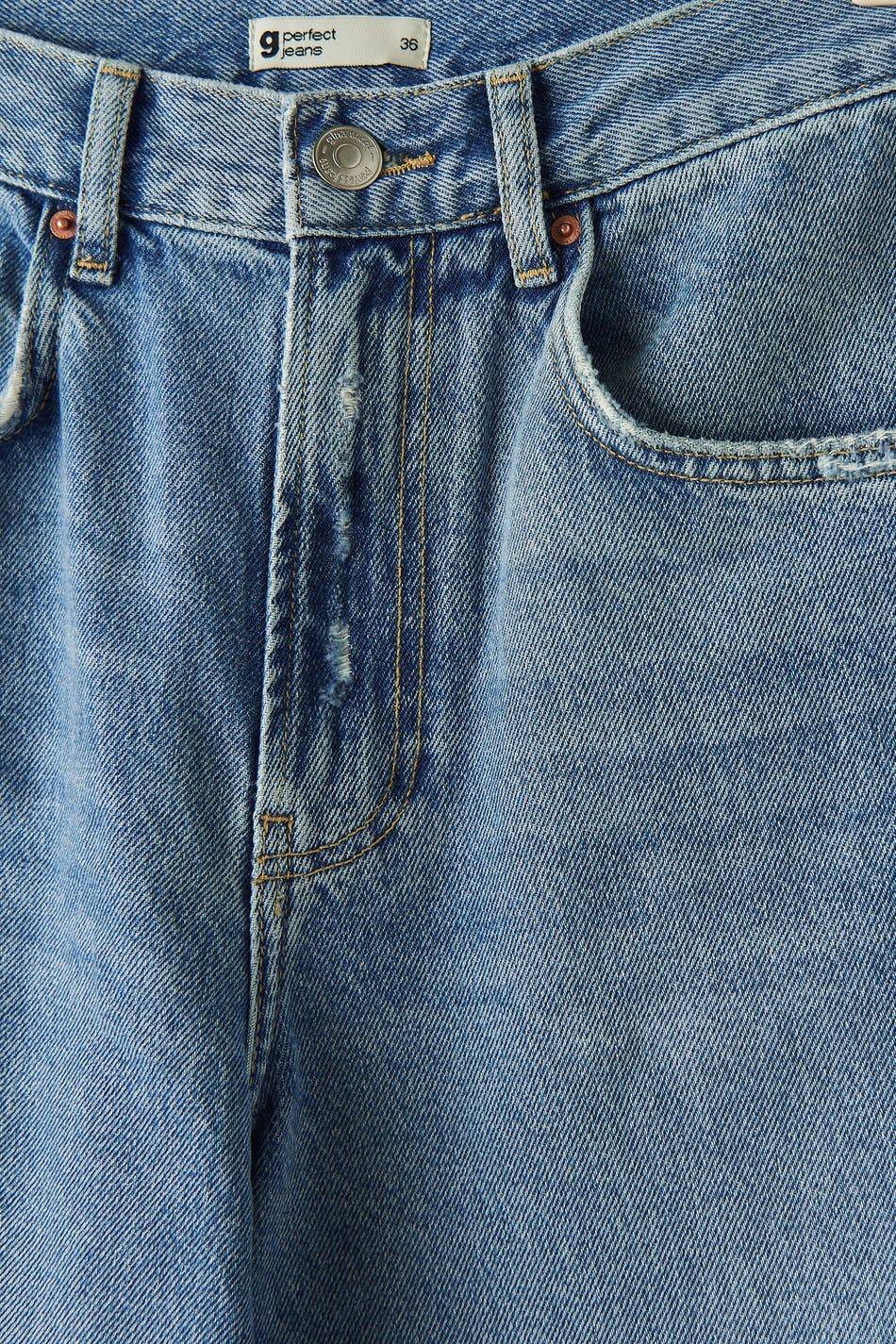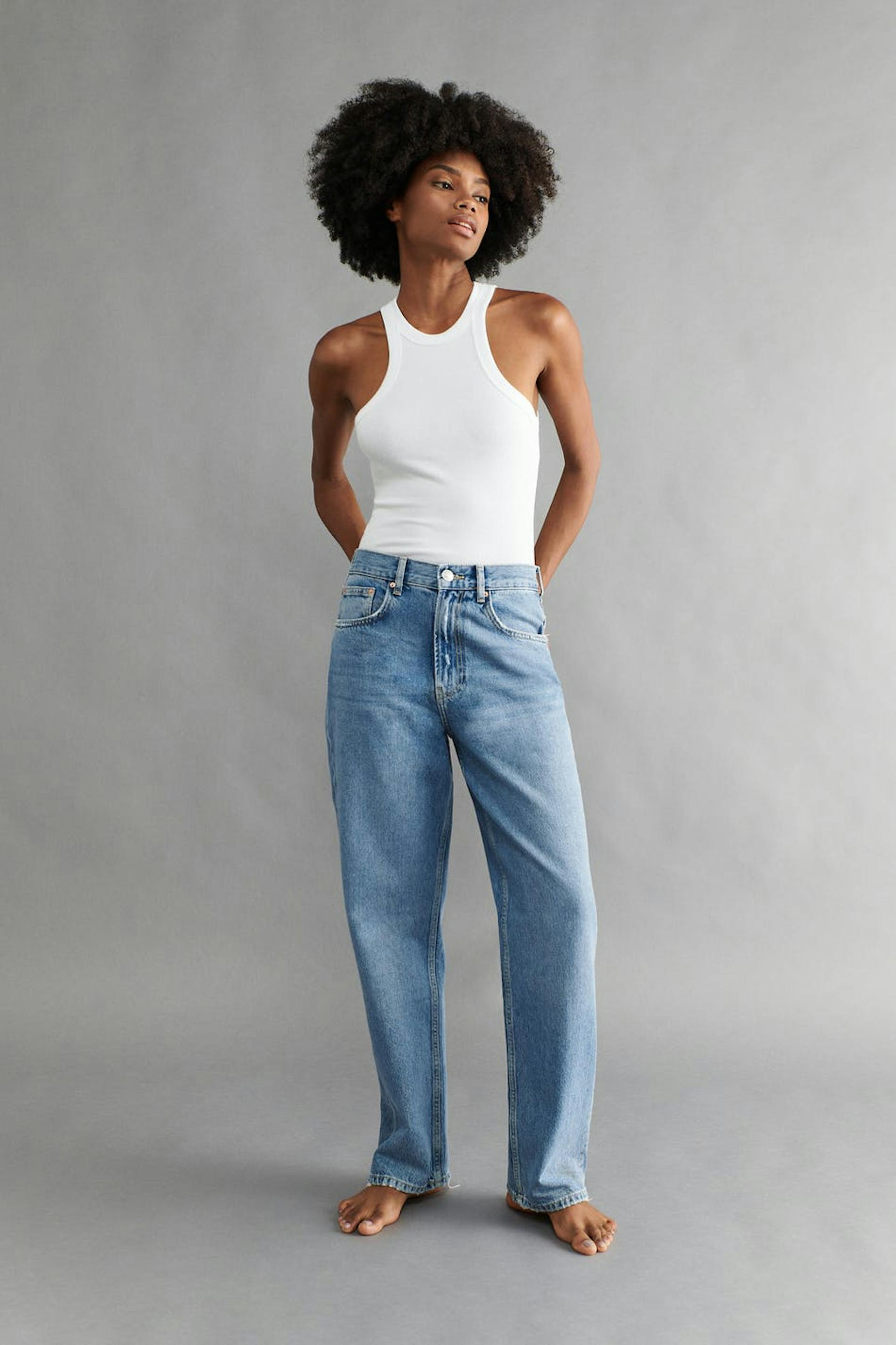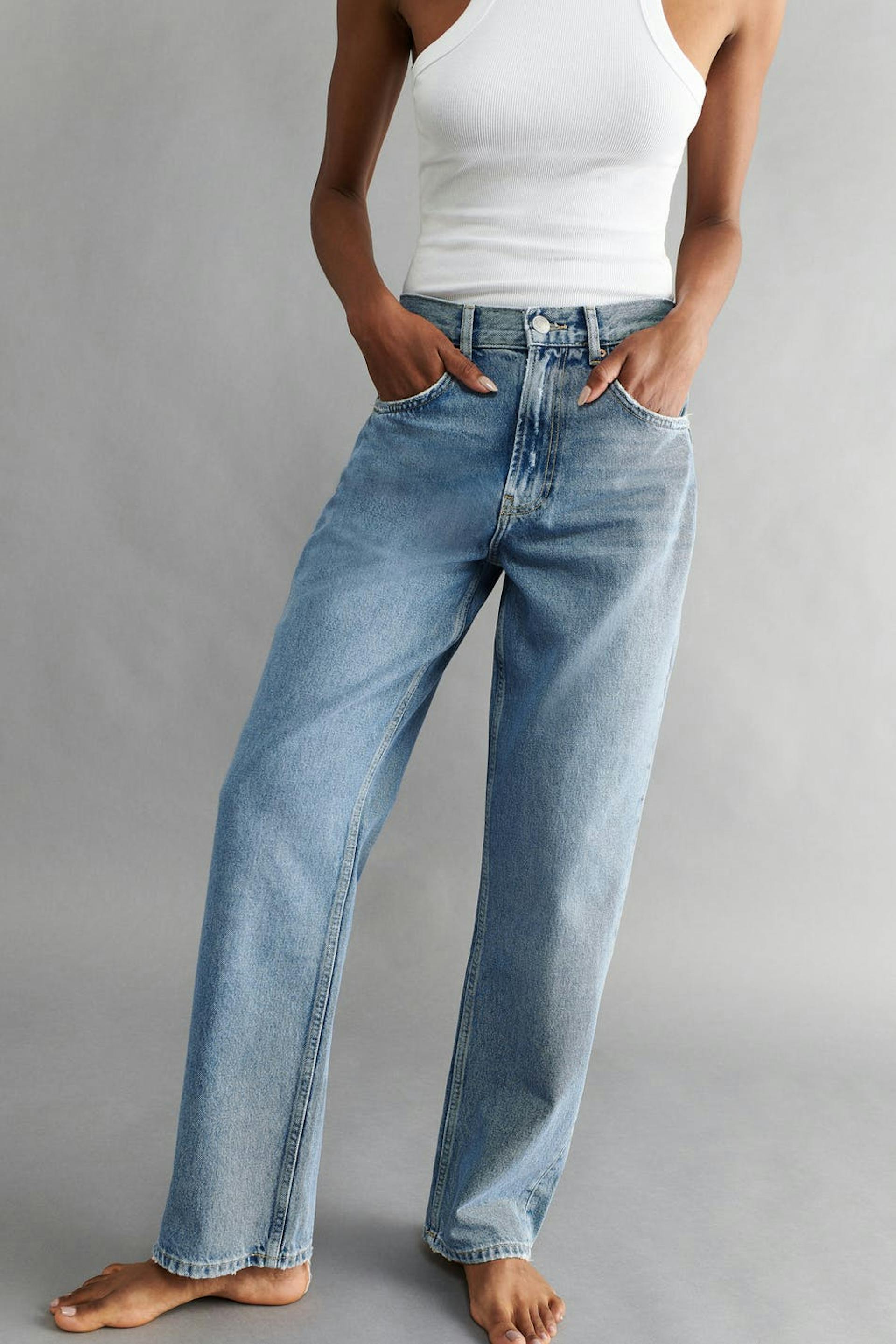 Boyfriend jeans med lav midje i non-stretch denim. Jeansene er blå og har løs passform. De har knapplukking og rette bein med normal lengde. Se gjerne vår størrelsesguide for å finne størrelsen din.