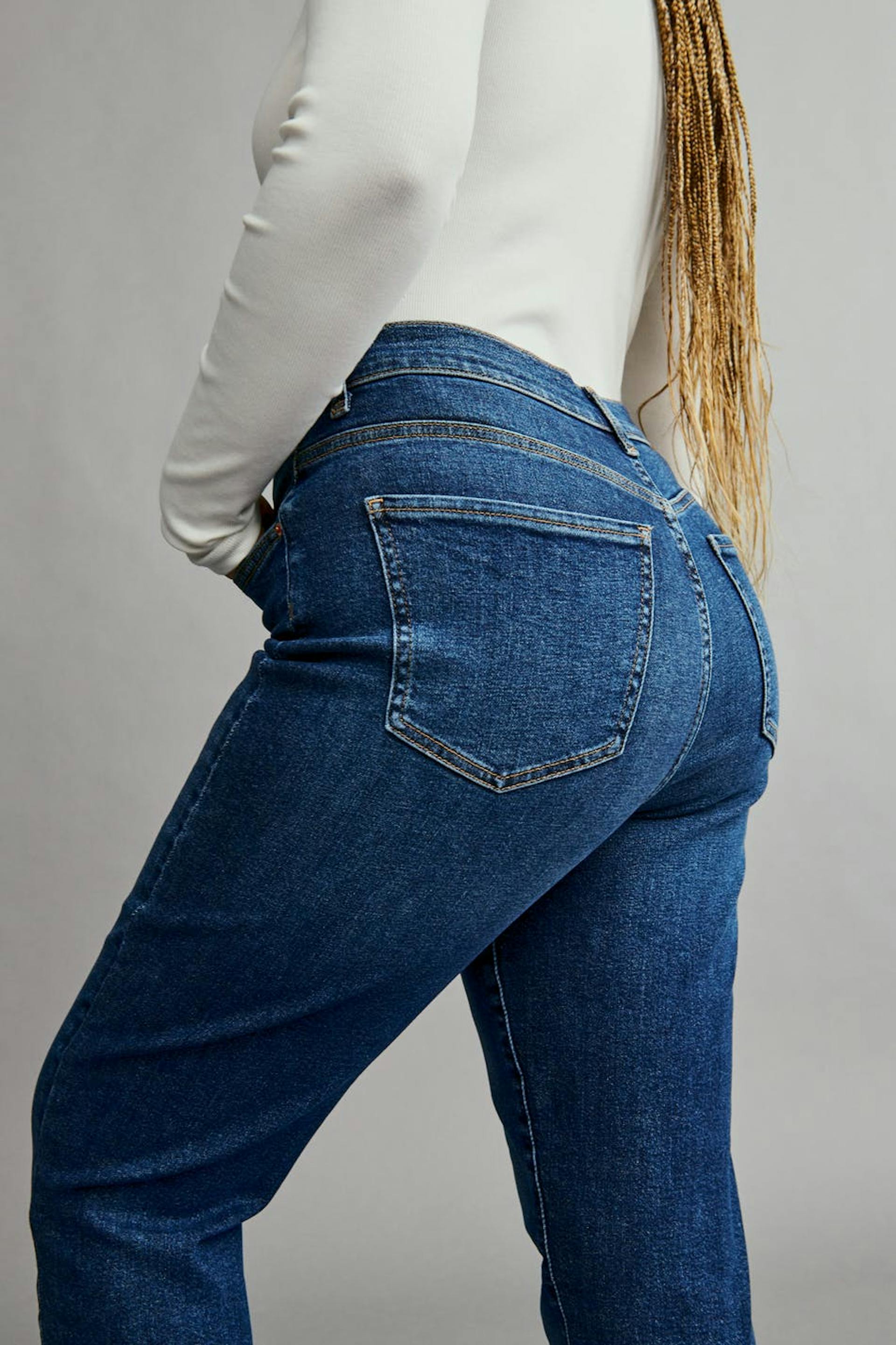 Komfortable jeans med høy midje i stretch denim. Jeansene er blå og har avsmalnende bein med ankellang benlengde. De har gylf med glidelås og lommer foran og bak. Se gjerne vår størrelsesguide for å finne størrelsen din.