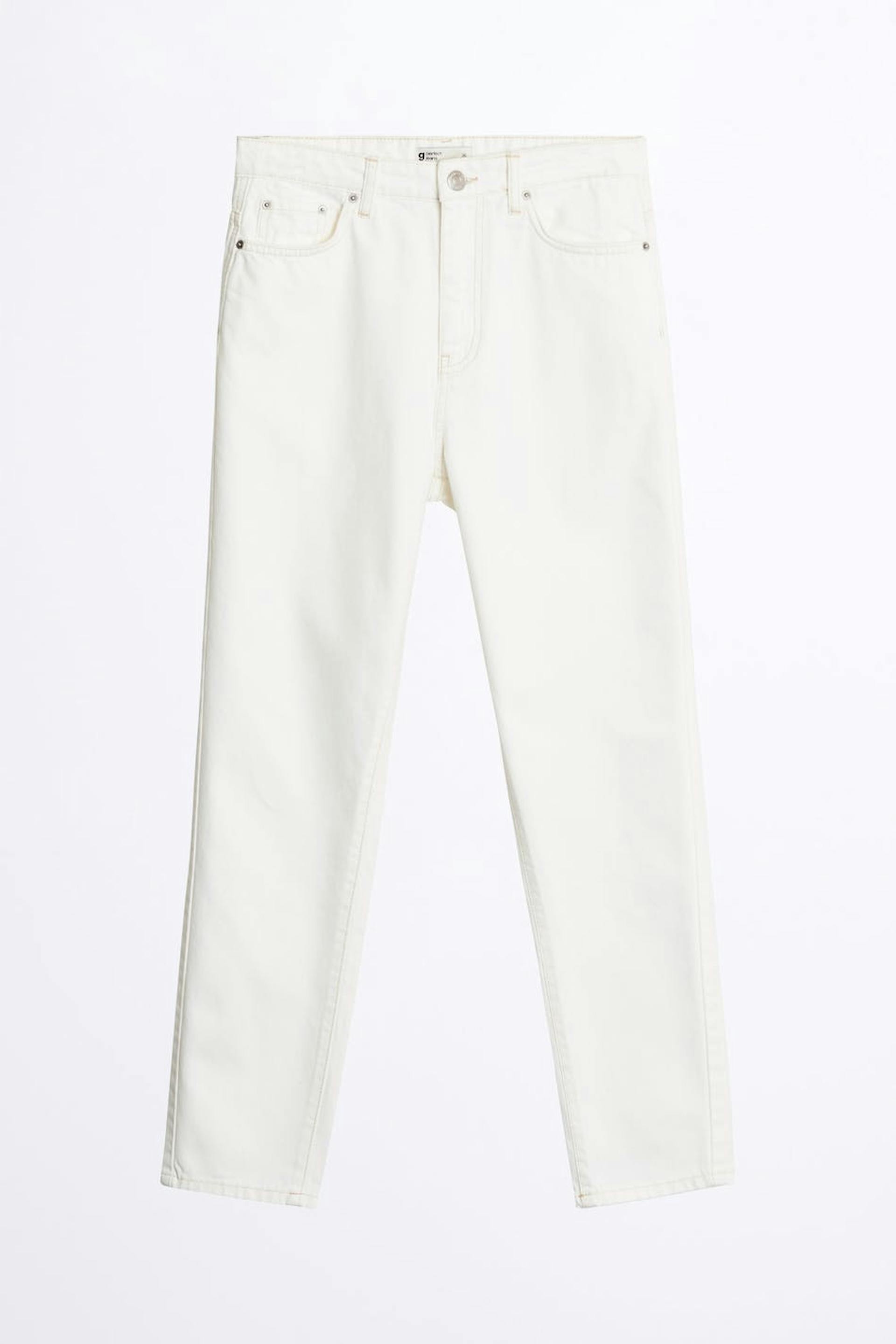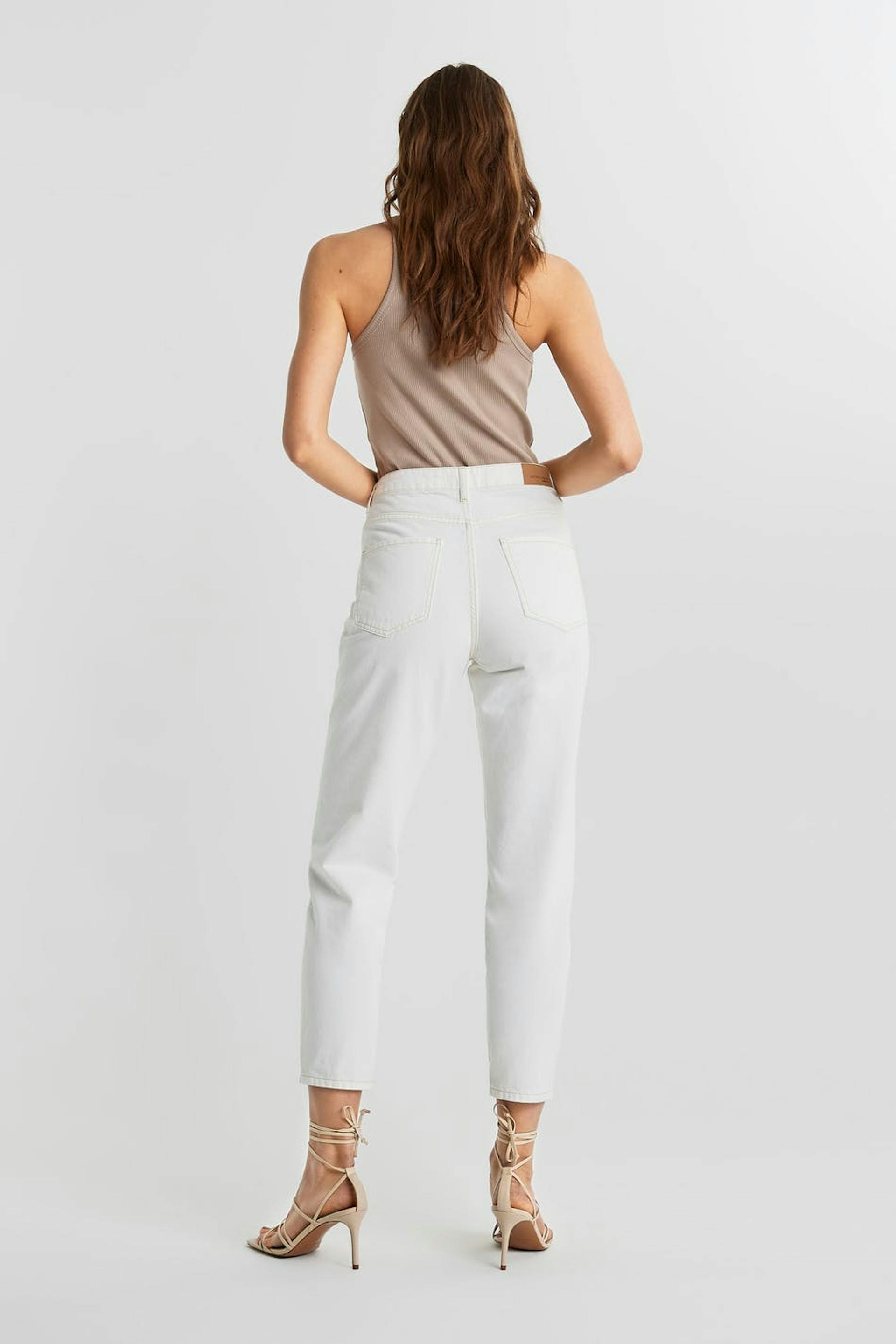 Non-stretche mom jeans med en høy midje. Jeansene er hvite og har en avslappet passform. De har avsmalnende bein.