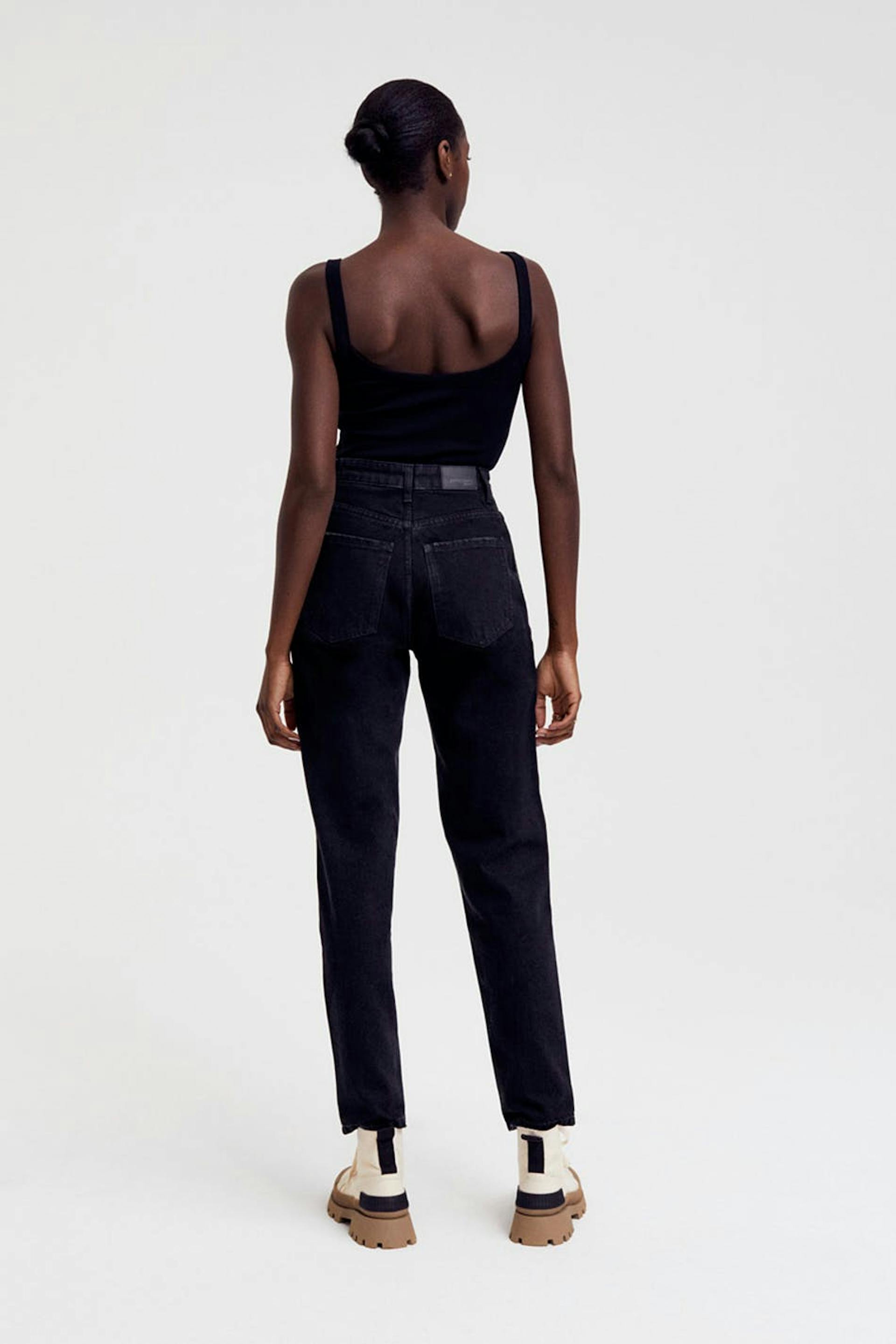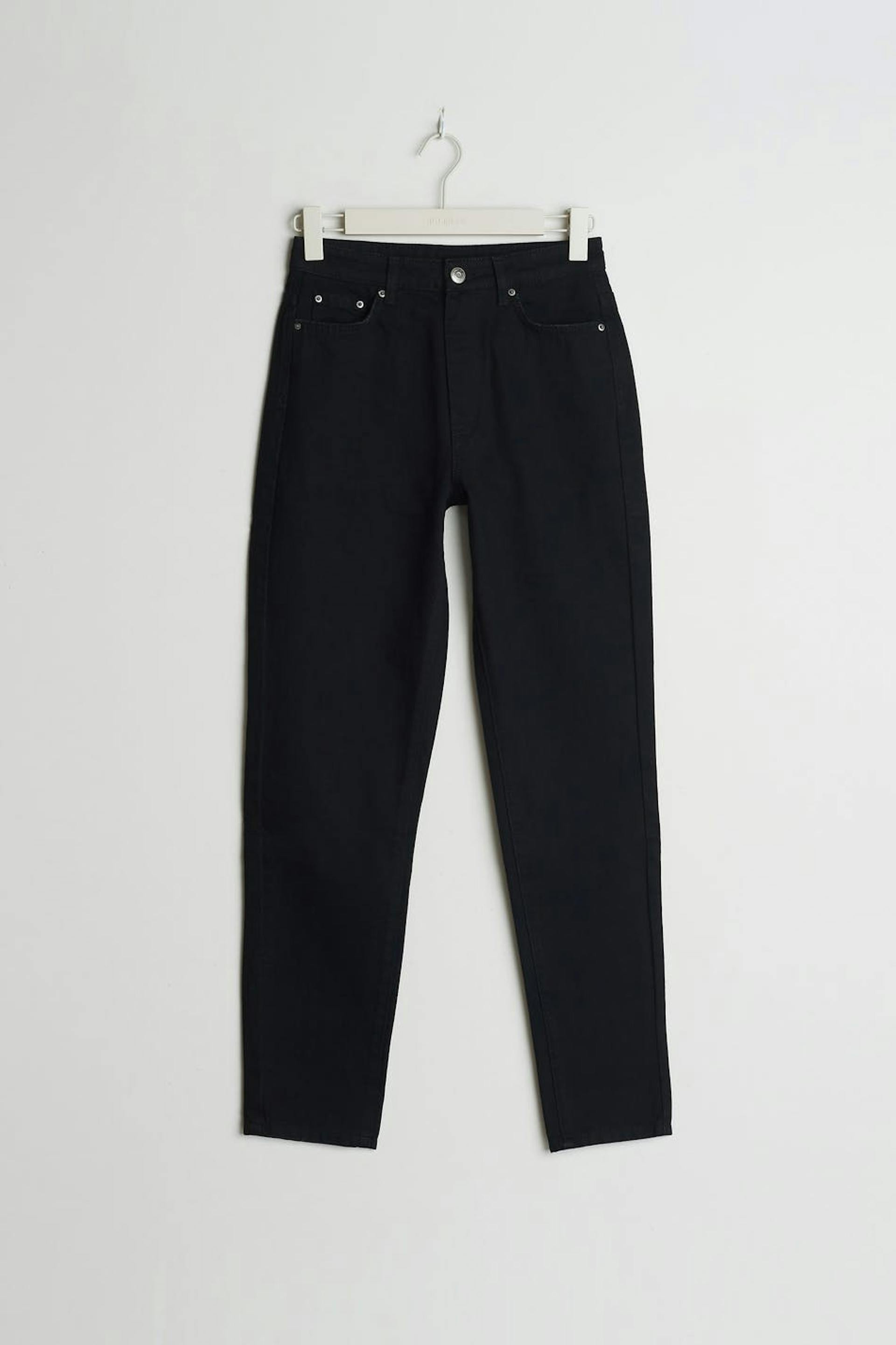 Klassiske mom jeans med høy midje i myk non-stretch denim. Jeansene er svarte og har slim-fit. De har en lynlås og avsmalnende bein med ankellang benlengde. Perfekte basejeans for garderoben din. Passer til deg som er 175 cm eller høyere.