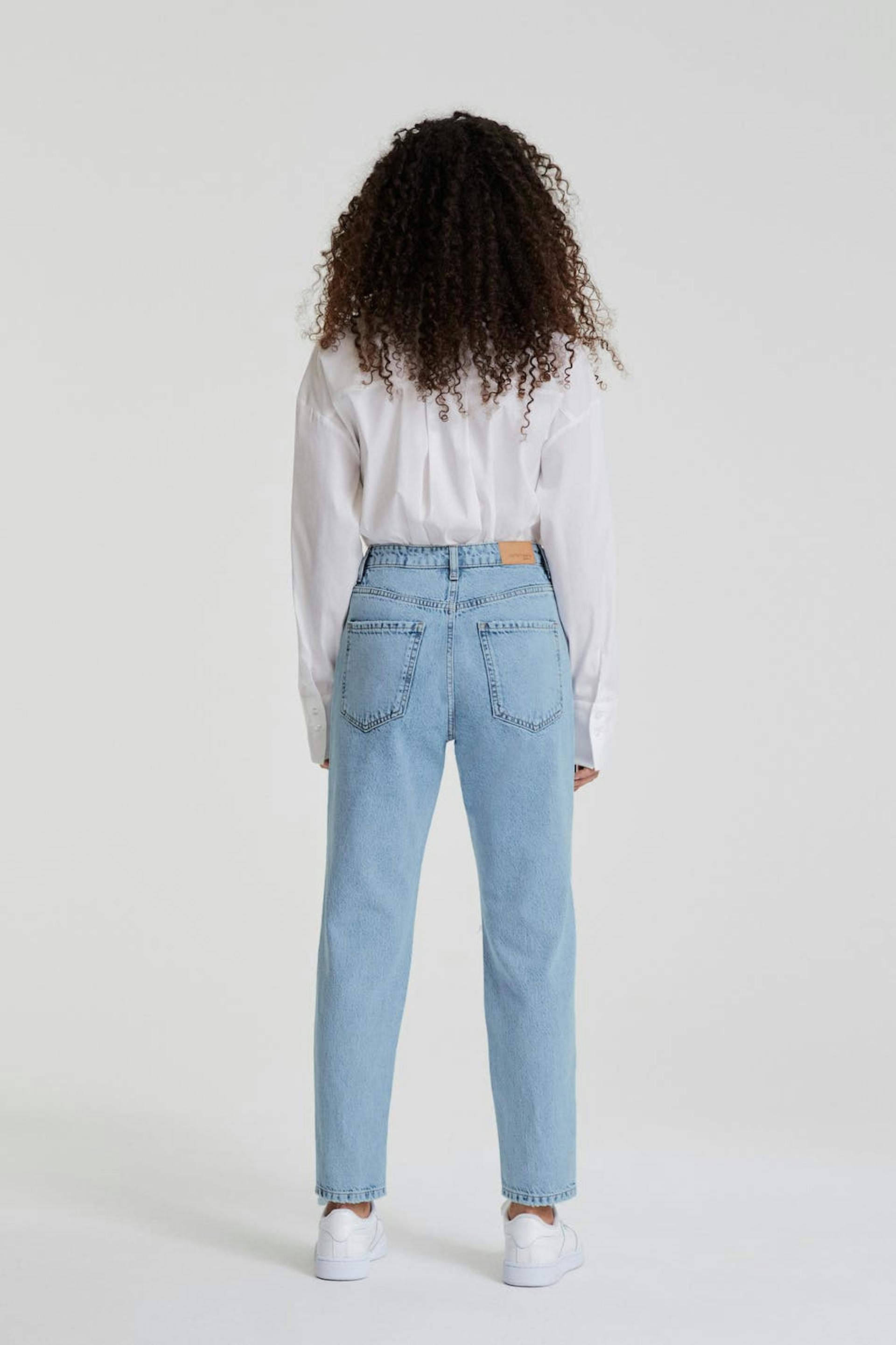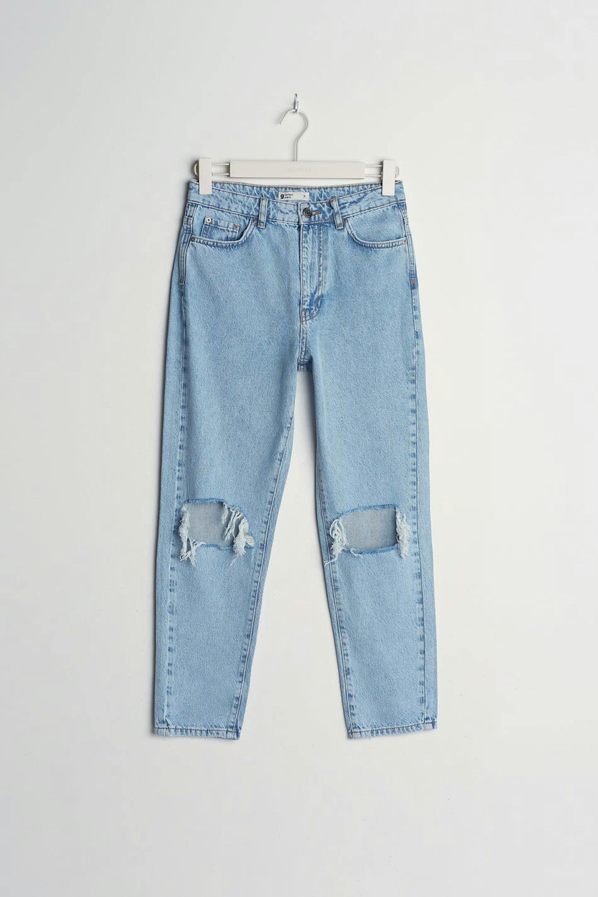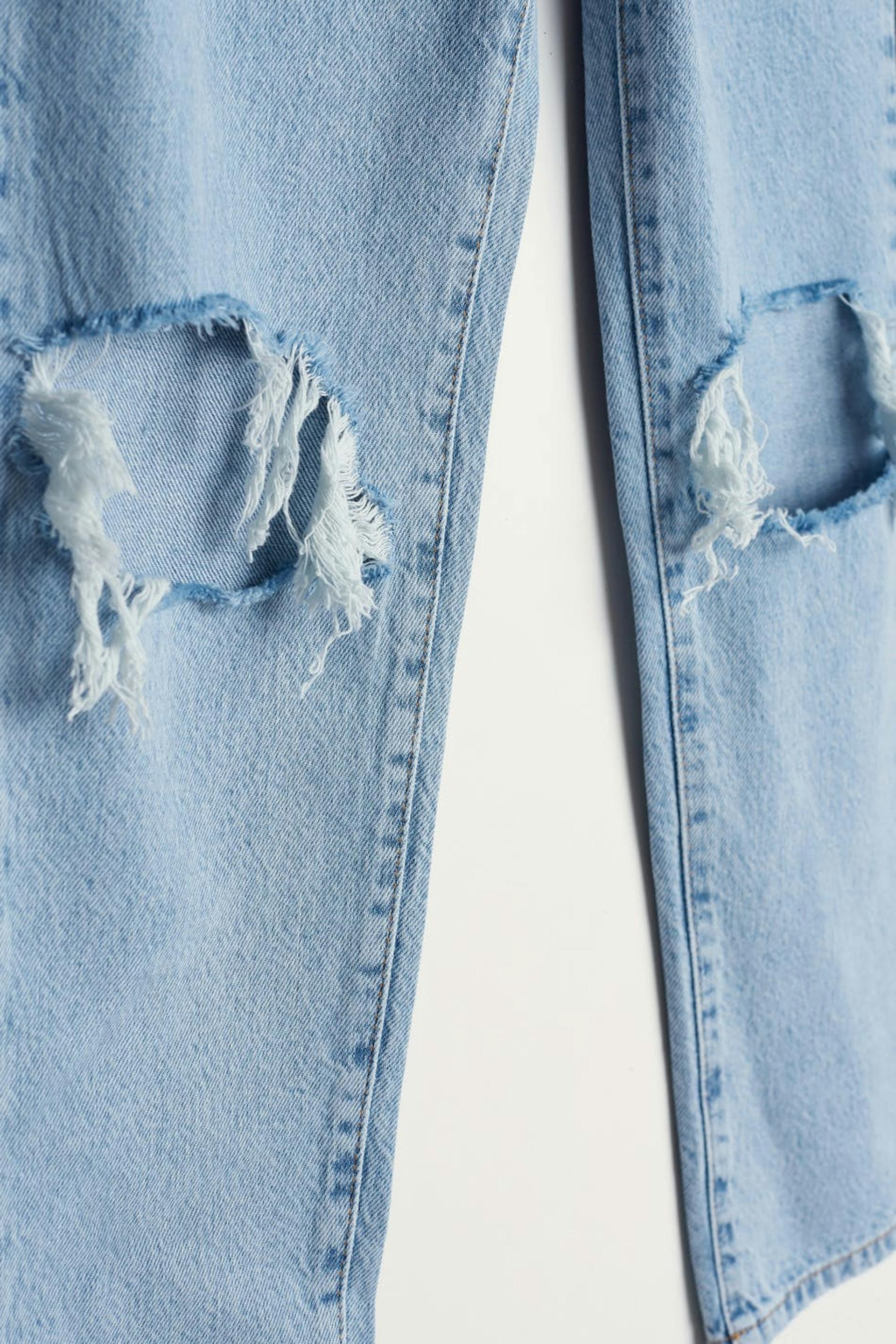 Små mom jeans med en vanlig passform. Jeansene er blå, små og non-stretche. De har slitte knær, en høy midje og avsmalnende bein med en kortere benlengde. Passer til deg som er 160 cm eller lavere.
