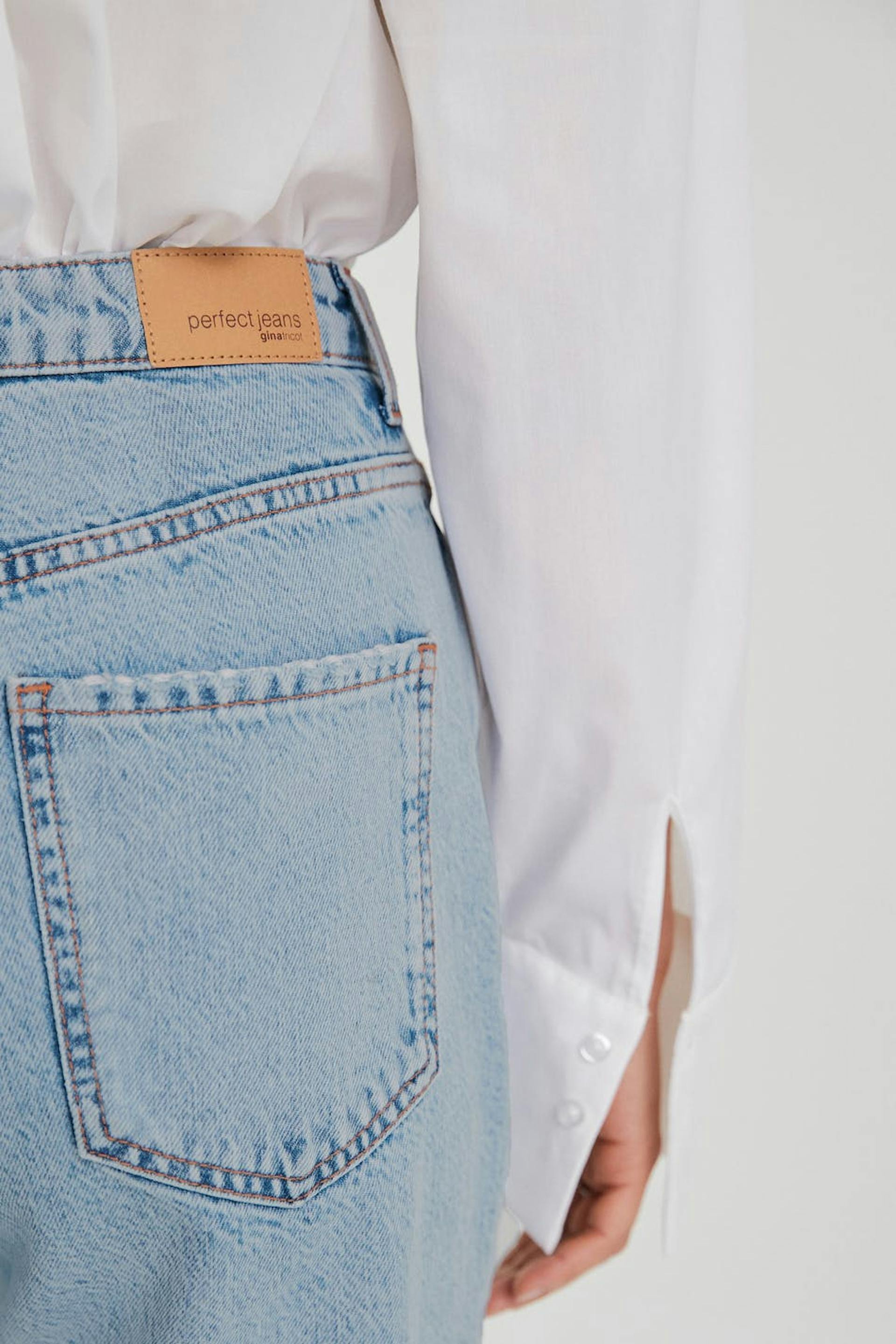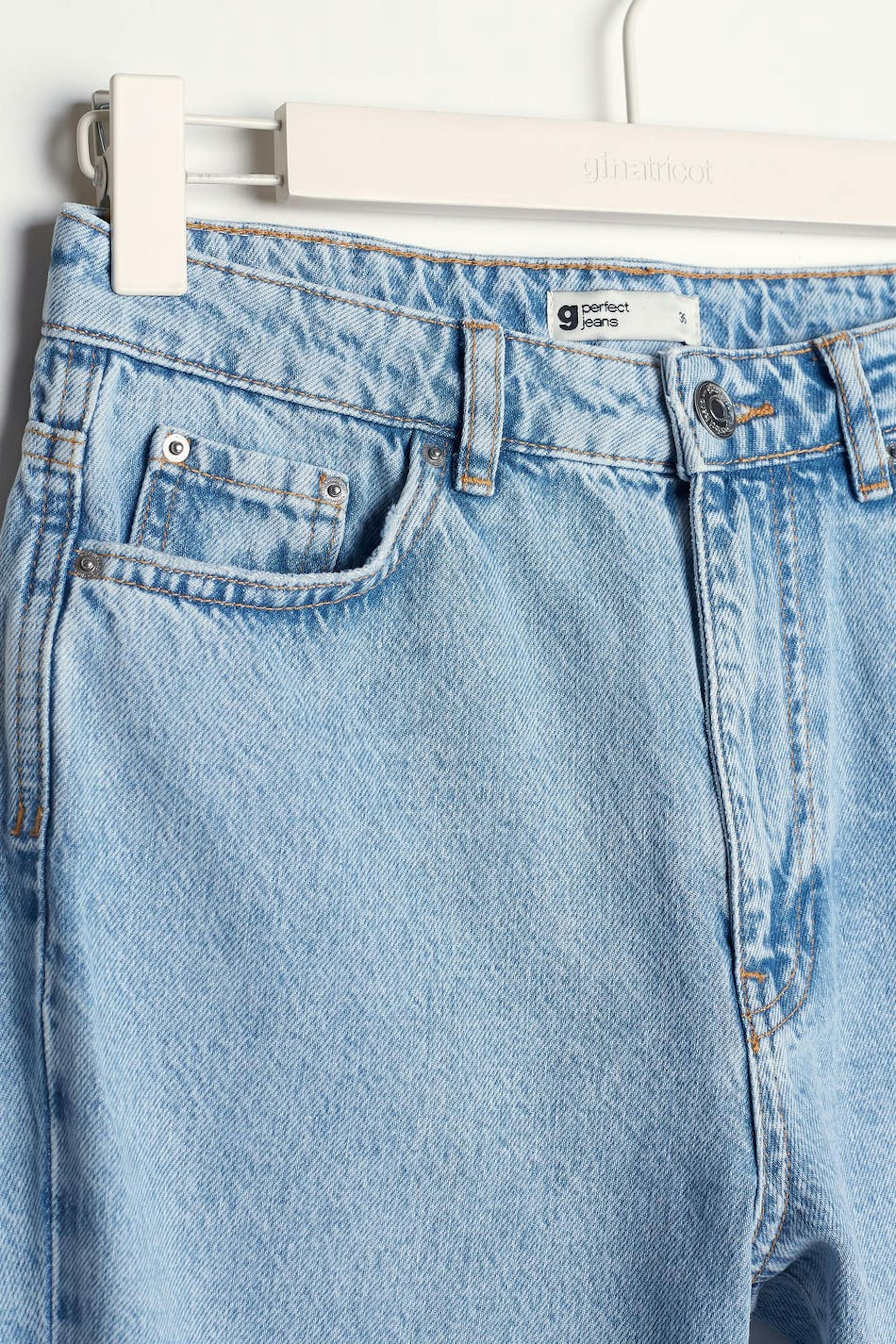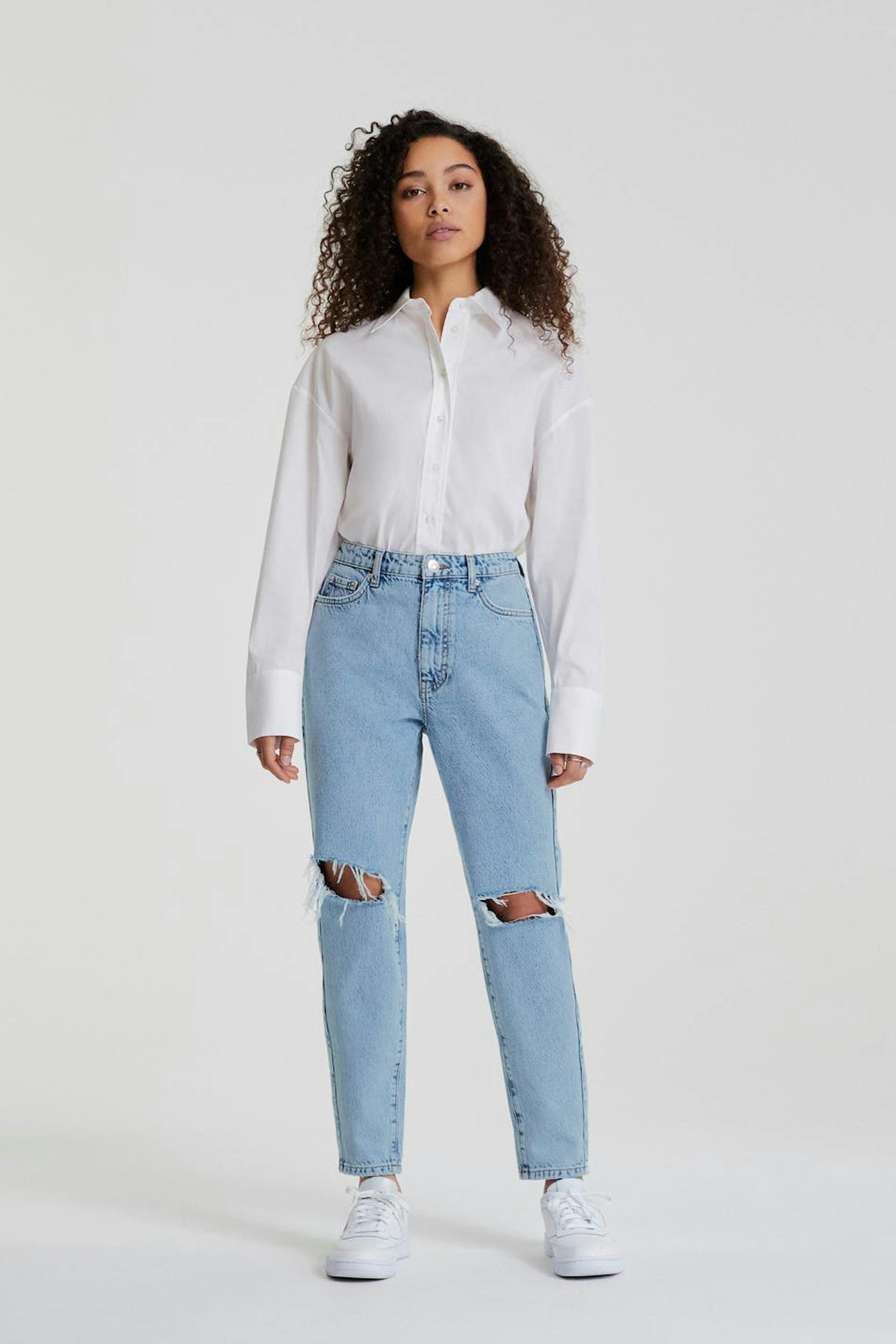 Små mom jeans med en vanlig passform. Jeansene er blå, små og non-stretche. De har slitte knær, en høy midje og avsmalnende bein med en kortere benlengde. Passer til deg som er 160 cm eller lavere.