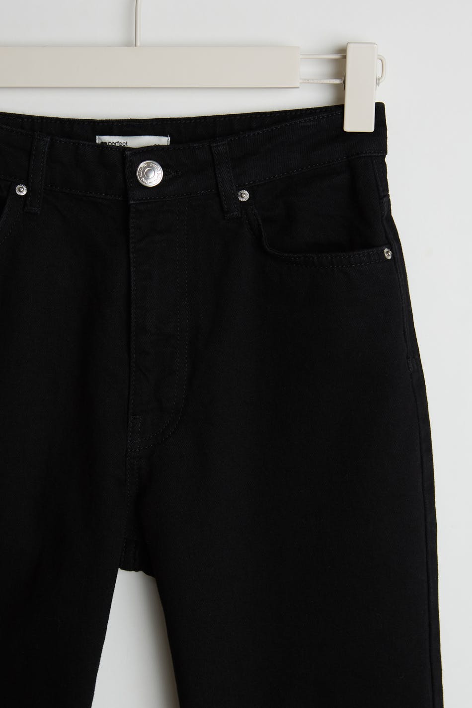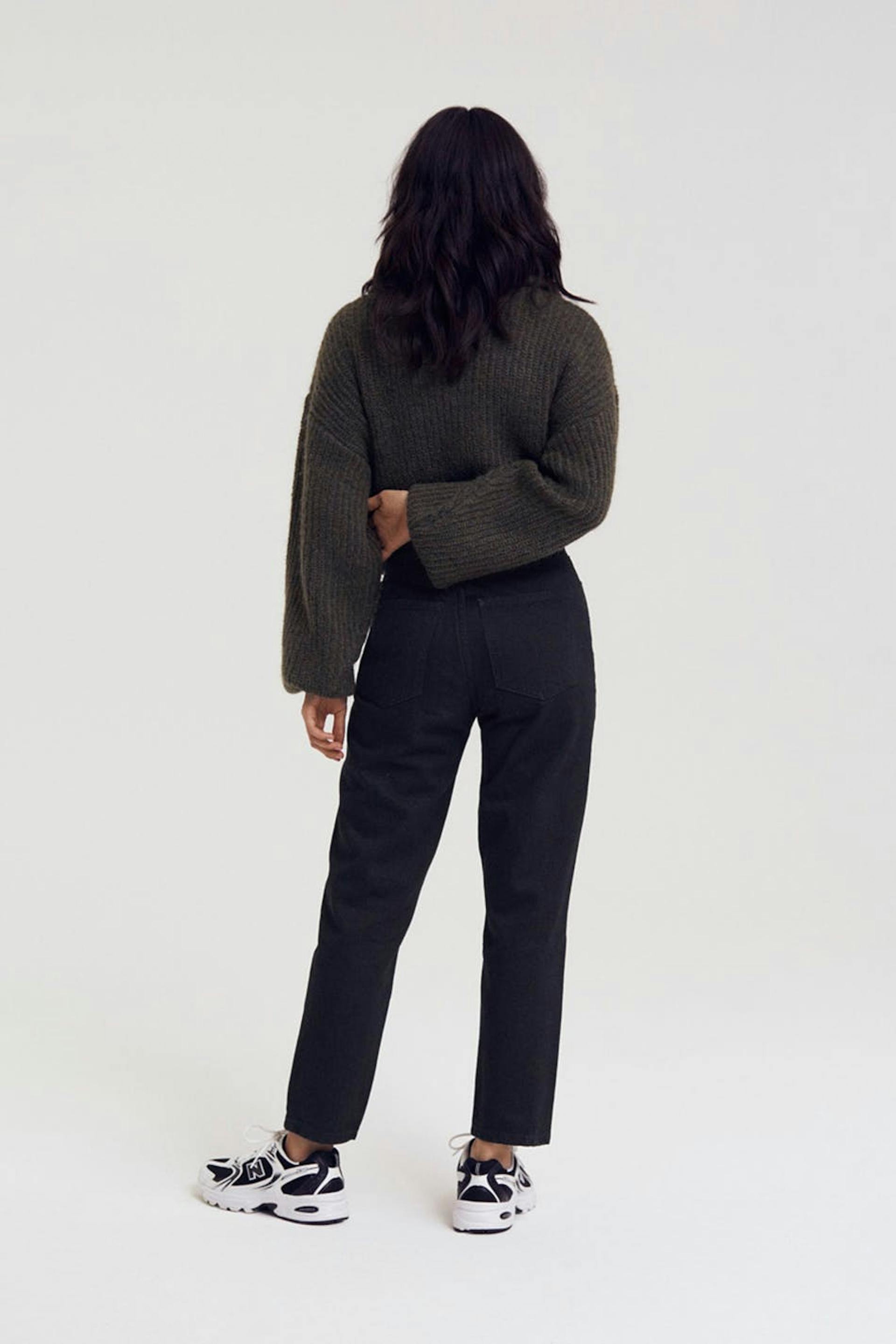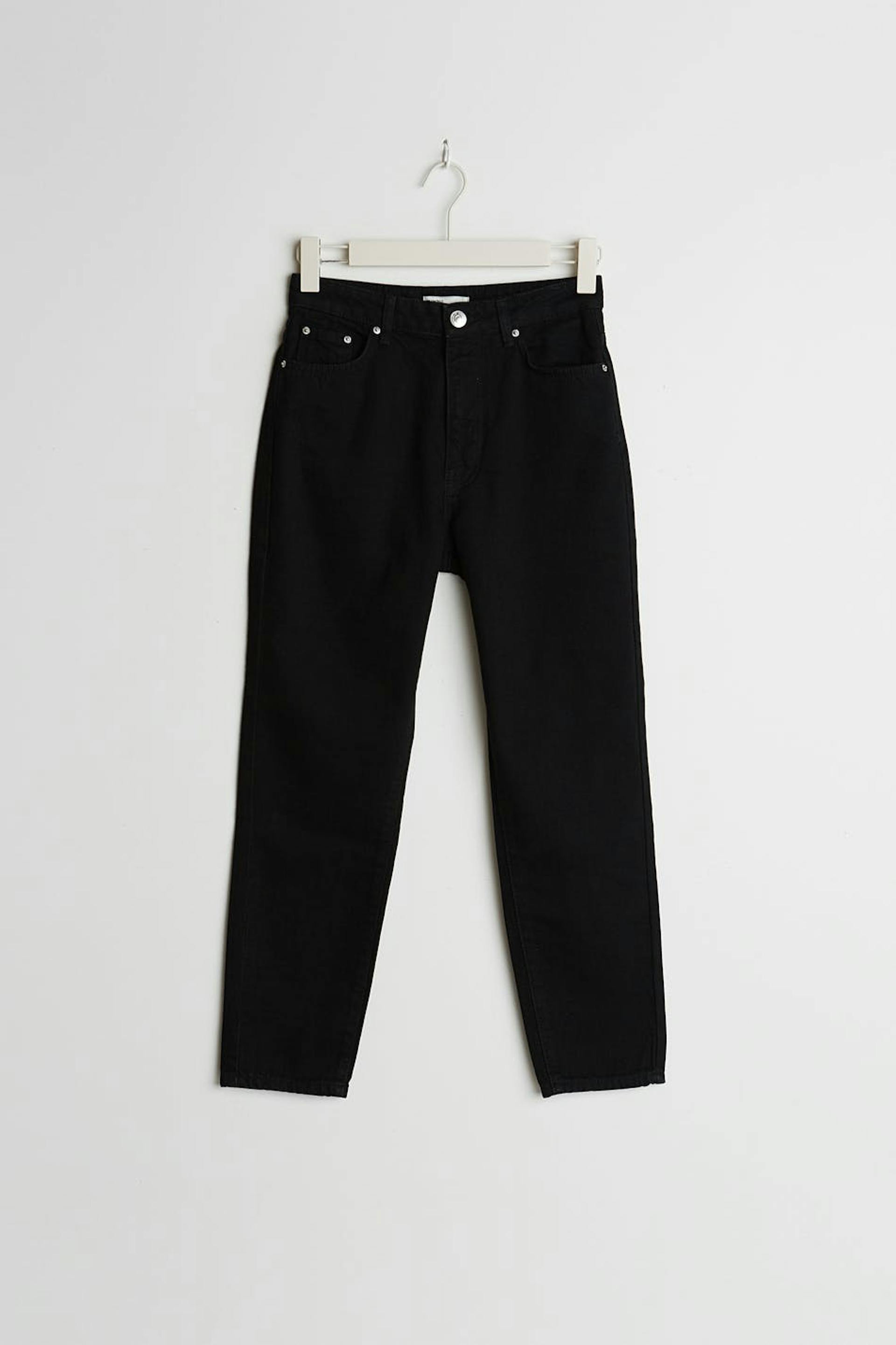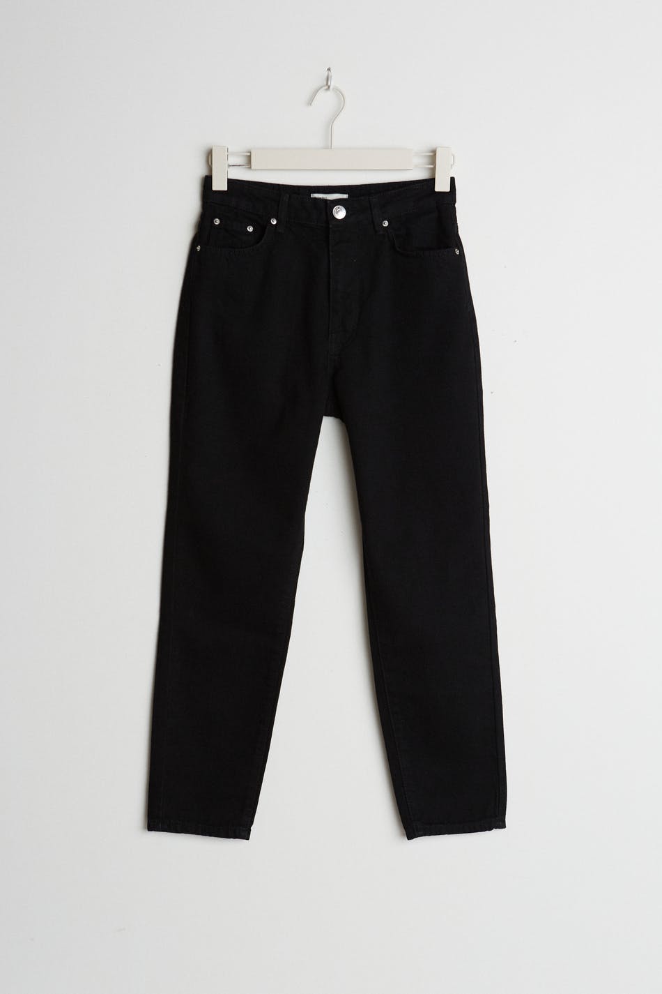Små mom jeans med høy midje i myk non-stretch denim. Jeansene er svarte og har slim-fit. De har en lynlås og avsmalnende bein med ankellang benlengde. Passer til deg som er 160 cm eller lavere. Se gjerne vår størrelsesguide for å finne størrelsen din.