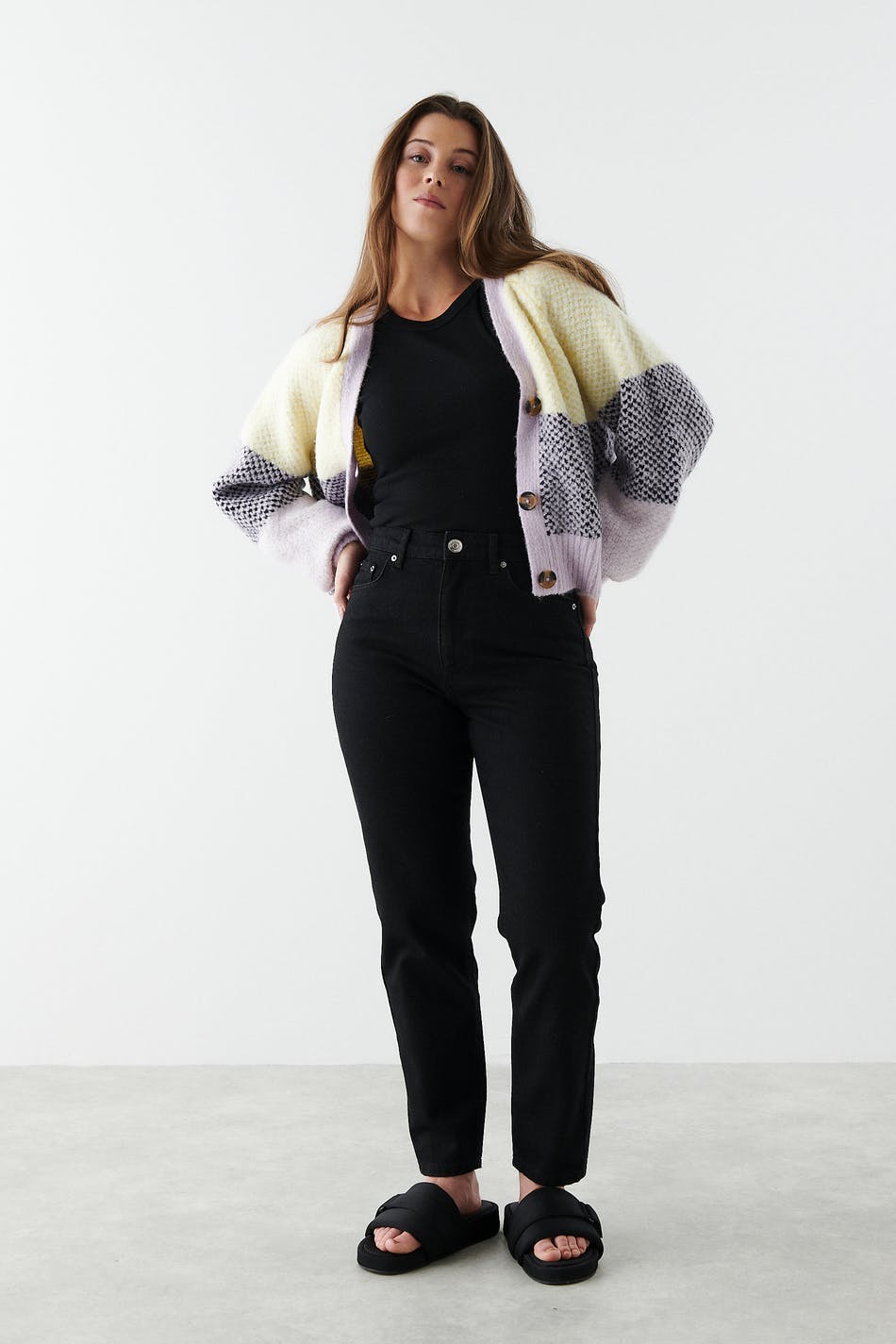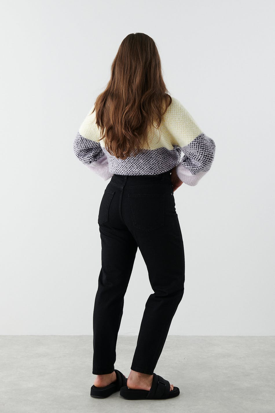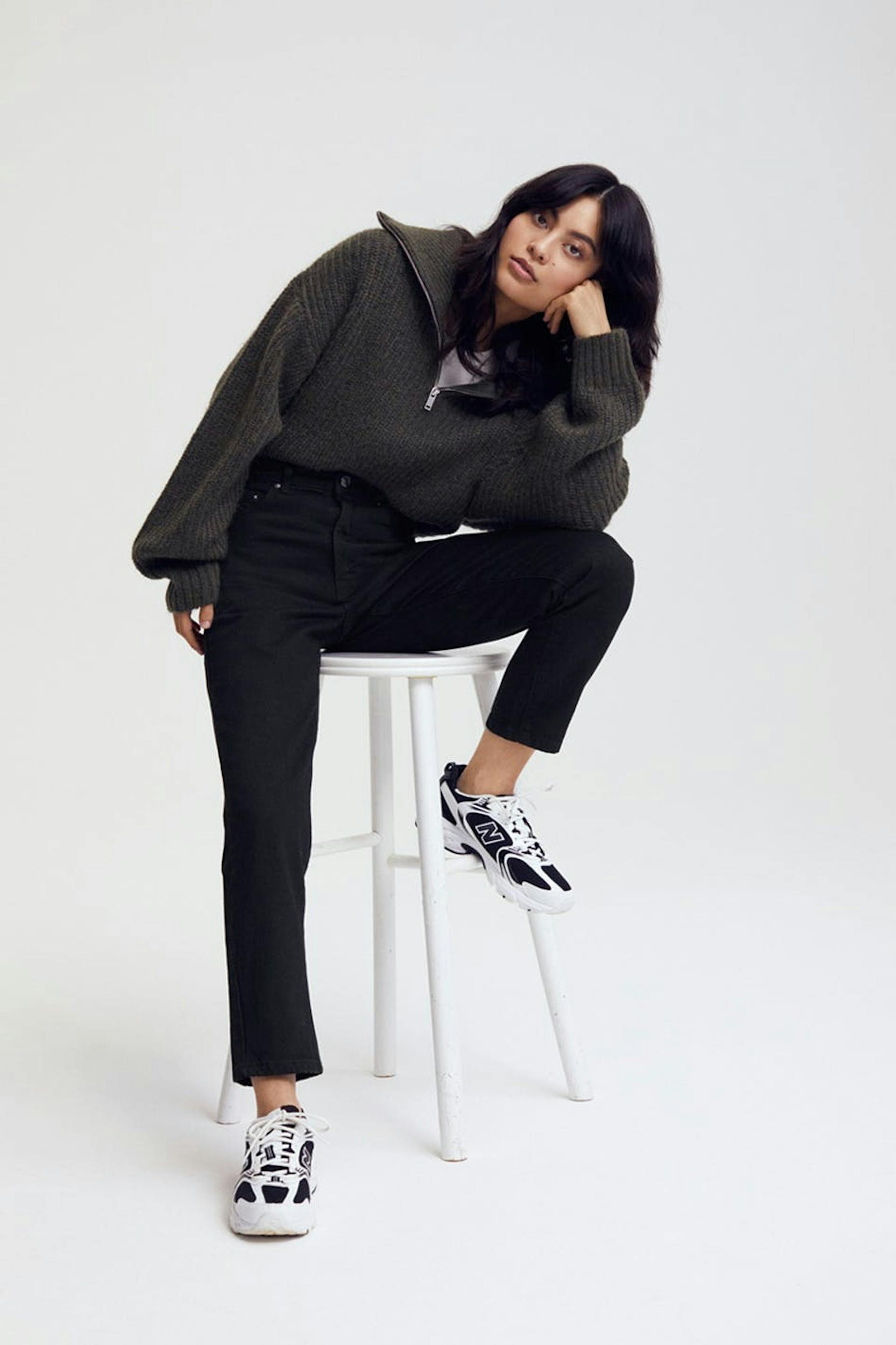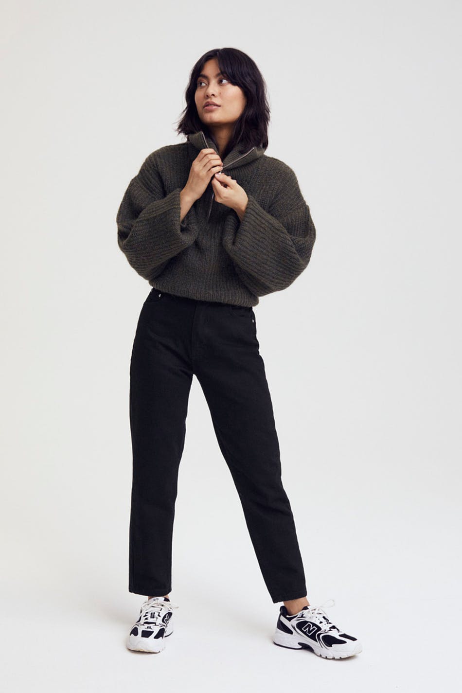 Små mom jeans med høy midje i myk non-stretch denim. Jeansene er svarte og har slim-fit. De har en lynlås og avsmalnende bein med ankellang benlengde. Passer til deg som er 160 cm eller lavere. Se gjerne vår størrelsesguide for å finne størrelsen din.