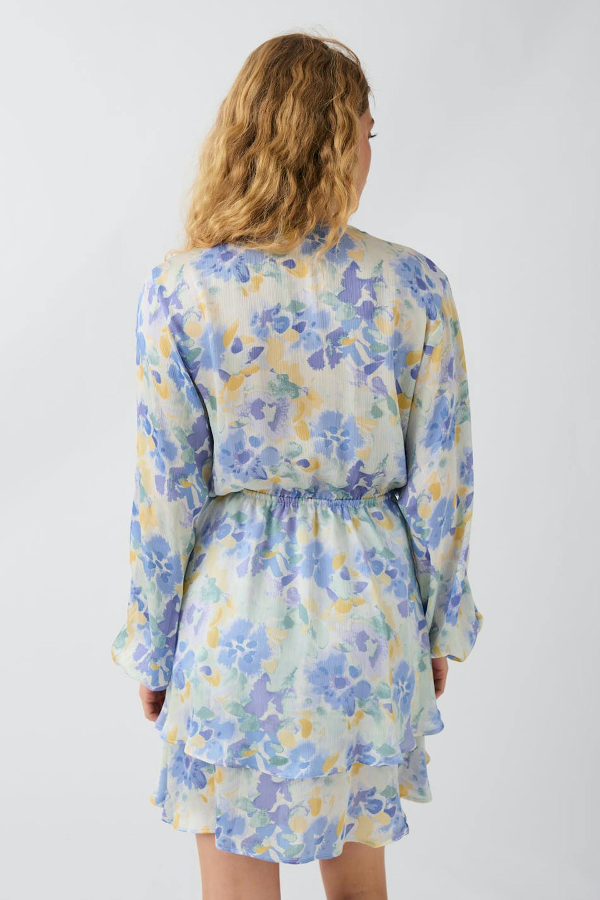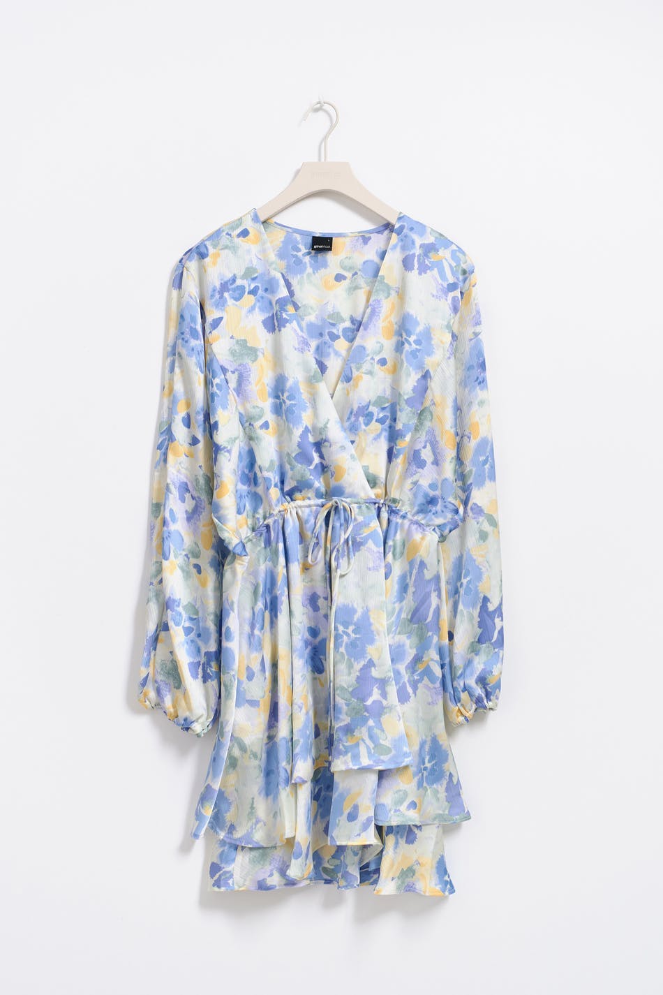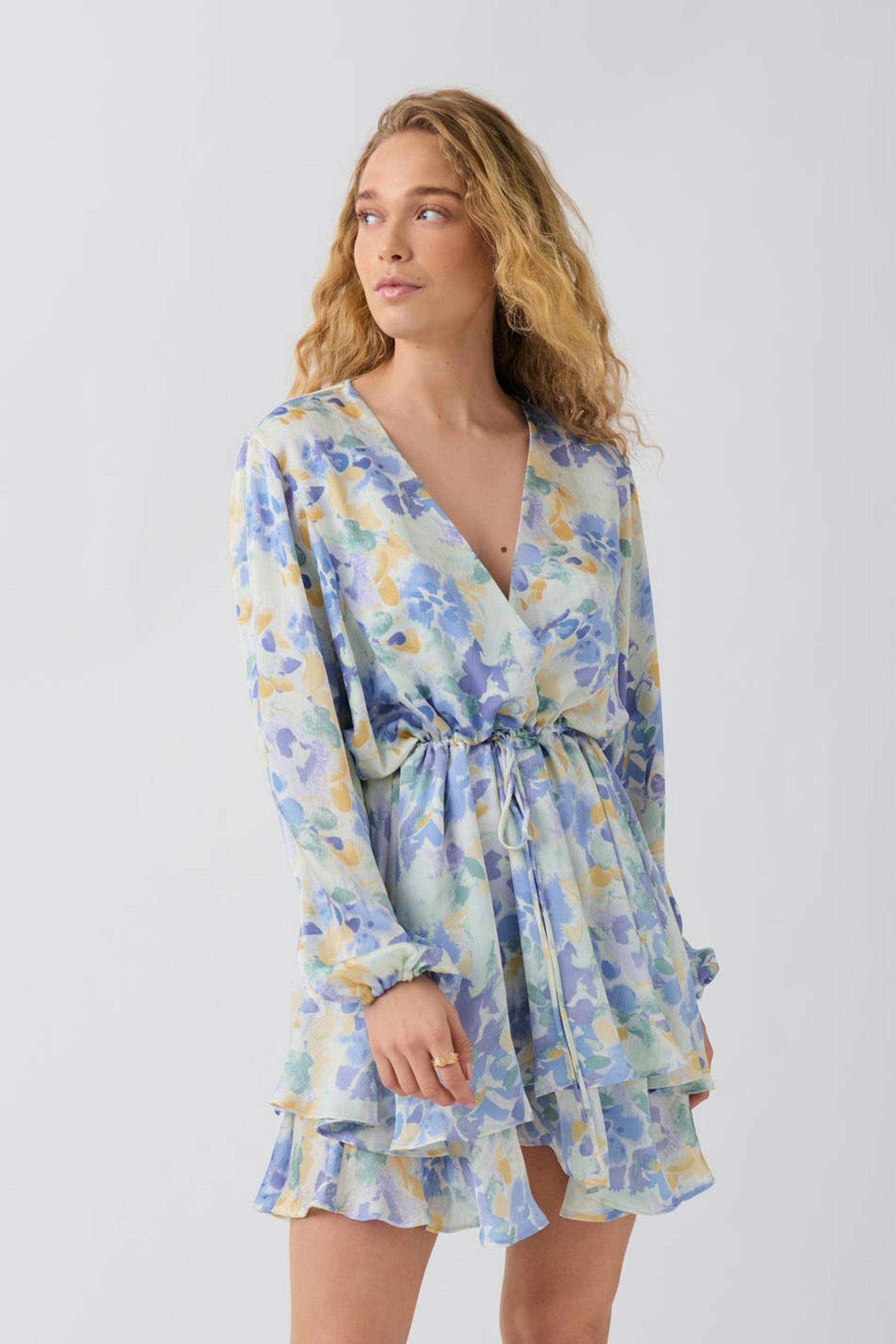 Blomstret kjole med en oversized passform. Kjolen er hvit og har lange ermer med en knyting i midten. Den har et v-hals snitt og volanger på bunnen.