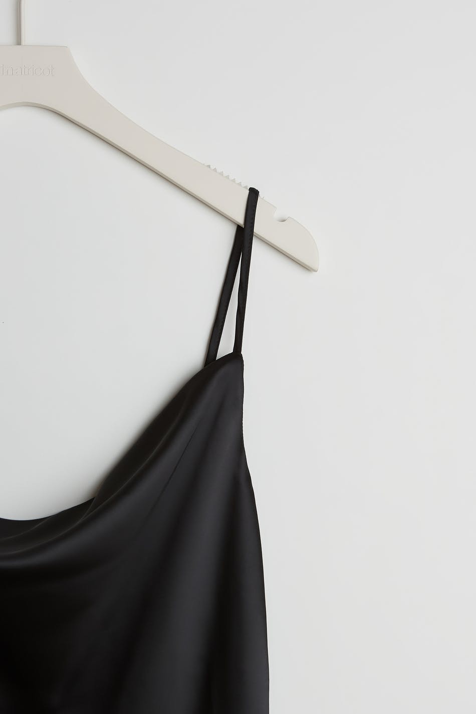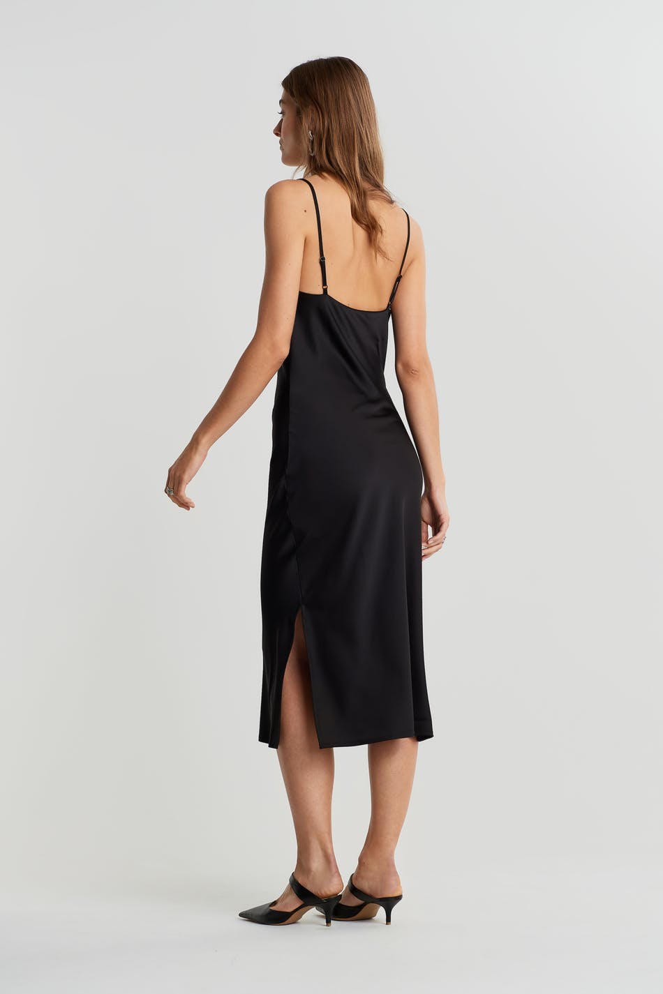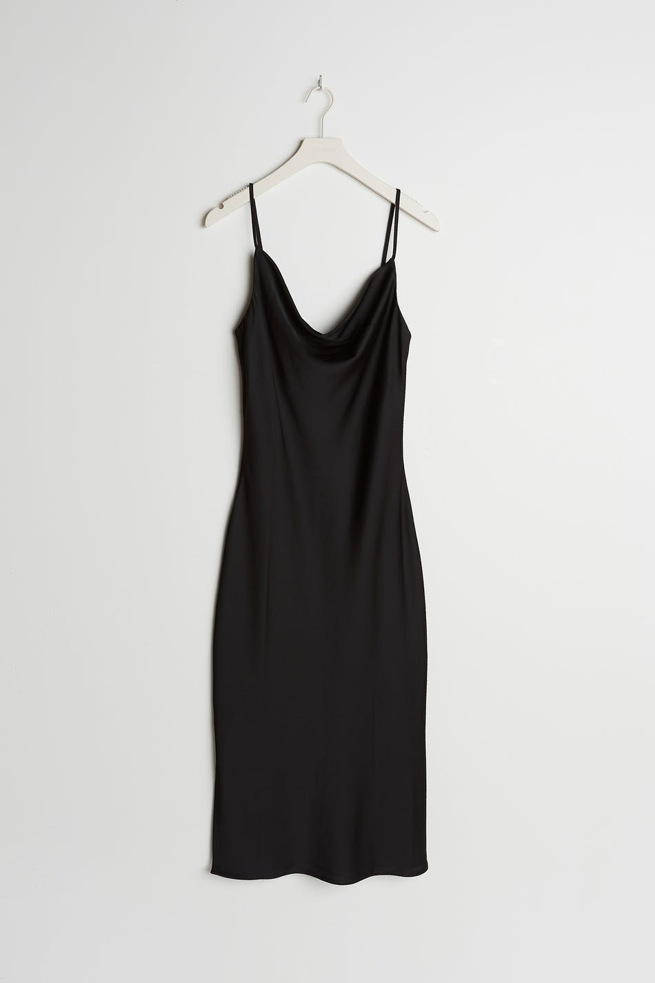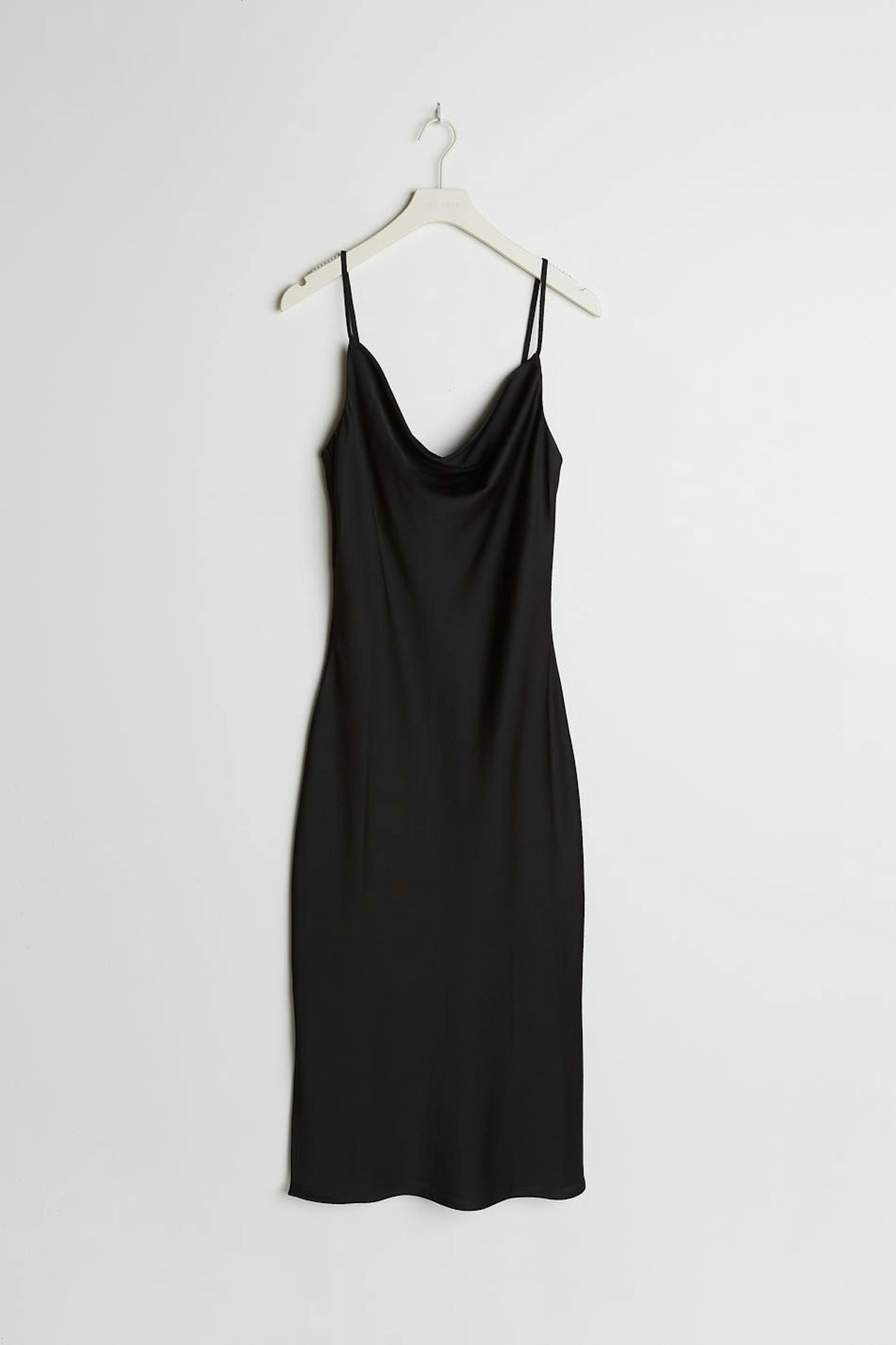 Legglengde kjole med en drapert hals. Kjolen er perfekt for festen og svart og har tynne skulderstropper. Den har en splitt i sidene og et satengaktig materiale.