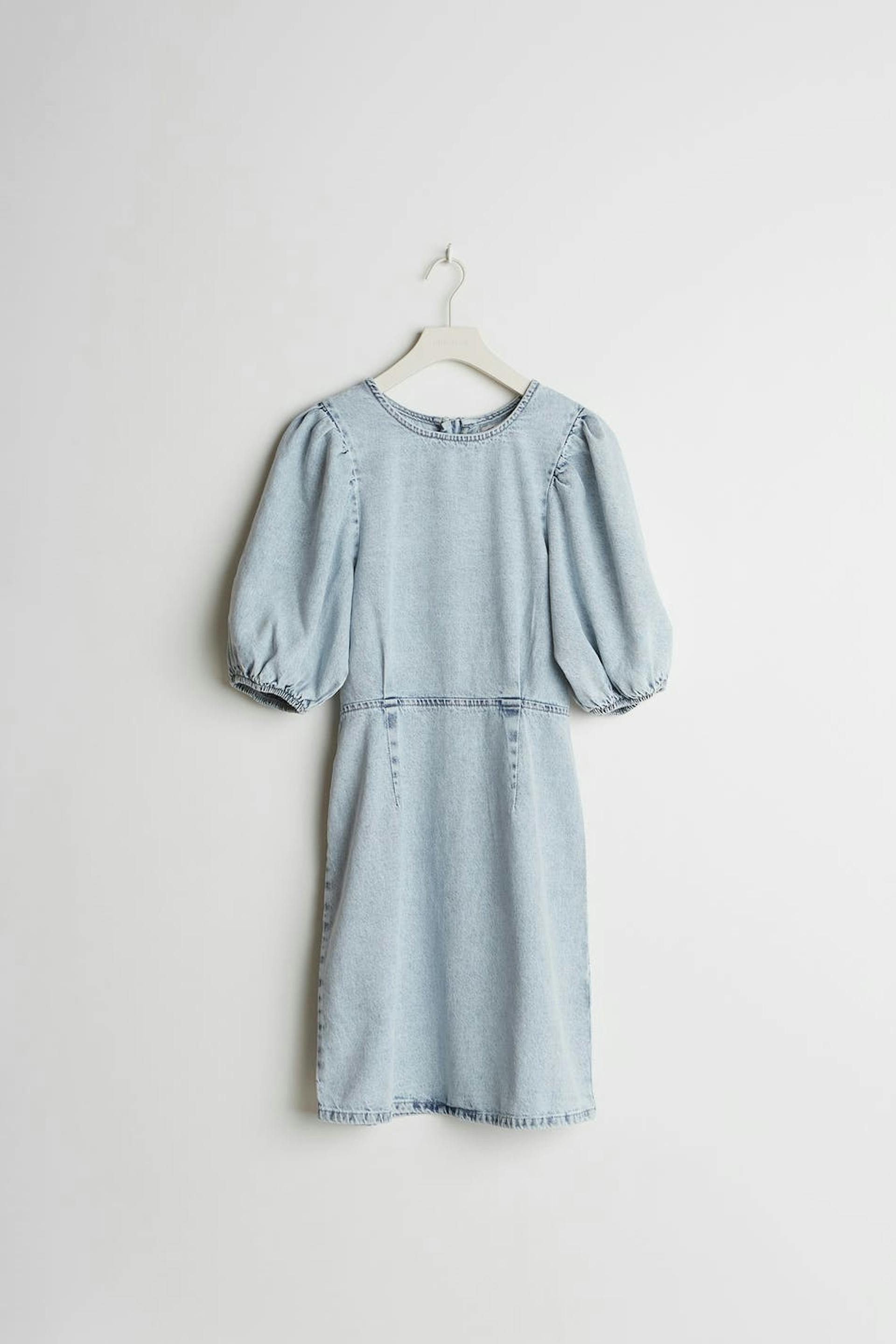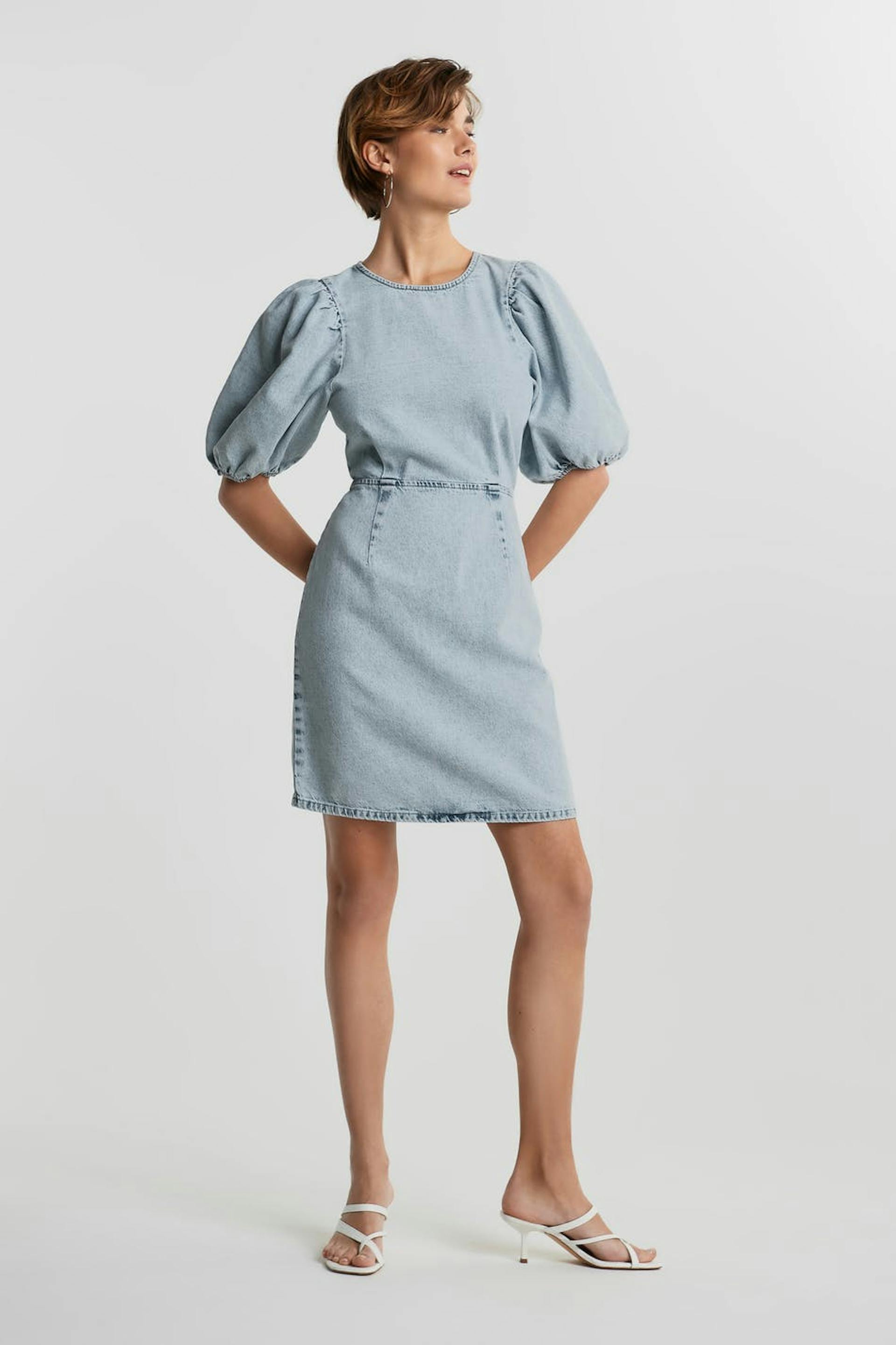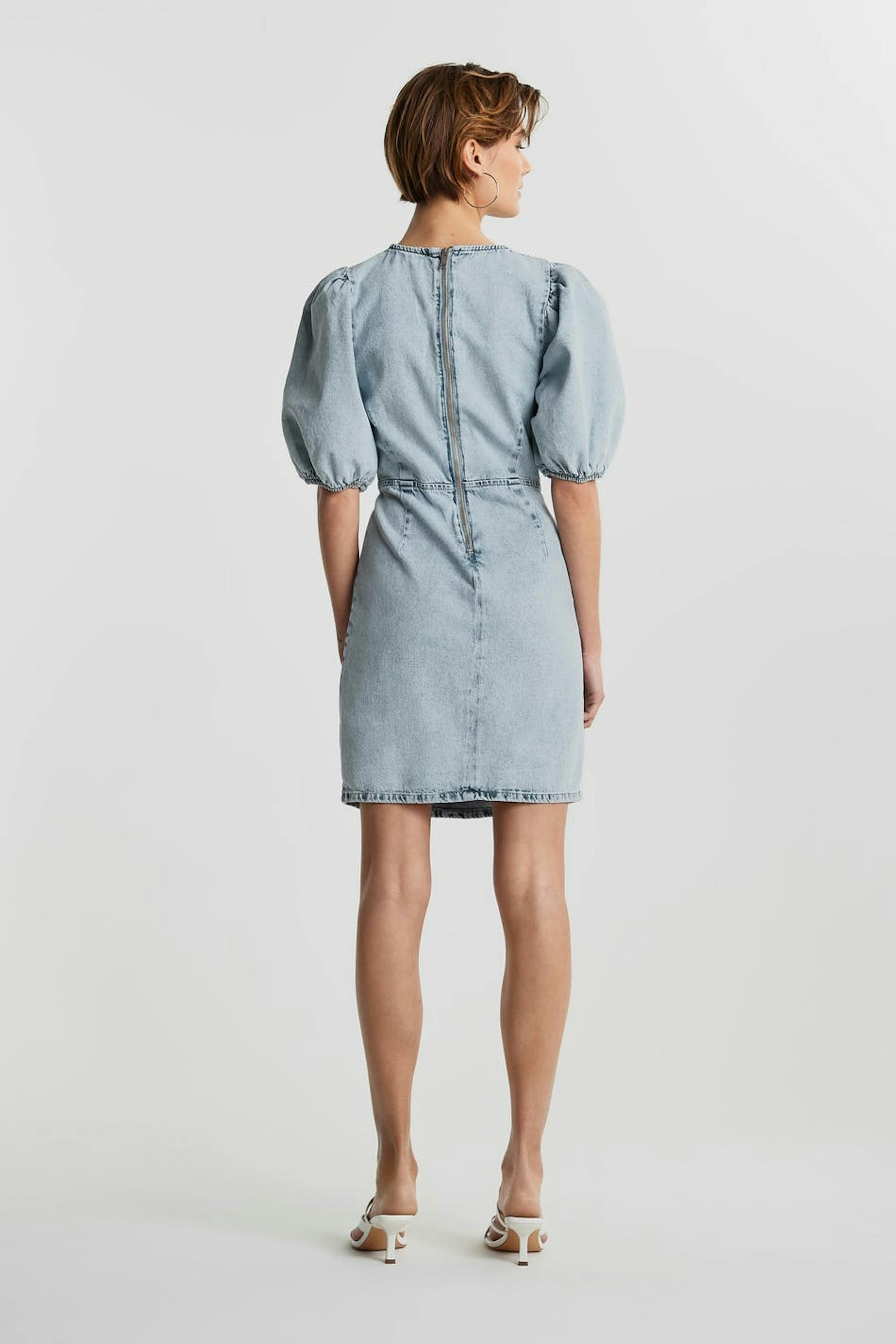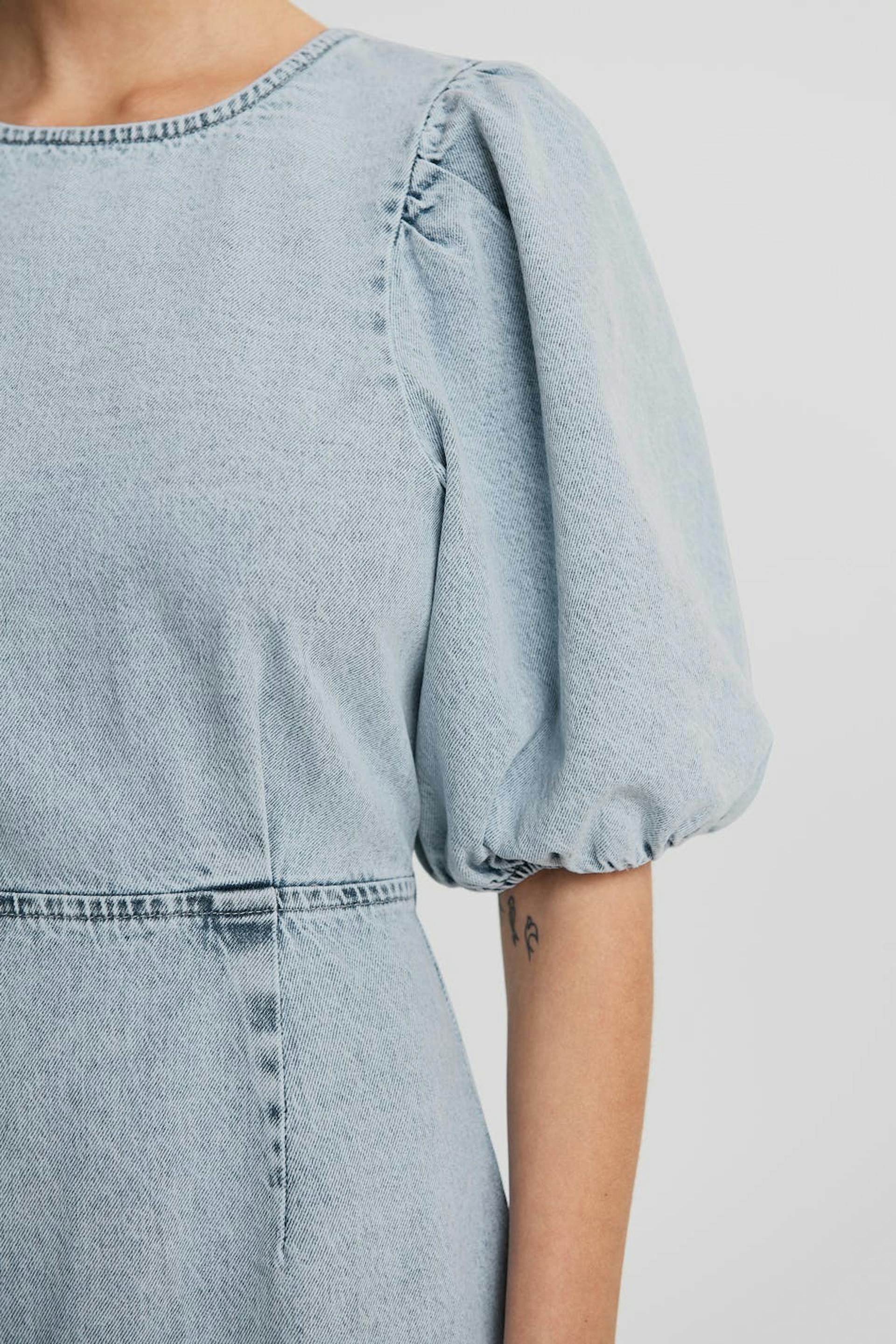 Non-stretch kjole med en tilpasset passform. Kjolen er lyseblå og har korte puffermer. Den er laget av denim og har en glidelås i ryggen.